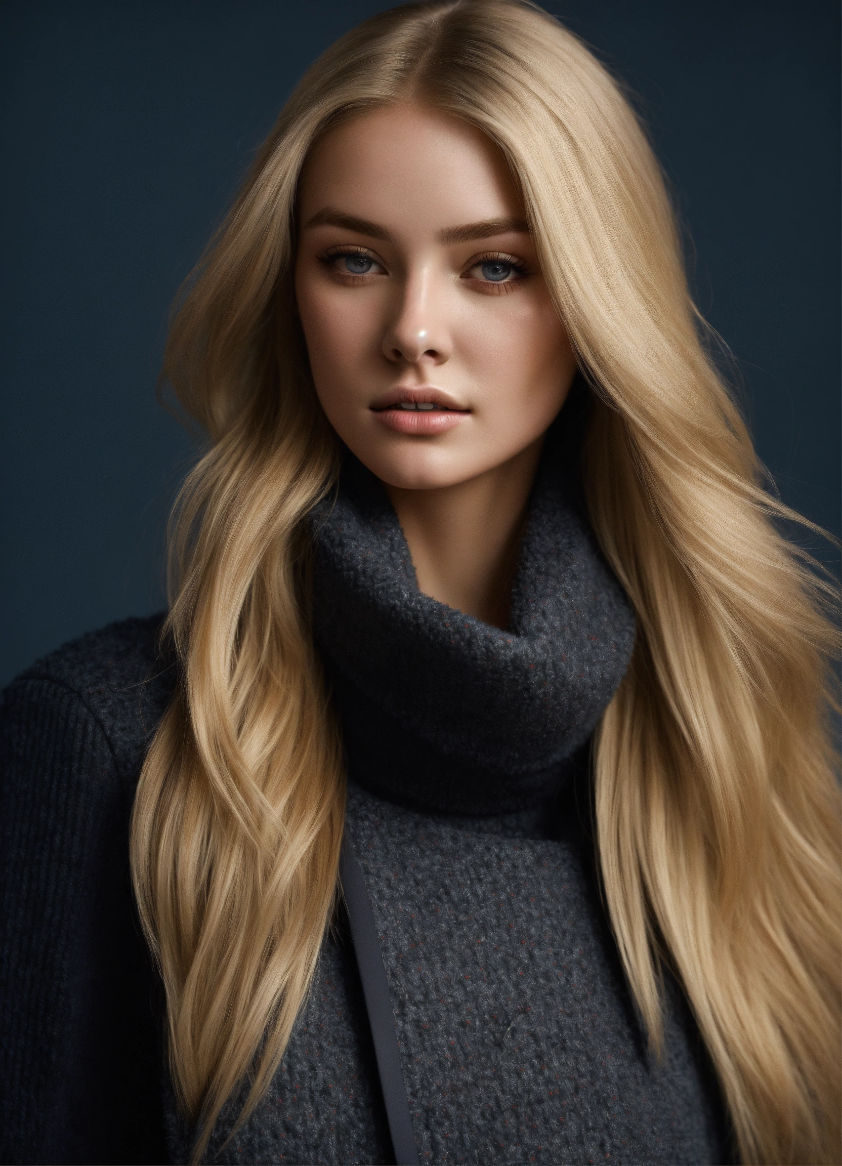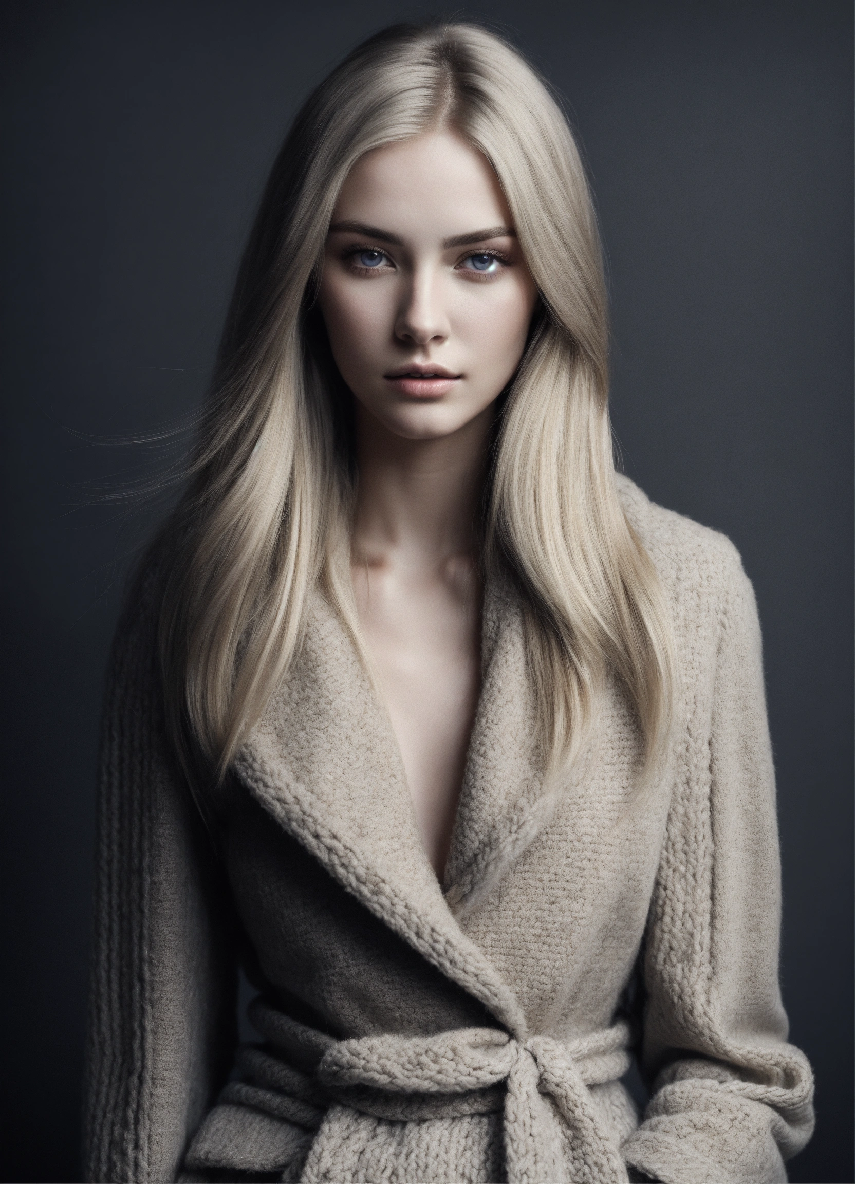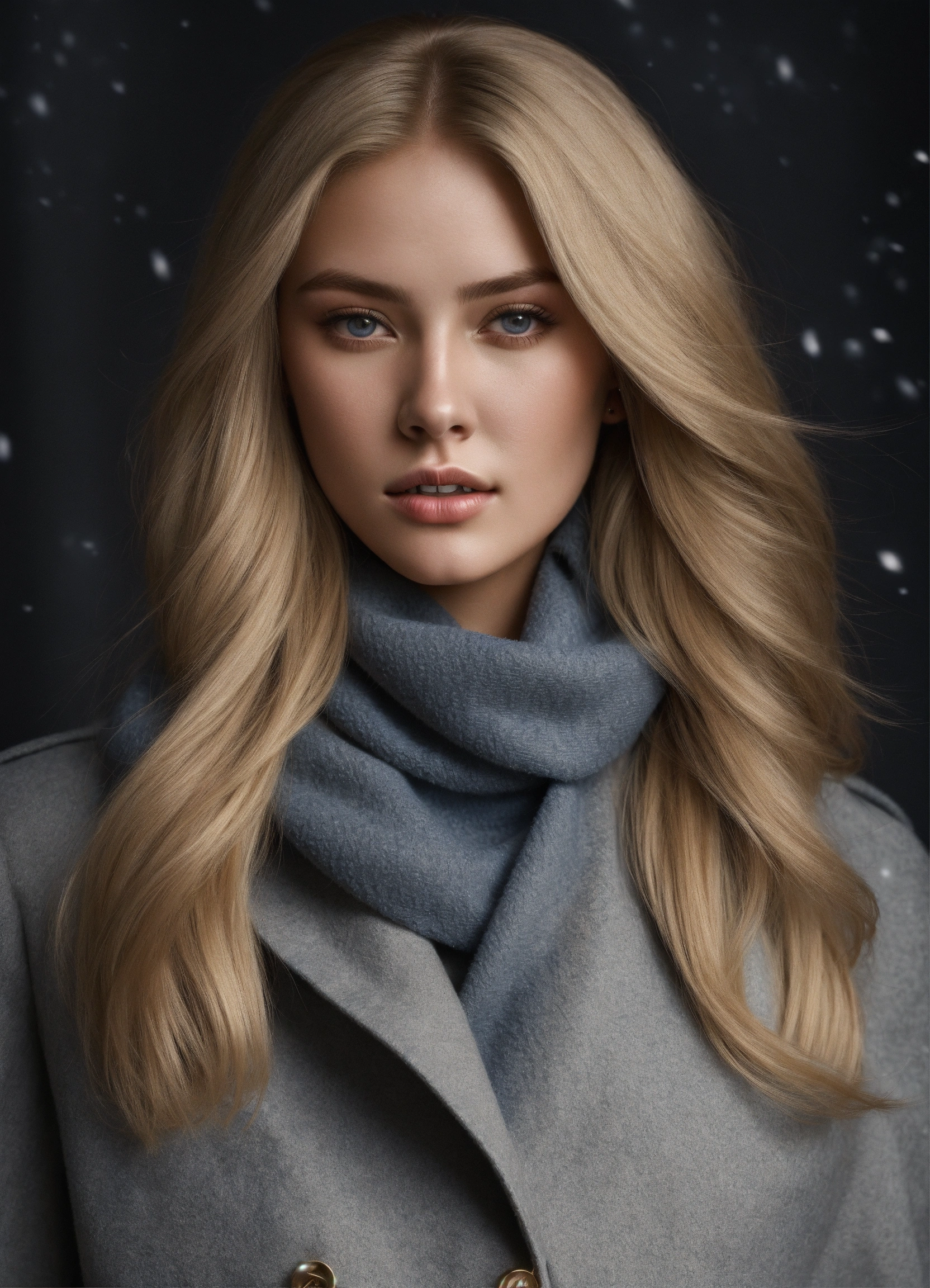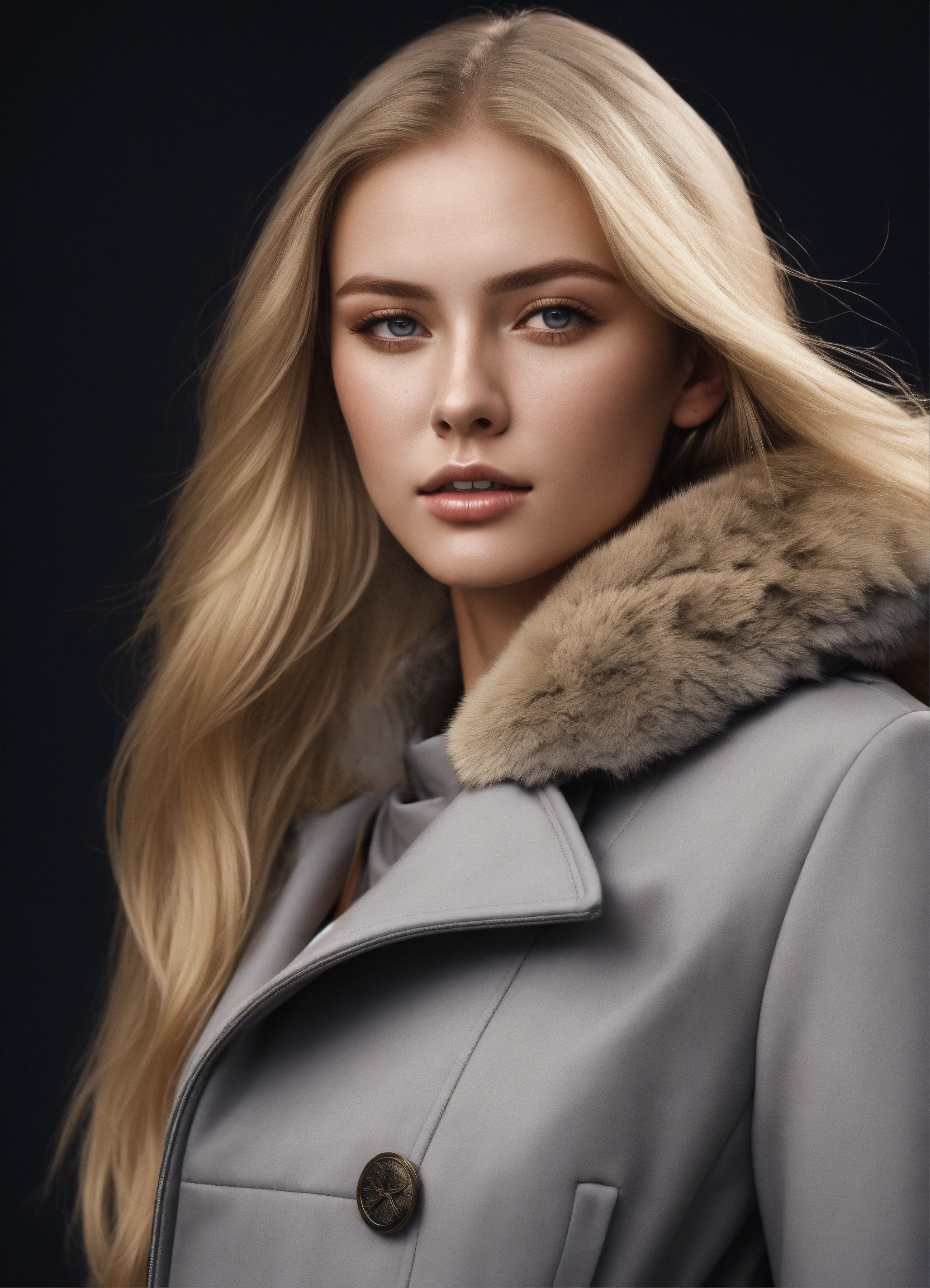 Ultra realistic beautiful 22 year old woman with blonde straight hair, model with light gray eyes of european descent, fashionable luxury luxury winter clothes, full length, dark background, photorealistic.