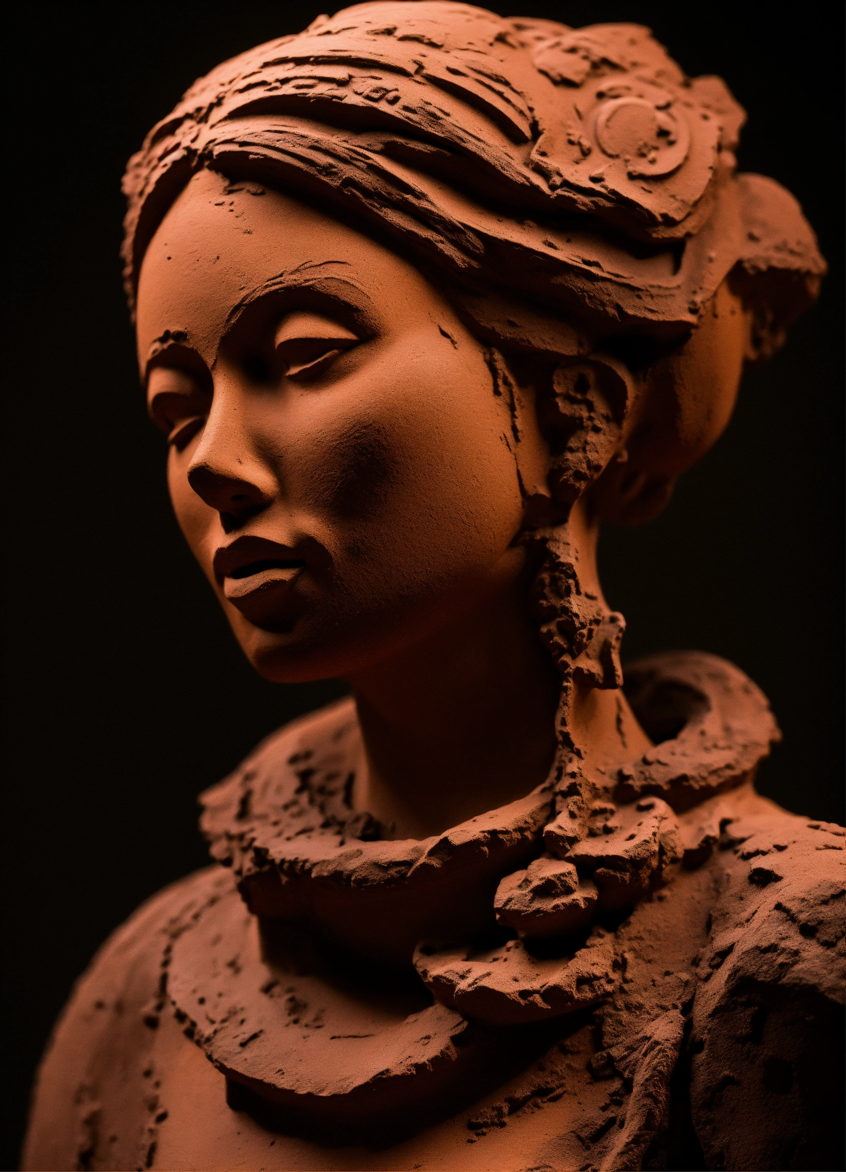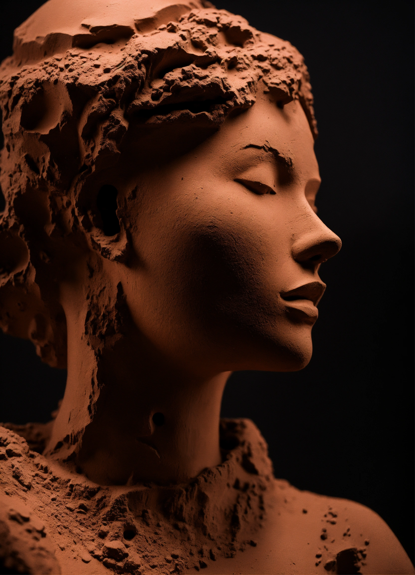 Sculpture woman with clay phone abstract clay brutal rough style on black