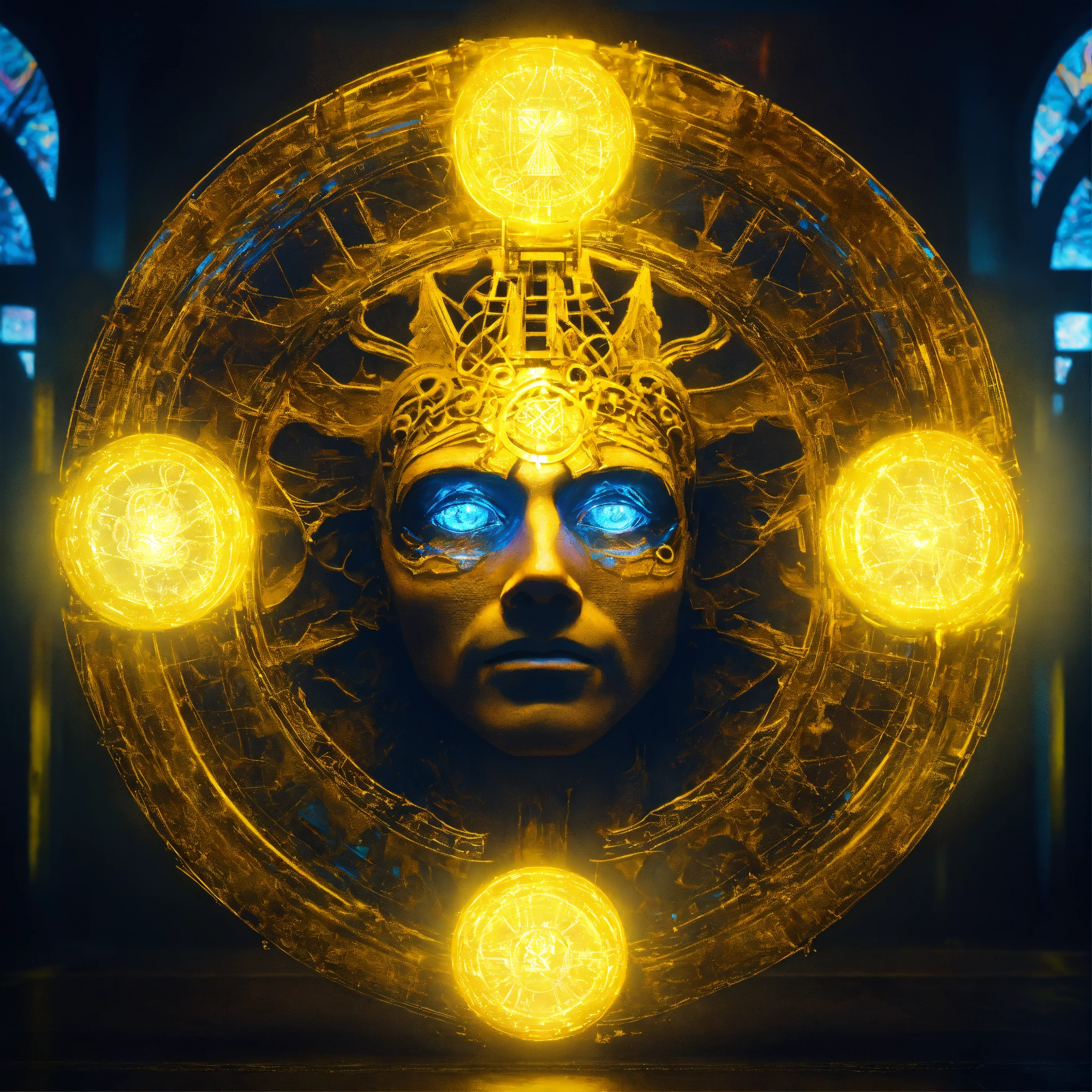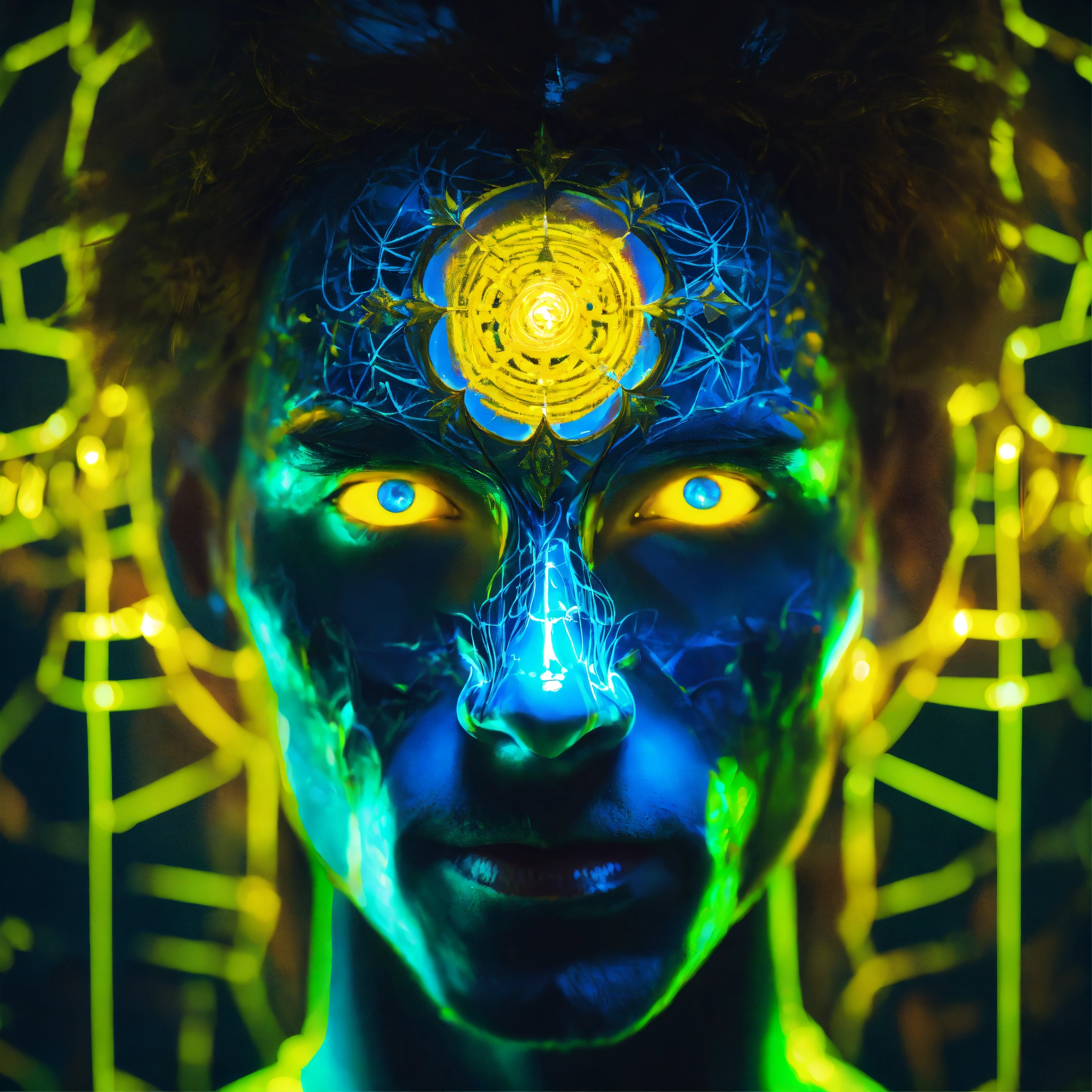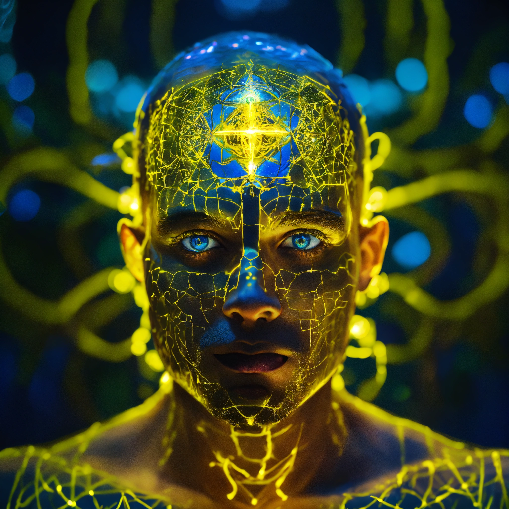 Underwater portrait photography, long exposure, powerful mystic man face portrait facing front, blue eyes. front view. front portrait, no angle. backlit. yellow neon glow. angelic transformer face. sacred geometry patterns on the face, in the style of disney, pixar, tim burton, chronicles of narnia, beauty and the beast, and peter pan. enchanting glowing orb aura. fractal, volumetric lighting, backlit. the power of the god. god-like, spirit-like.