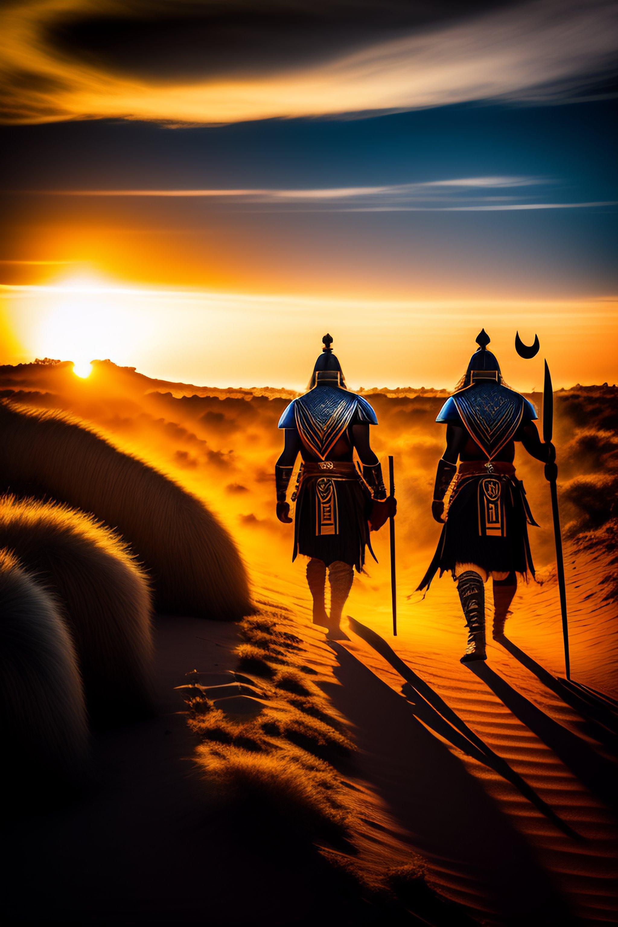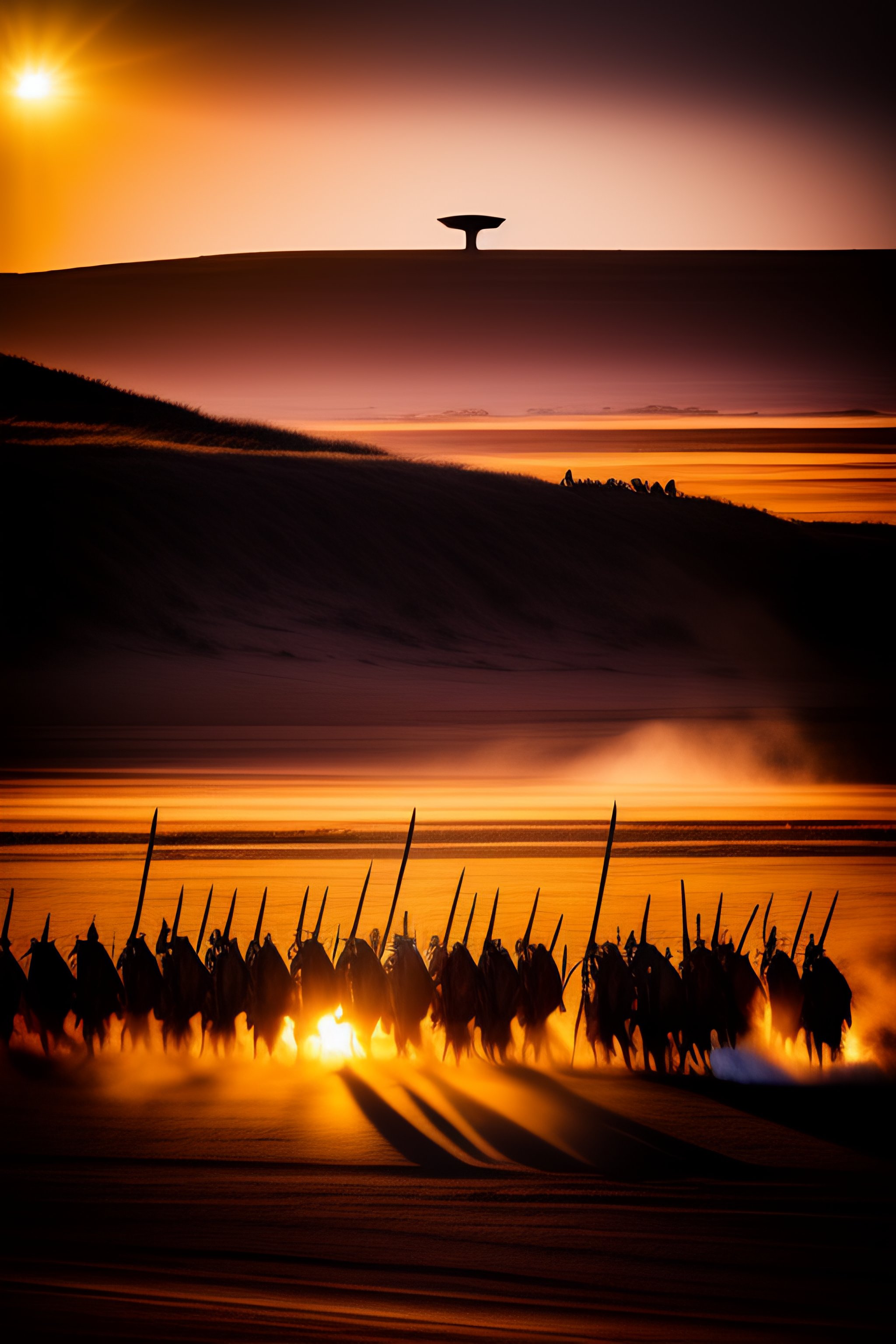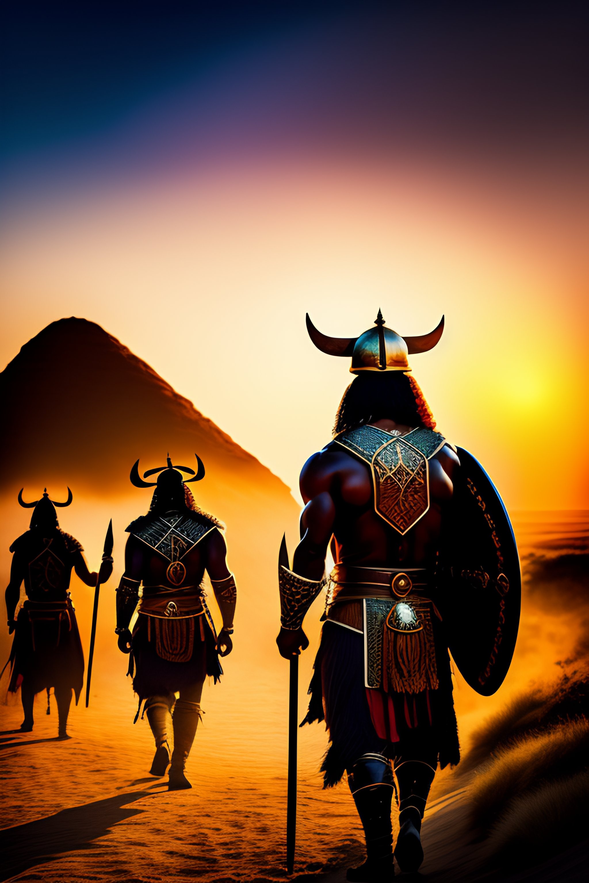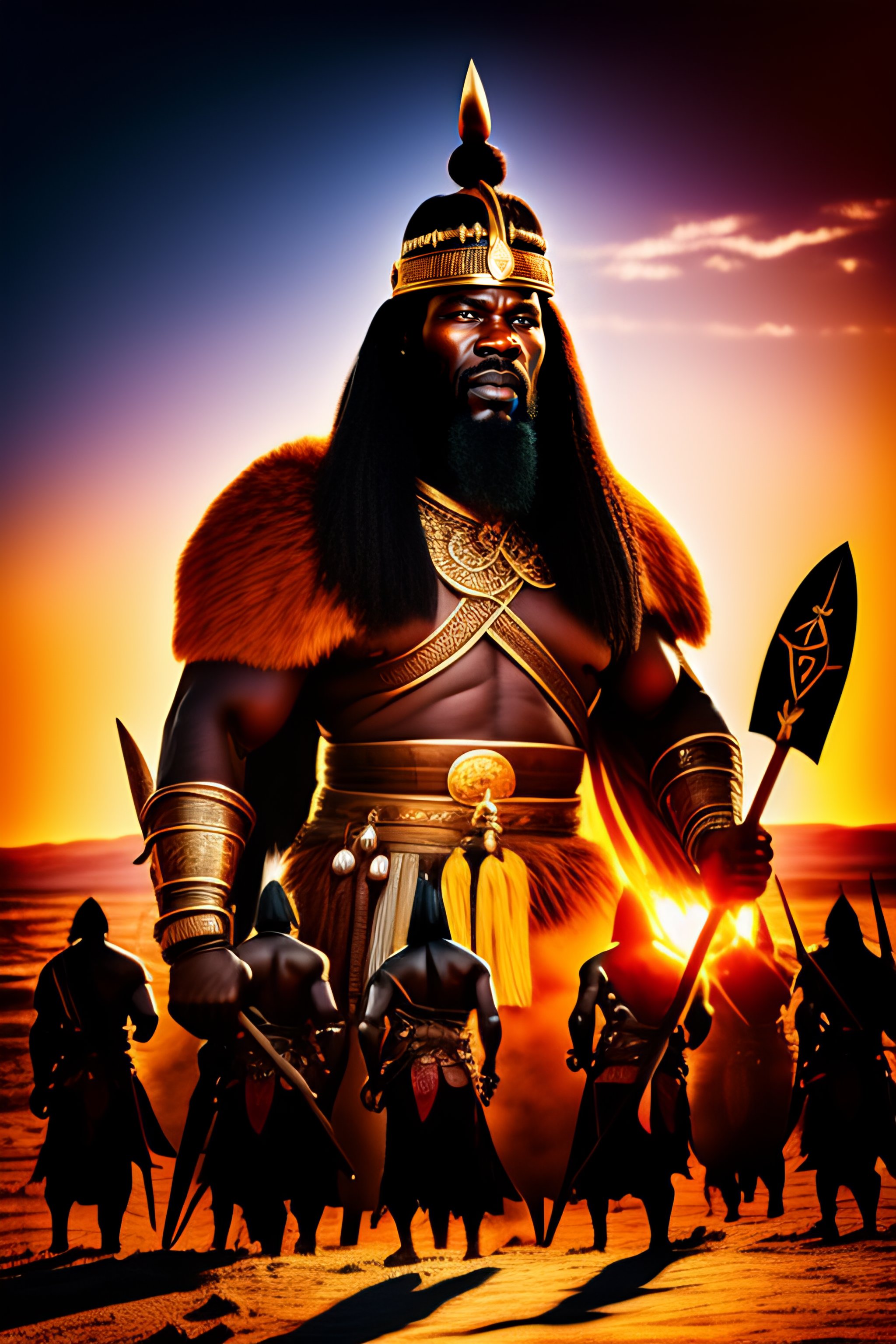Shaka zulu with viking hammer and zulu shield leading zulu warriors to battle, golden hour, horizon, backlit, hdr