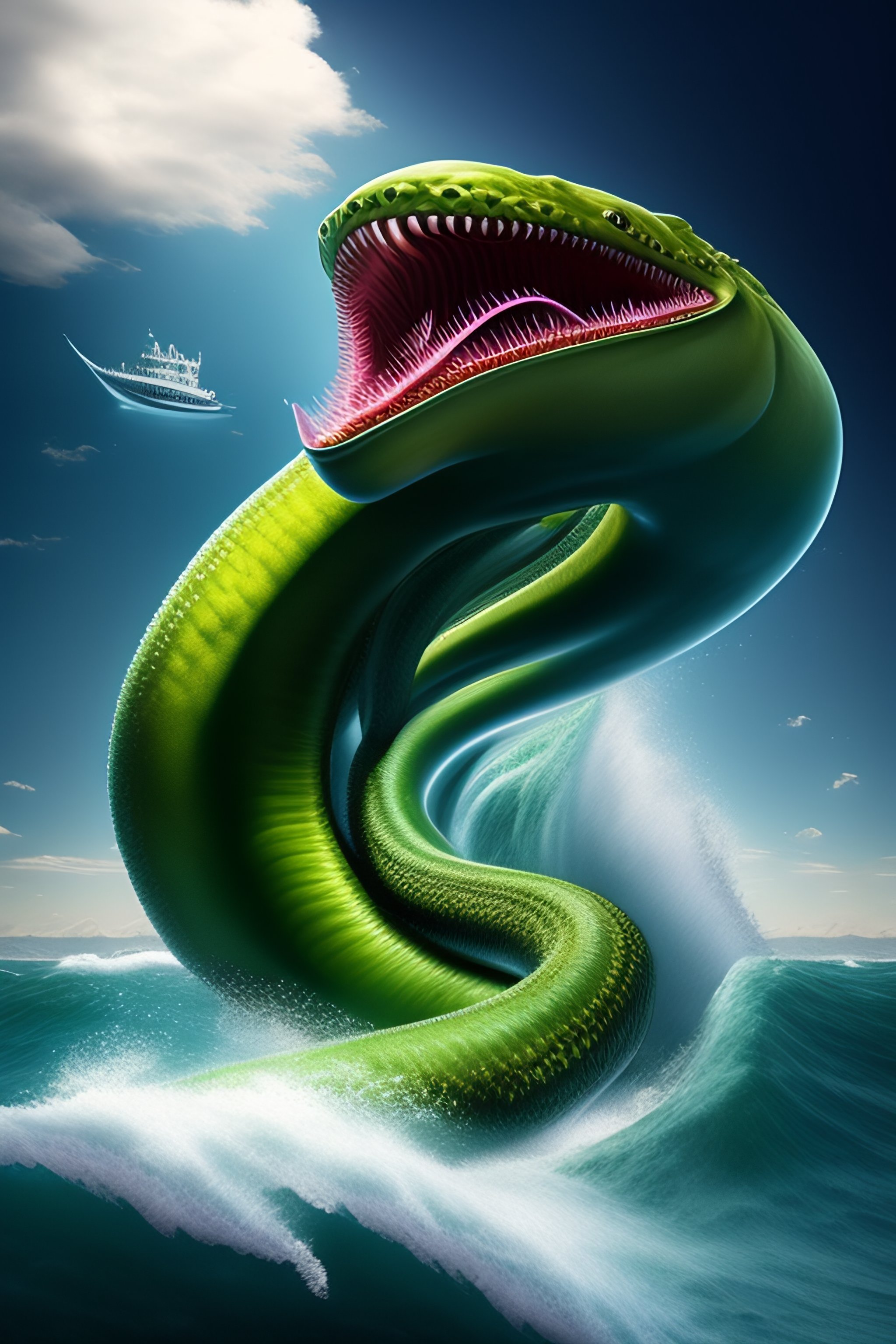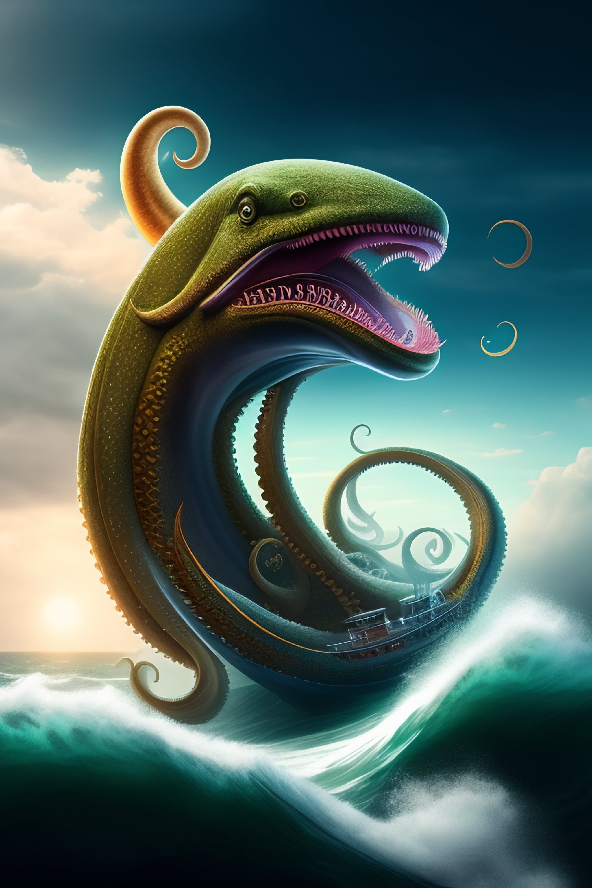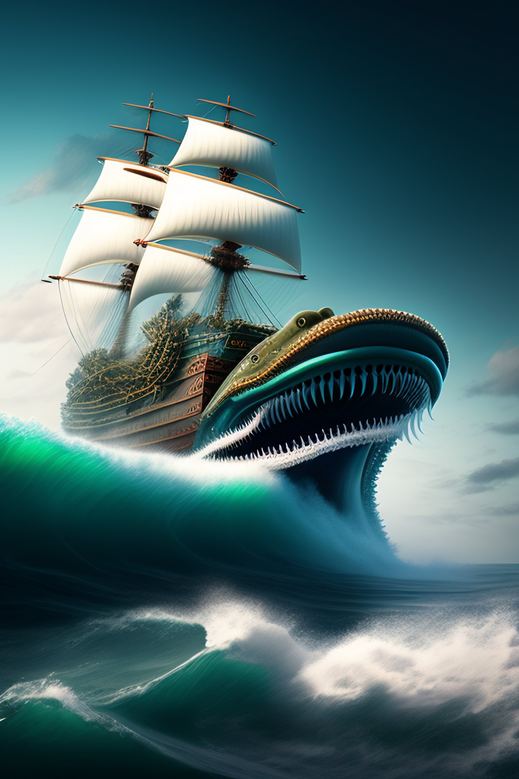 Hyperrealistic kraken eating a ship in a storming sea meanwhile people is jumping from de ship