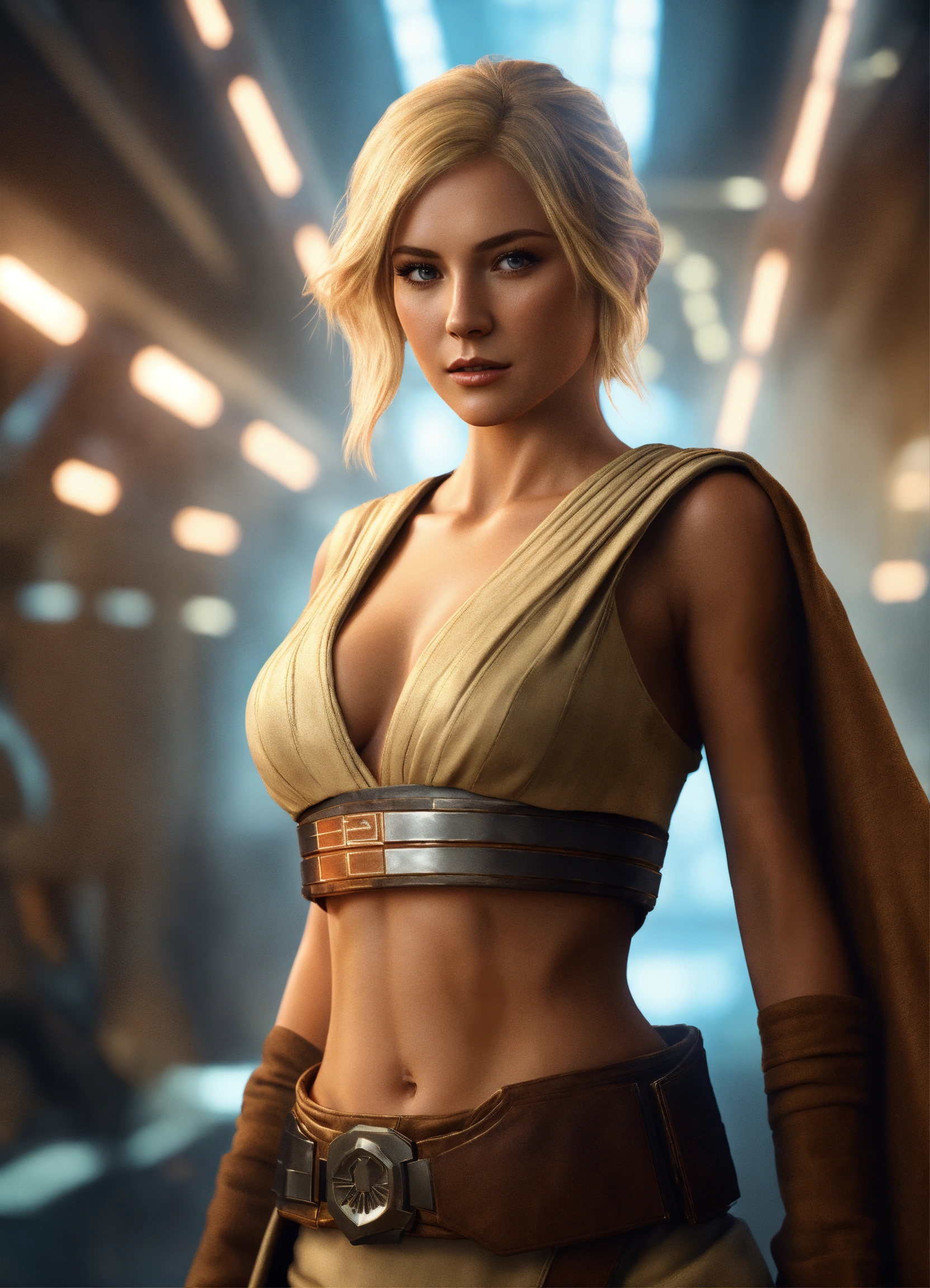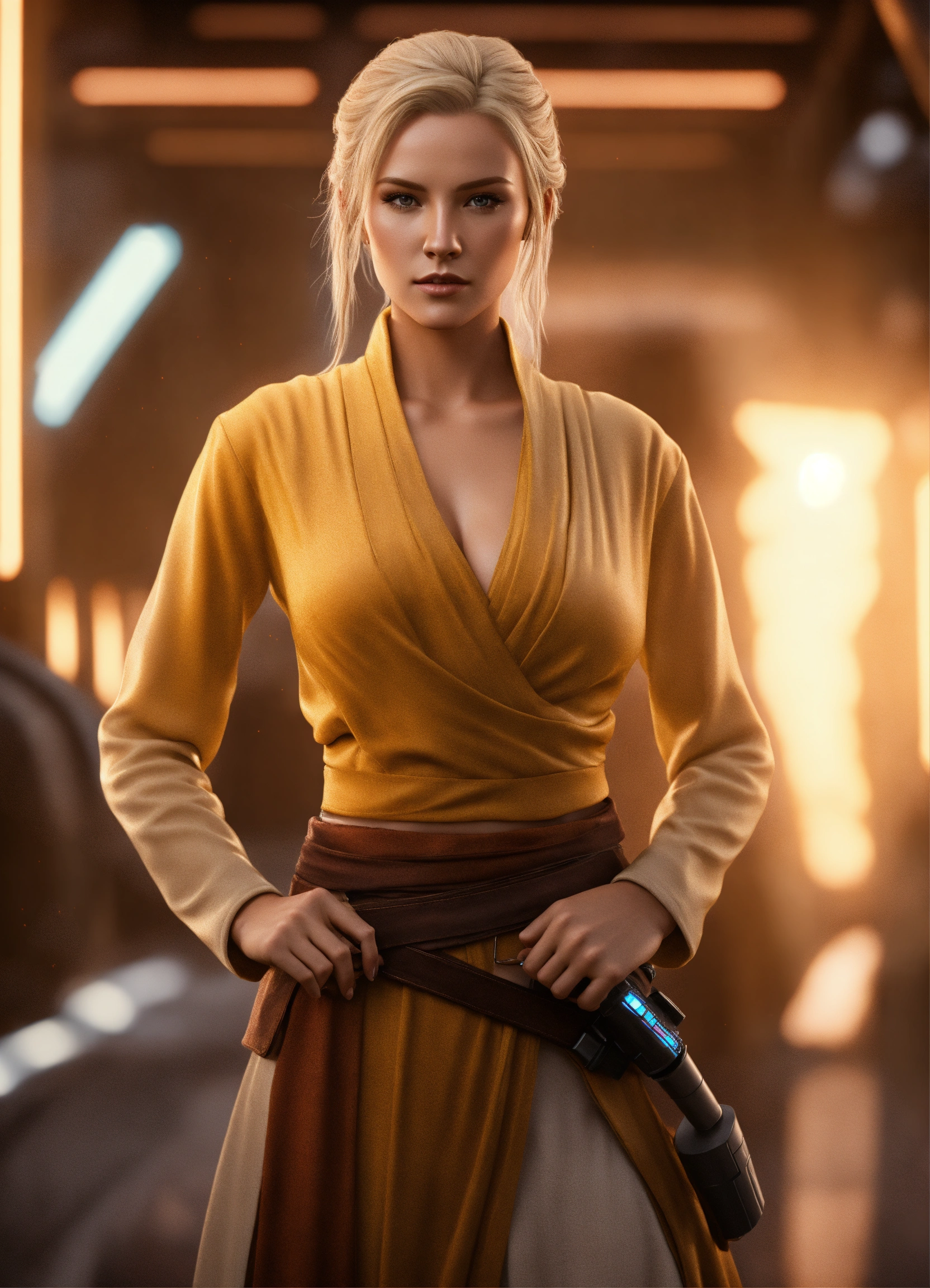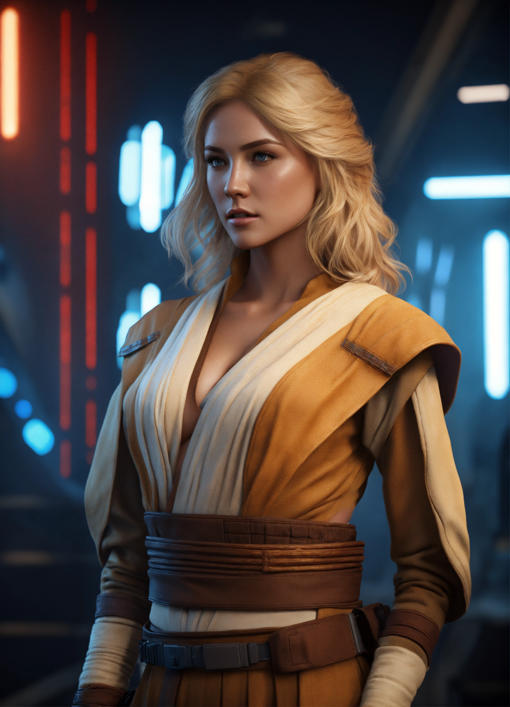 A gorgeous blonde jedi woman set in the star wars universe, midriff, big jugs, unreal engine render, 8k, half portrait
