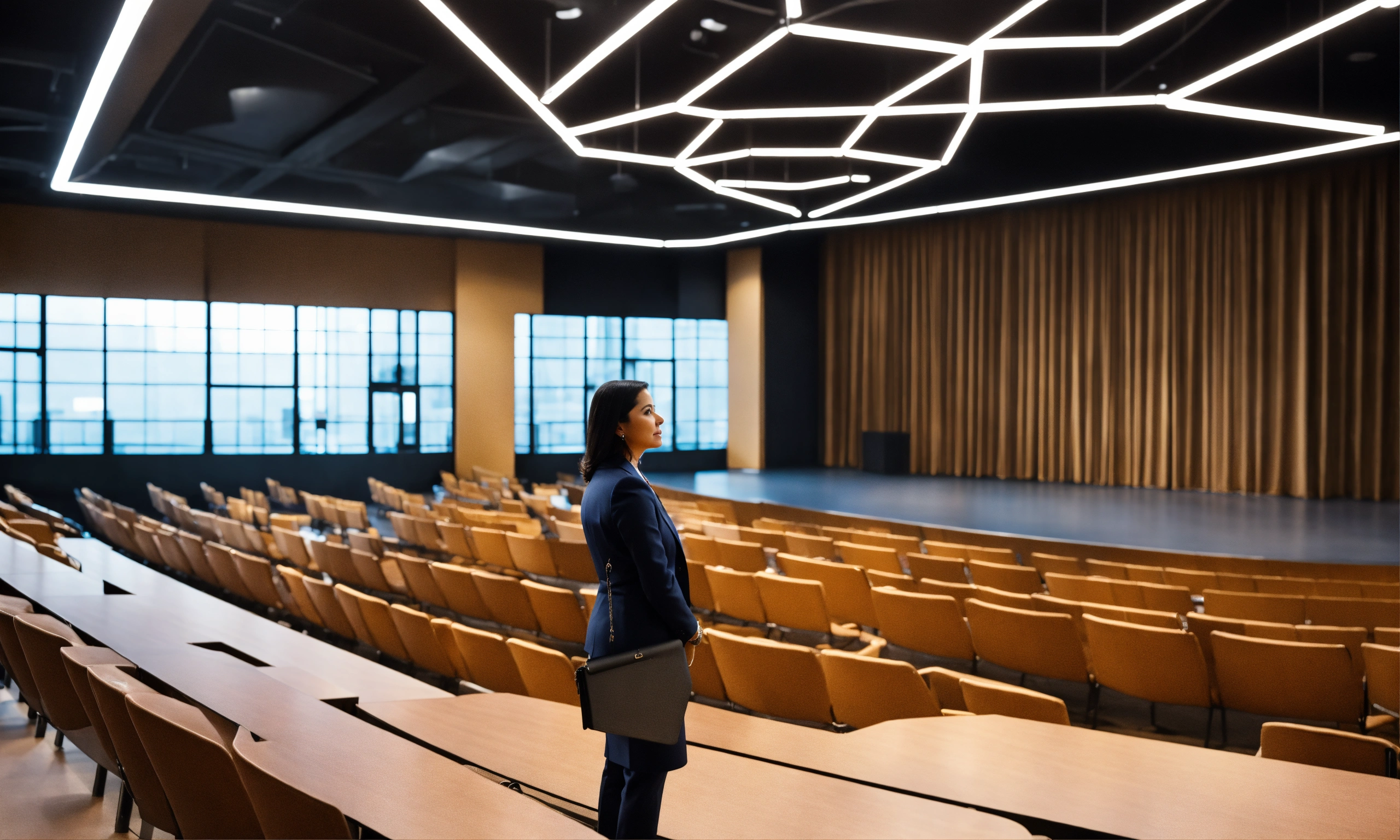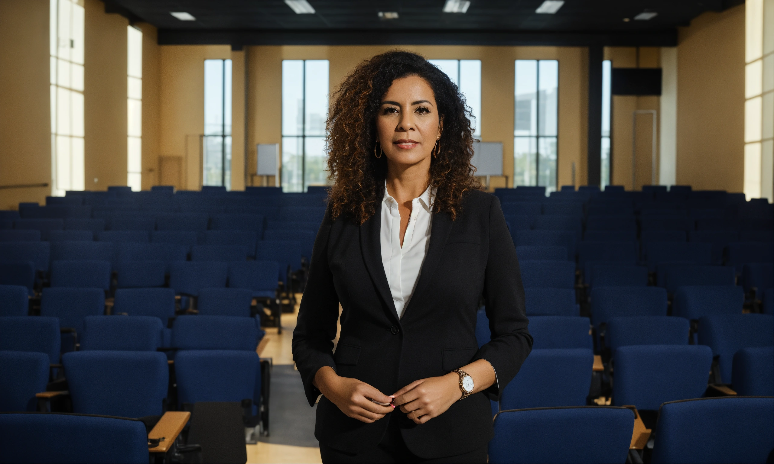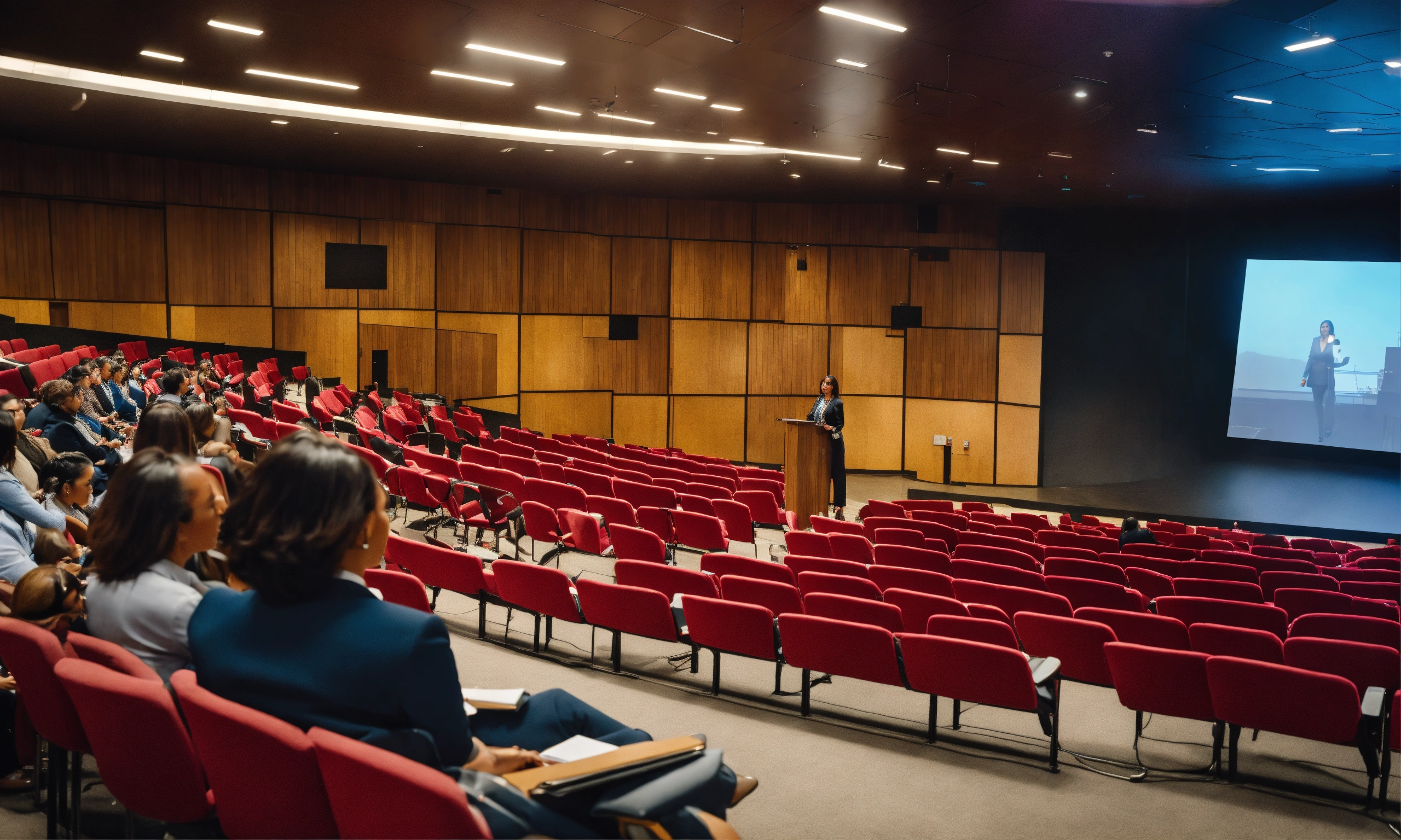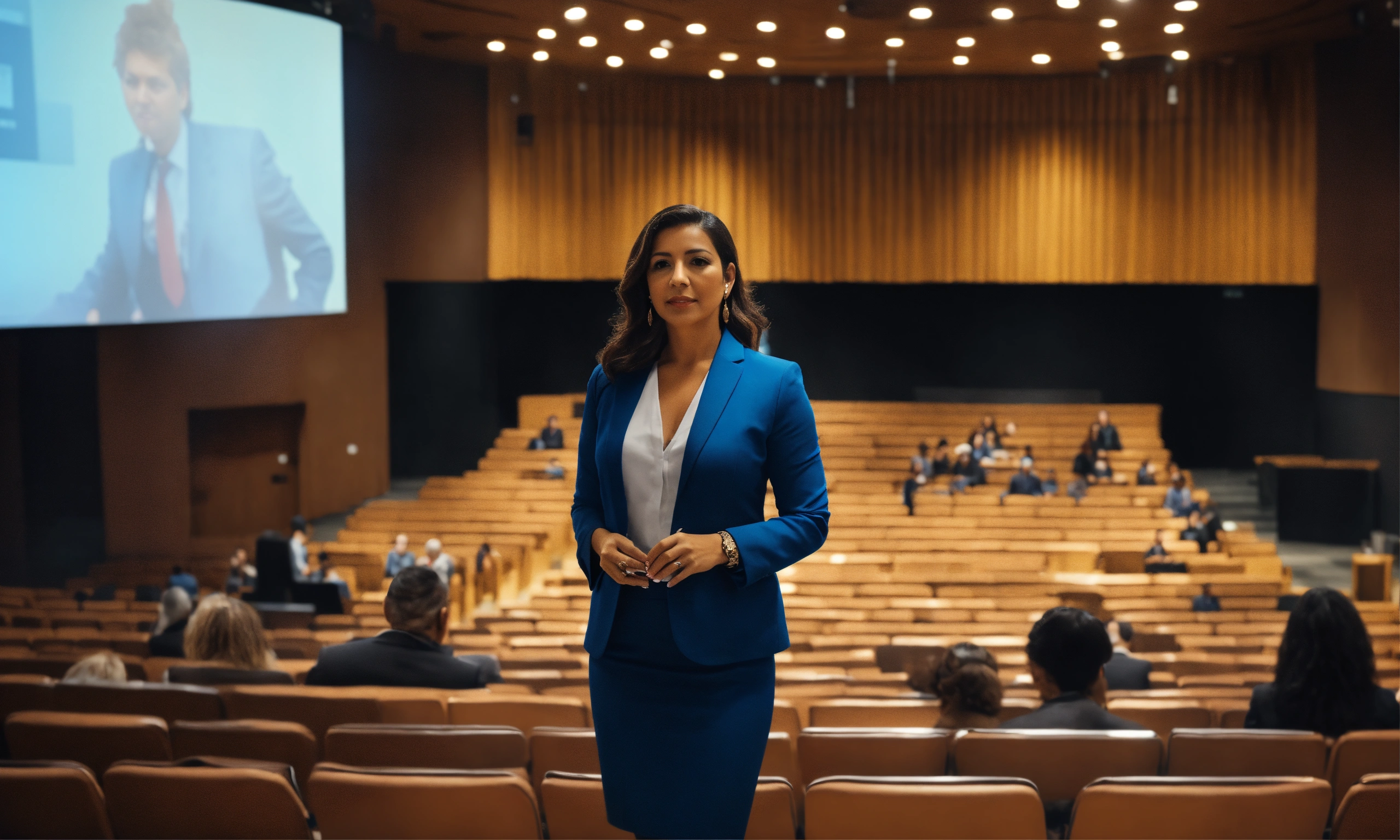 A stylish professional 4k photo of an female latina executive school principal standing in front of an ultra modern auditorium leading a leadership training to a full auditorium