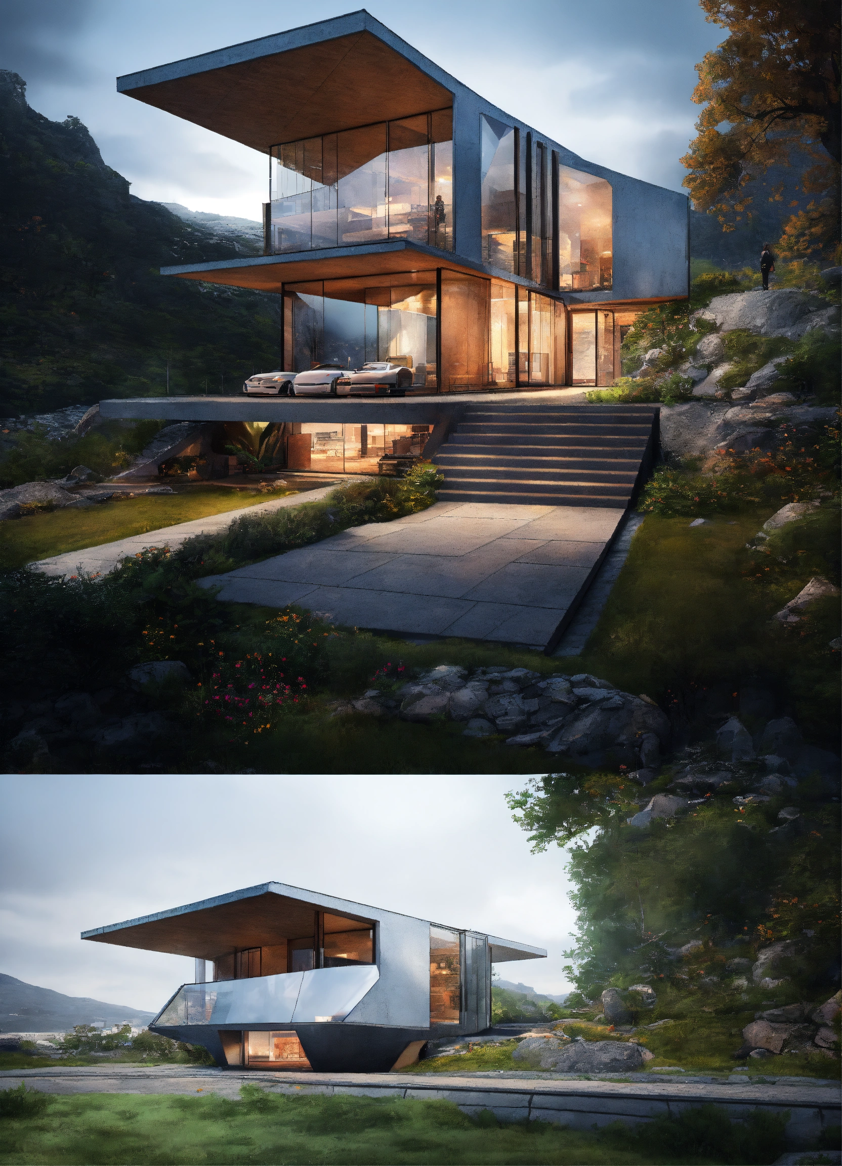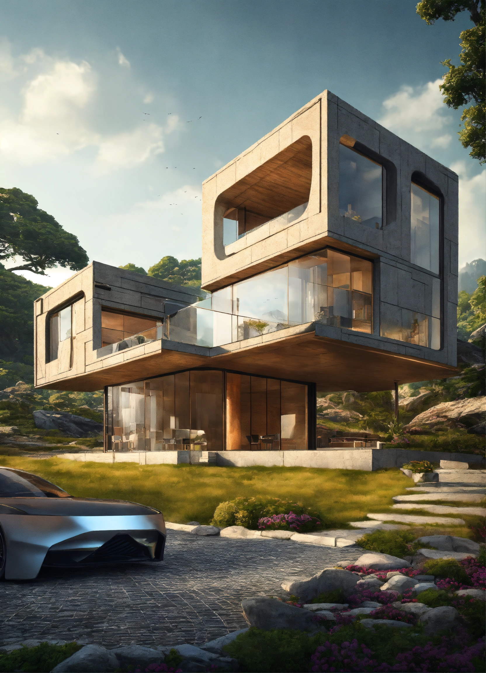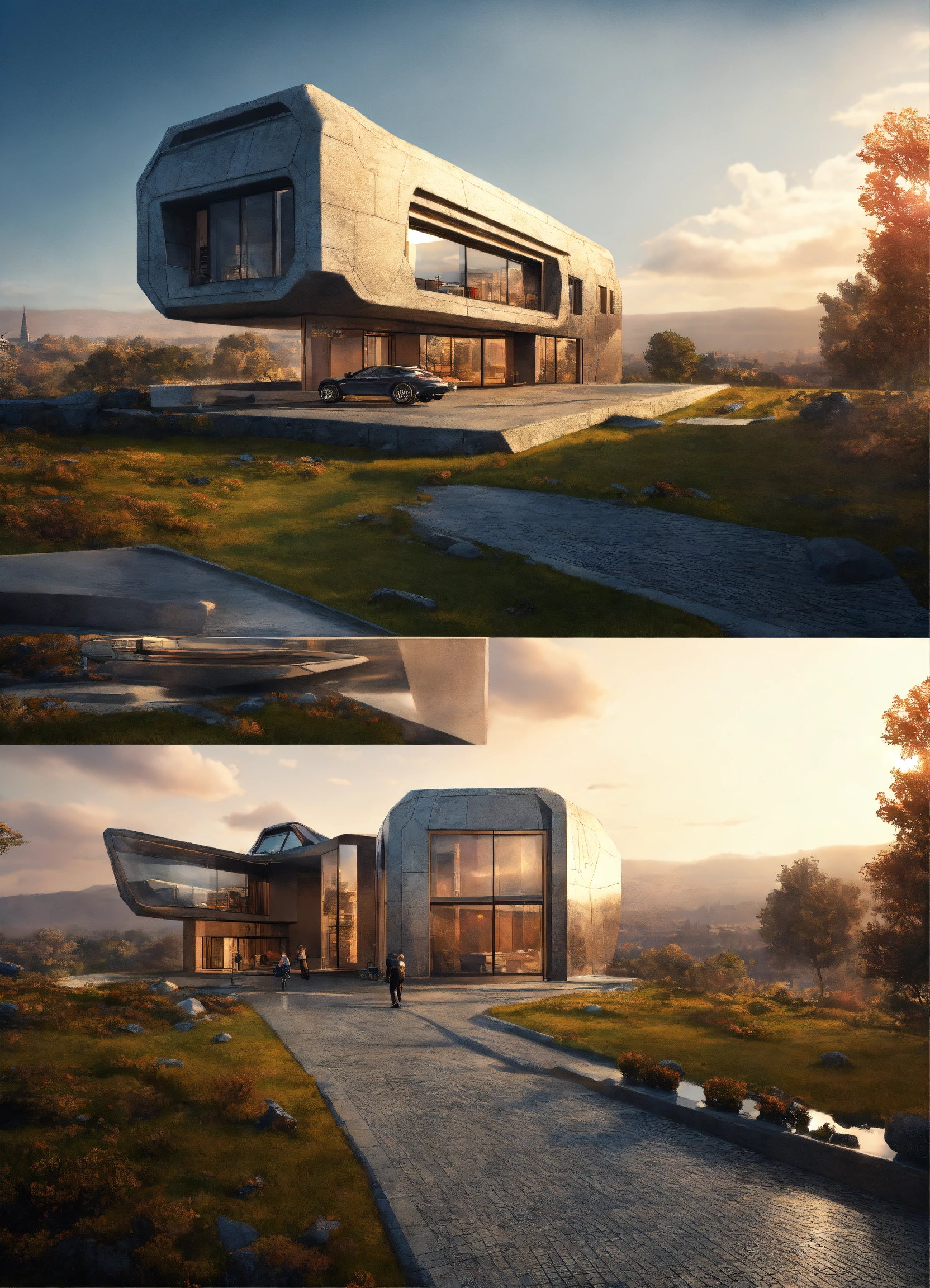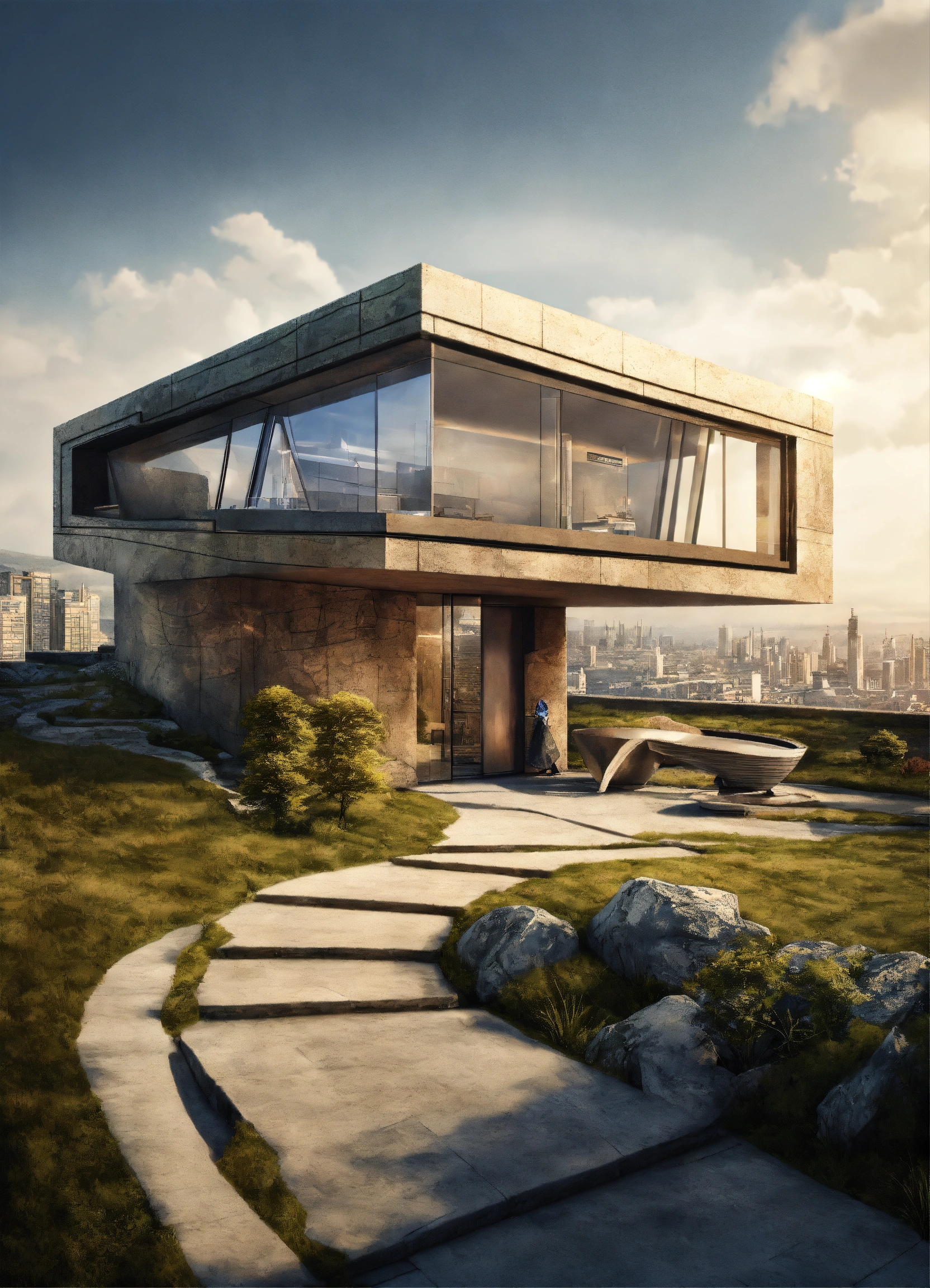 Design a old stone cottage of an large in l shape format with a court yeard with a futuristic city in a distant background, it is located besided a similar building, blended with a new futuristic house with a lot of glass ans metalick a large drive way outside the front door so car can drive thrugh. a futuristic city in a distant background