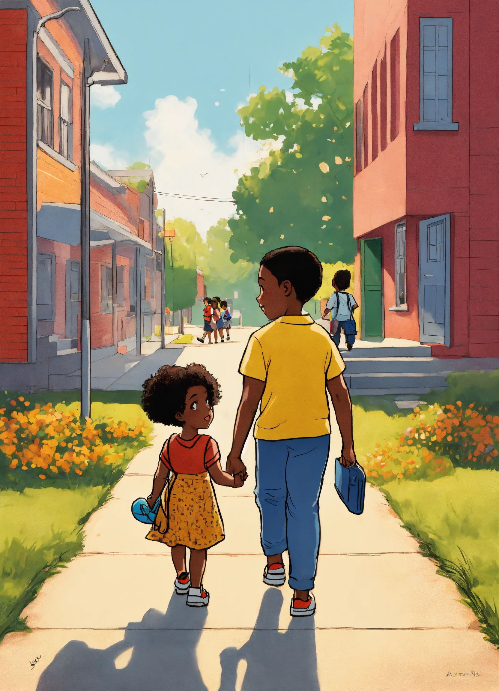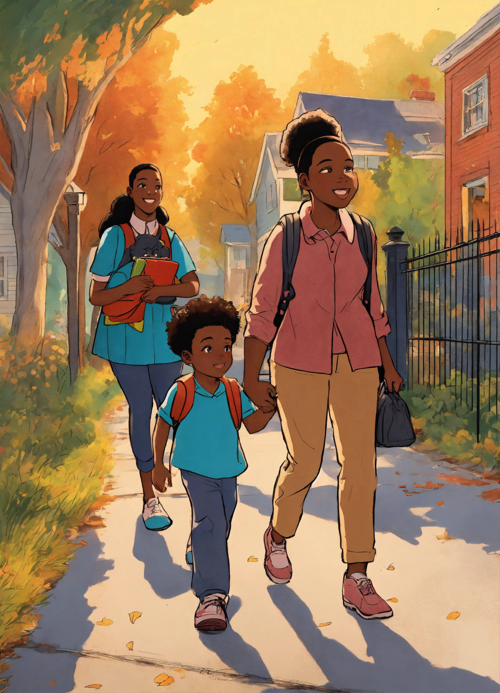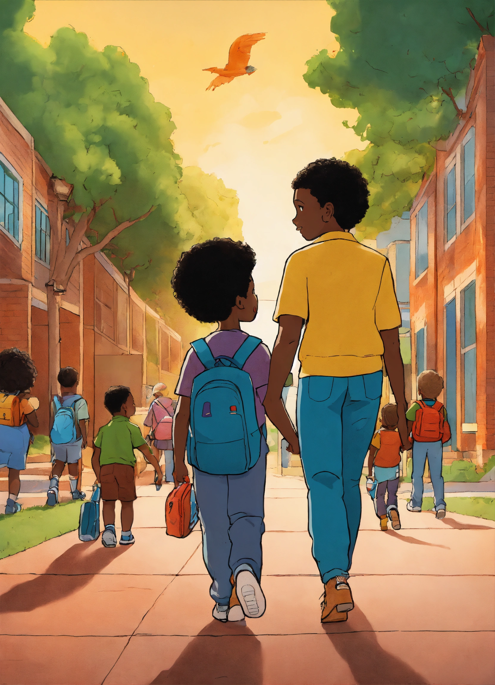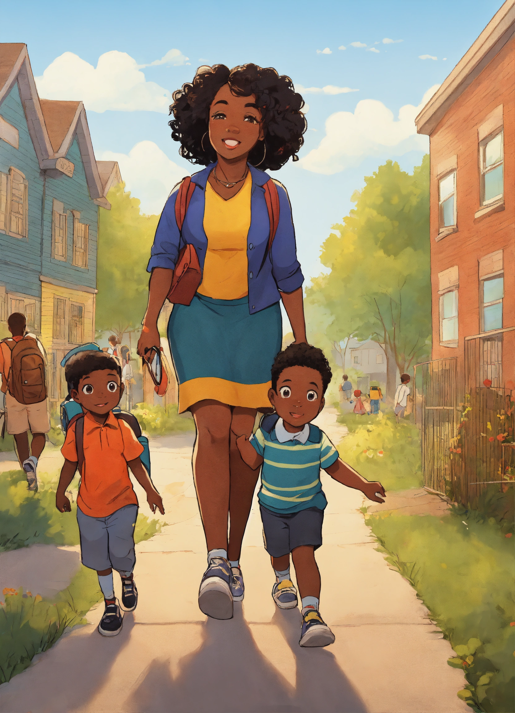 Cartoon, colorful, illustrate a black toddler boy and black mom walking hand in hand to school, other children in background