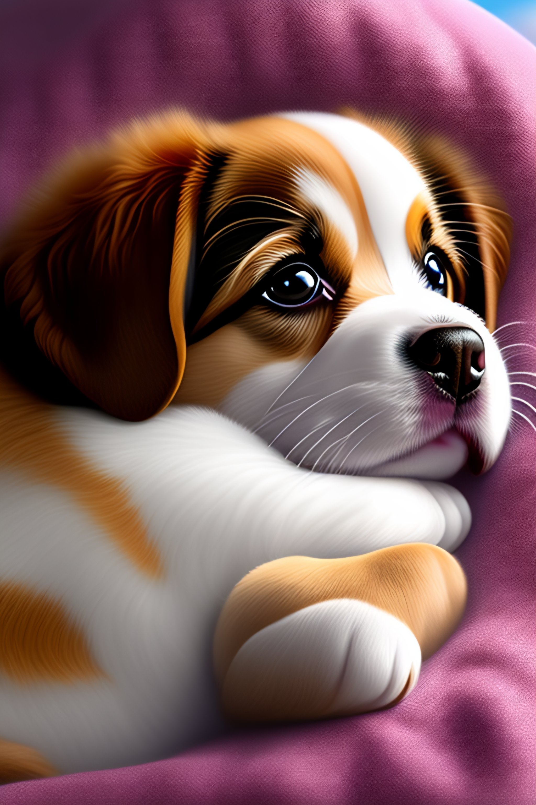 Cute cartoon puppy dog sleeping, dreaming curled up on a bed, painting & pencil drawing very realistic, far back view with clouds in the sky, painting 4k