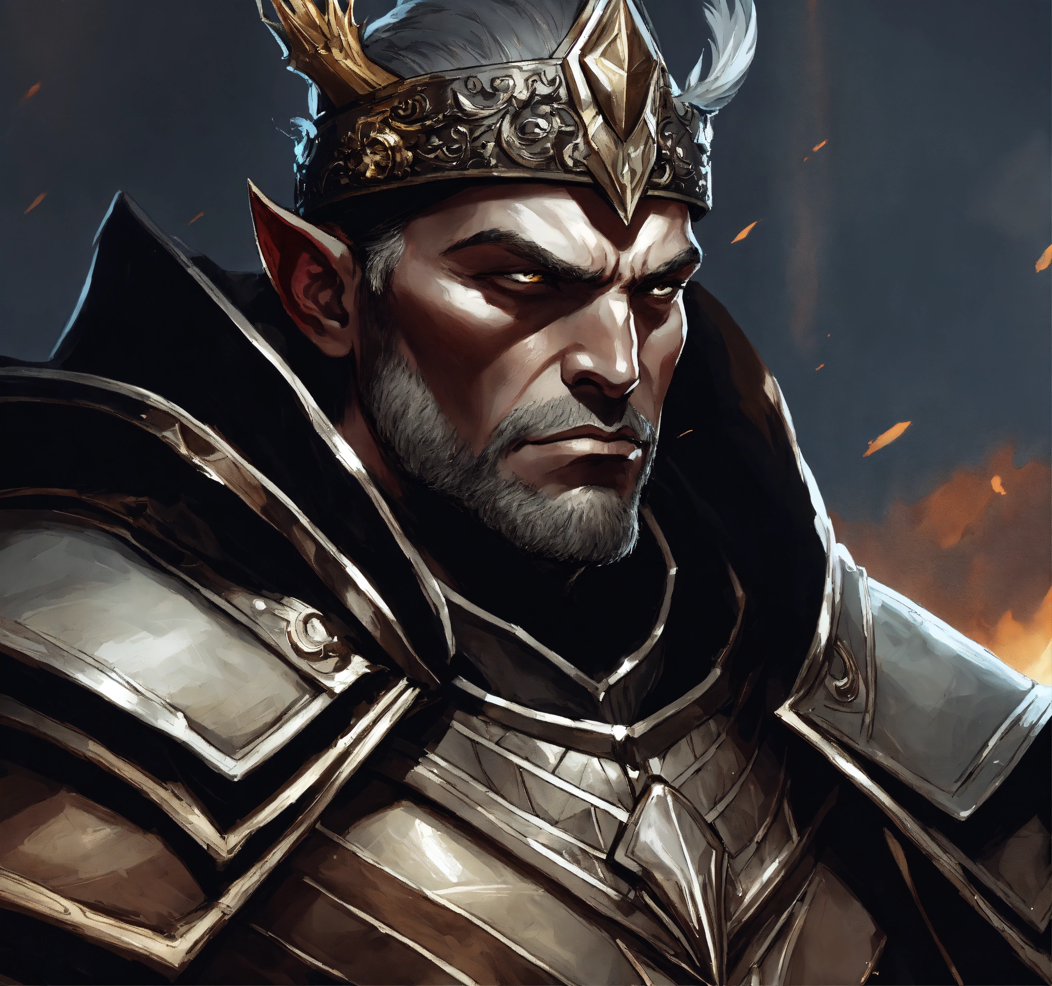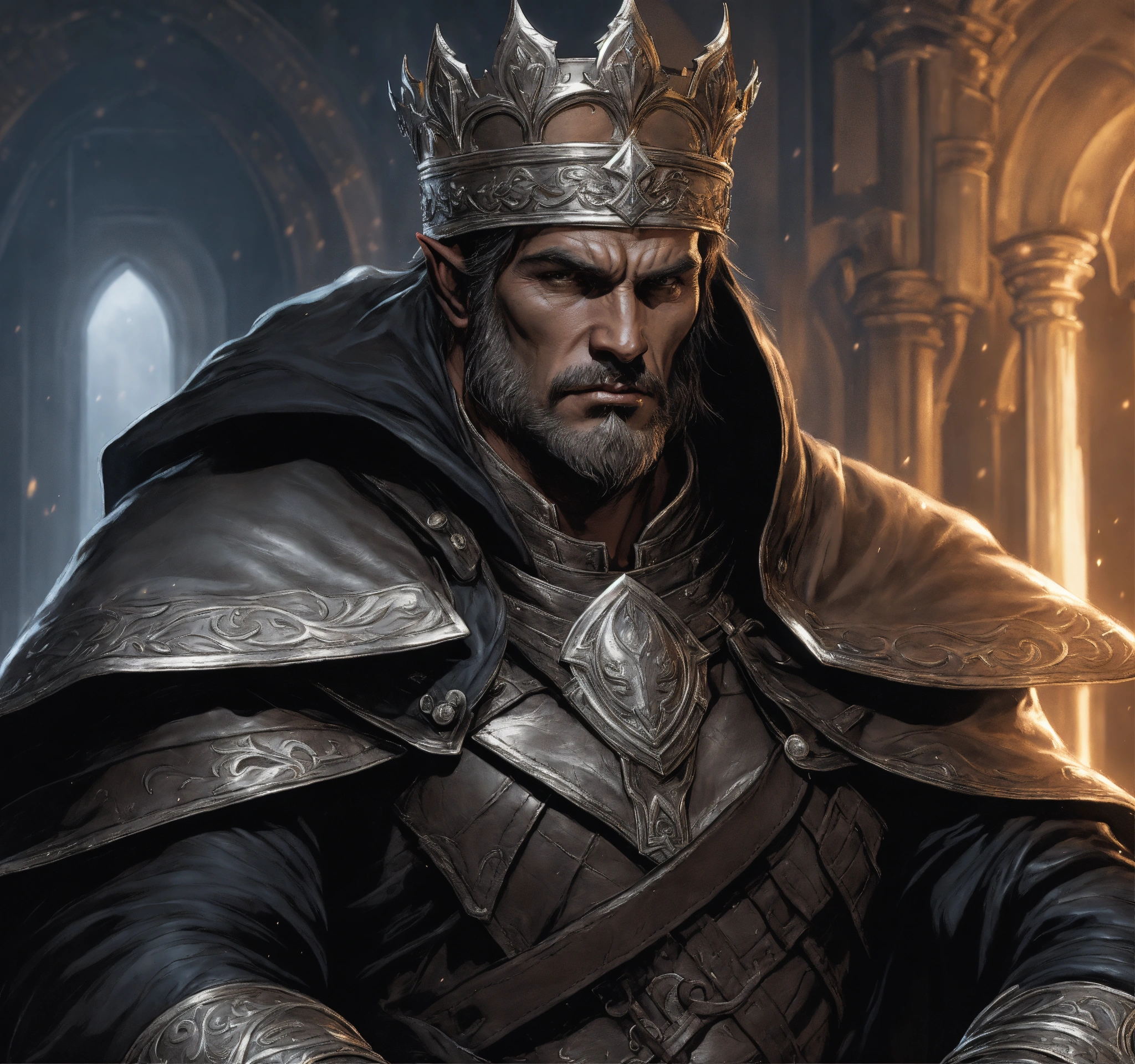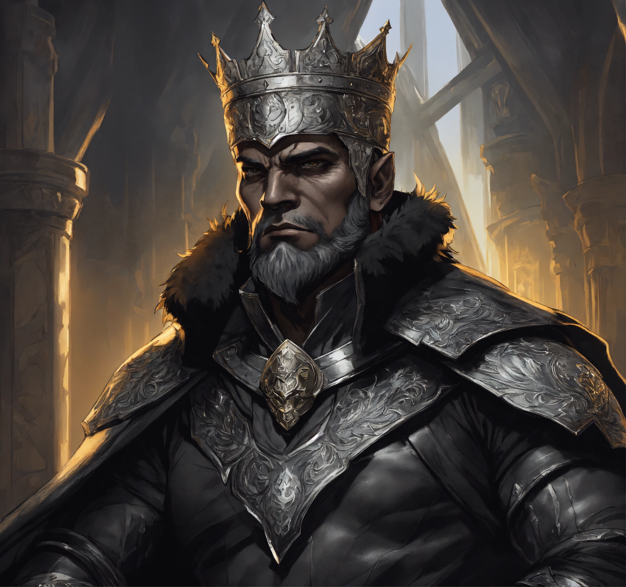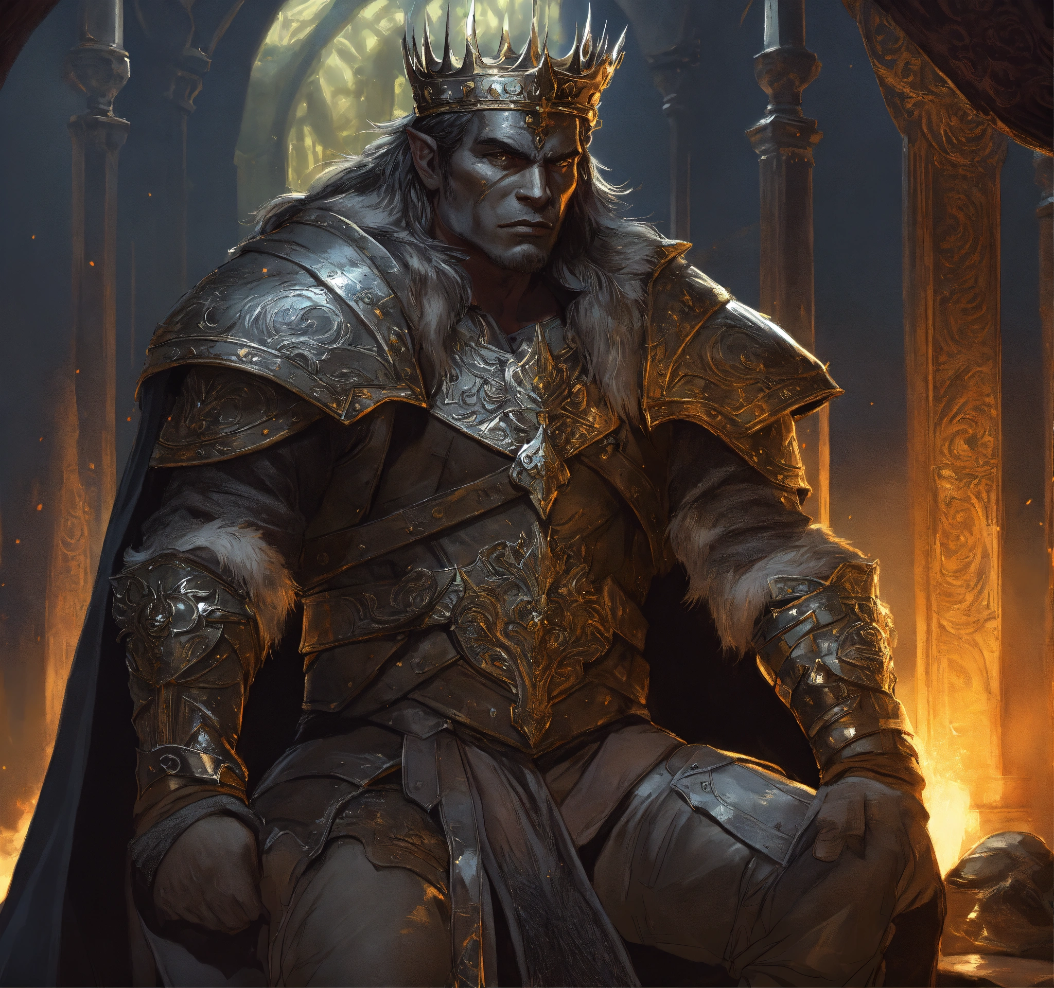 Fantasy setting, an enigmatic 40 year old grey-skinned orc king, in leather wearing a silver crown, and black cloak with a silver lining that hides most of the armor, sitting in a heroic profile pose, head facing, shrouded in glory, highly detailed, comic graphic novel art, top-rated, sharp, no blur, edited, corrected