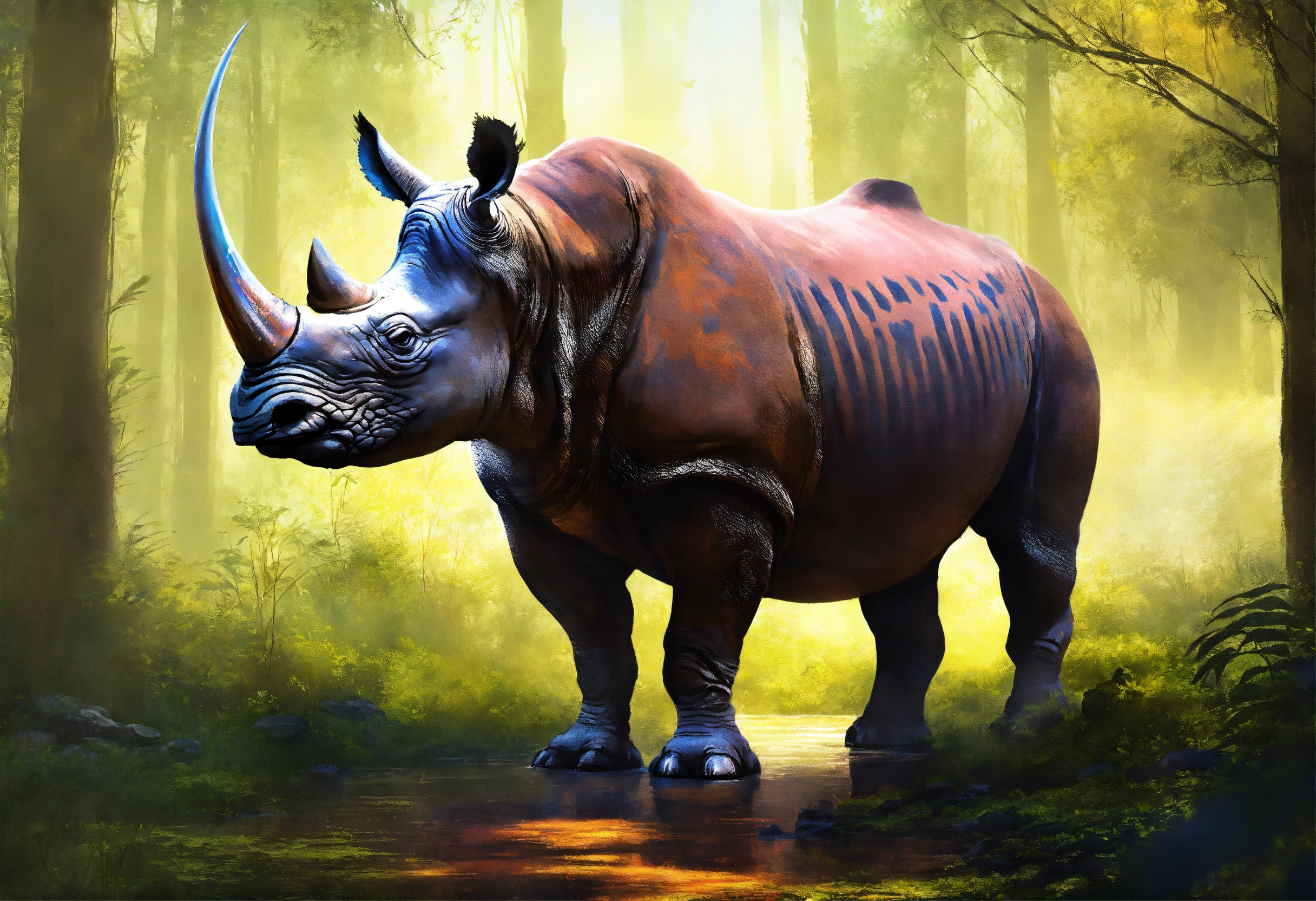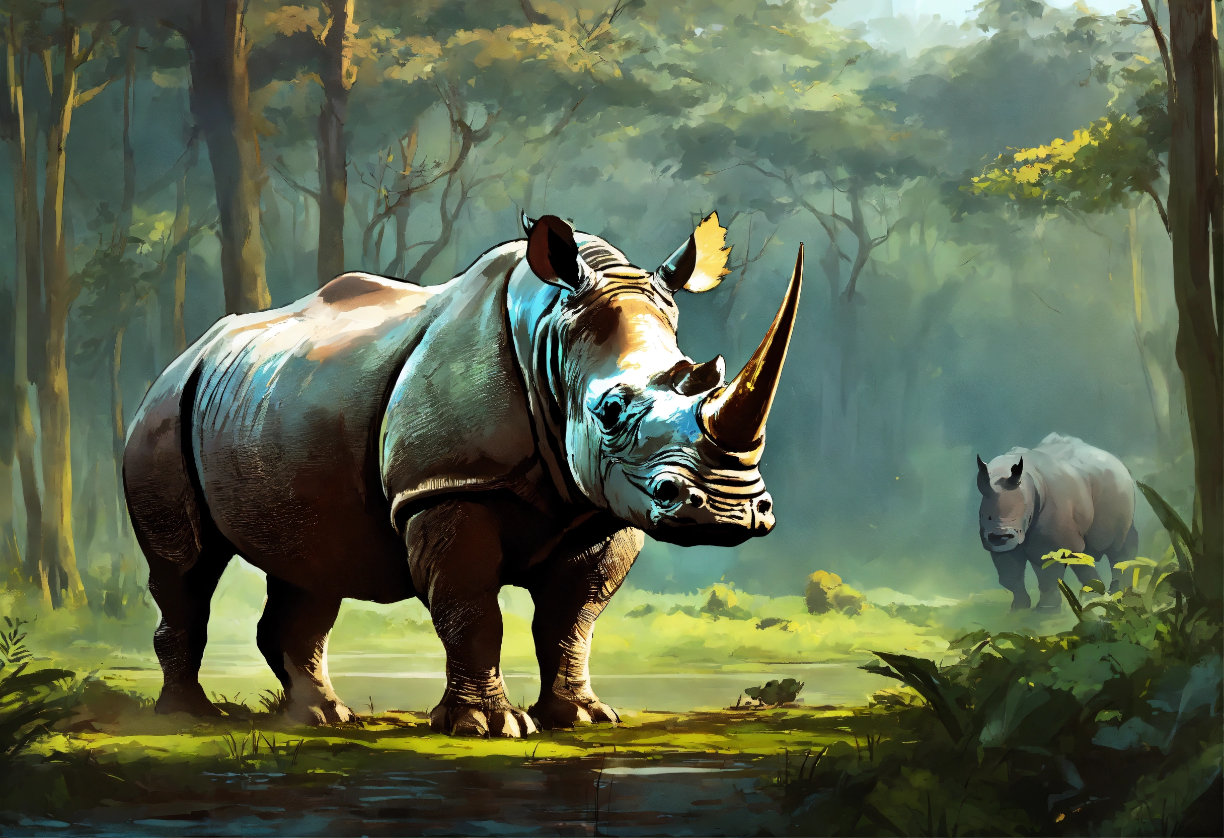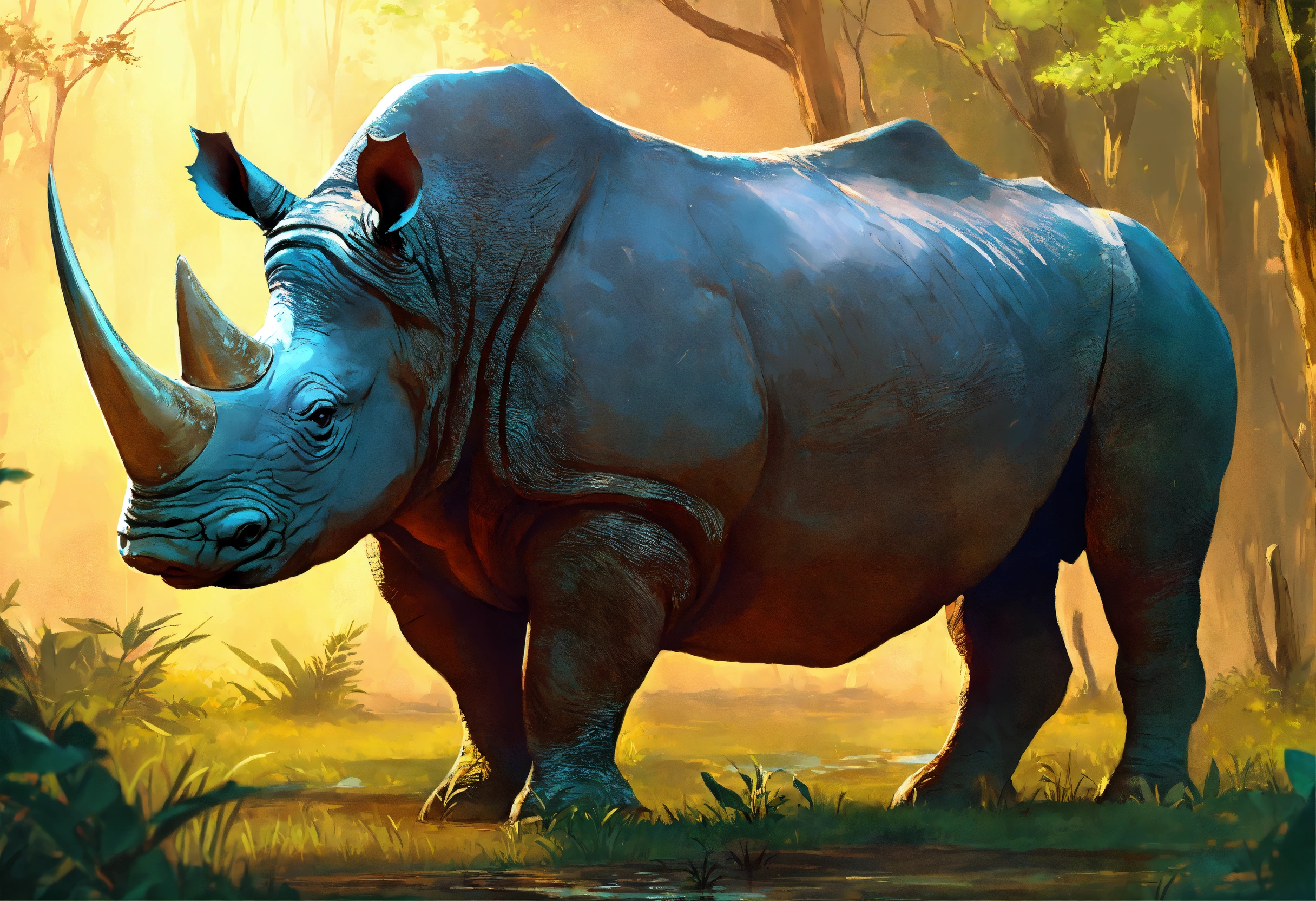 Concept art of a rhino with a massive horn the size of its head in a wetland forest
