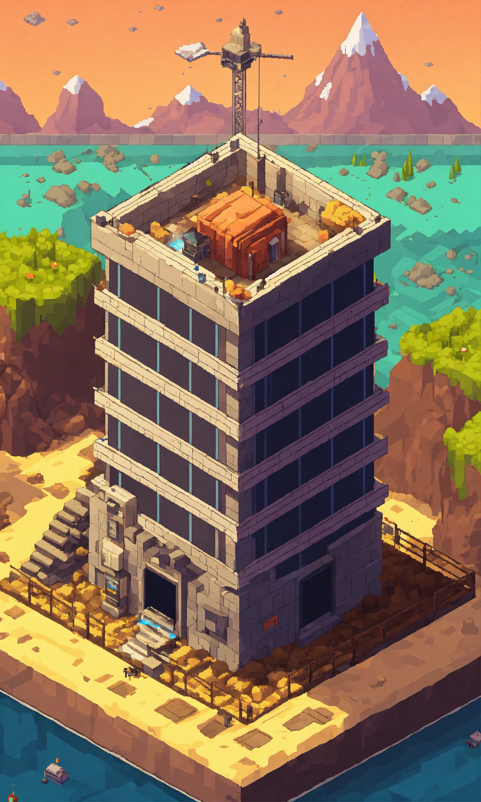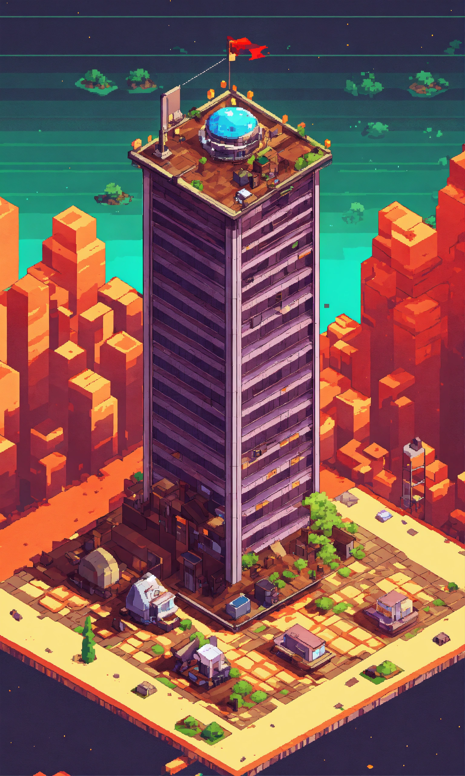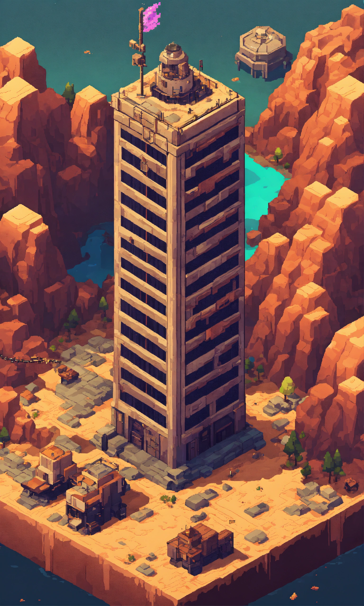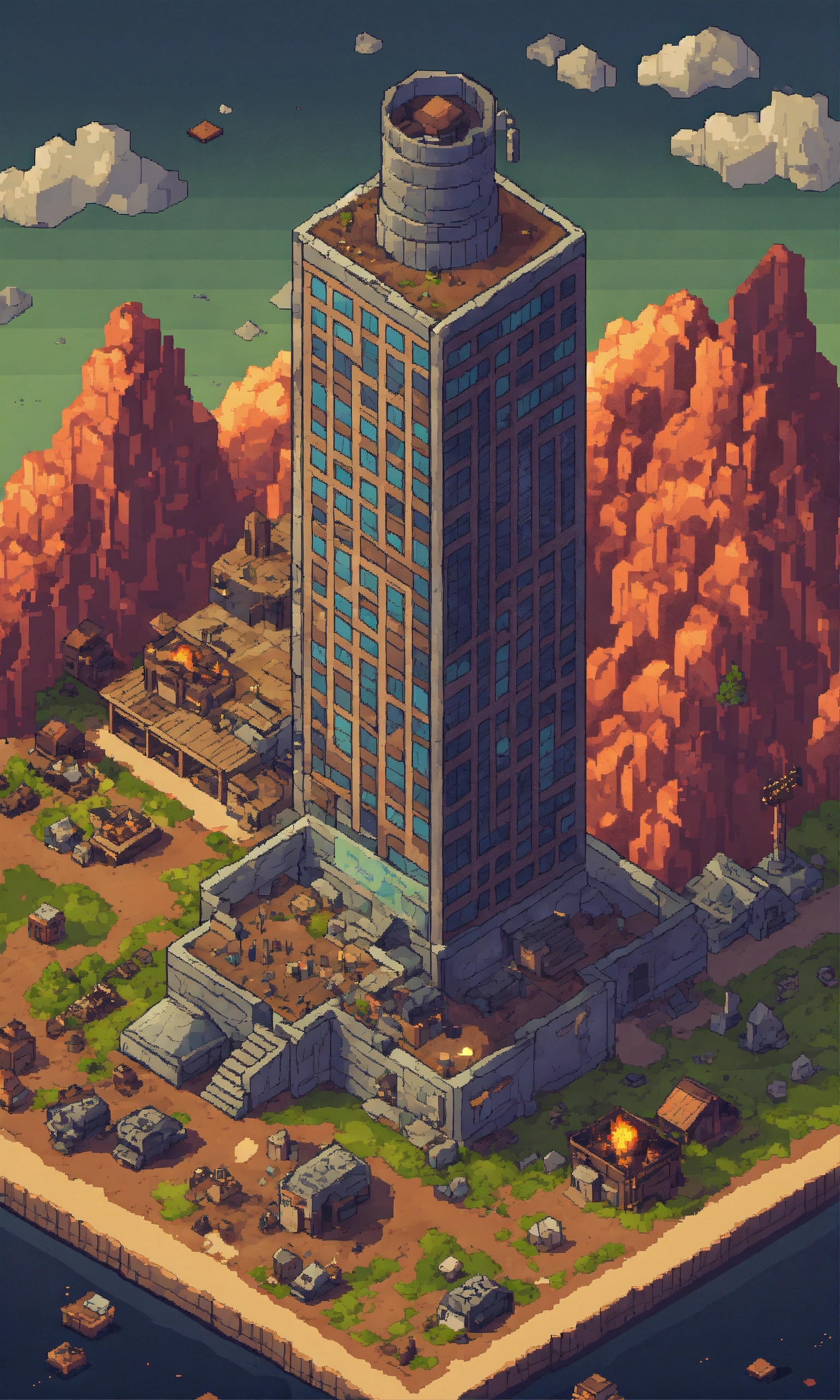 Isometric tower defense mobile game simplistic pixel art, level one lone tower of a post-apocalyptic human settlement tower after ai apocalypse, middle of the map with apocalypse surrounding