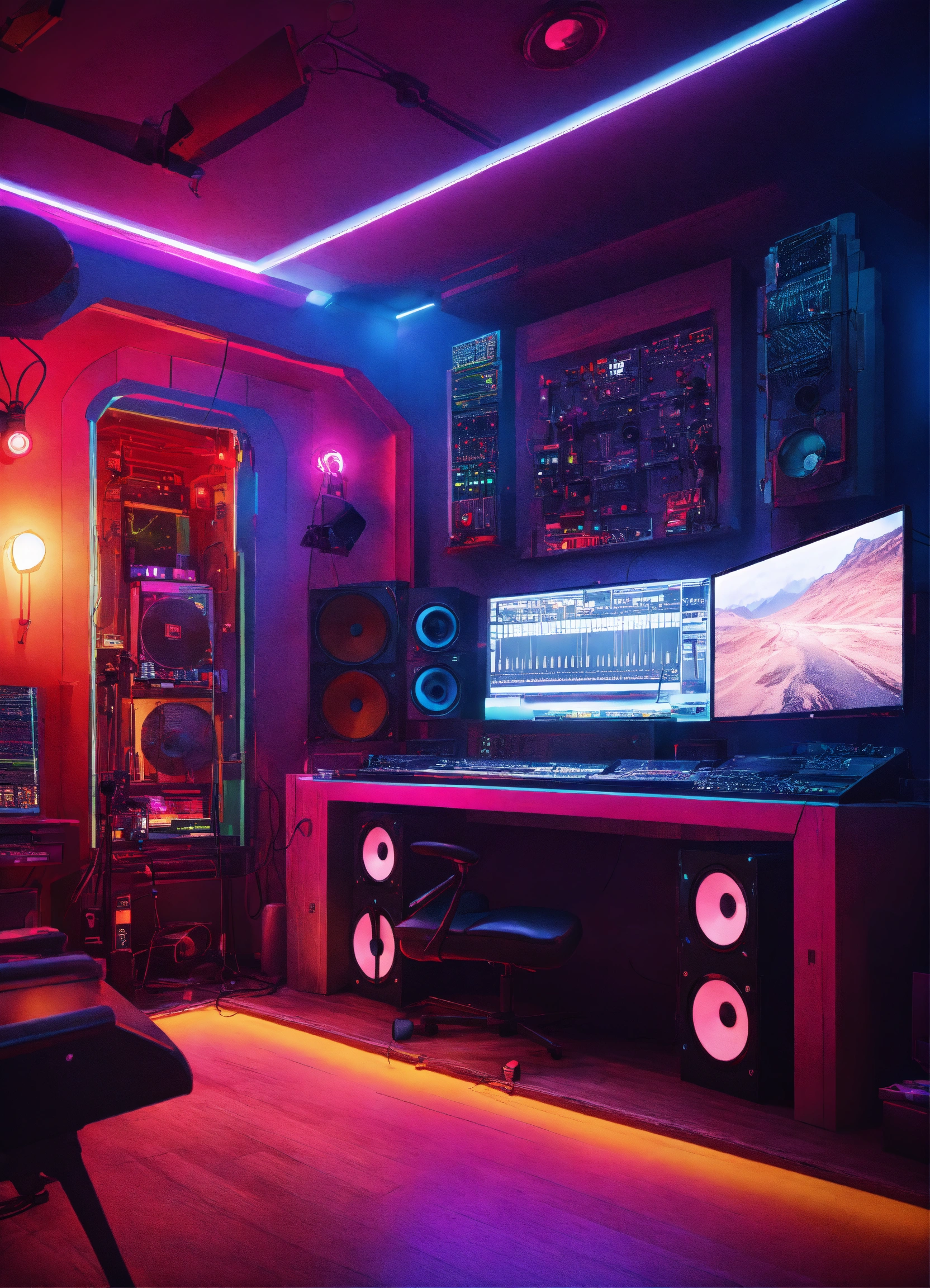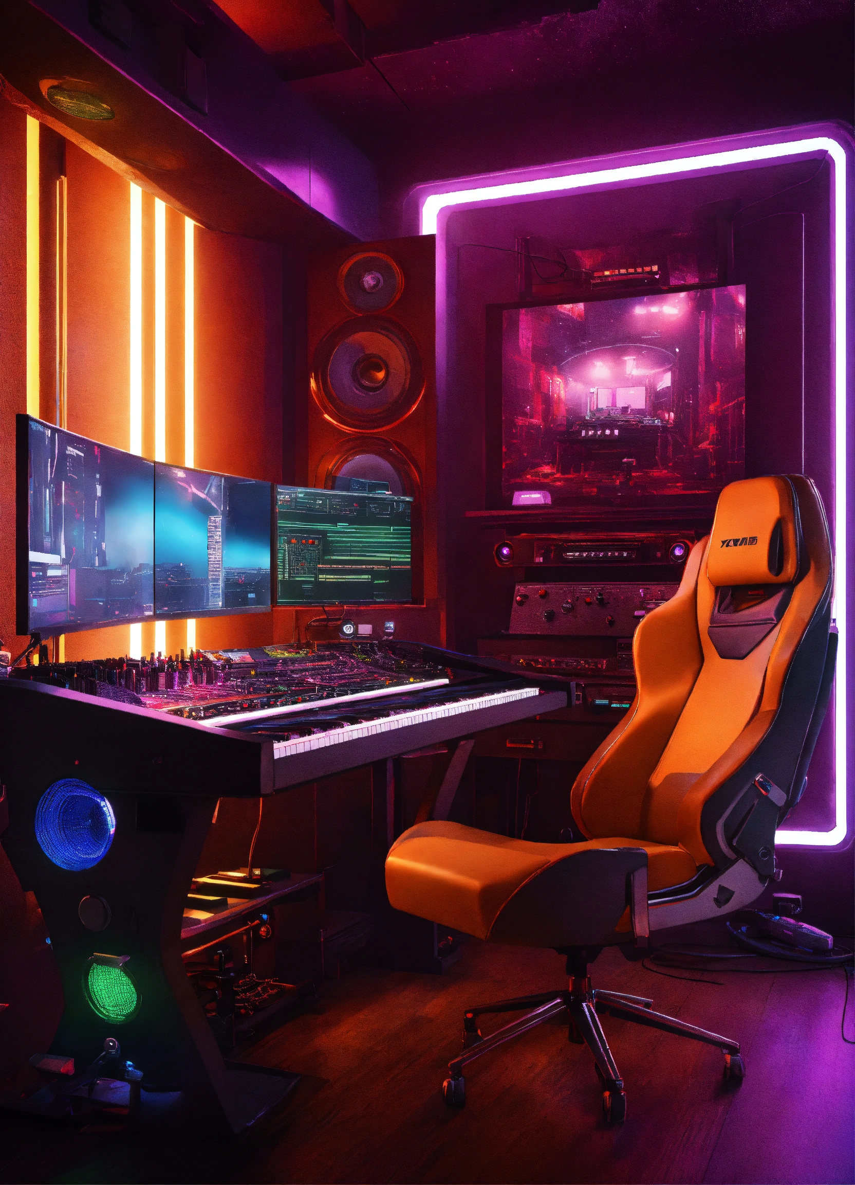 Futuristic cyberpunk homey cozy recording studio, color, vivid color, interior design, 3d, unreal egine 5, realistic, full hd.