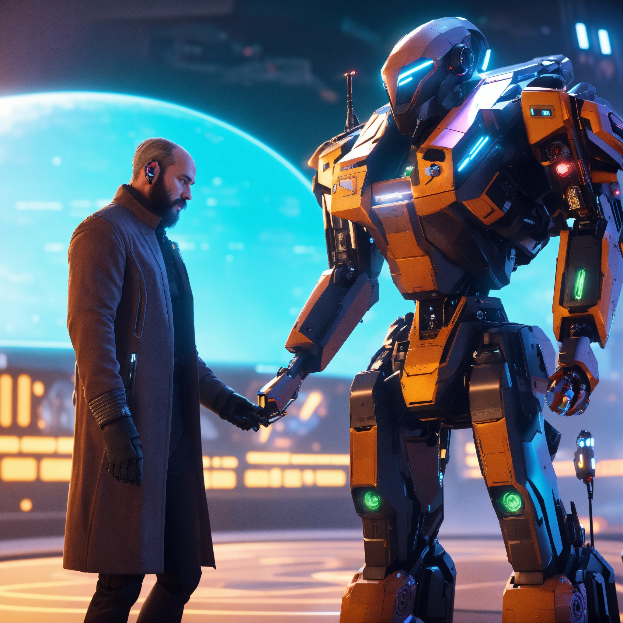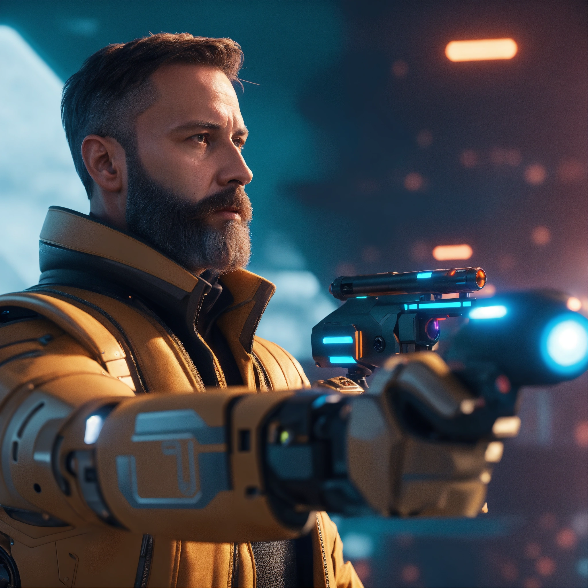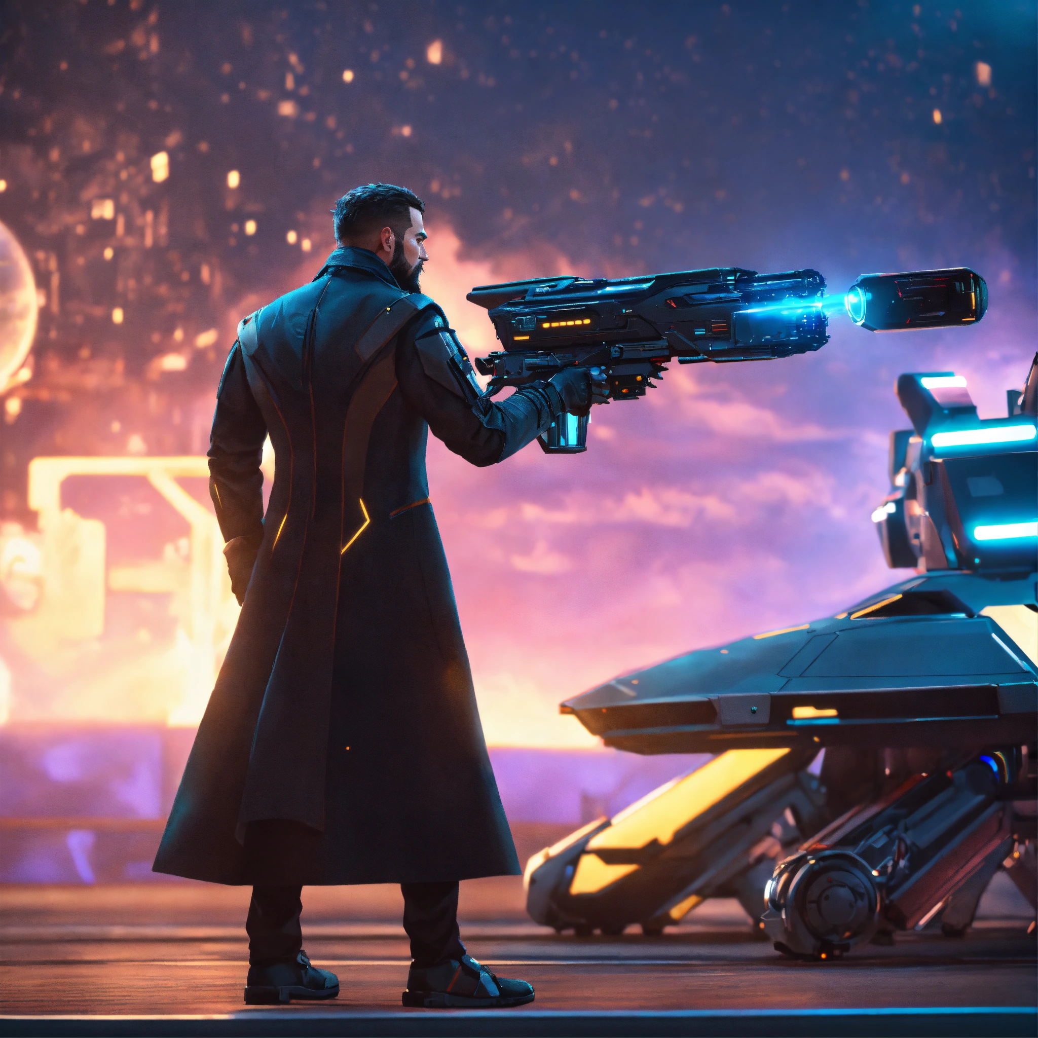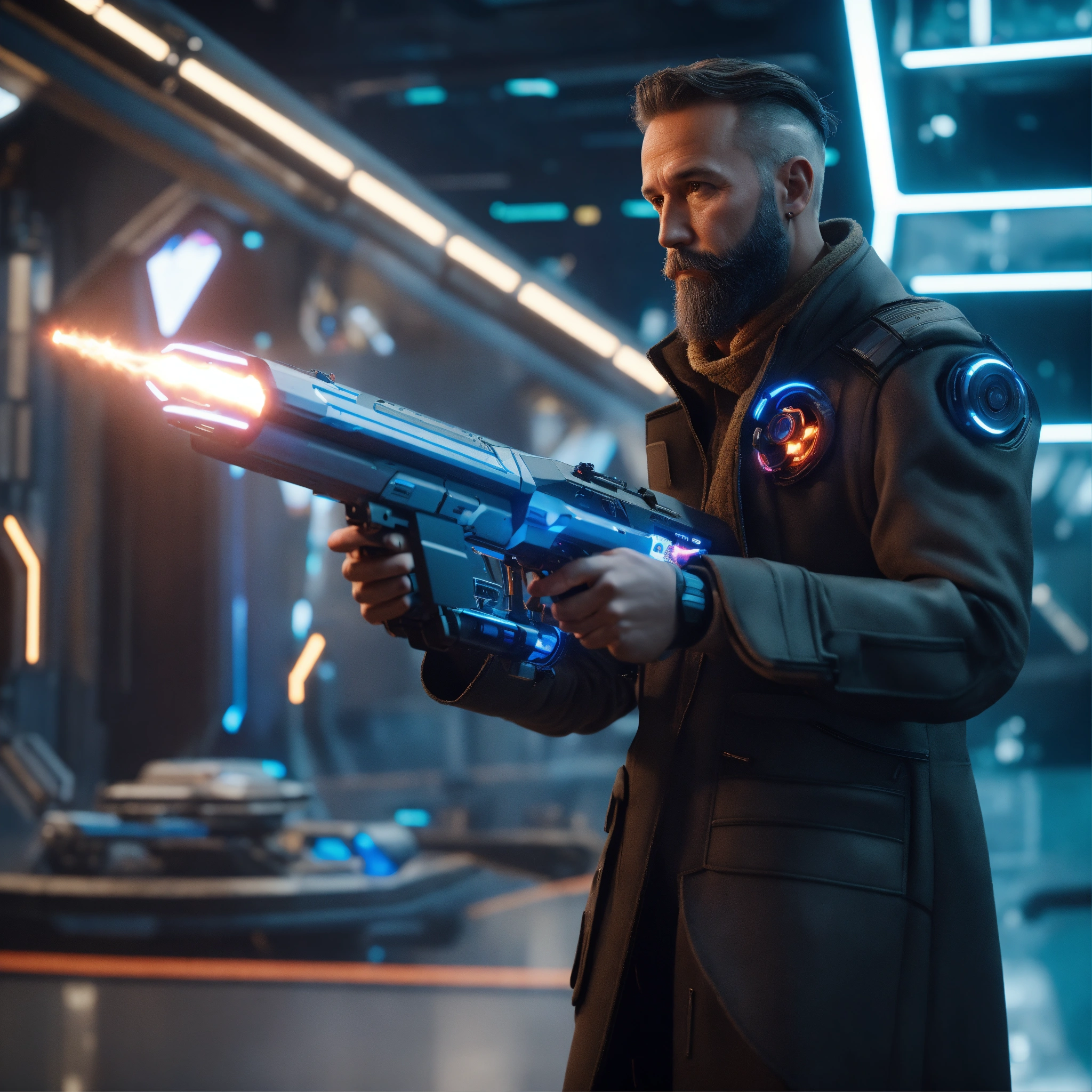 A 45 year old masculine man with trim beard in futuristic long coat shoots a sleek pulse frequency energy gun at a small flying black robotic patrol bot with claws at a space port, realistic, futuristic, sci-fi, 8k, unreal engine, pixar