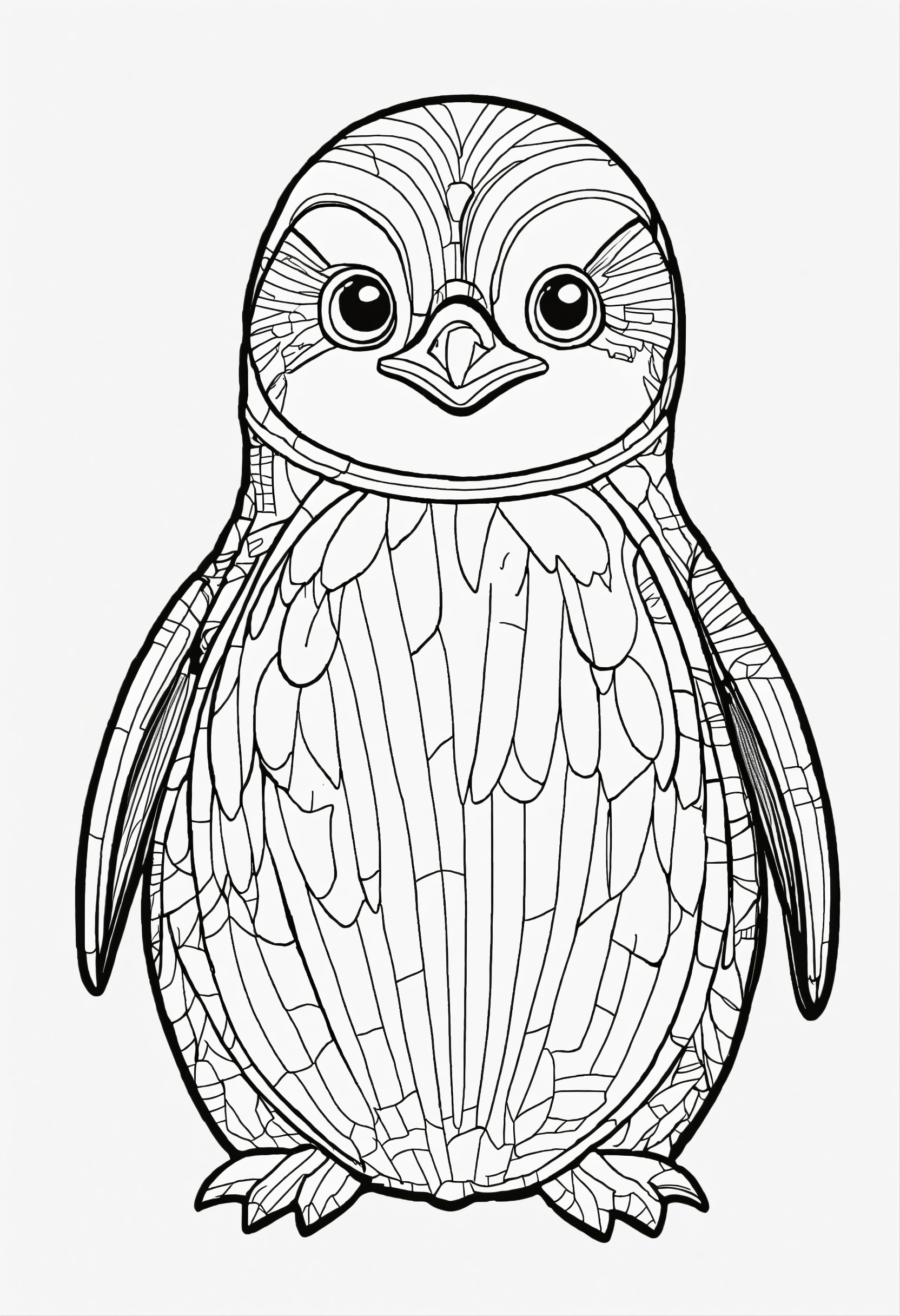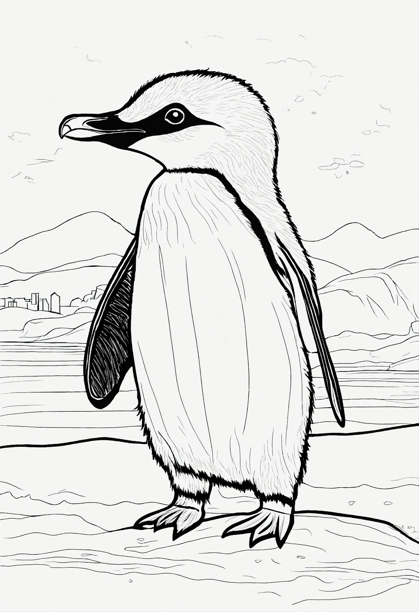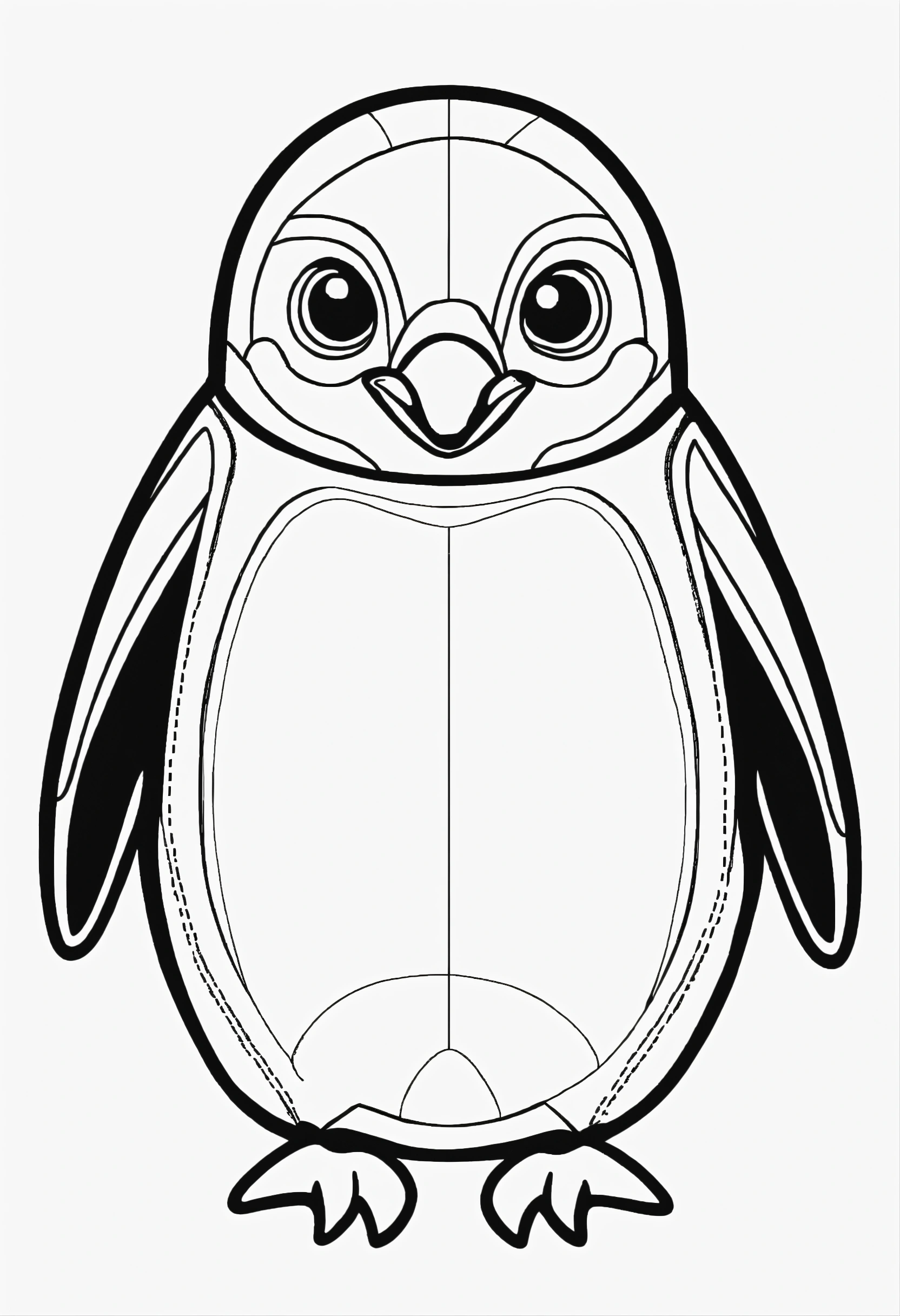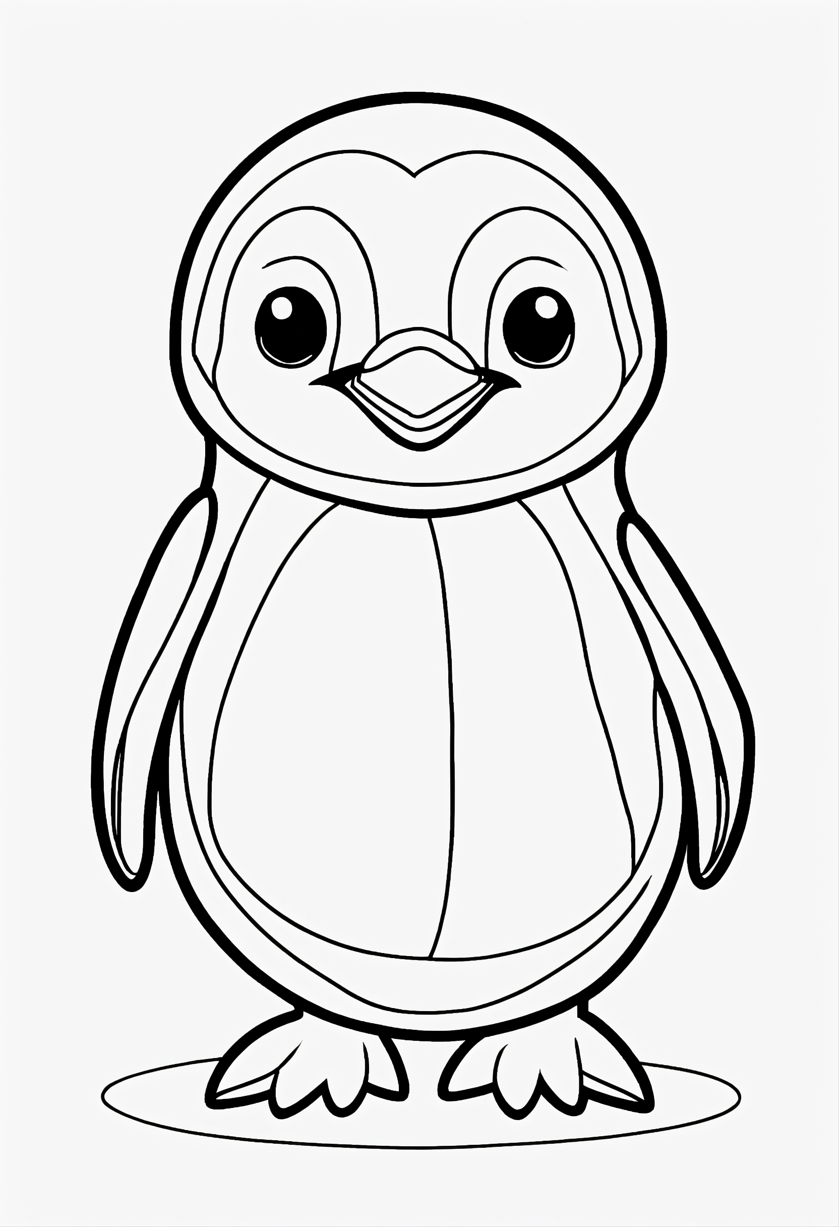 Coloring book for toddlers, simple lines drawings, no lines inside of the drawing, baby penguin, cartoon, full body, outline of the drawing in bold line, symmetrical, white background., no background image.