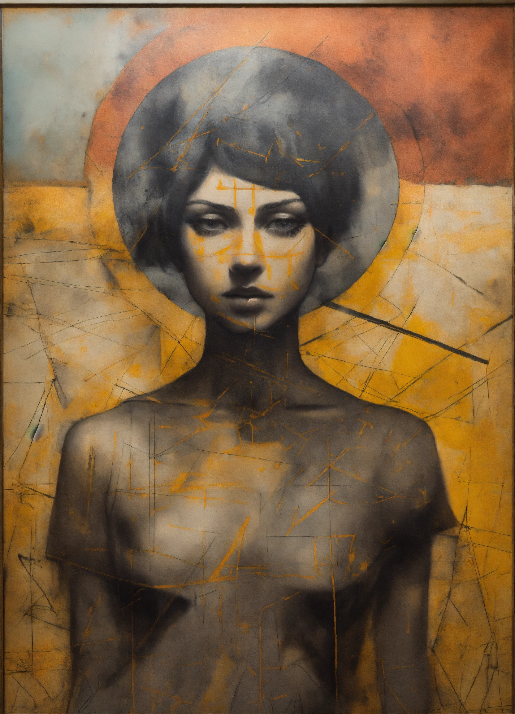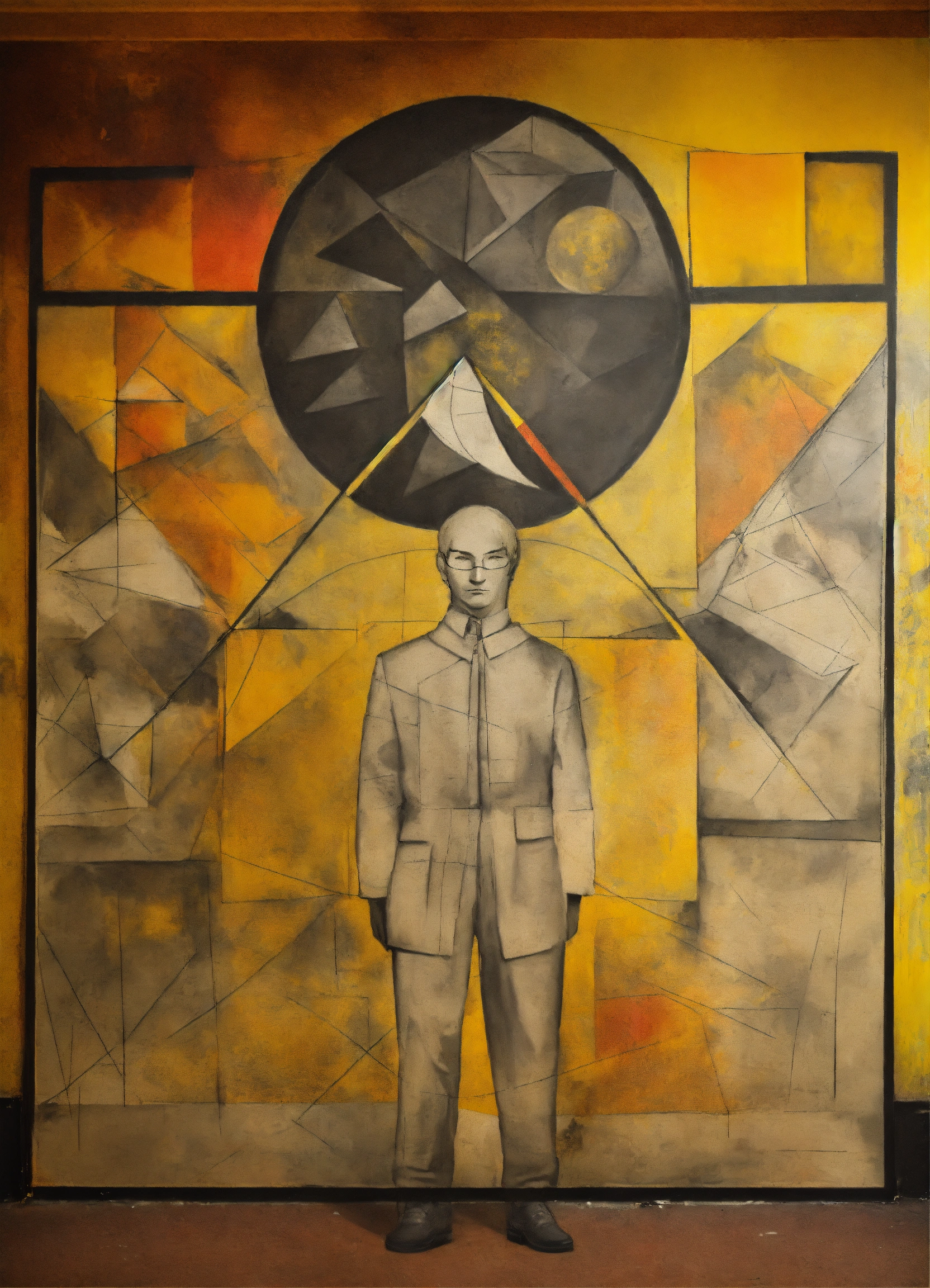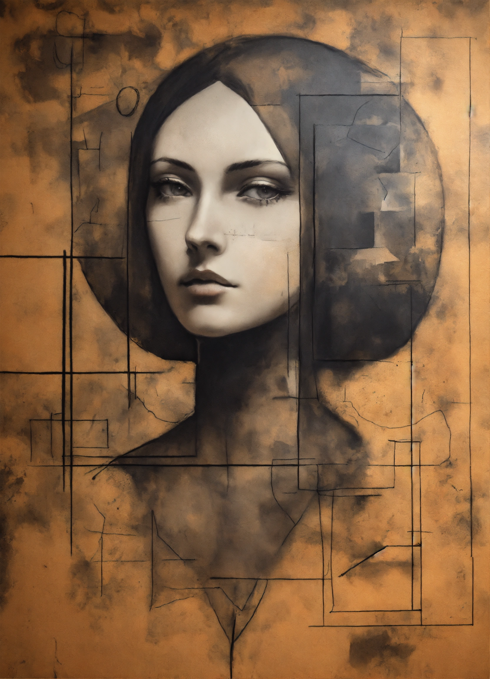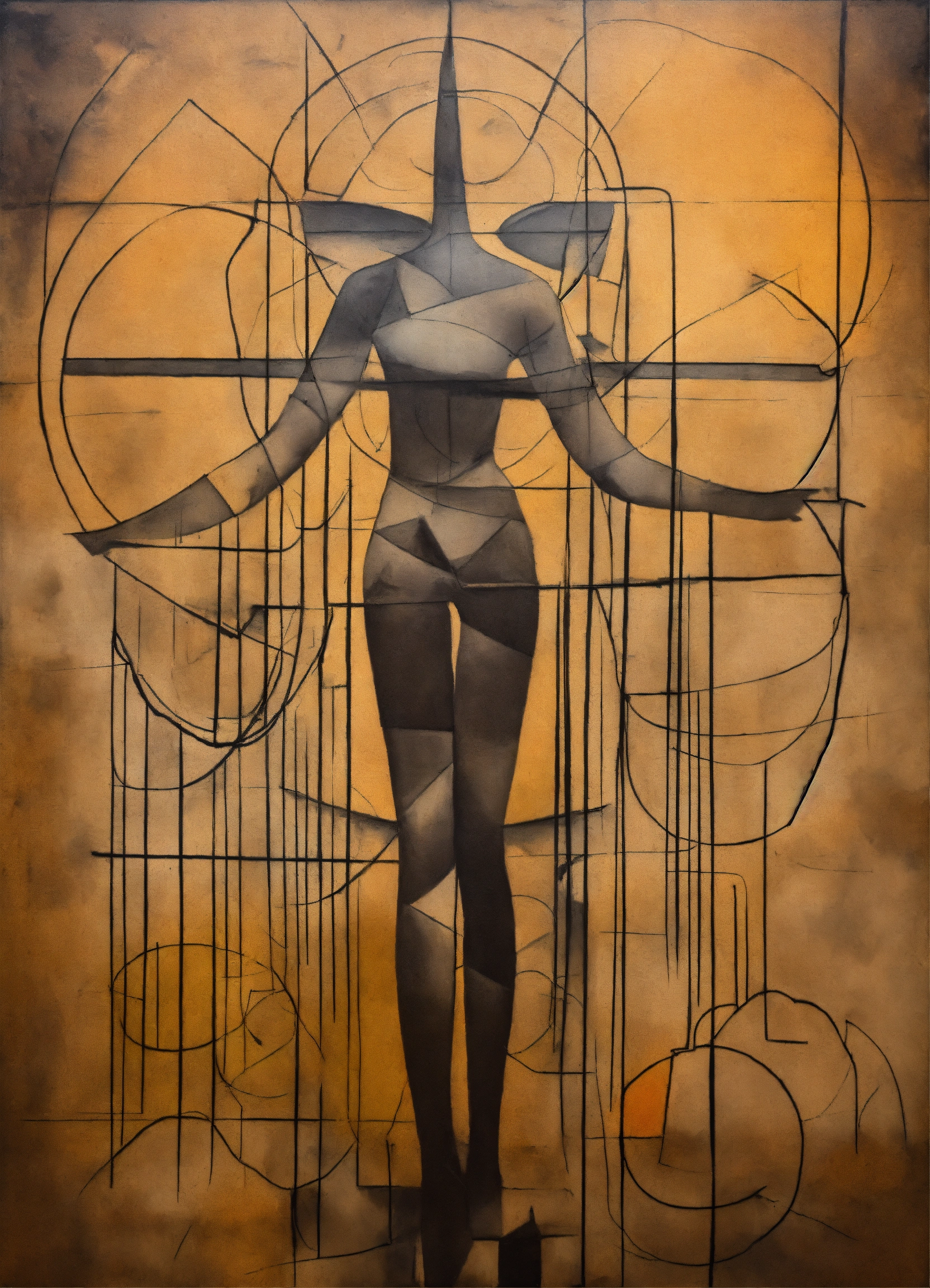Create the outline of personification of lunacy, painted with a few charcoal smudges. in the background there are three geometric figures overlaps. all on a grunge wall.