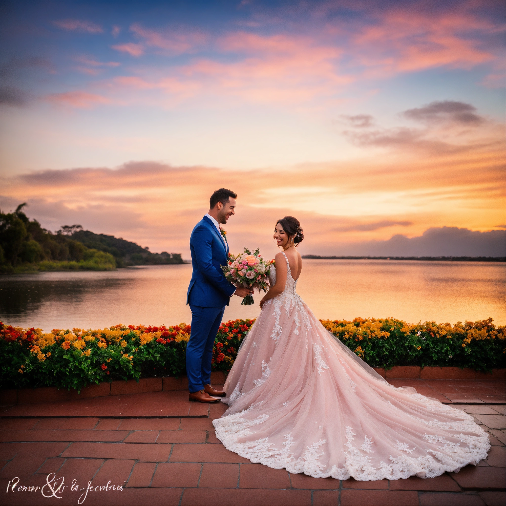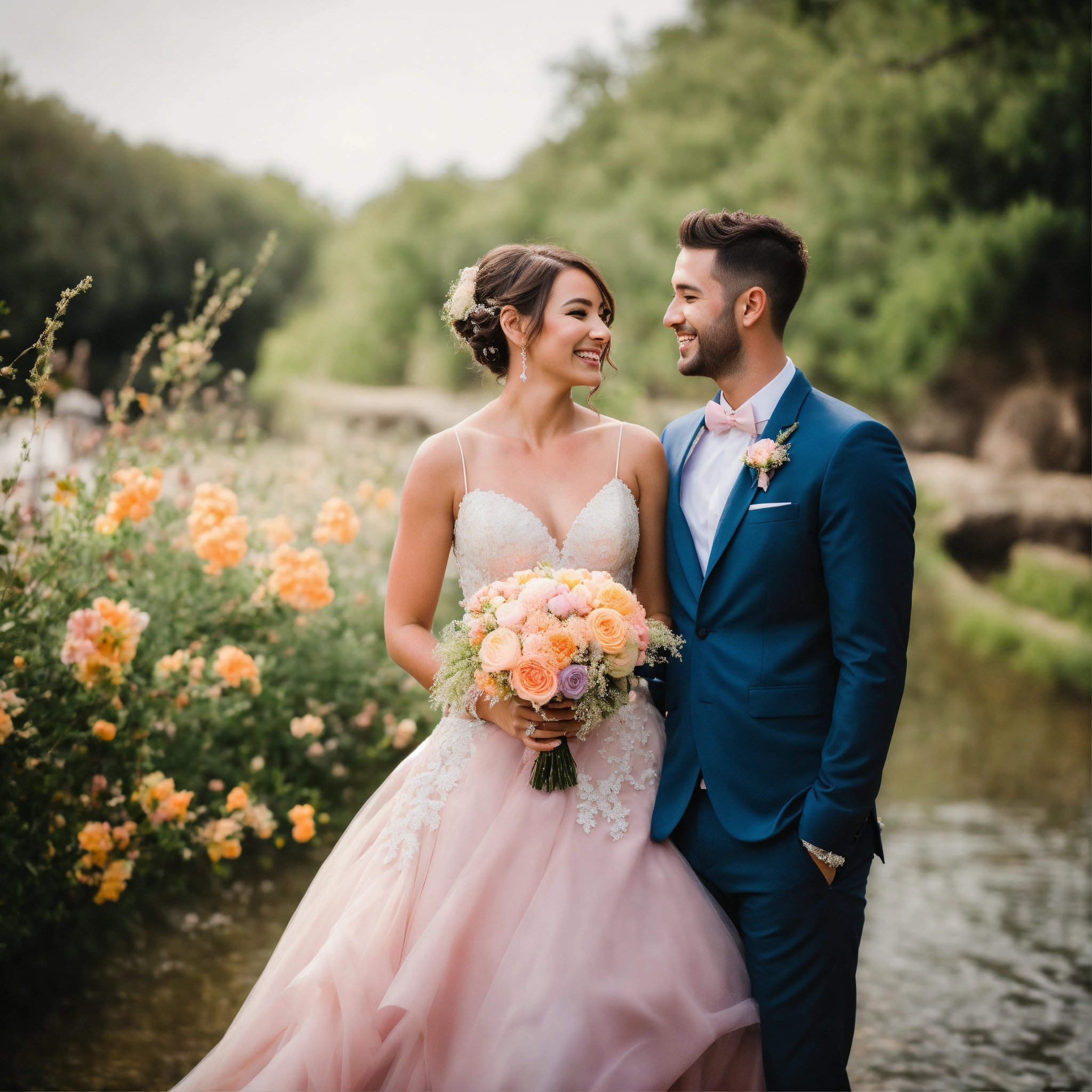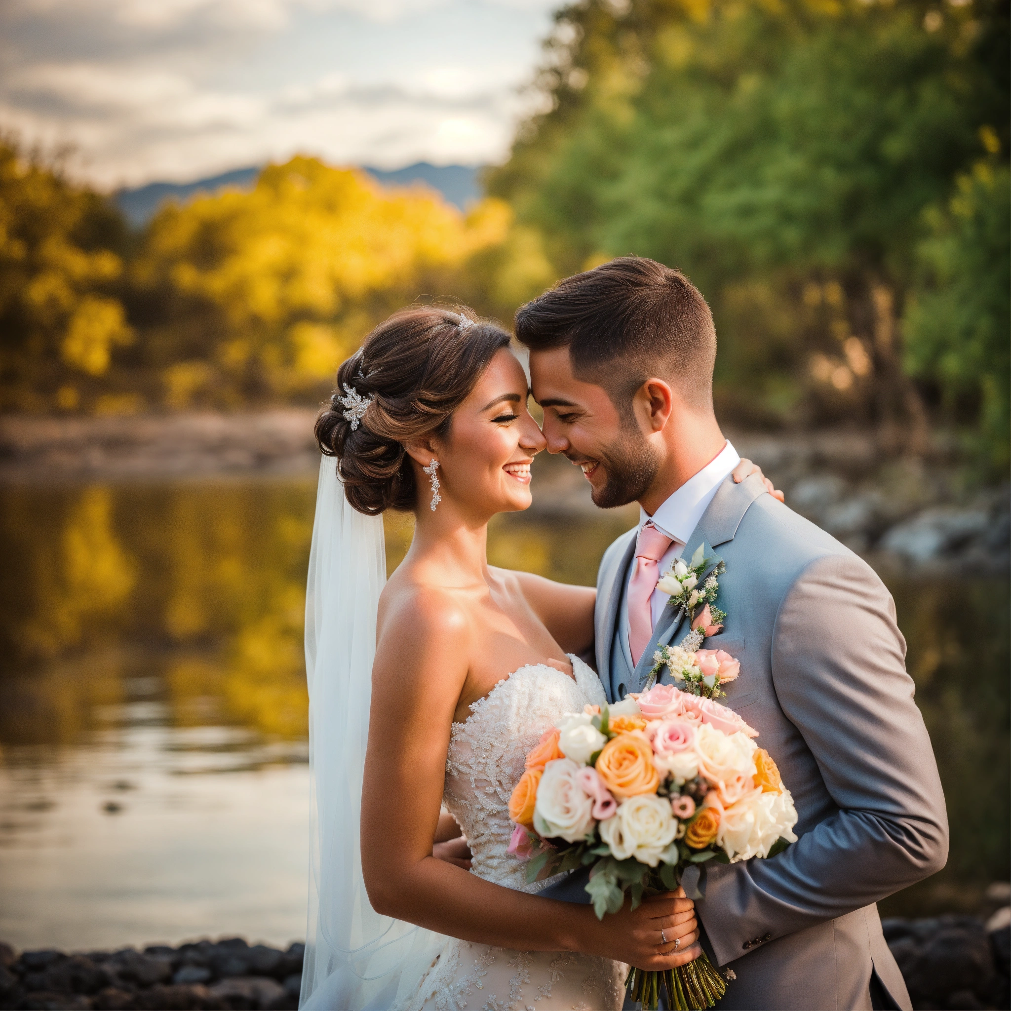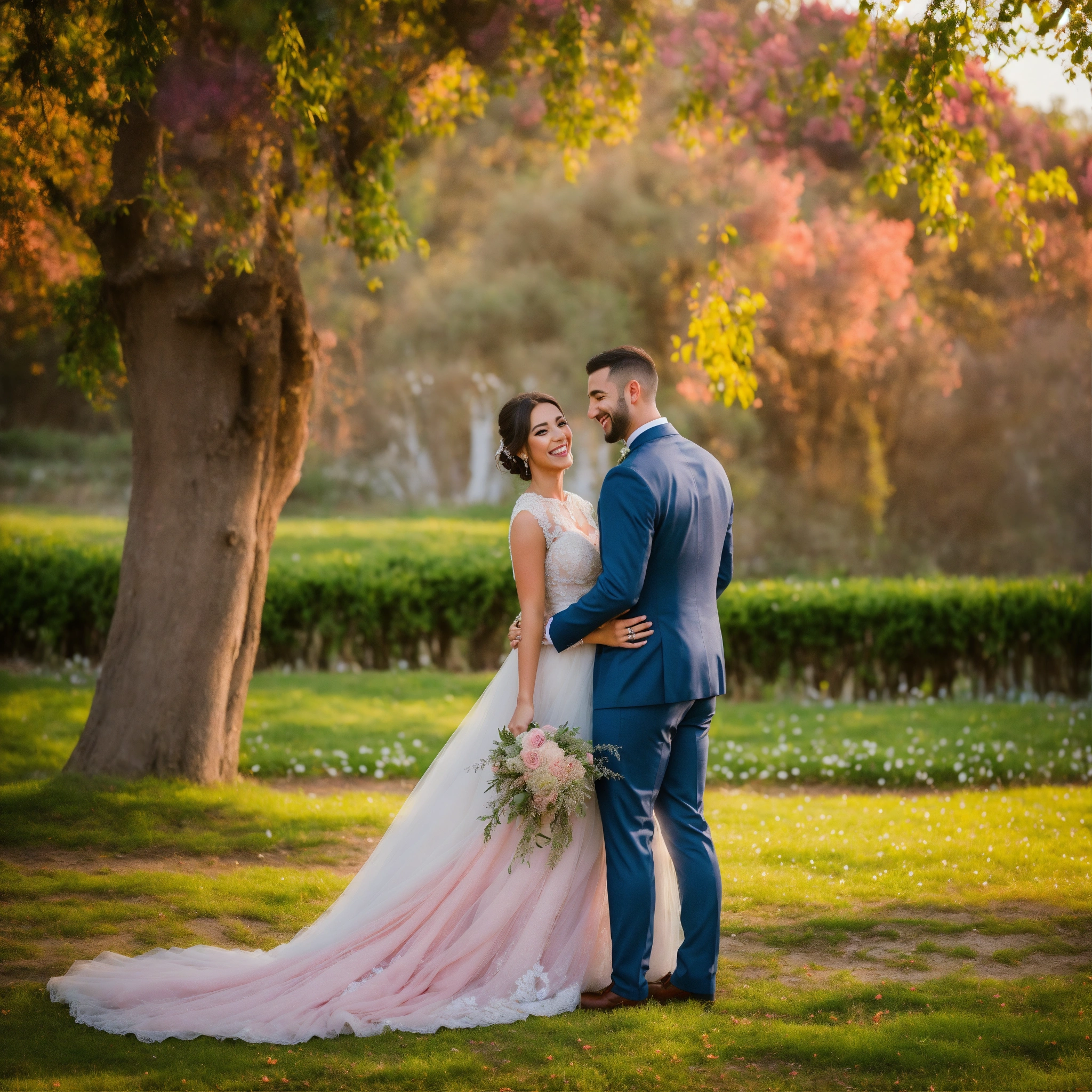 Escena de boda pareja sonriente tipo fotografia realista, elegante, con ternura infinita y una paleta de colores pastel suave. la felicidad eterna se refleja en cada detalle de esta hermosa imagen.