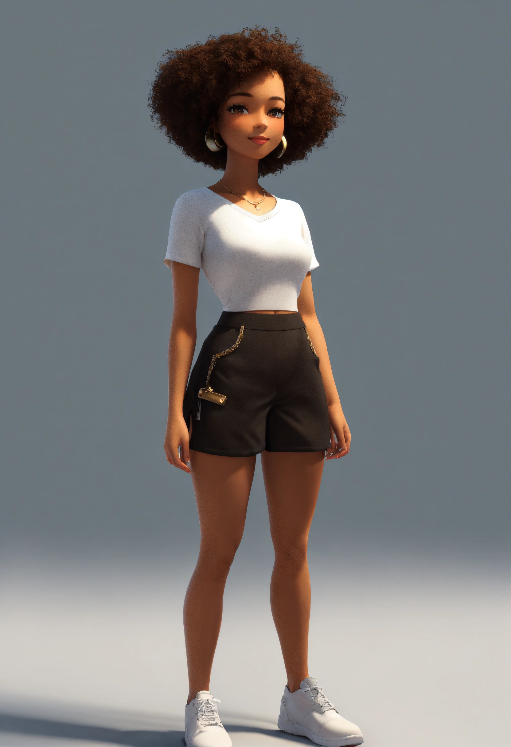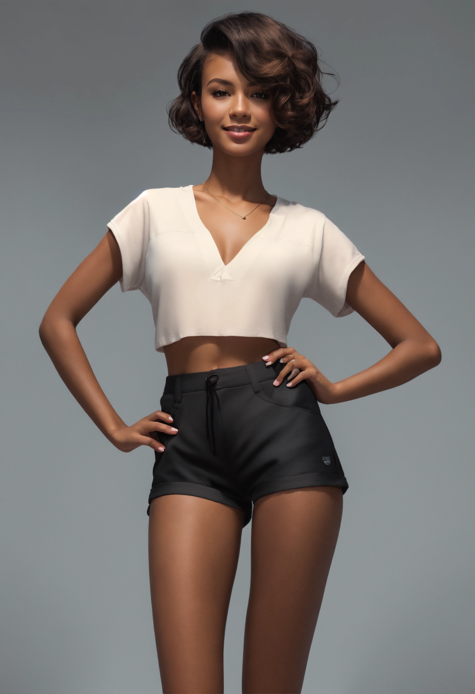 Brown skin, gorgeous 40s woman, white background, short hair, standing, facing front. hd, cartoon, body asymmetrical, no shadows toni, tan skin, gorgeous woman, white background, short hair, standing, facing front. hd, digital art, body asymmetrical, full frame, wearing a ((black shorts )))front hi key lighting, showing nice smile, 3d, show whole body, no shadows