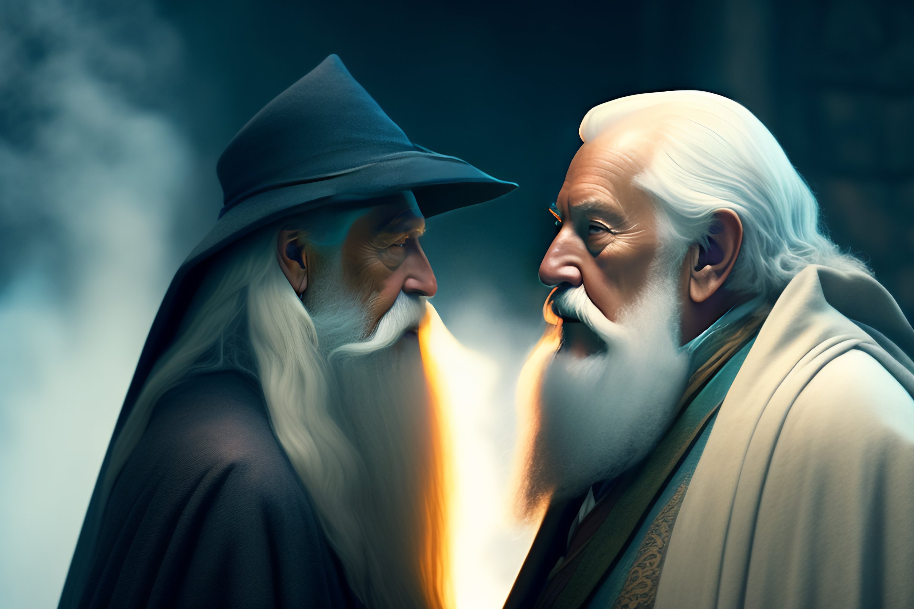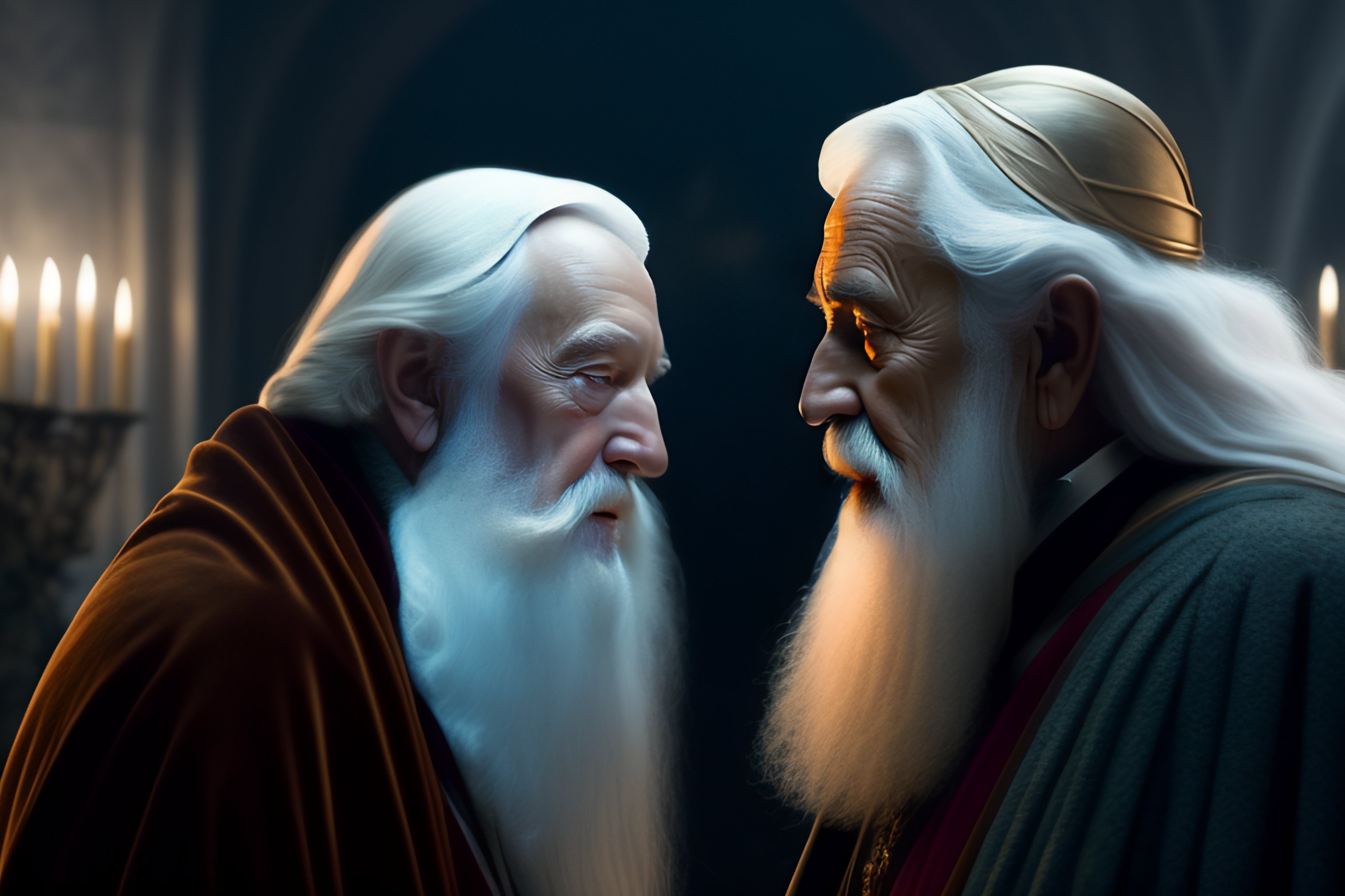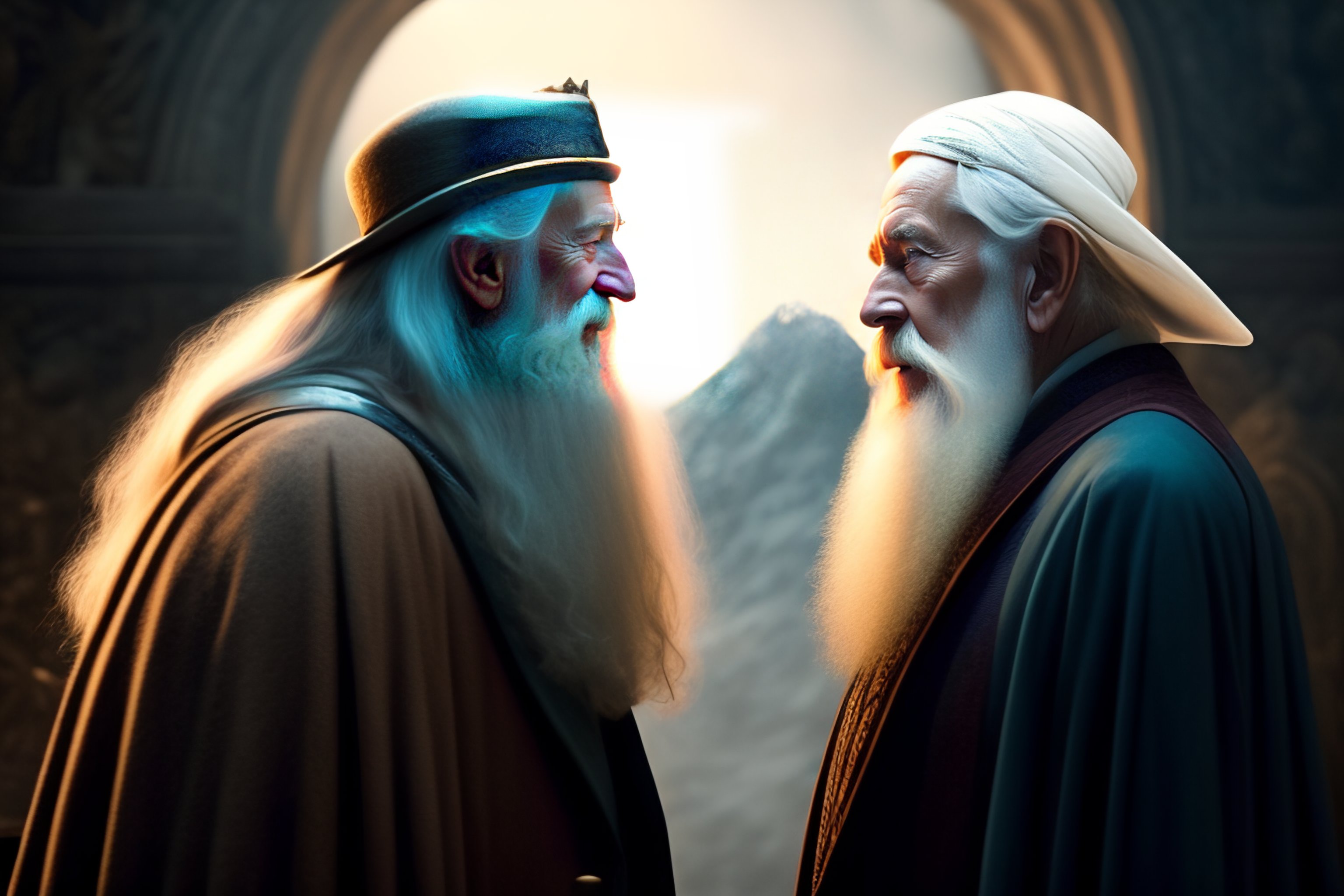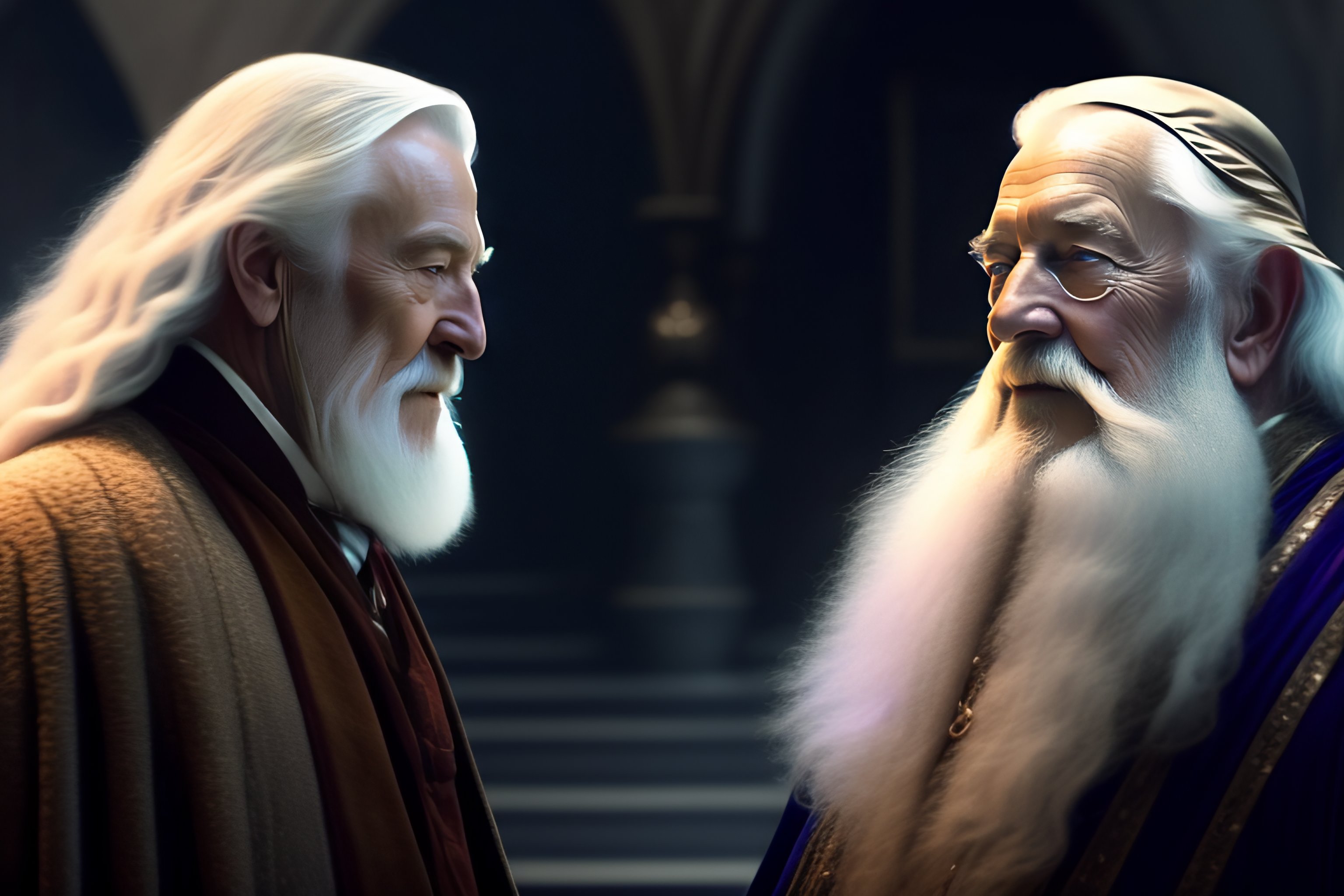 Dumbledore and gandalf standing 1meter away opposite to each other looking into each other's eyes, smiles on their faces like greeting an old friend, they are preparing to hug each other with open arms, sun lights between them before they go to hug each other