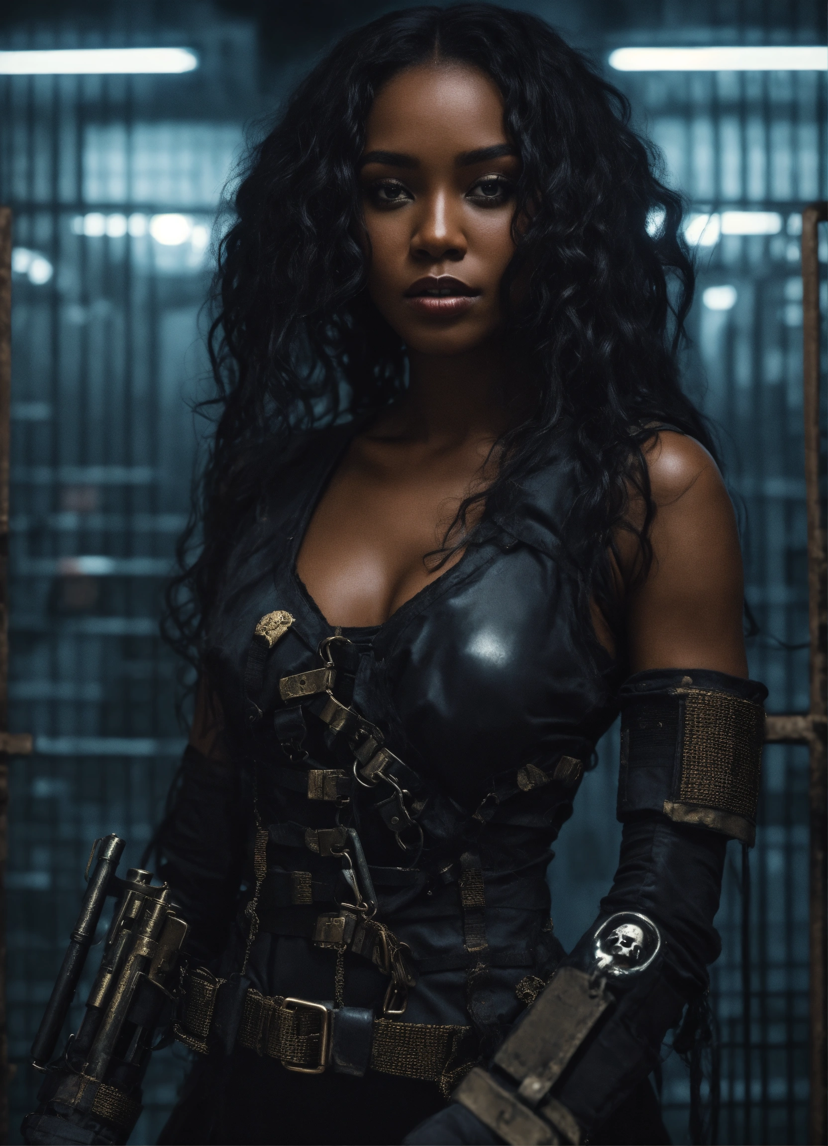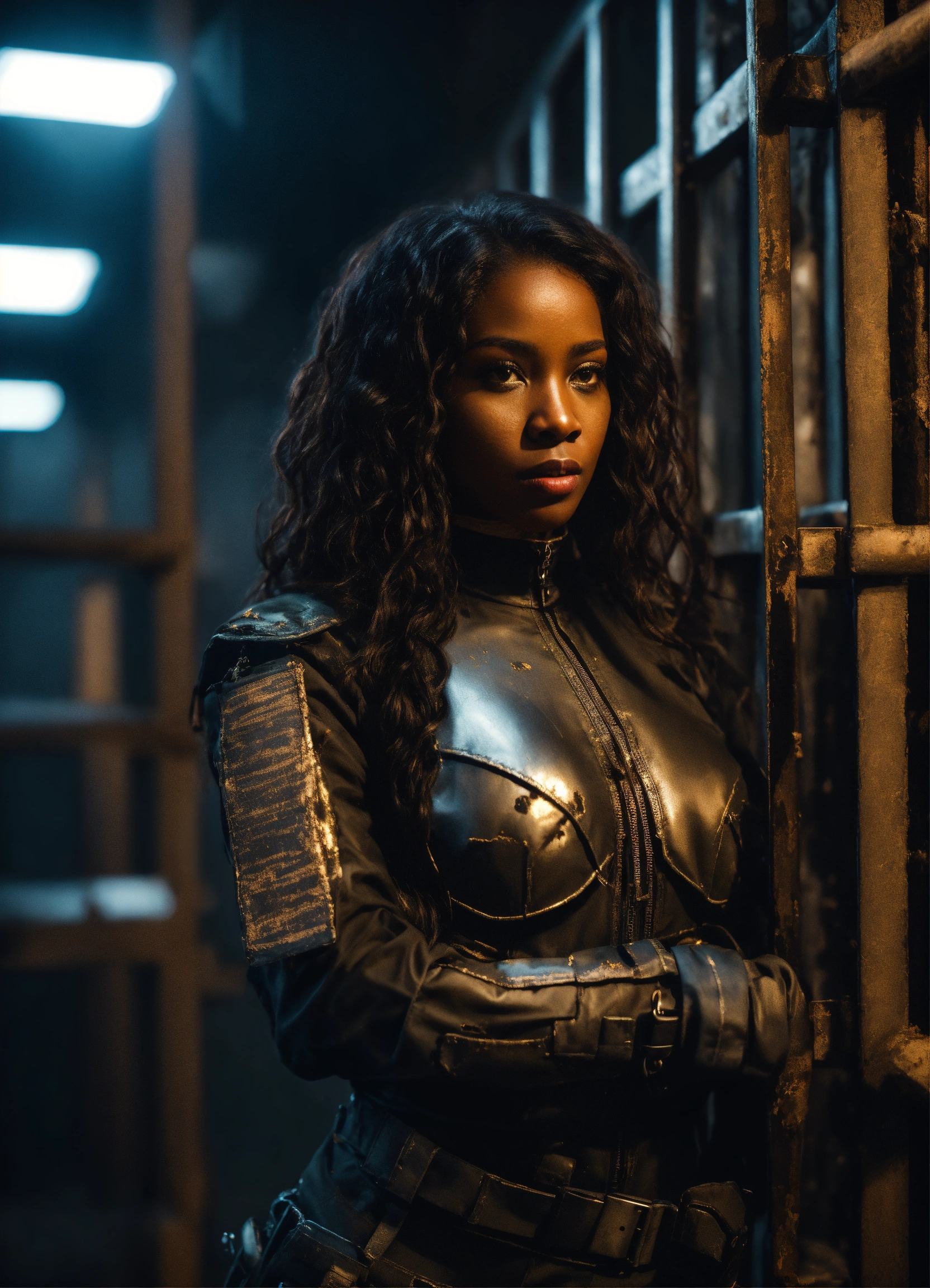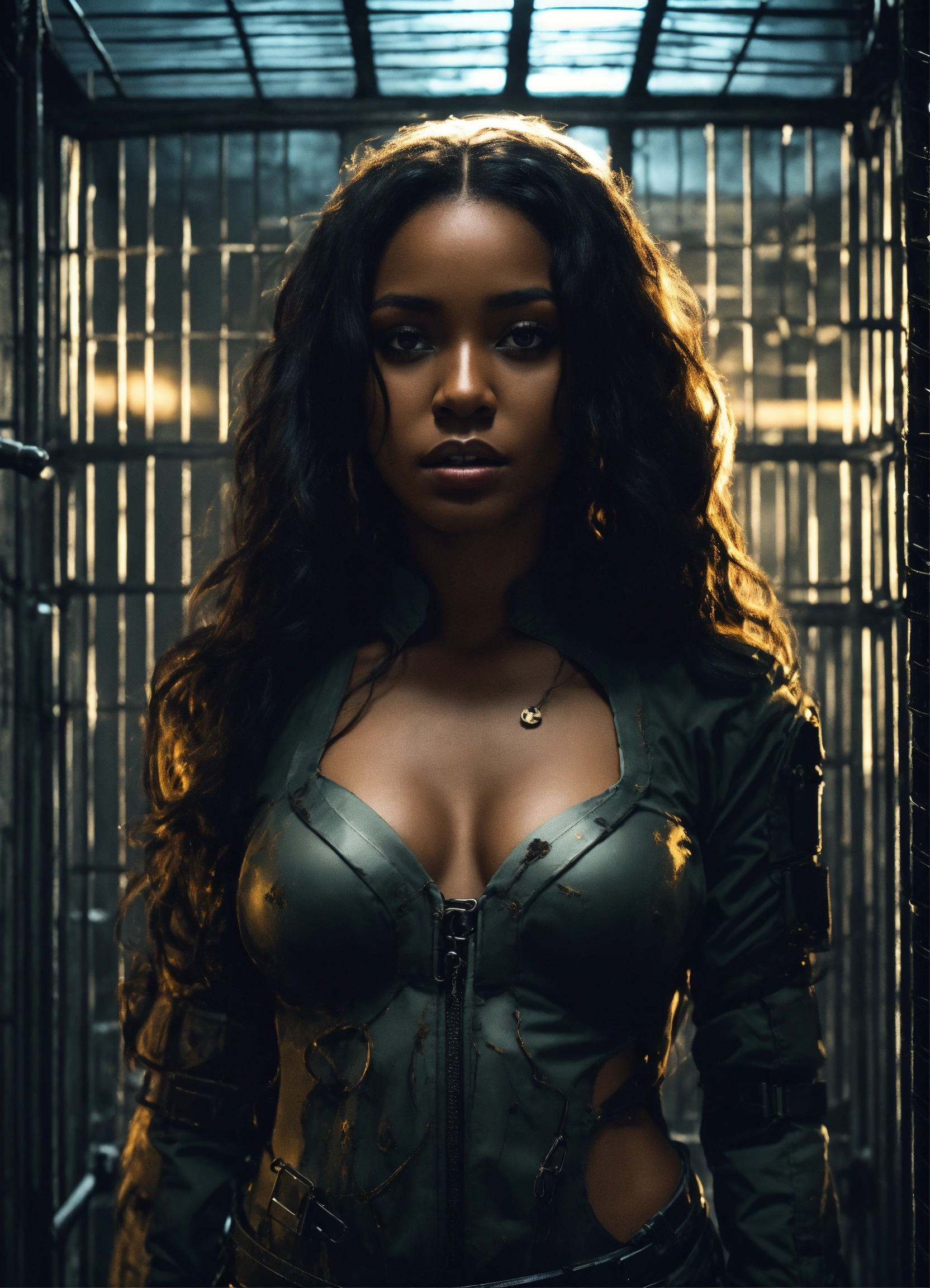 Handcuffed, a beautiful black girl goddess, a beautiful prisoner with long dark hair wearing tattered remains of a super spy stealth suit, held captive in a dark spooky cell with monstrous guards in the backgroundl, resolution 8k, insanely detailed