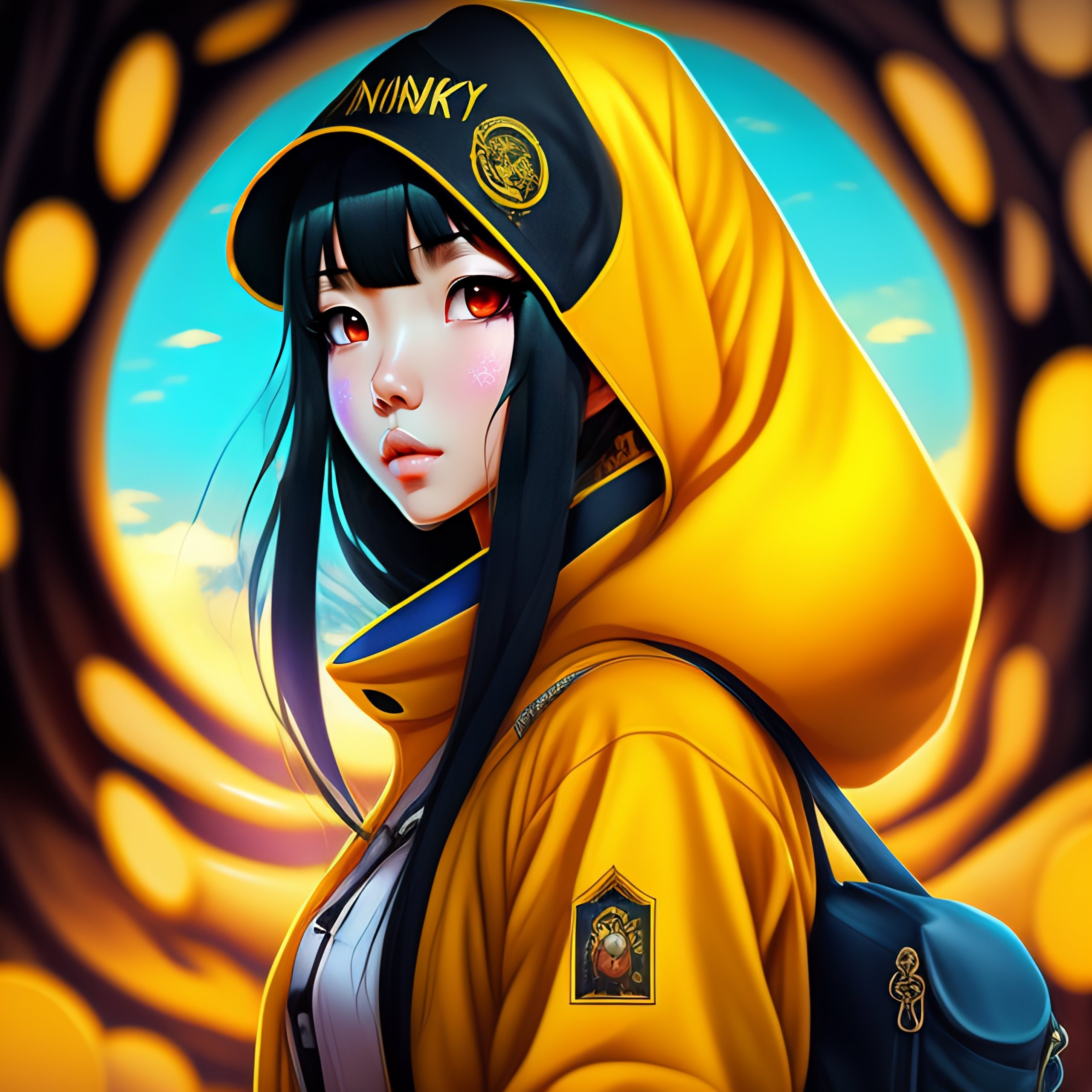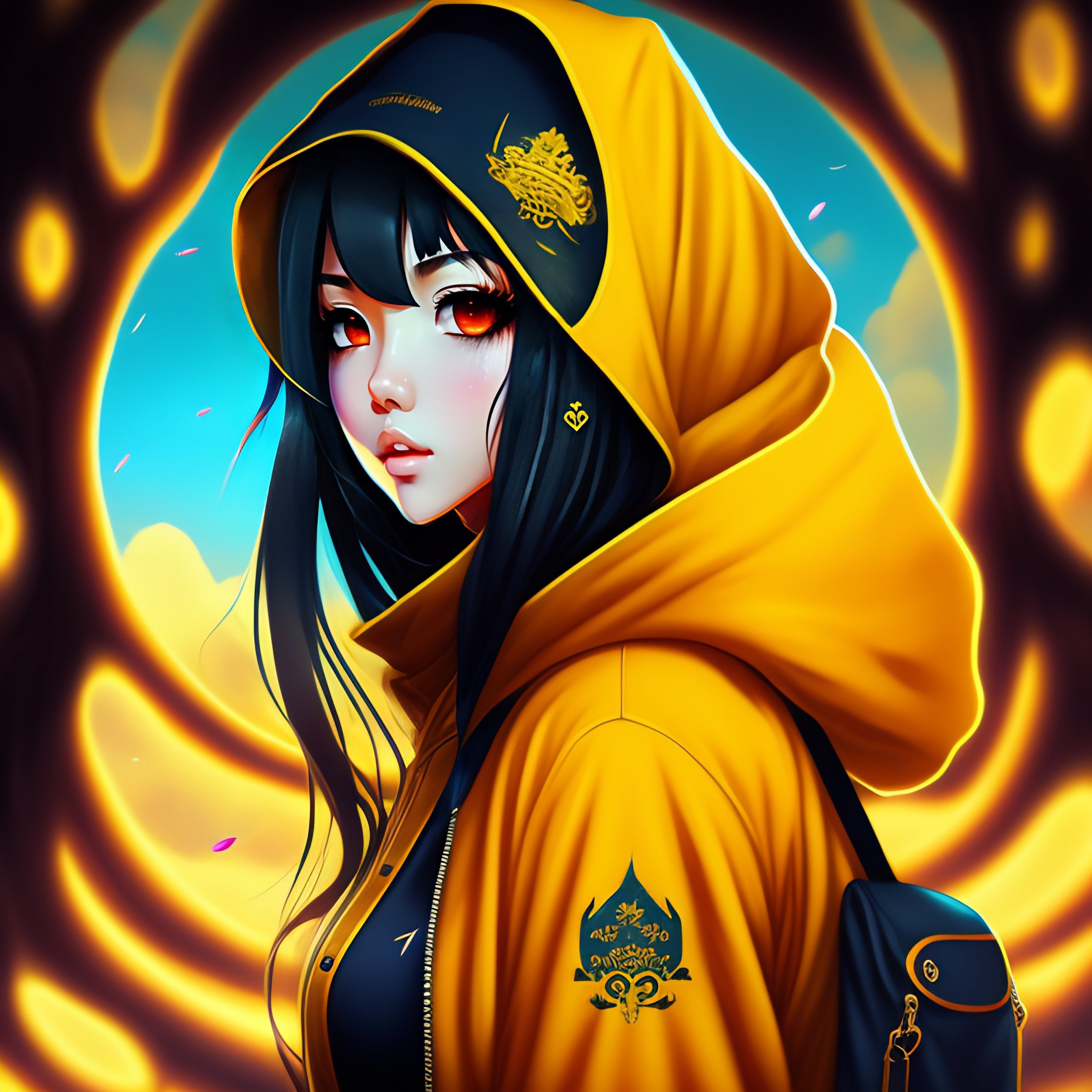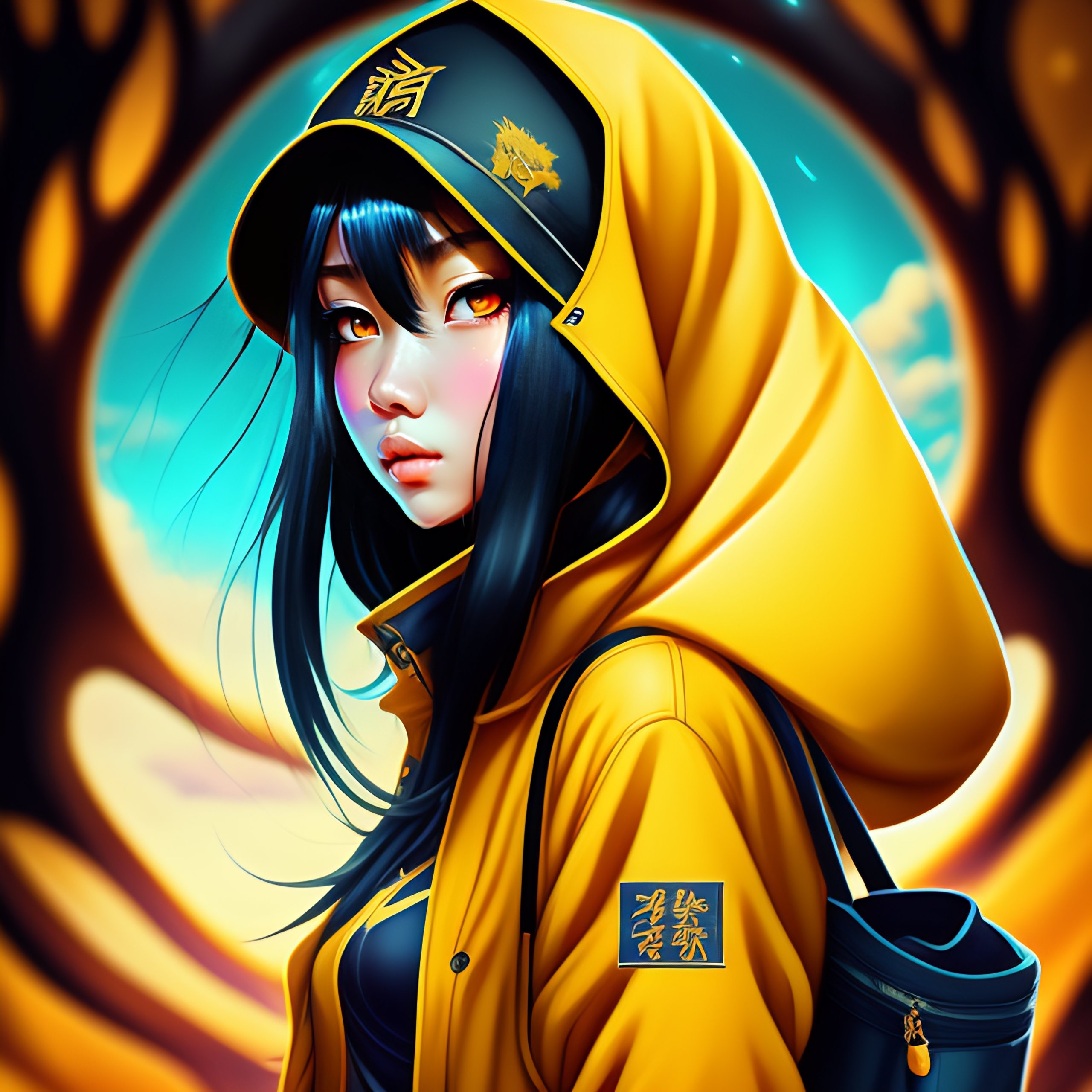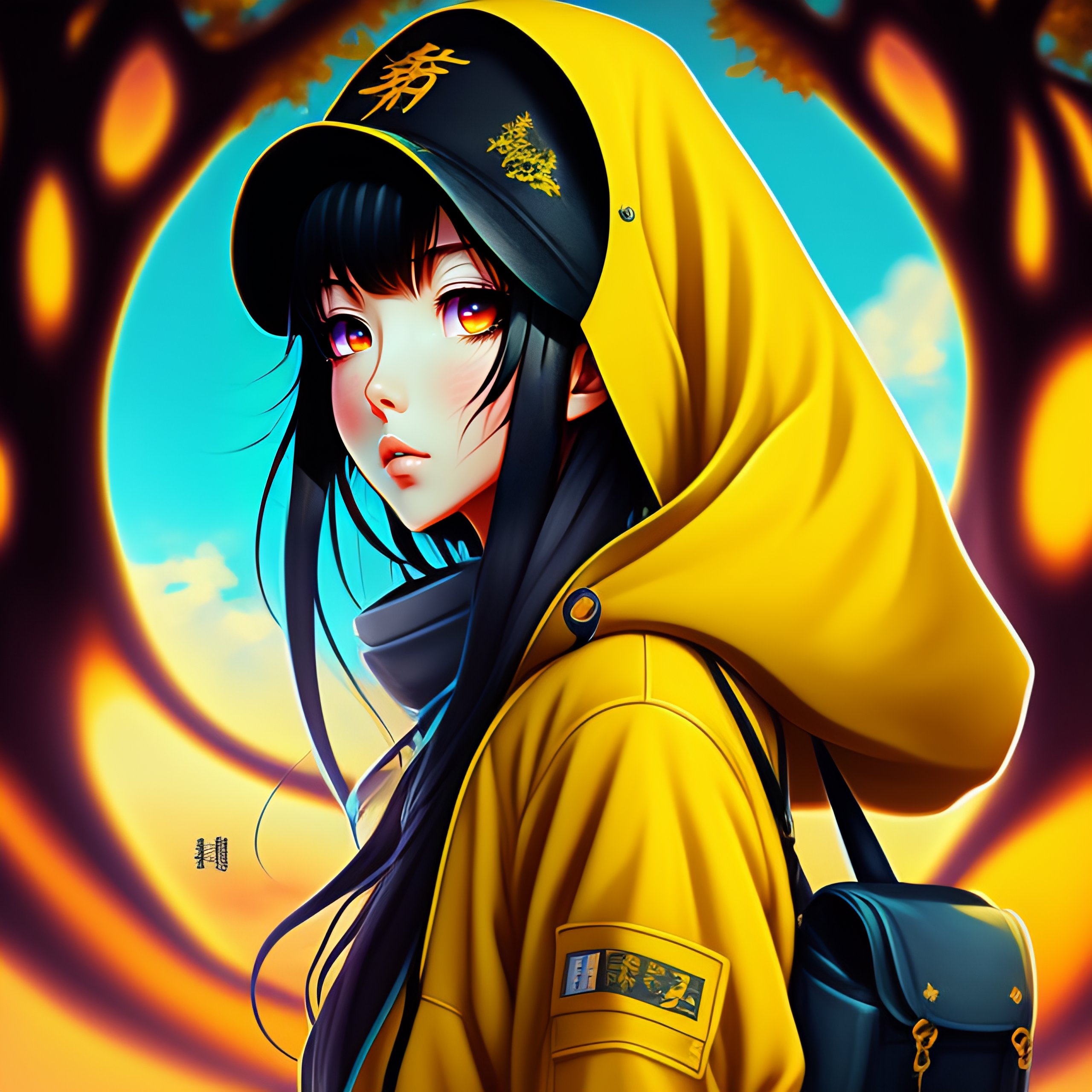 Phonk album, big tree, horror fantasy, anime style, horror word, beautiful anime girl with yellow coat and blue eyes