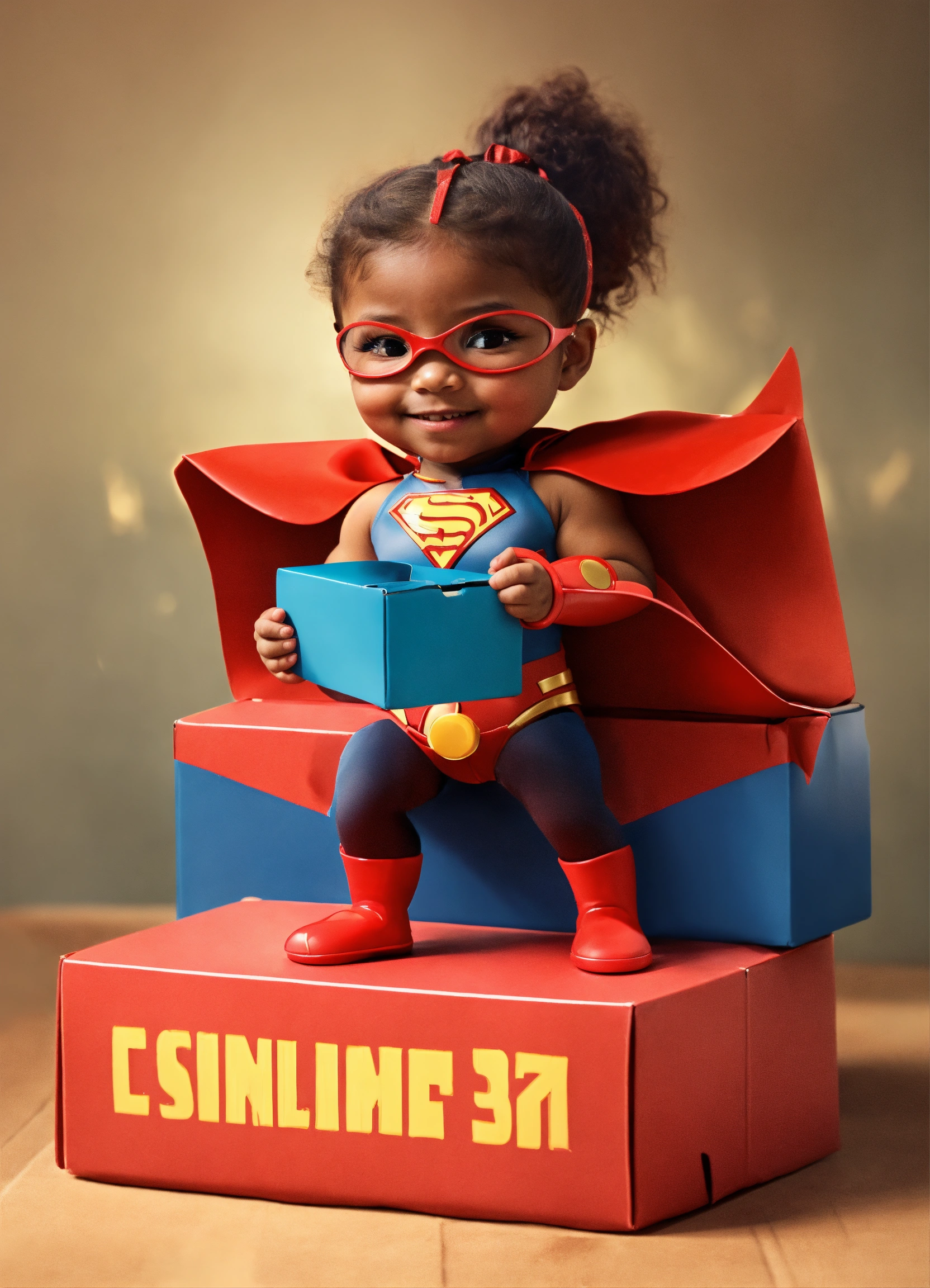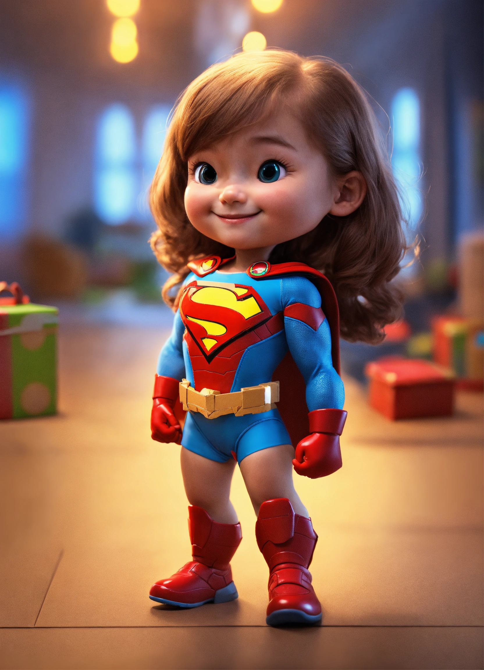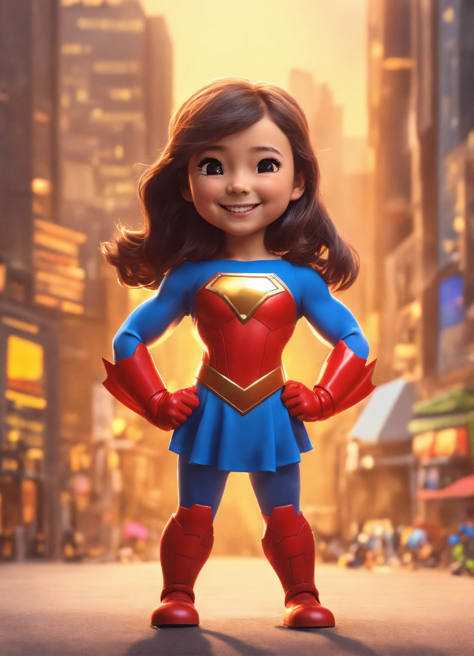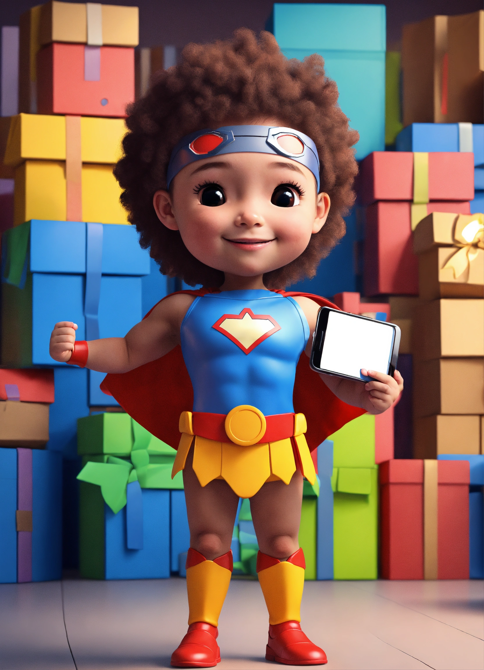 Little girl, superhero, no eyes, cartoon, 3d, have much boxes, hold handphone, strong, big muscle, smile but strenght