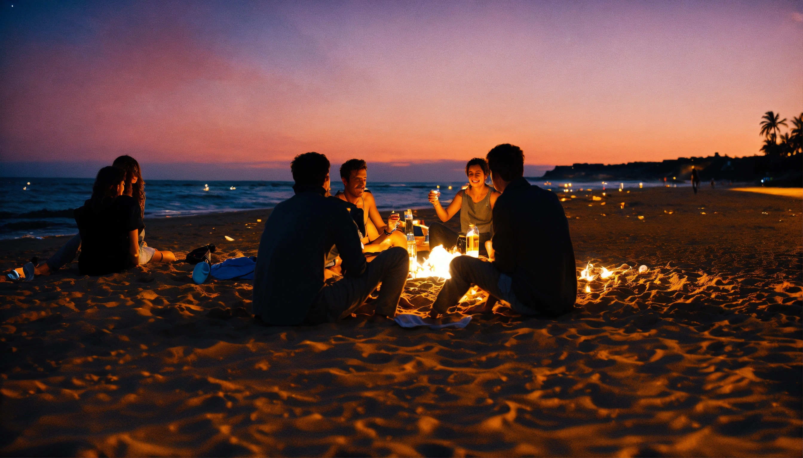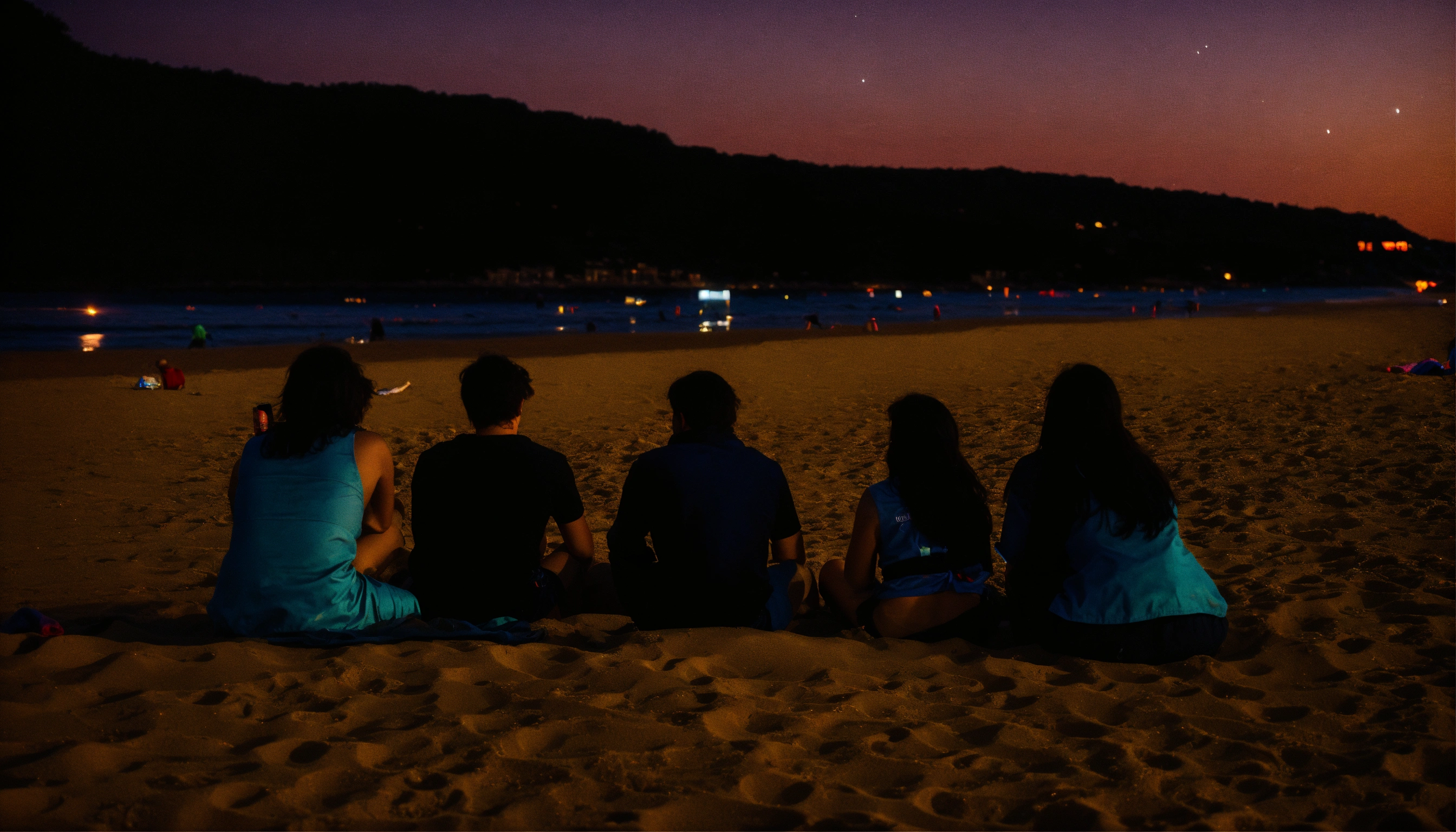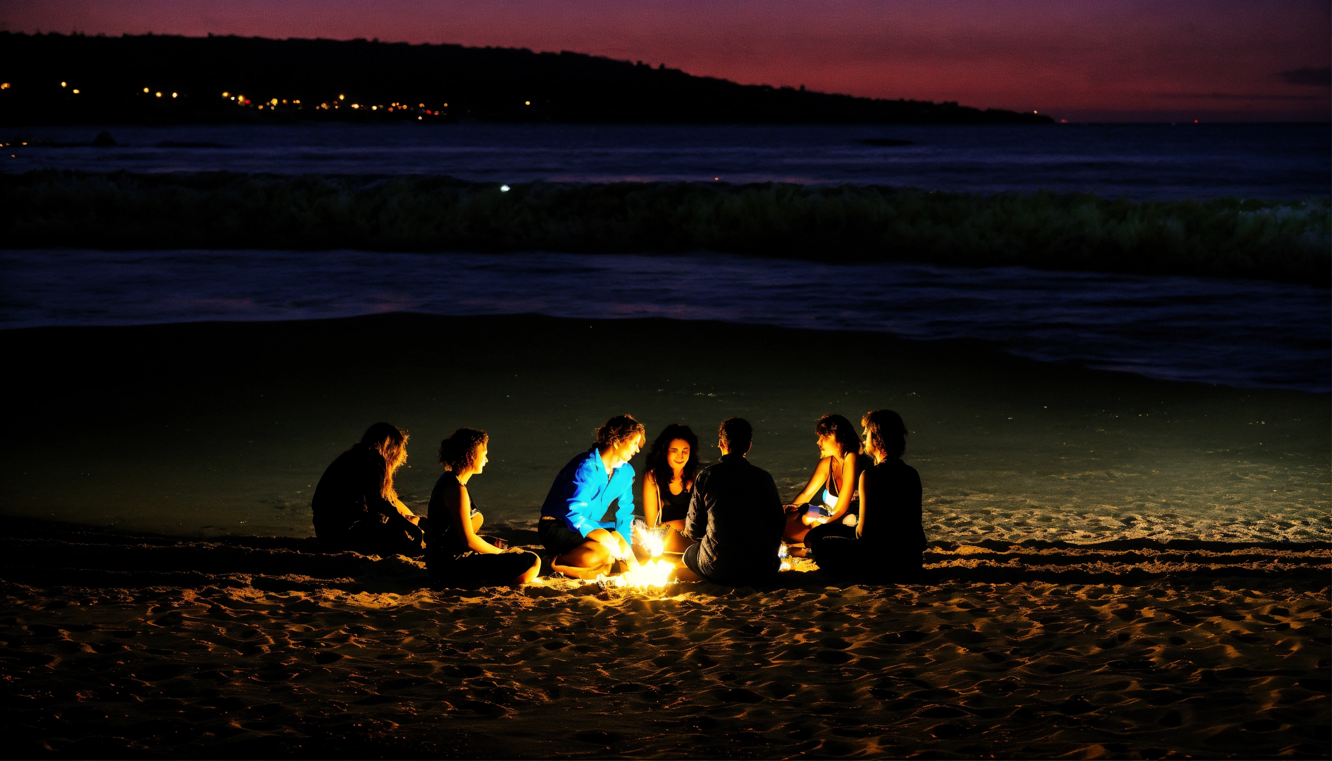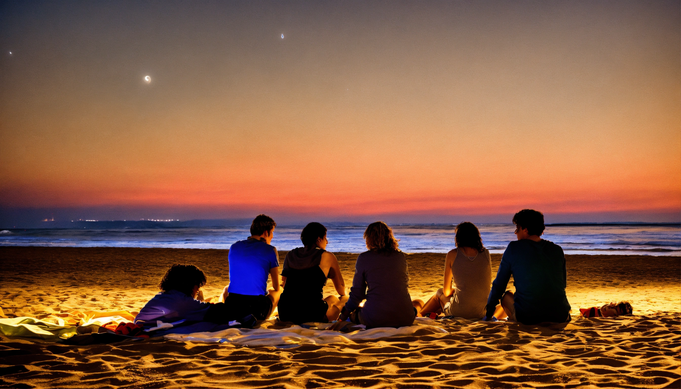 Groupe d'amis assis sur le sable d'une plage sur laquelle la nuit est tombée