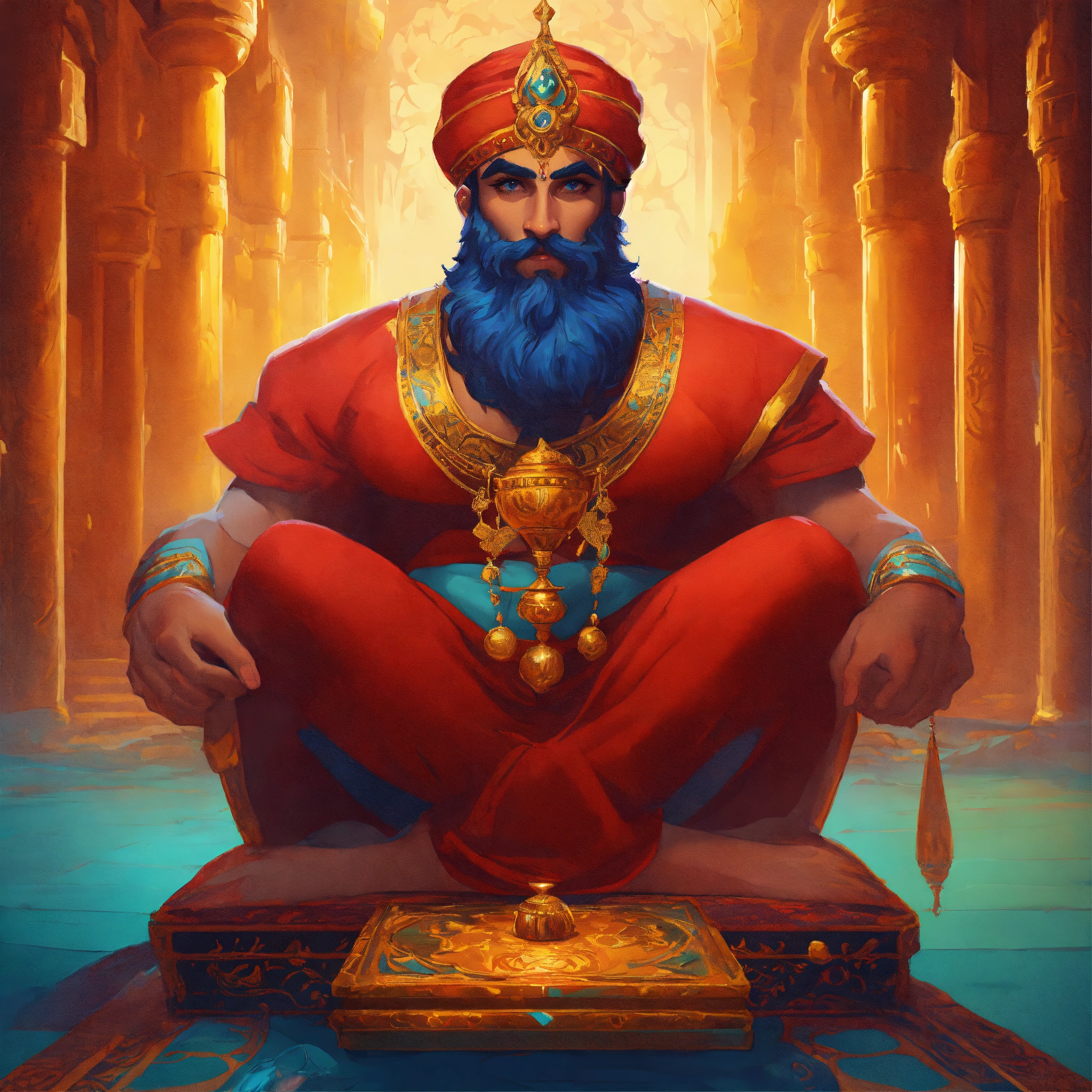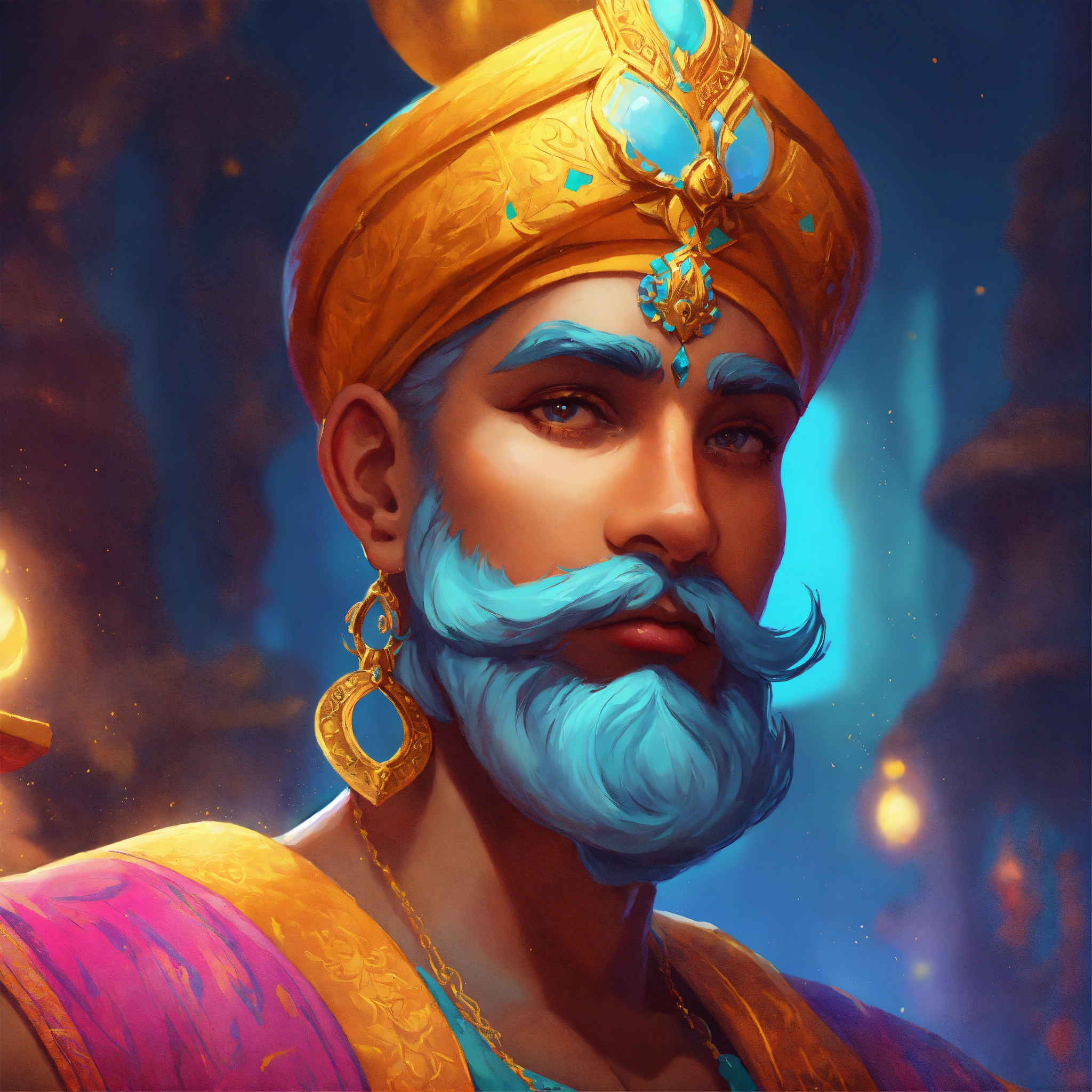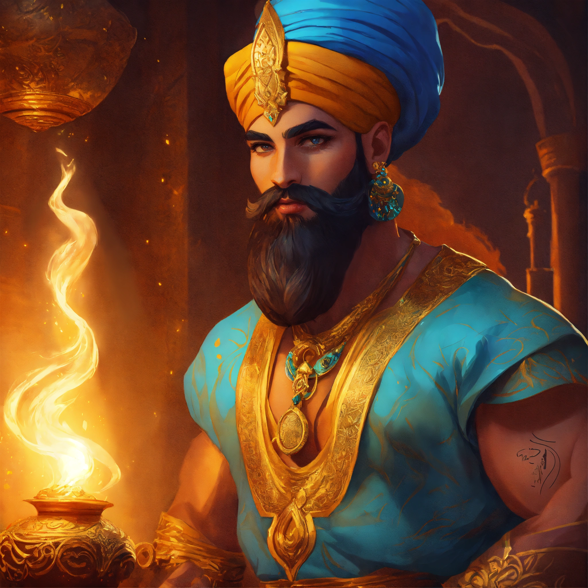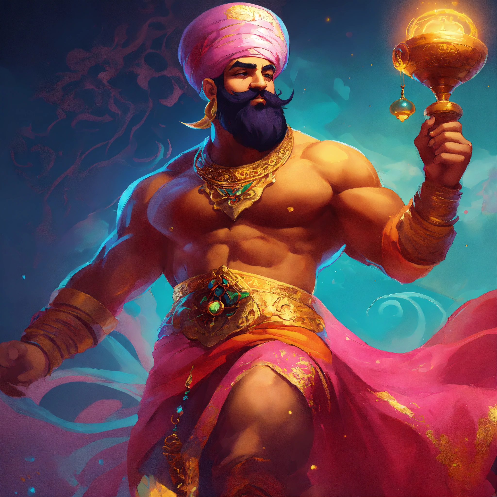 Genie man, arabic mythology, volumetric cartoon oil paint, 2d book illustration style, sharp focus, bright color, digital paint character design, trending on artstation, high details, simple lines, art by viktoria gavrilenko, josé luis ágreda and camilla d'errico