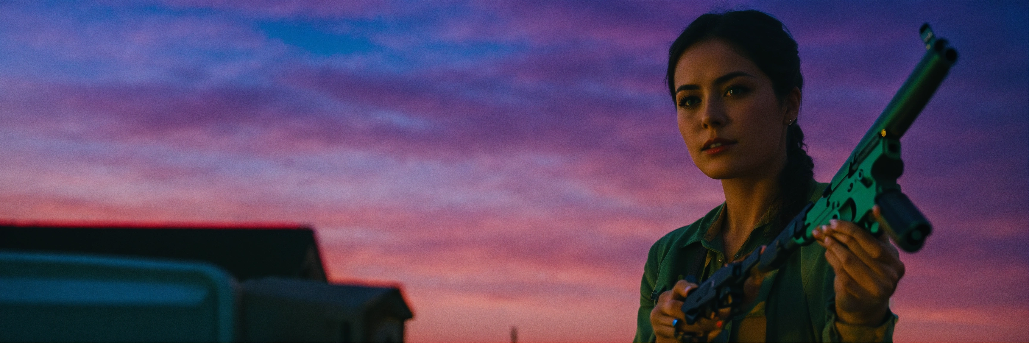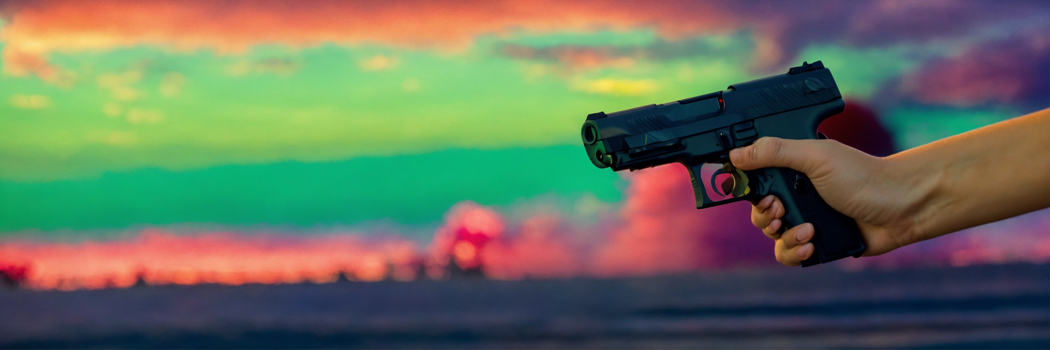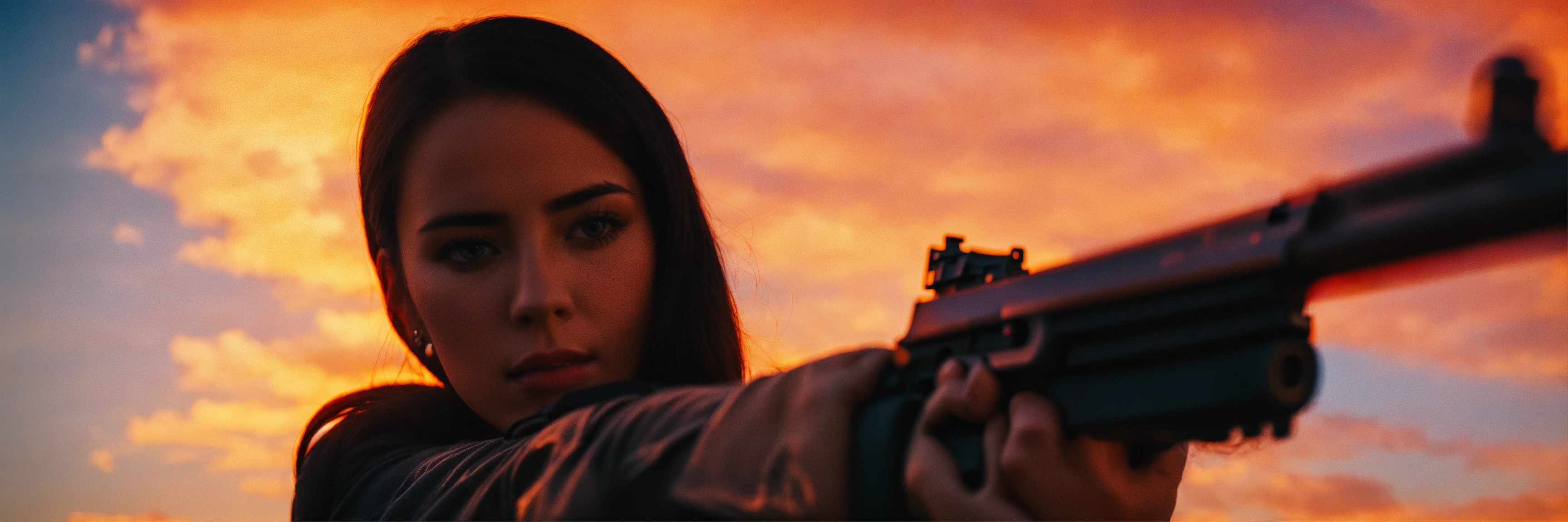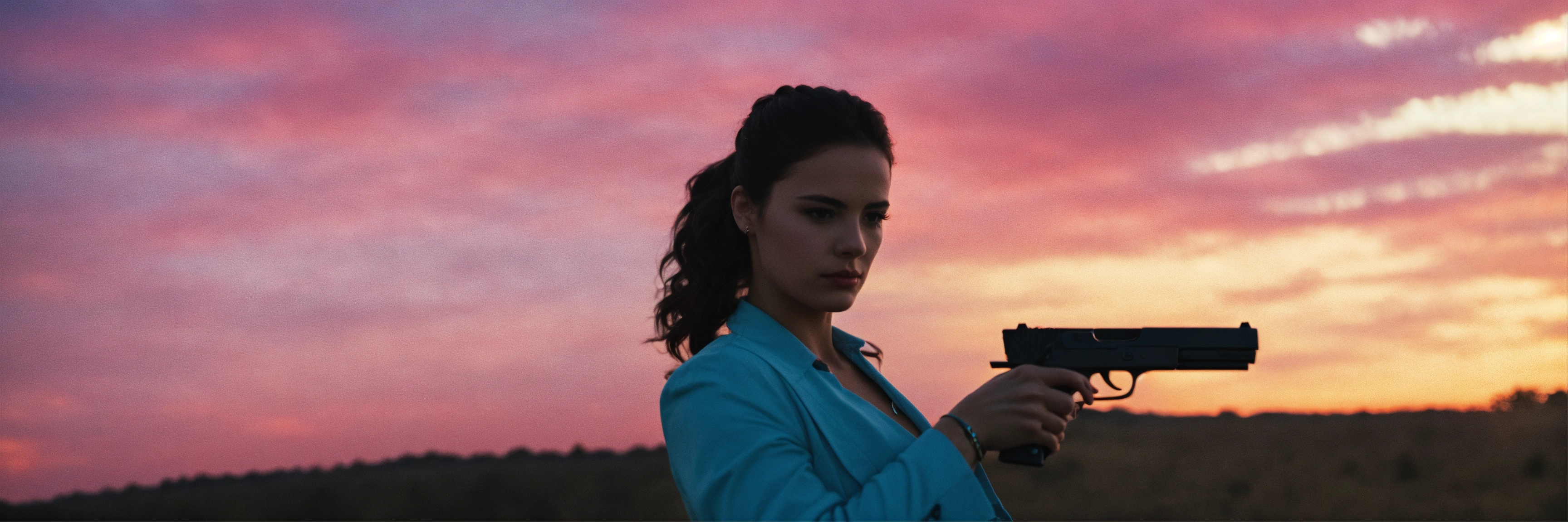 Close up of a woman holding a pistol down by her side in front of colourful sky