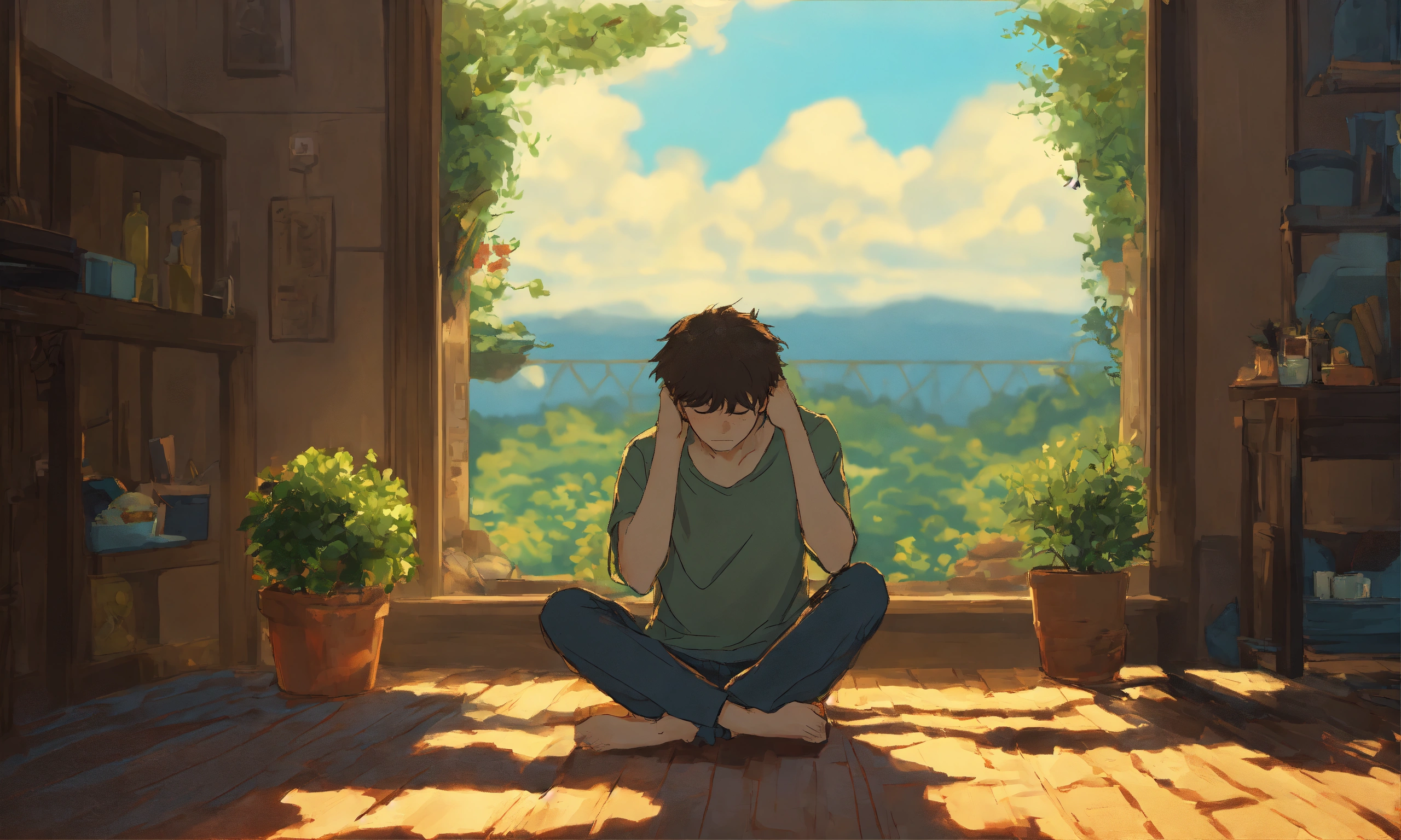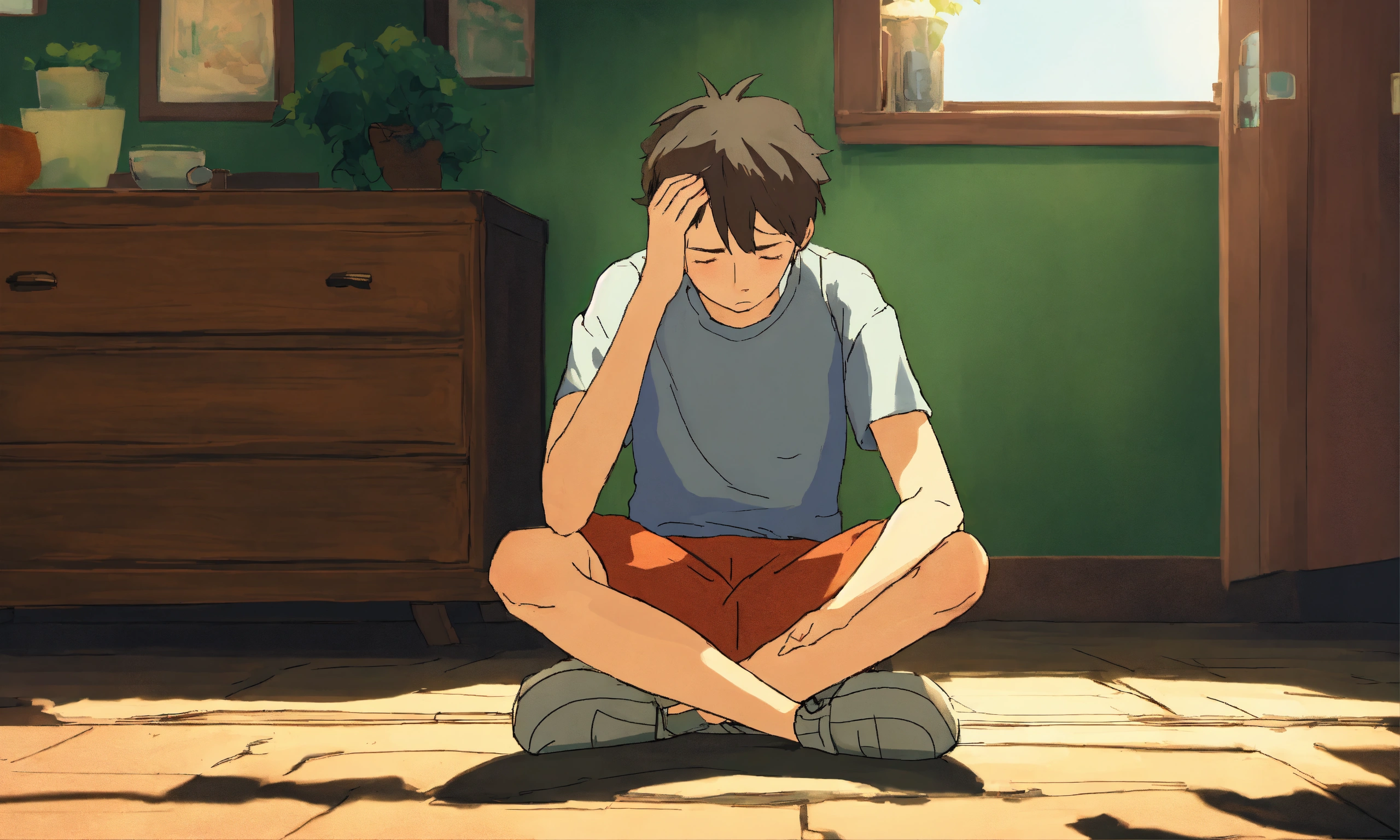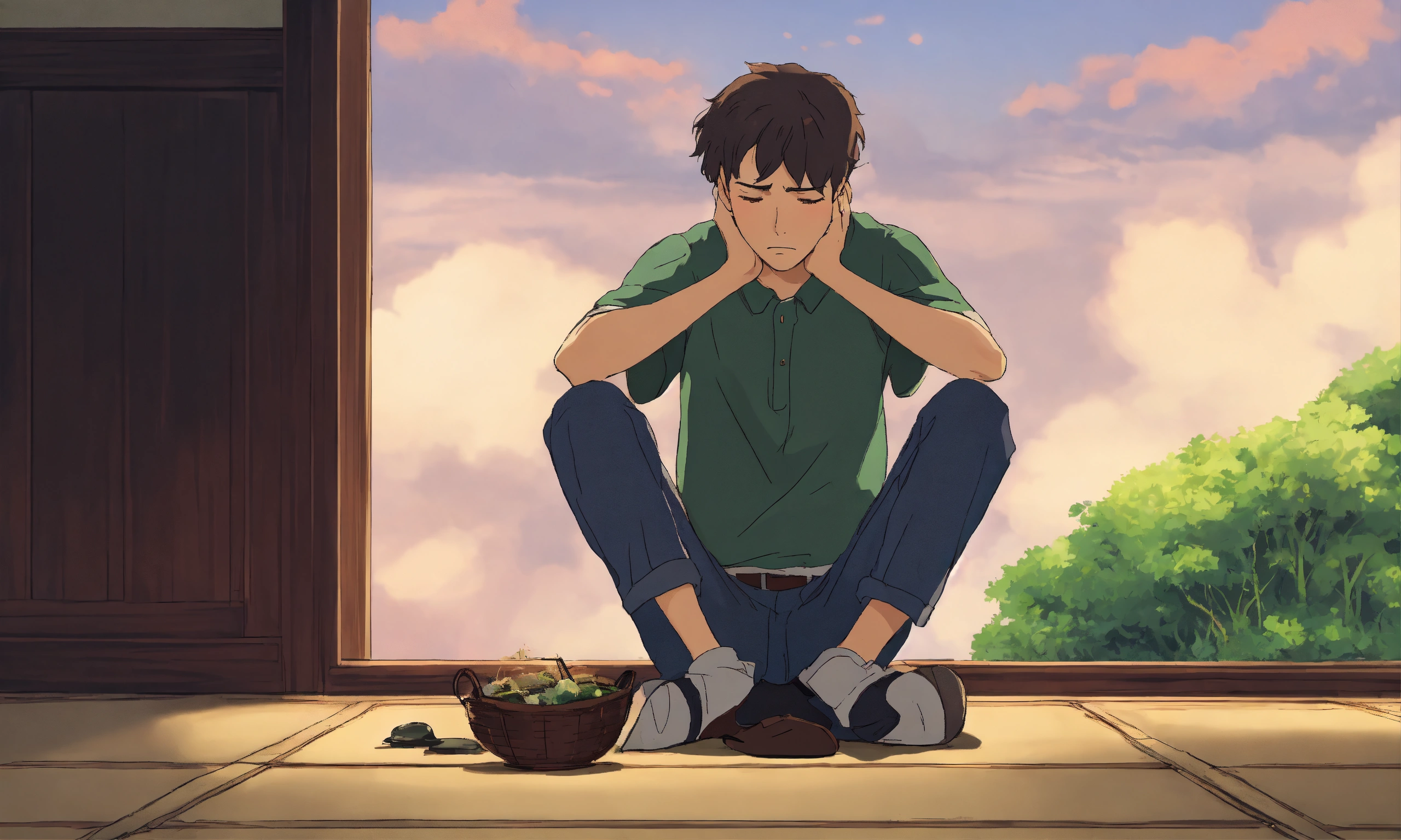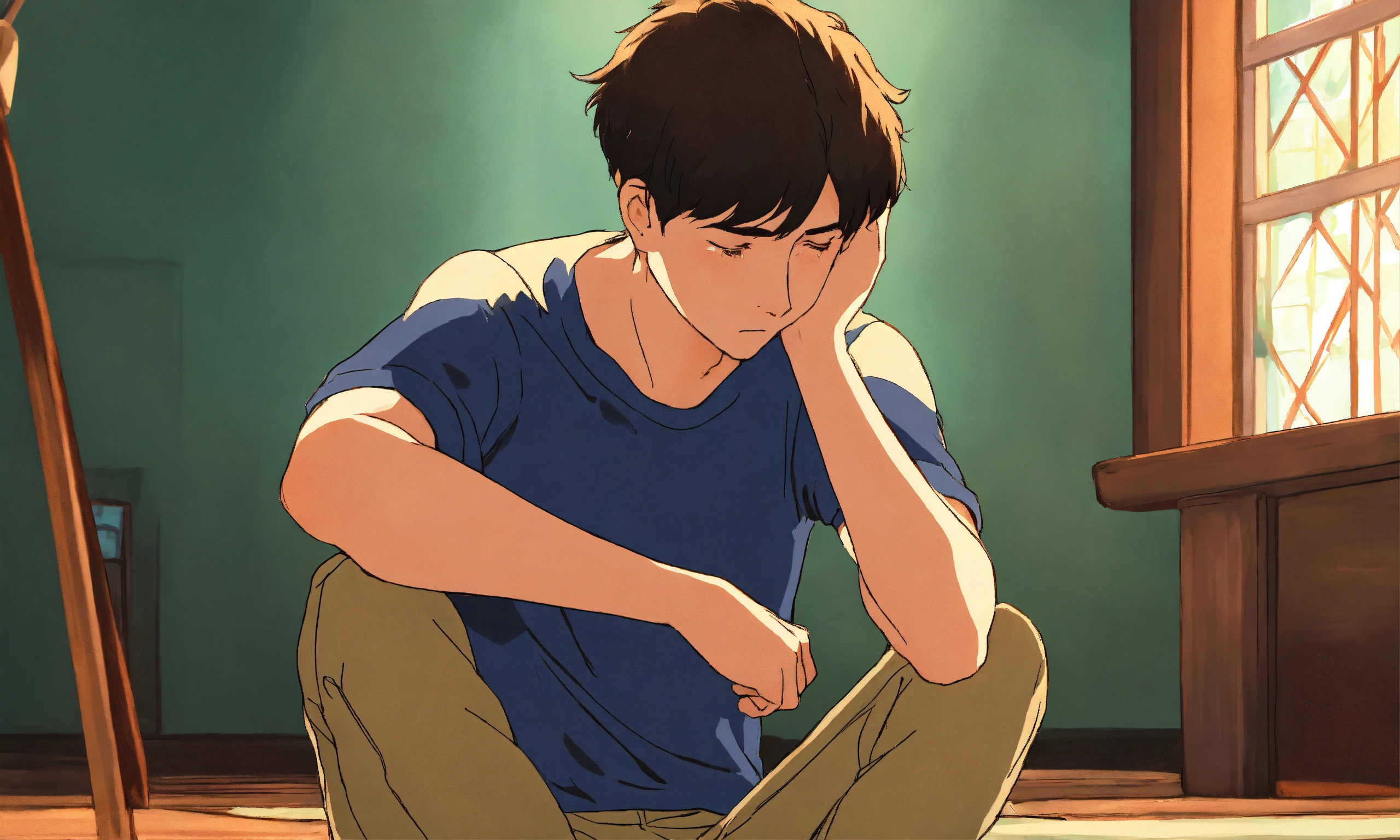 A sad young man sitting while putting his hands on head, simple art inspired by studio ghibli's visual style