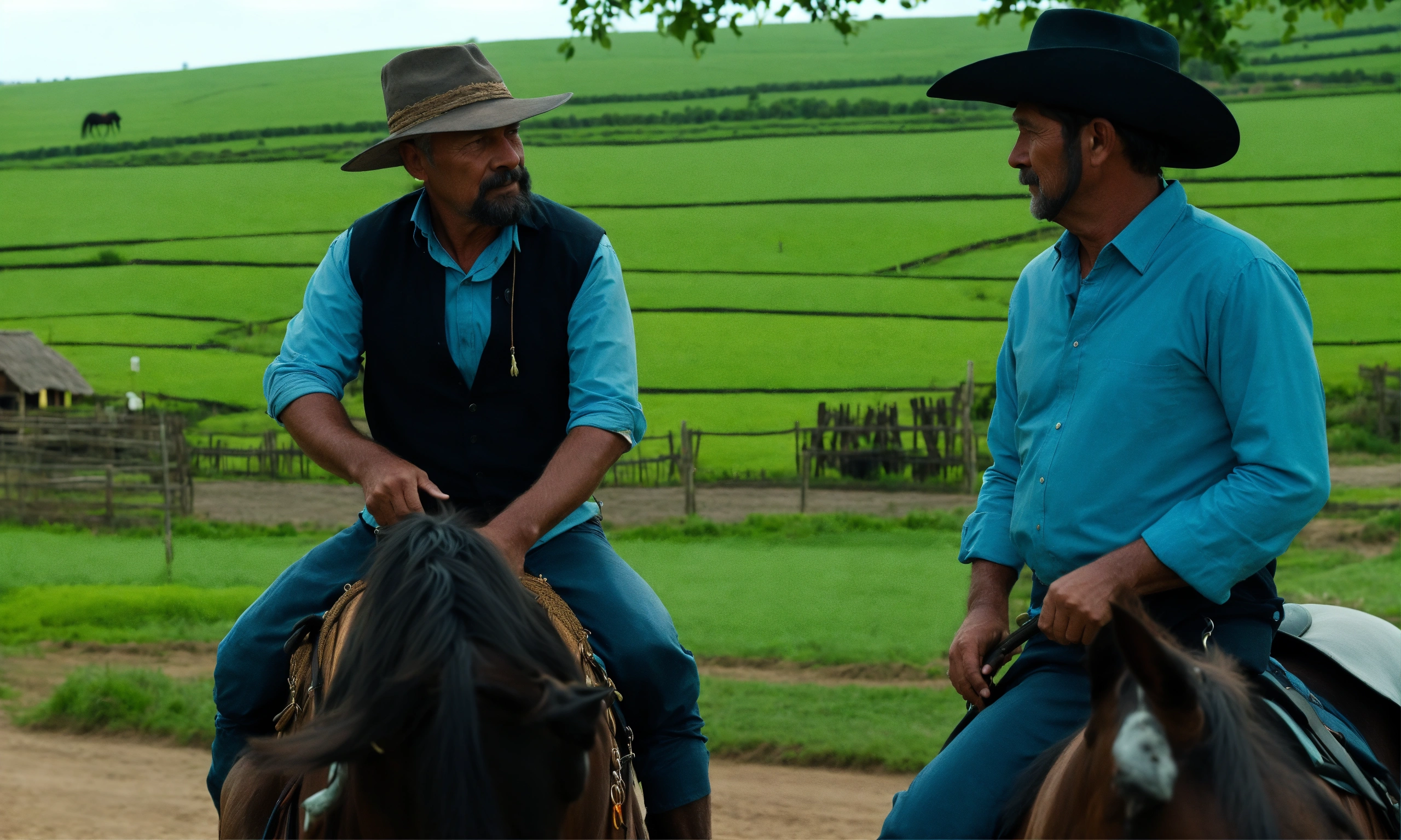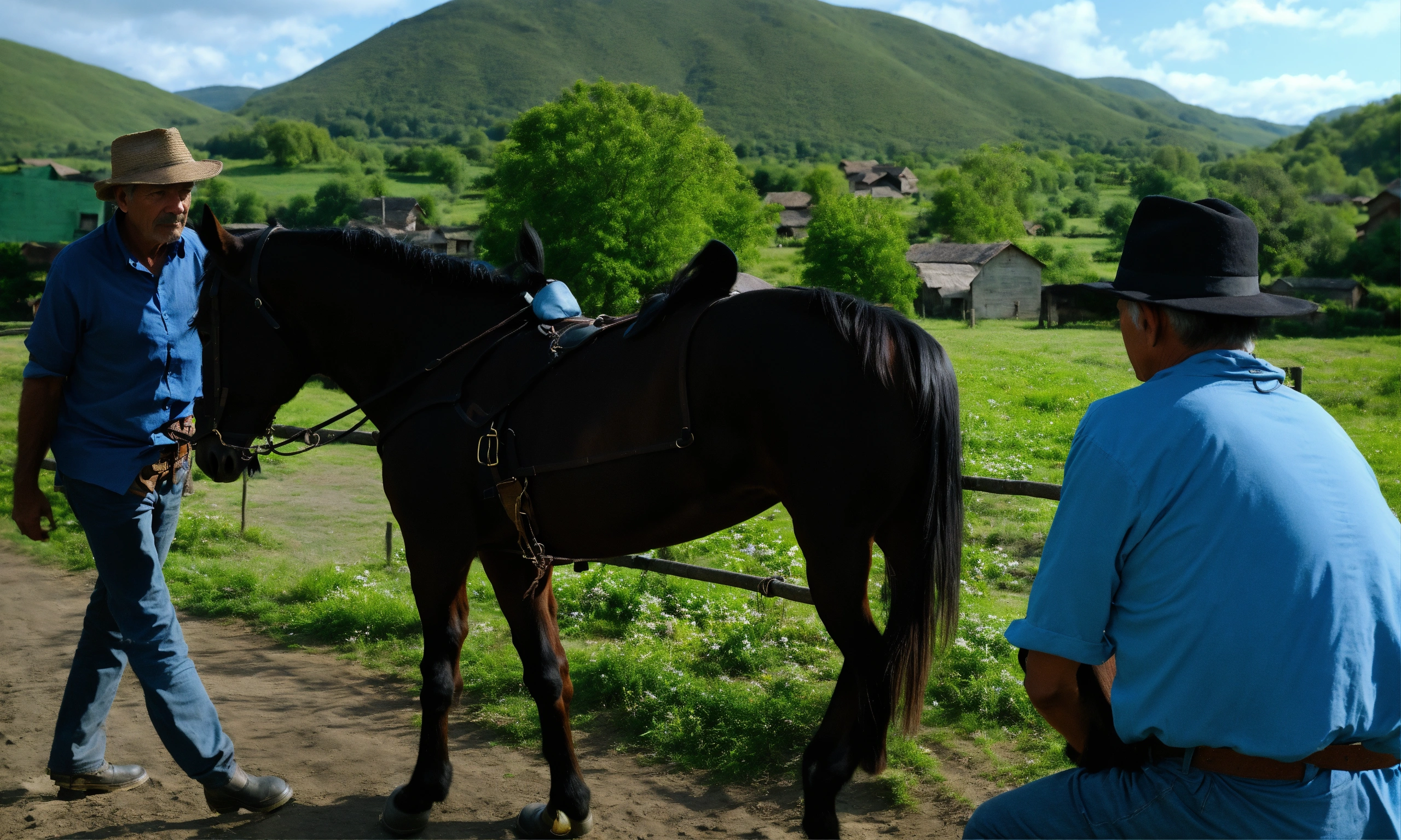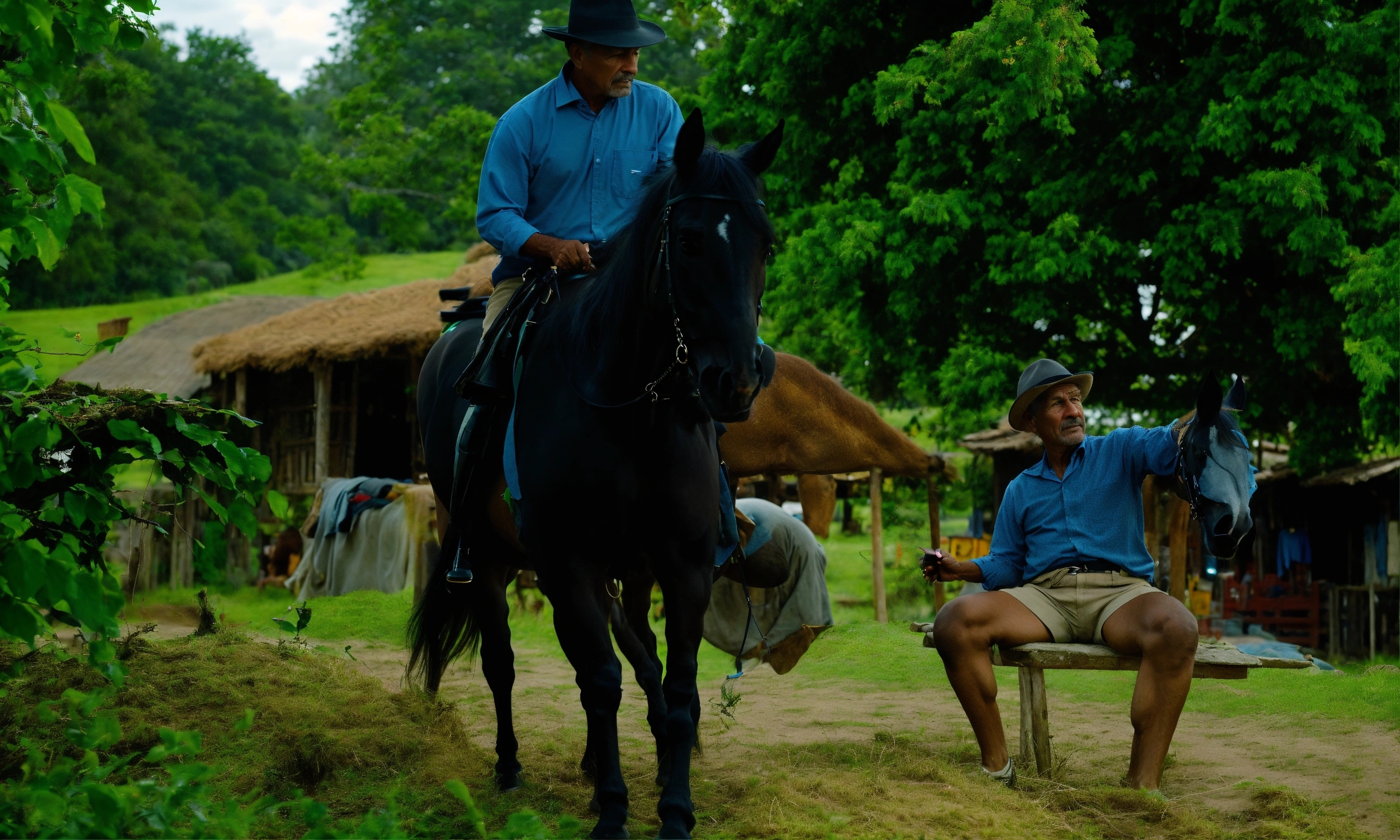 Man wearing black hat and blue shirt riding on black horse in village talking to an old farmer 8k