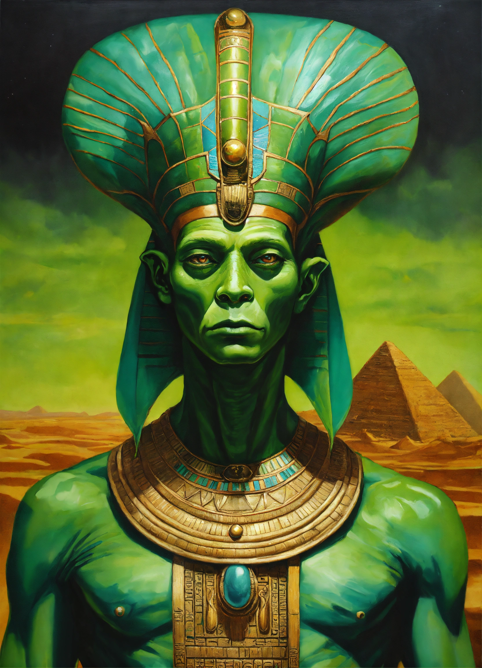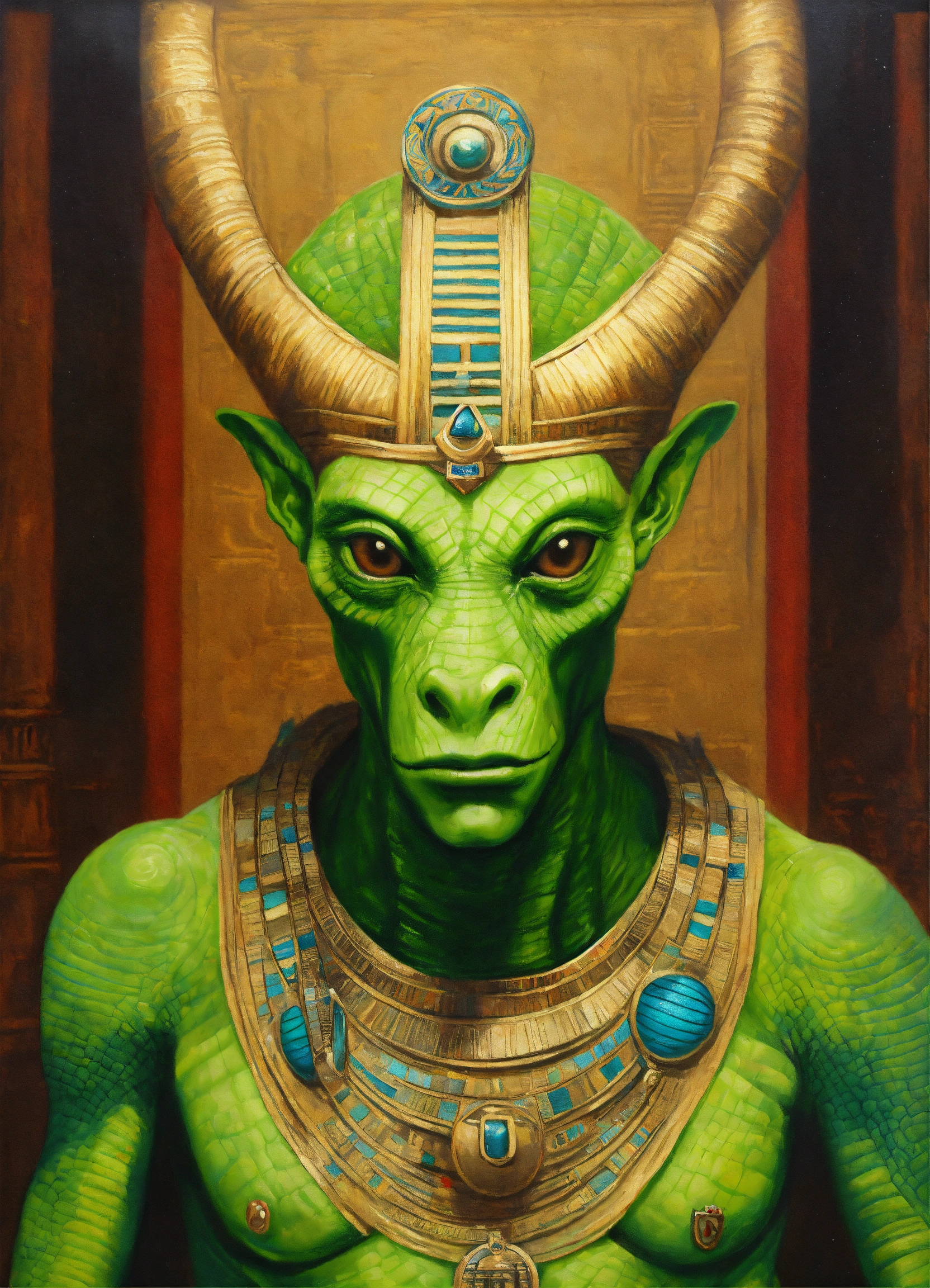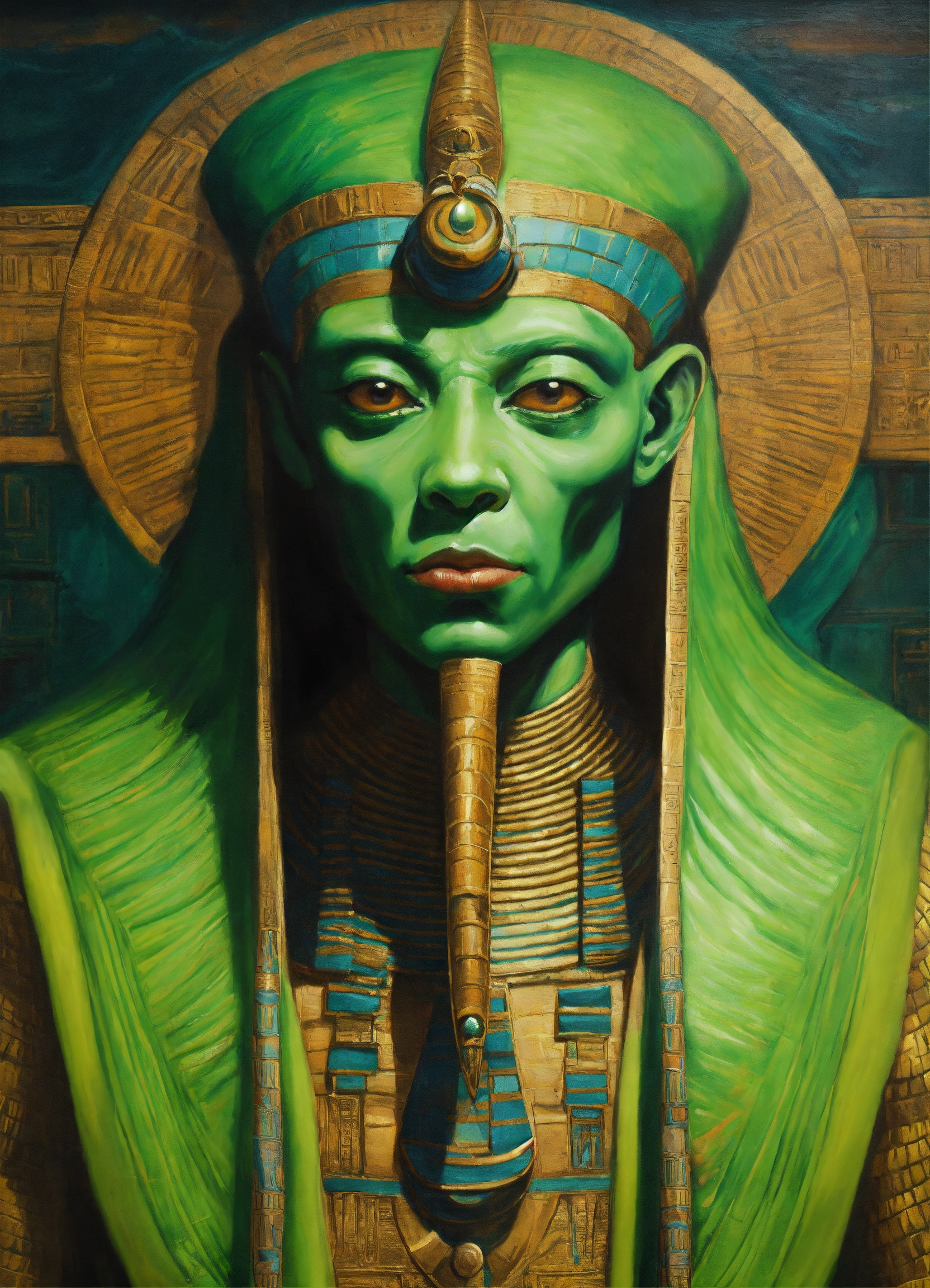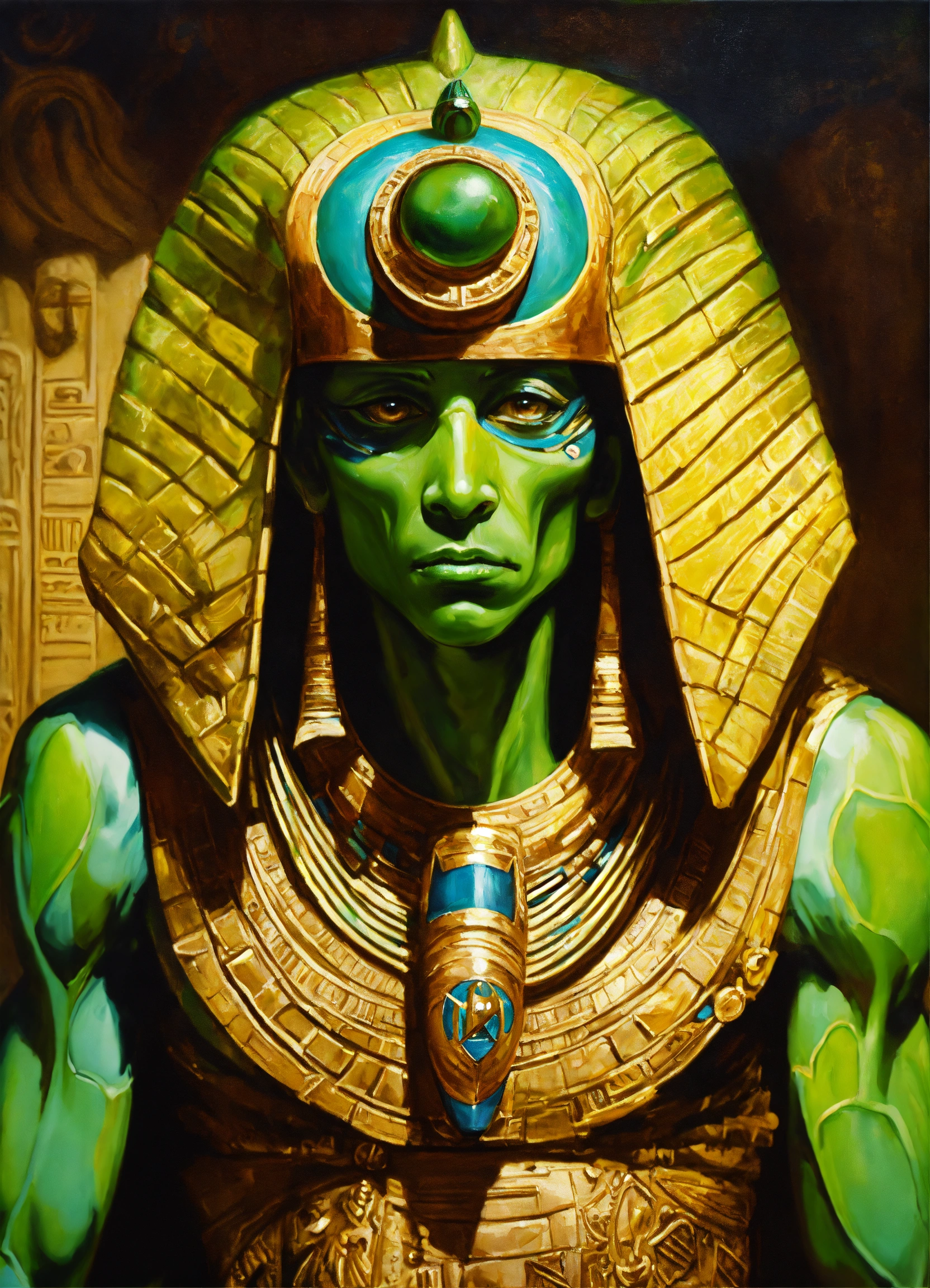 Portrait a green alien monster dressed like a ancient egypt god, oil paint, detailed hyperrealist fantasy illustration --s 750