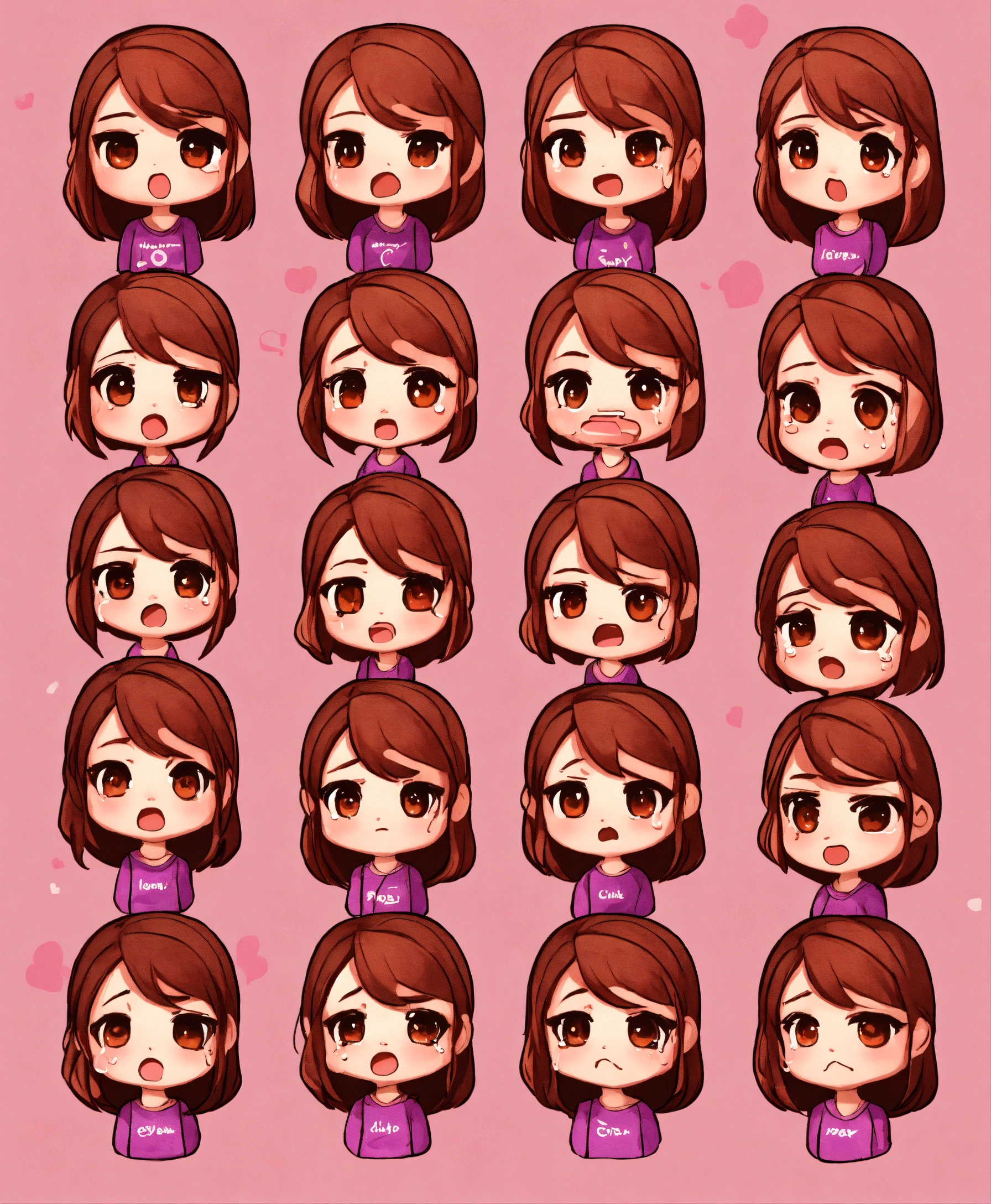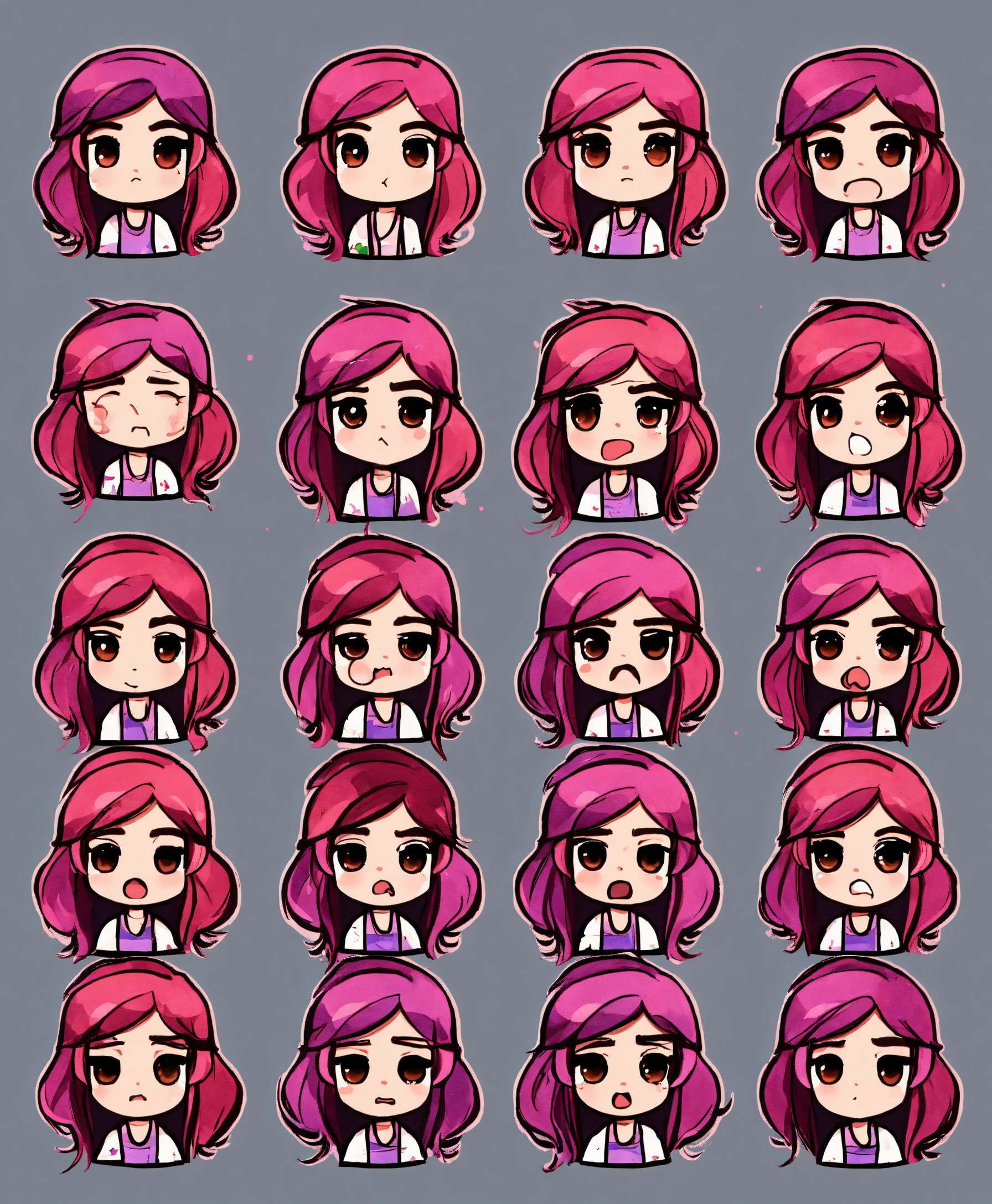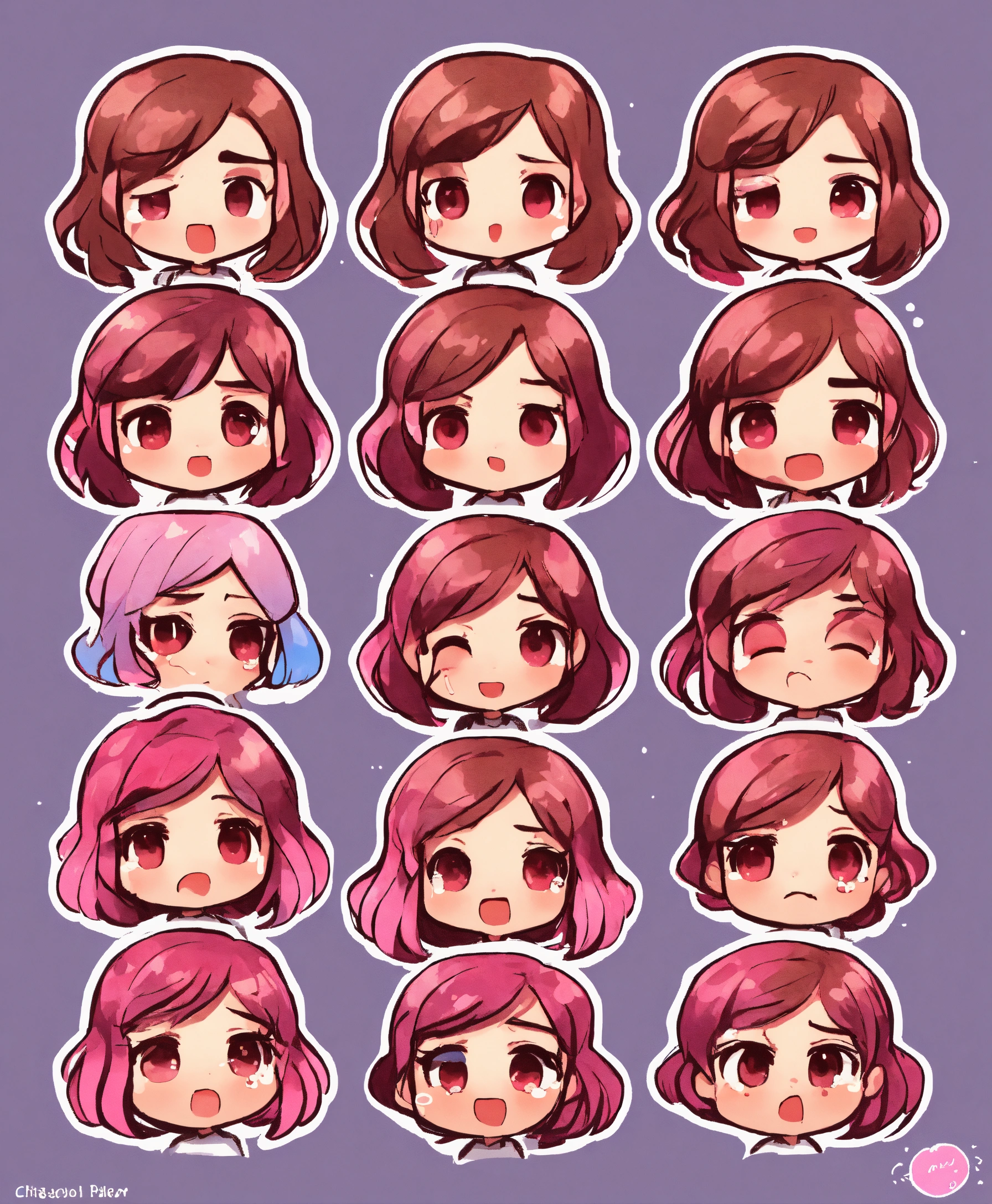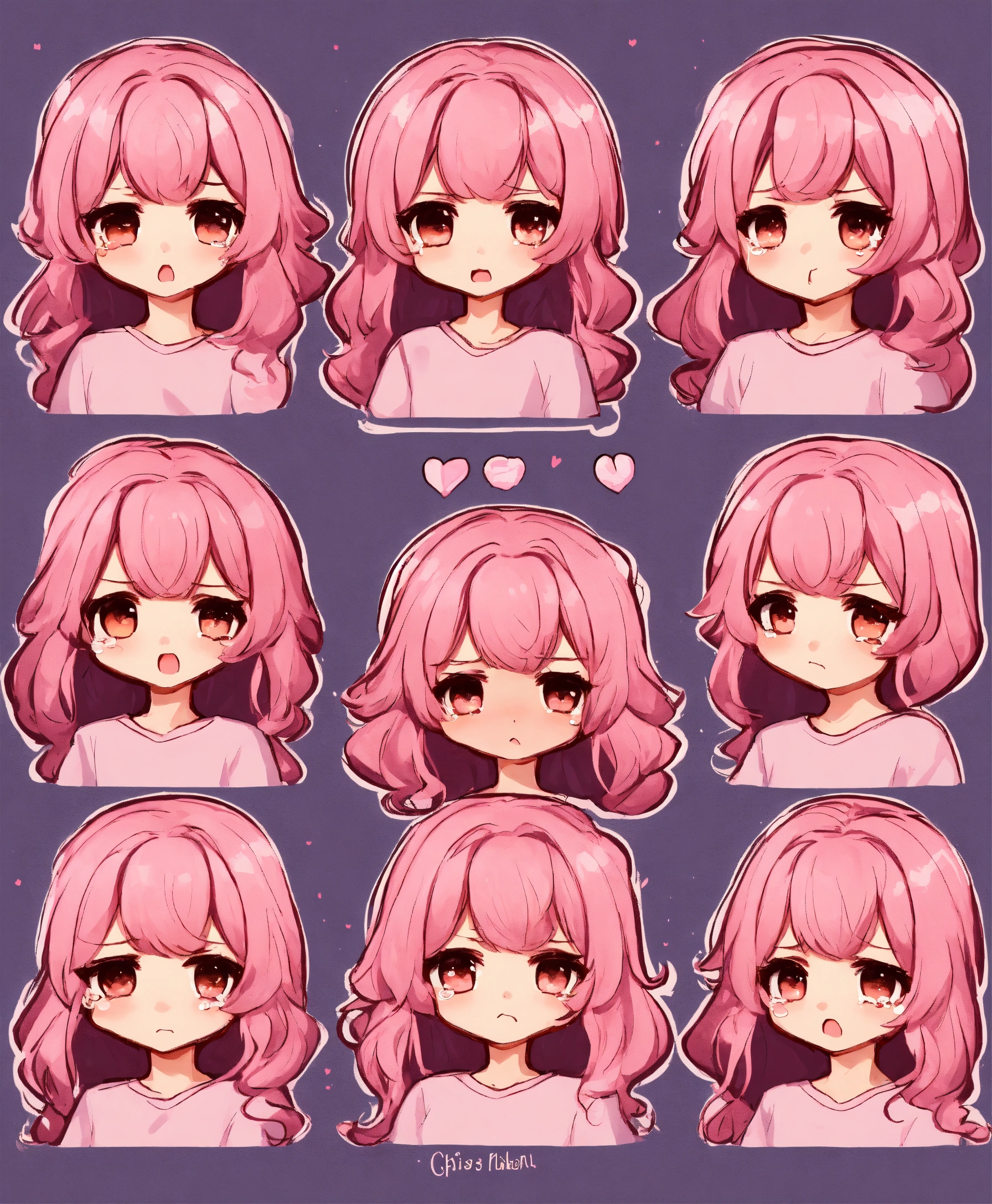 A set of twitch emotes, chibi, girl pink brown ombre hair in 8 different emotions, happy, sad, crying, angry, cheeky, confused