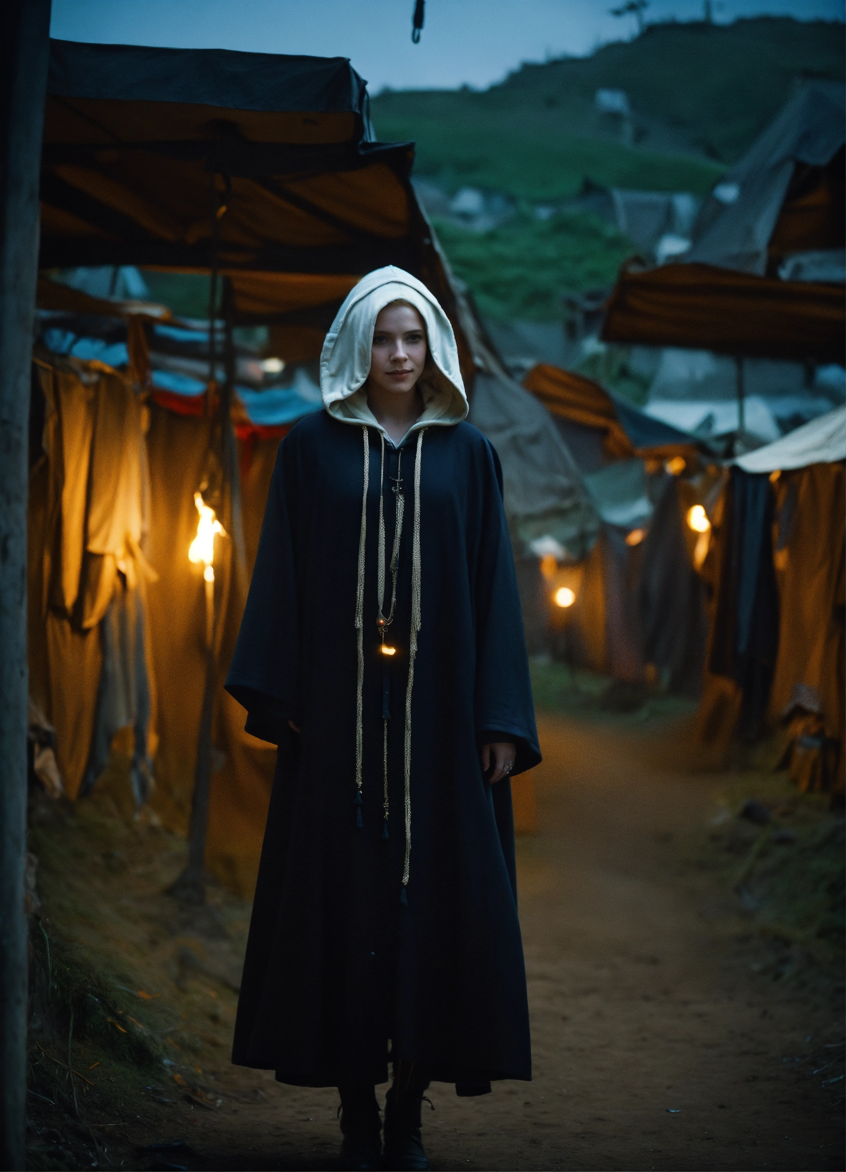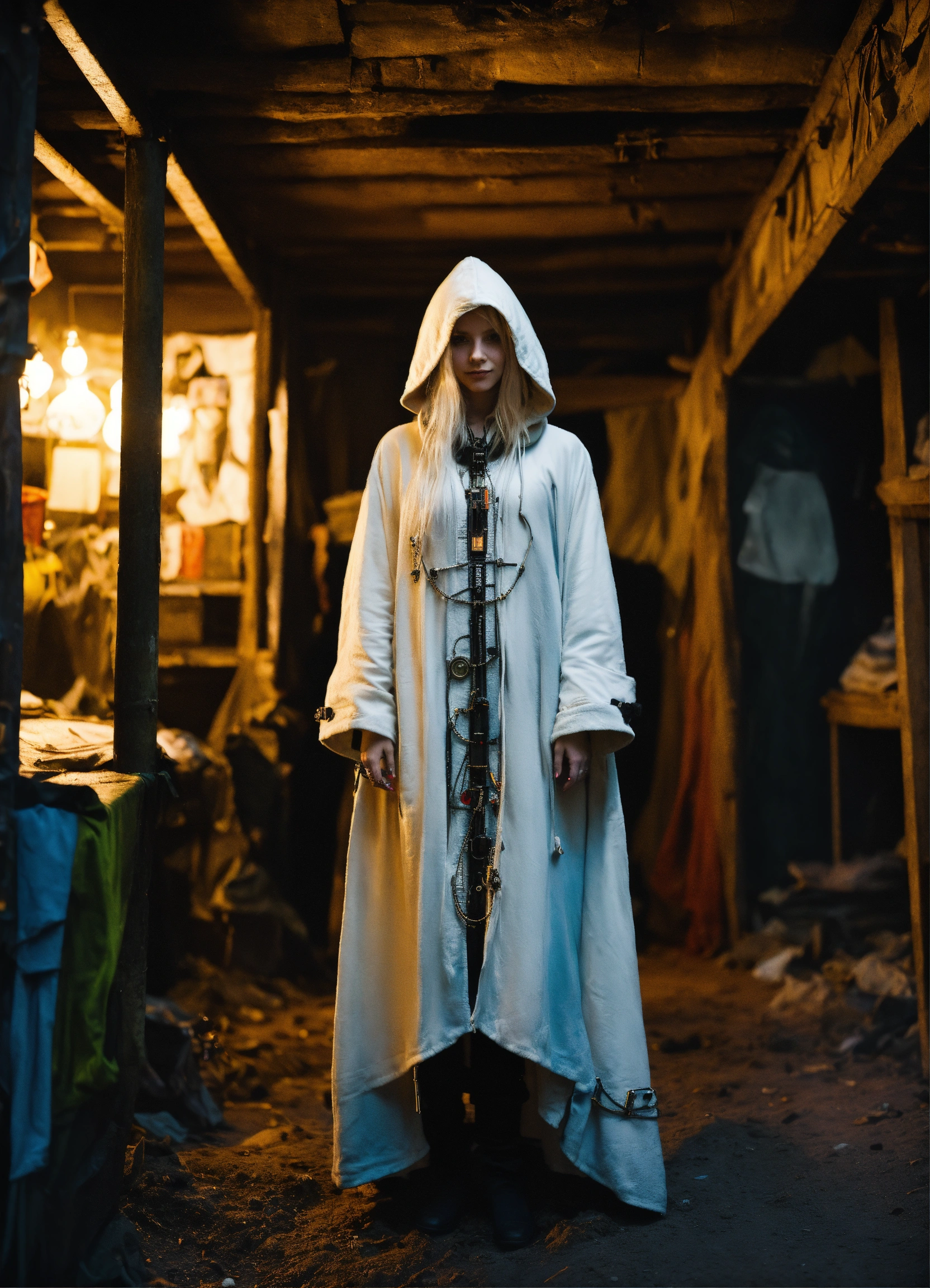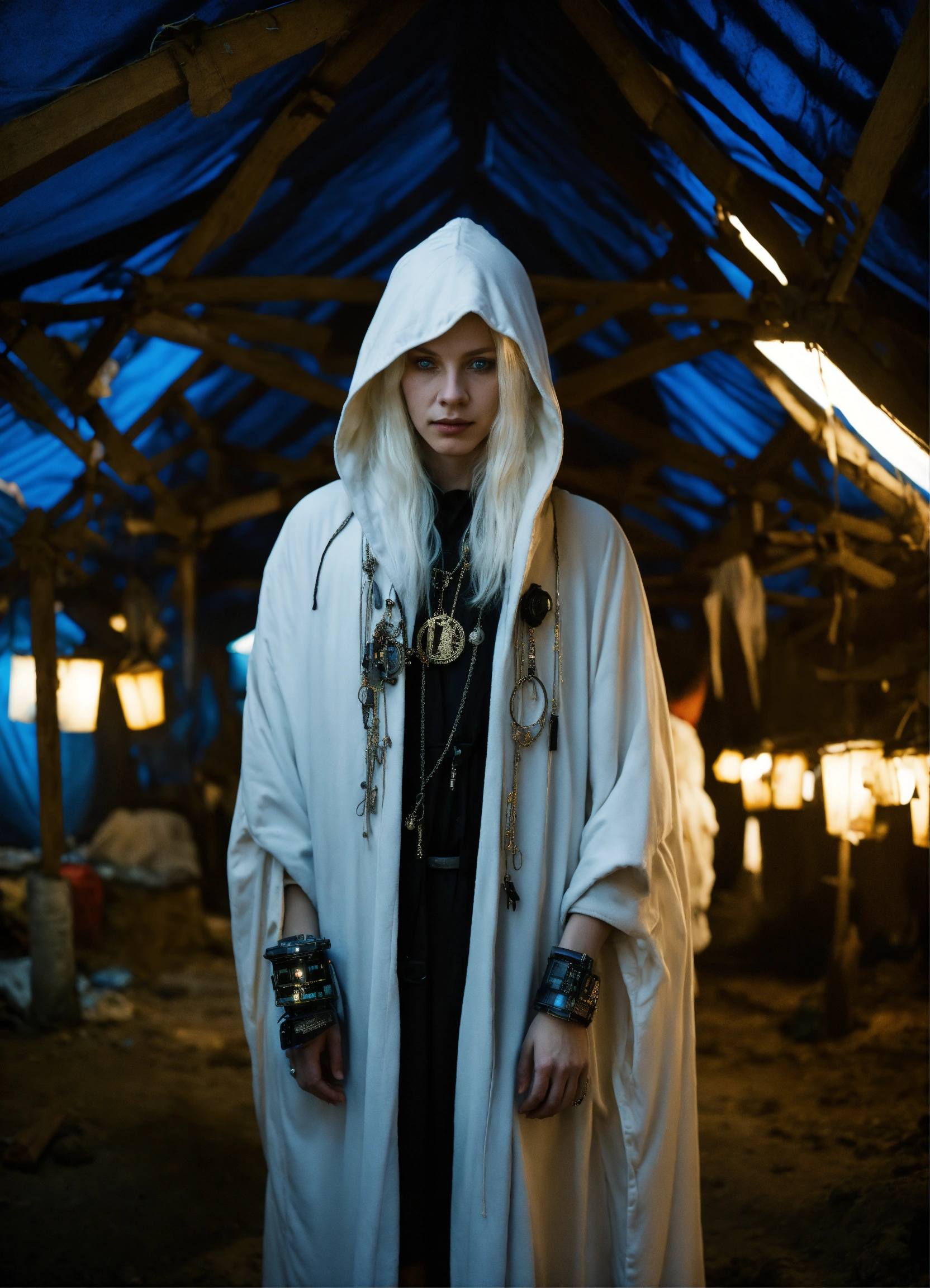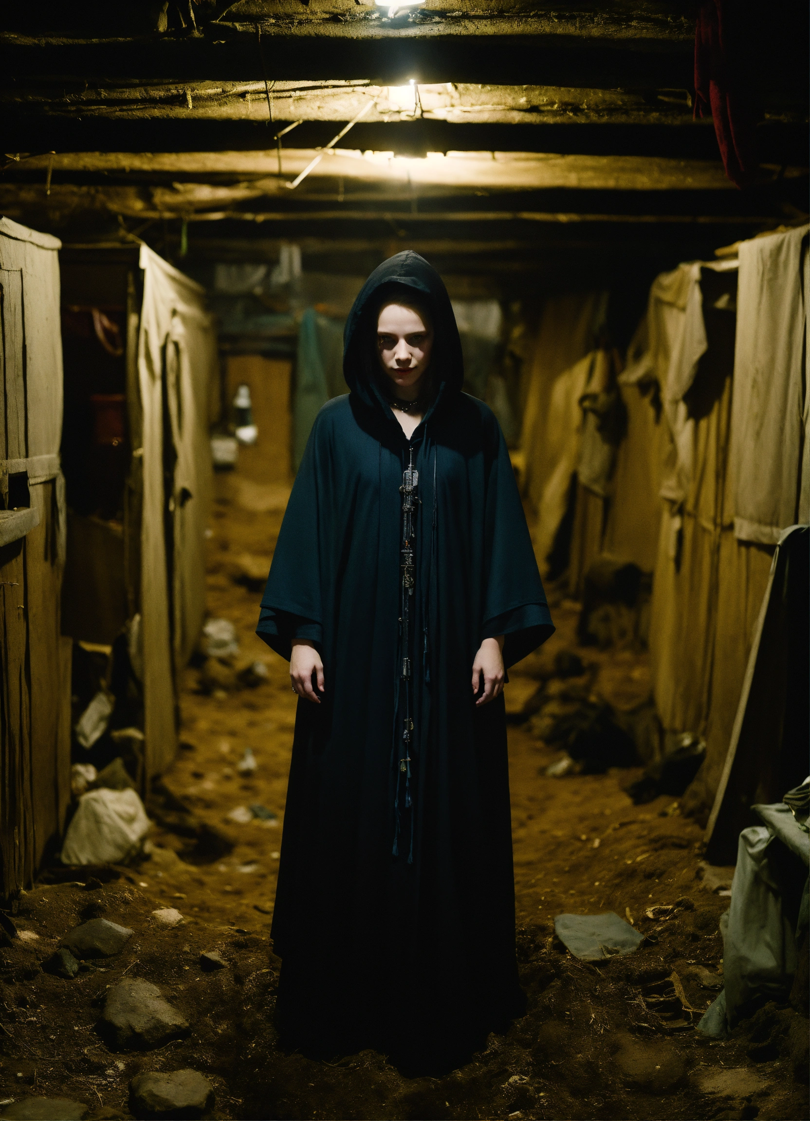 Pretty pale albino 19 year old cool mysterious hooded cyberpunk cult girl wearing a black ornate occultic cyber tech adorned robe in underground cyber shanty society town, dystopian, dark, low light, smirk, makeshift tents, underground village, her robe is black, movie still, wide angle shot directed by alejandro jodorowsky and tim burton and steven spielberg