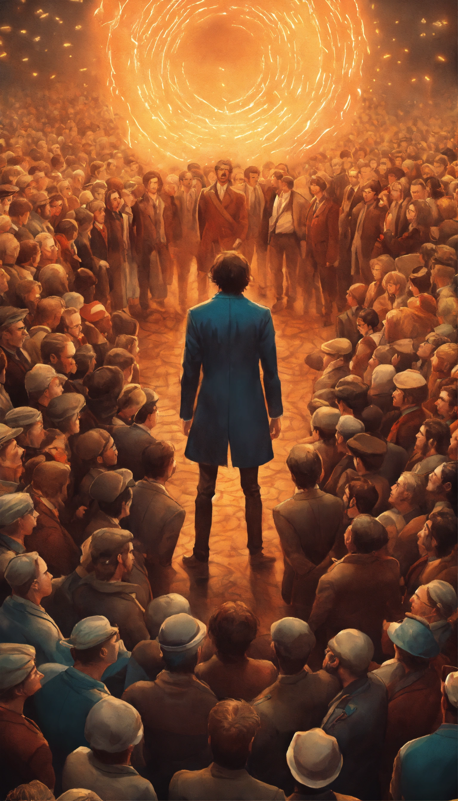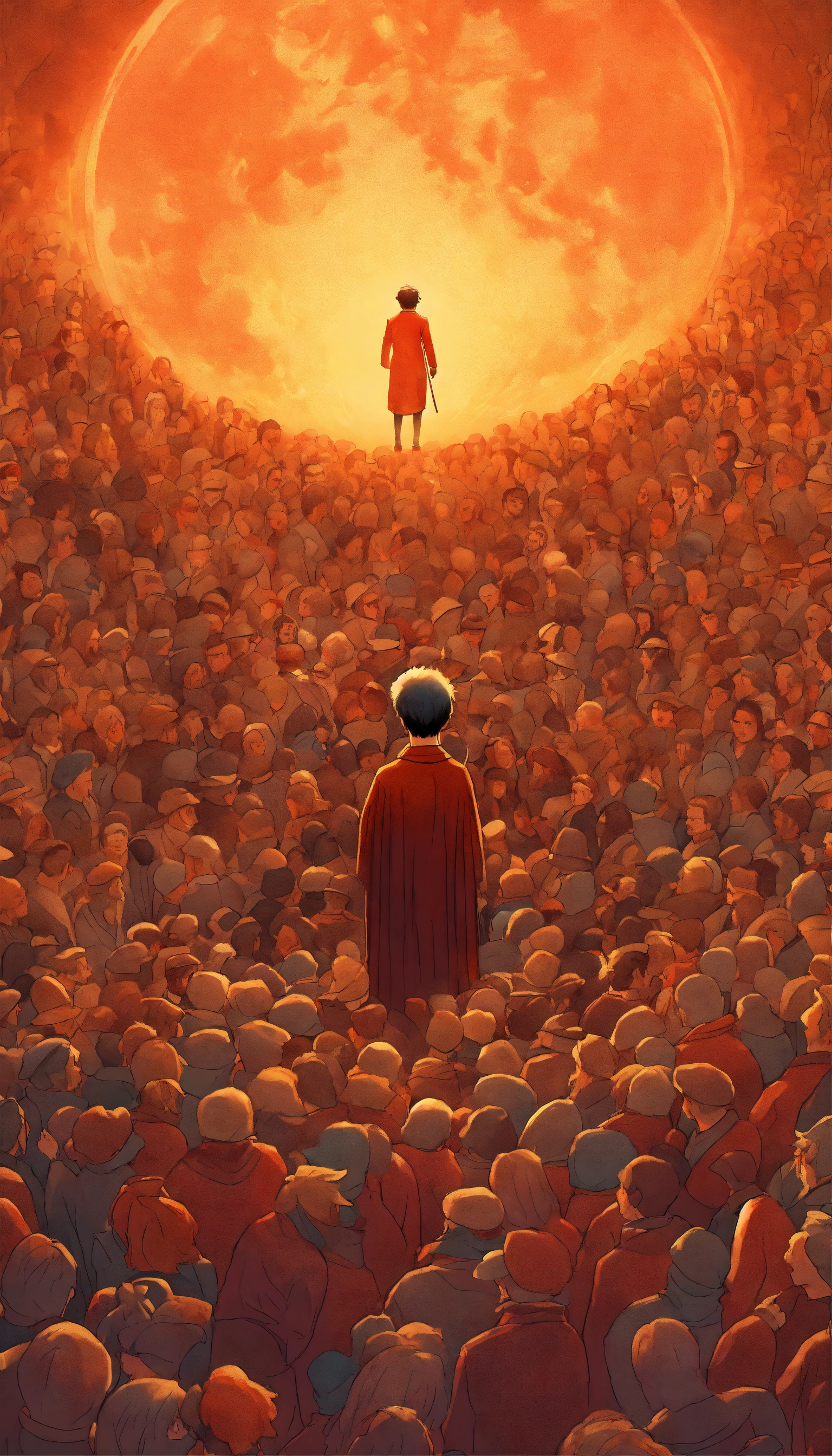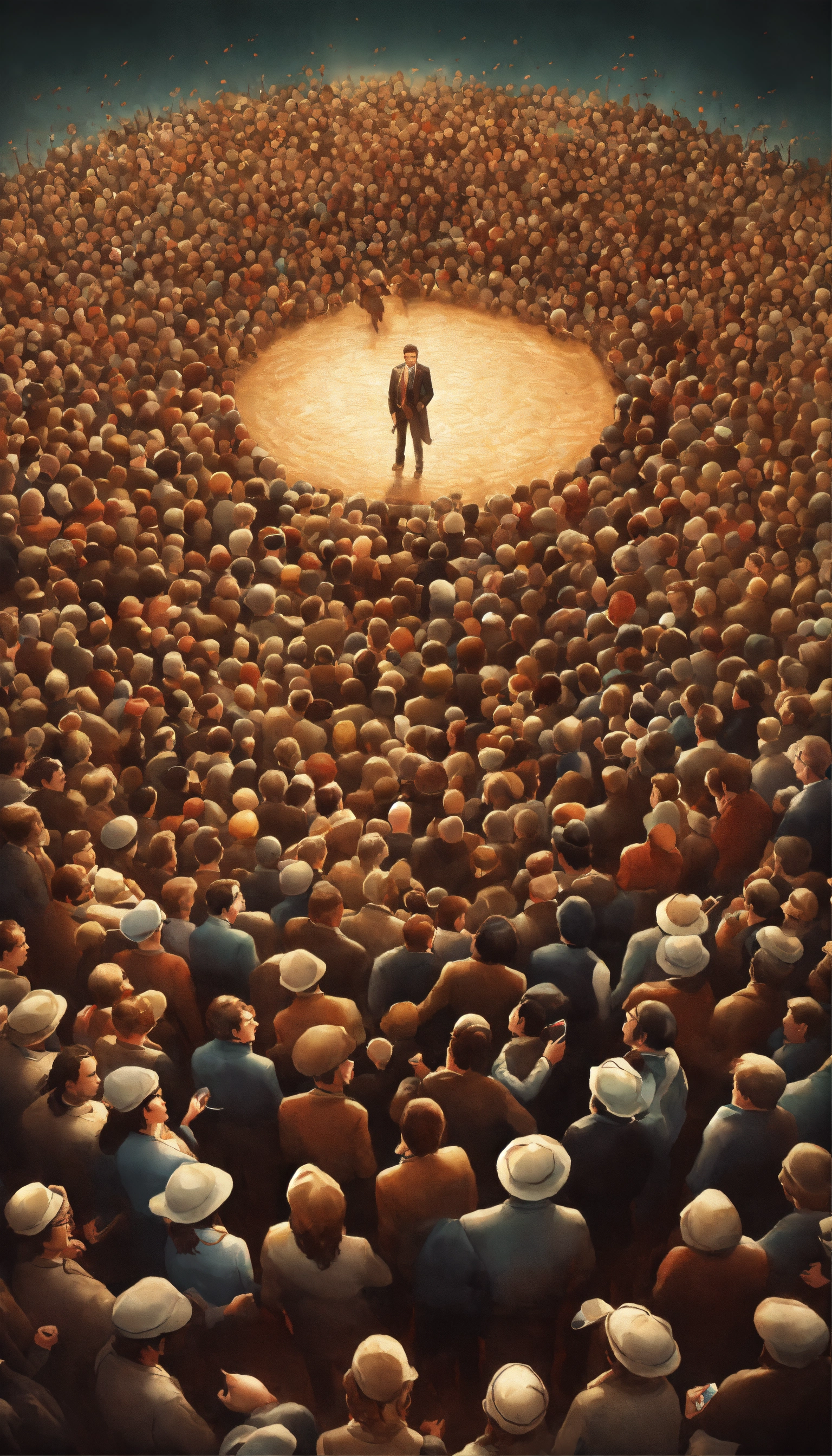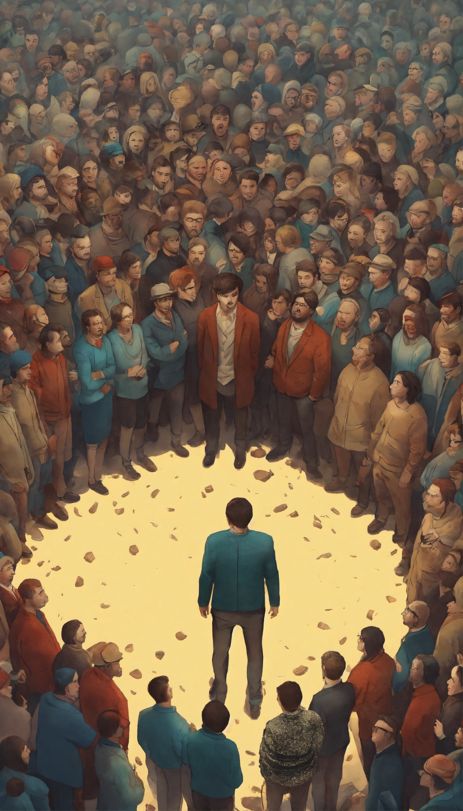 A lone person getting surrounded by an angry mob of people in a circle, surreal illustration, stunning details