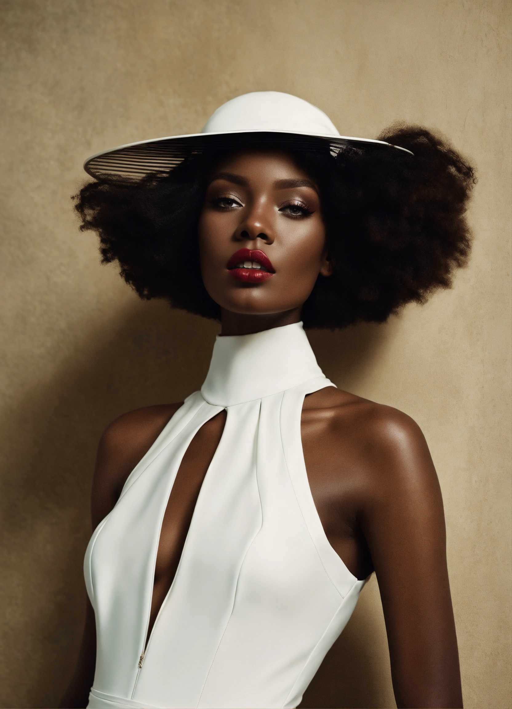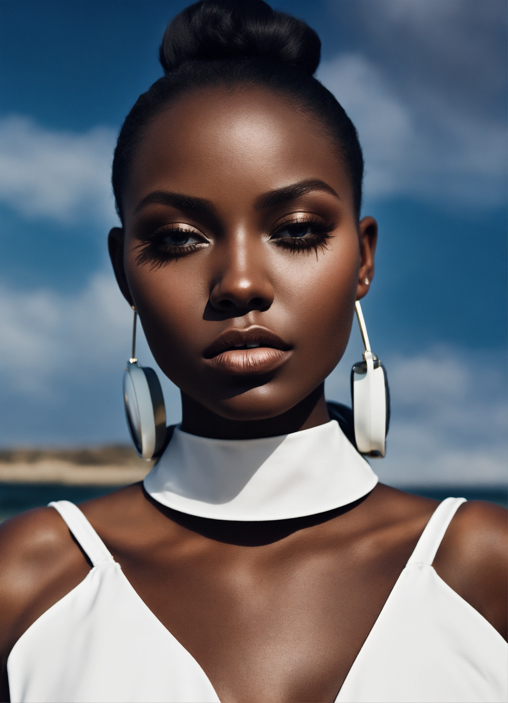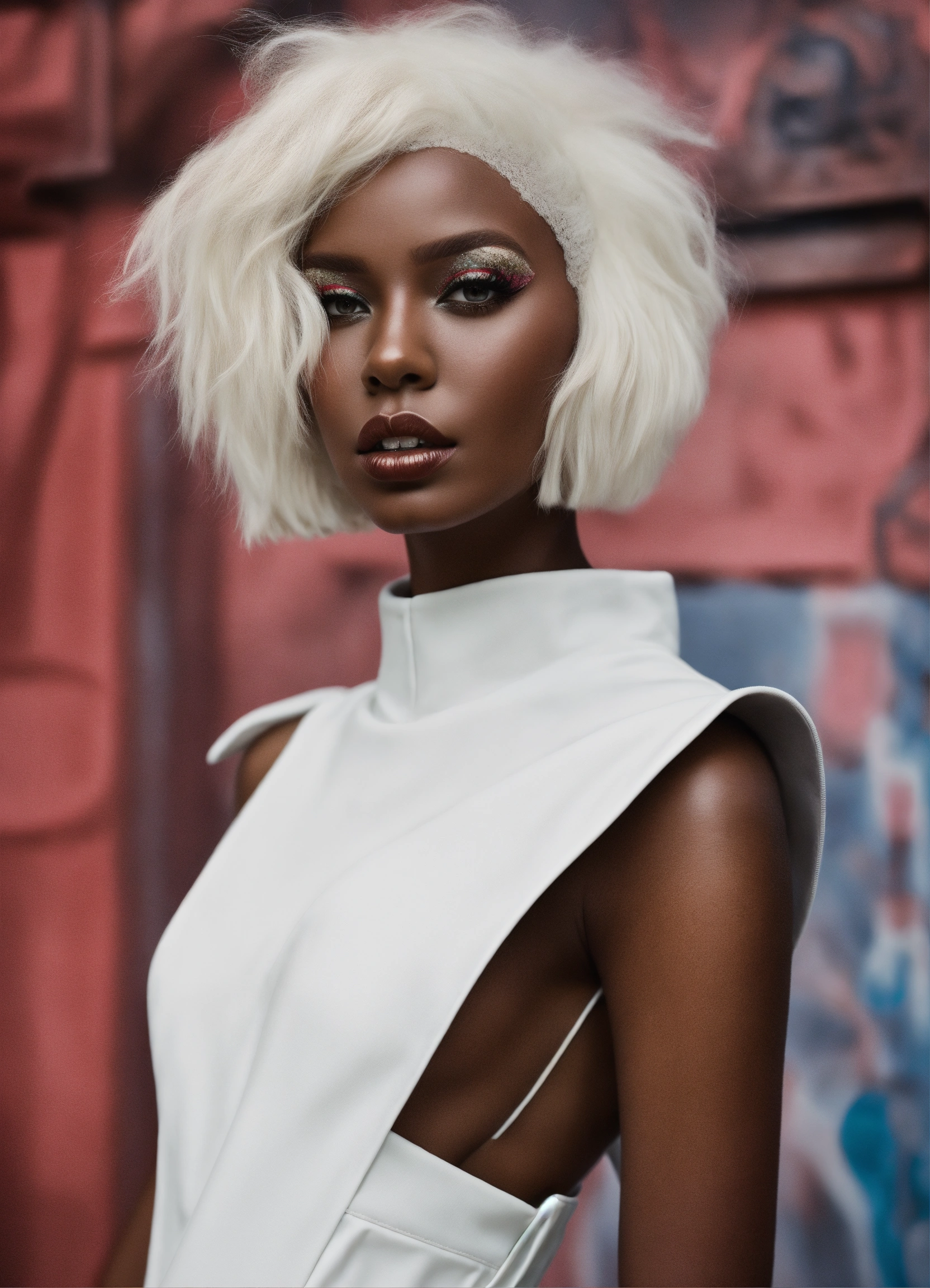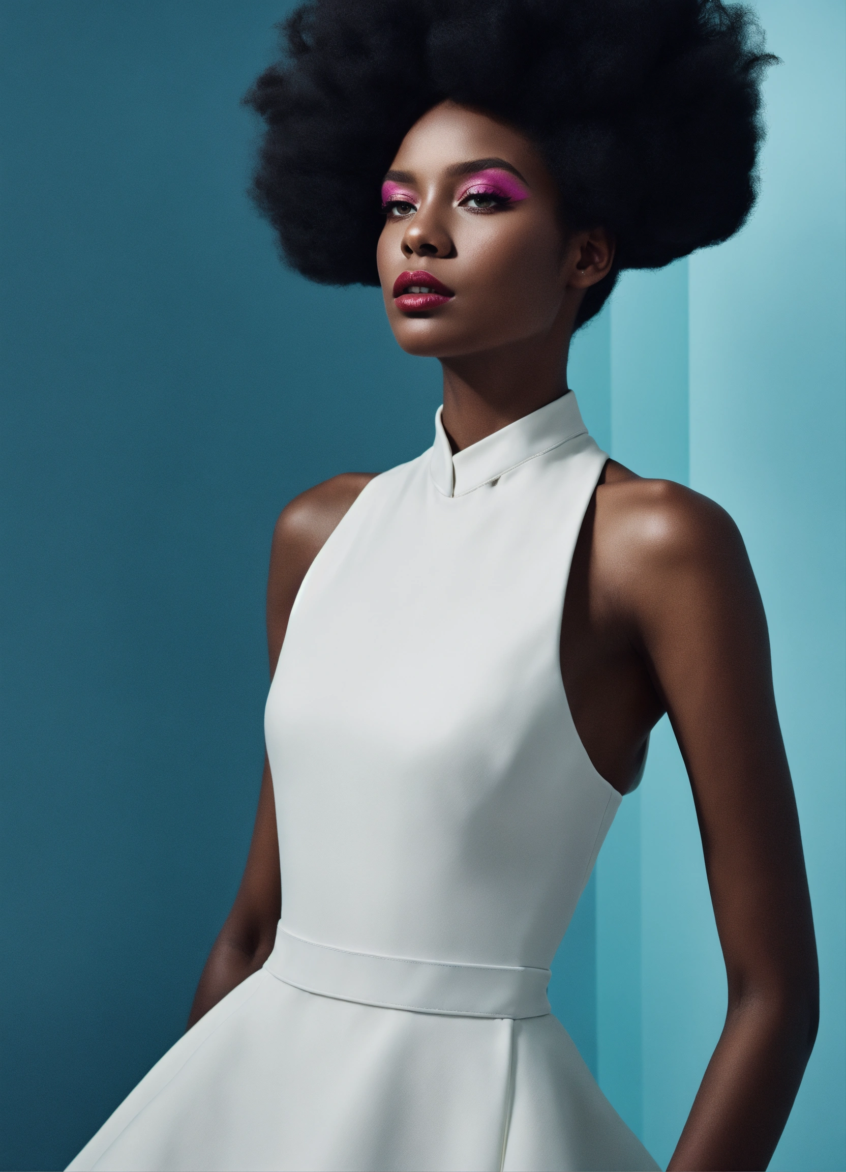 Avante garde high fashion beauty editorial, carmel complexion size 9 black woman dress in white by flora borsi, style by flora borsi, bold, bright coolers, conceptual bob style hair, ((flora borsi))