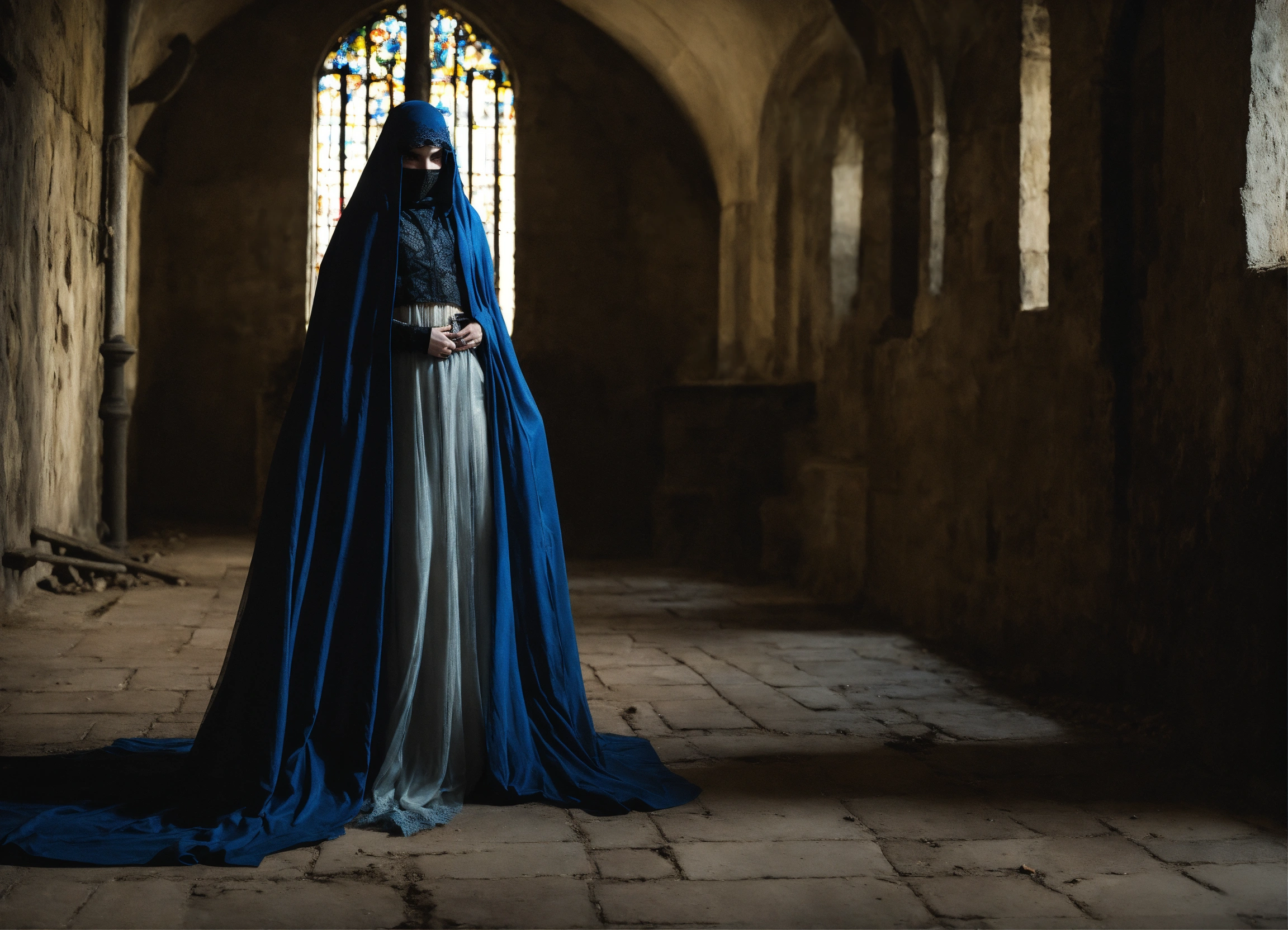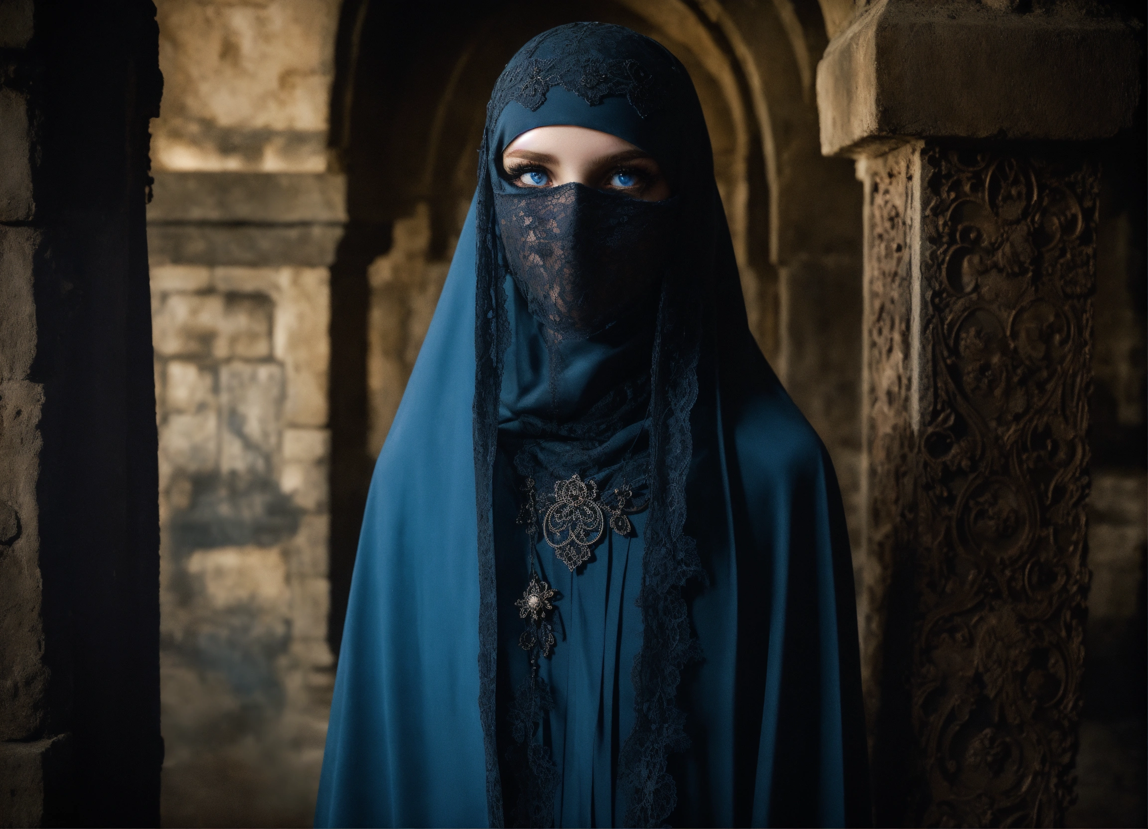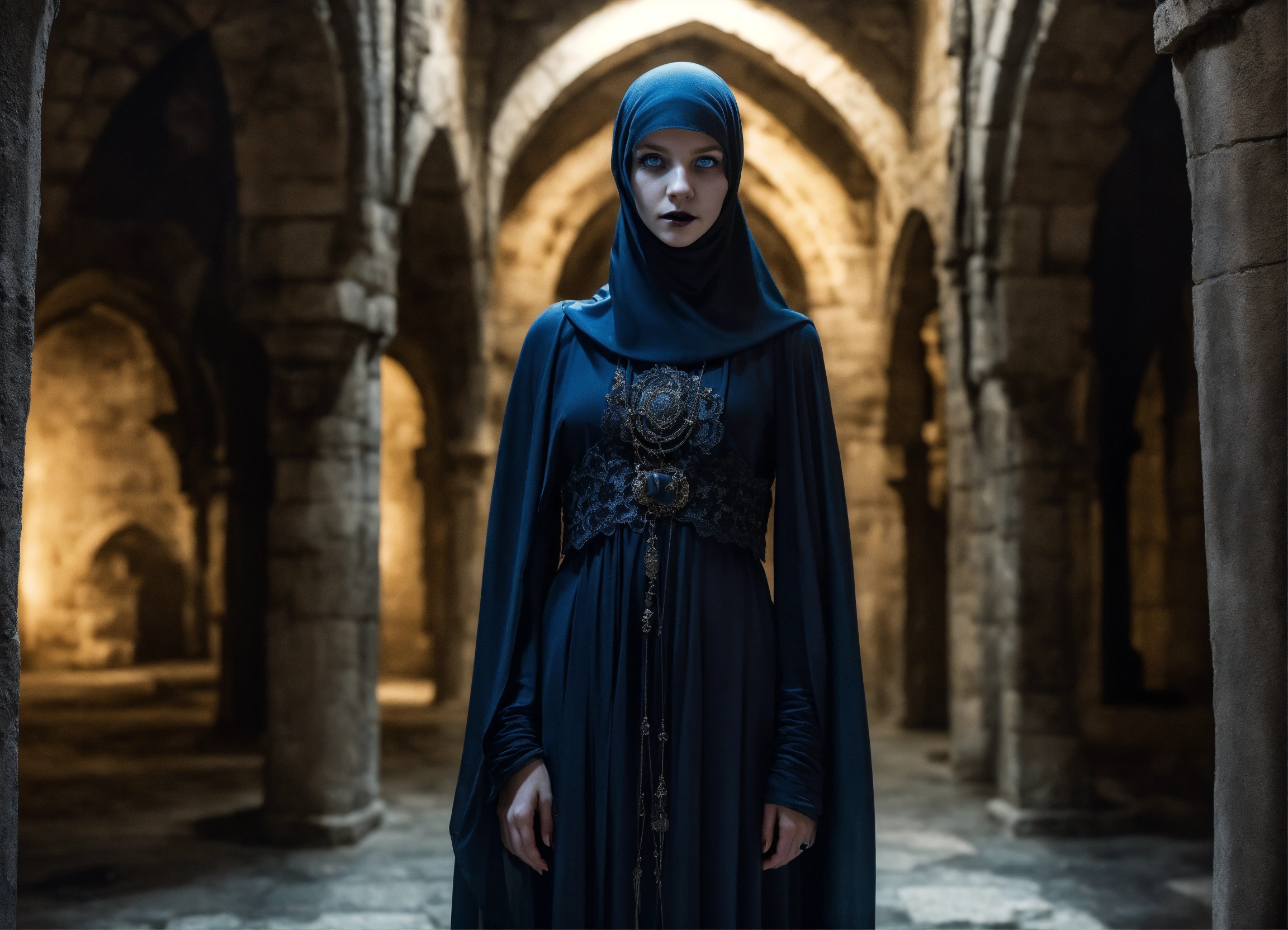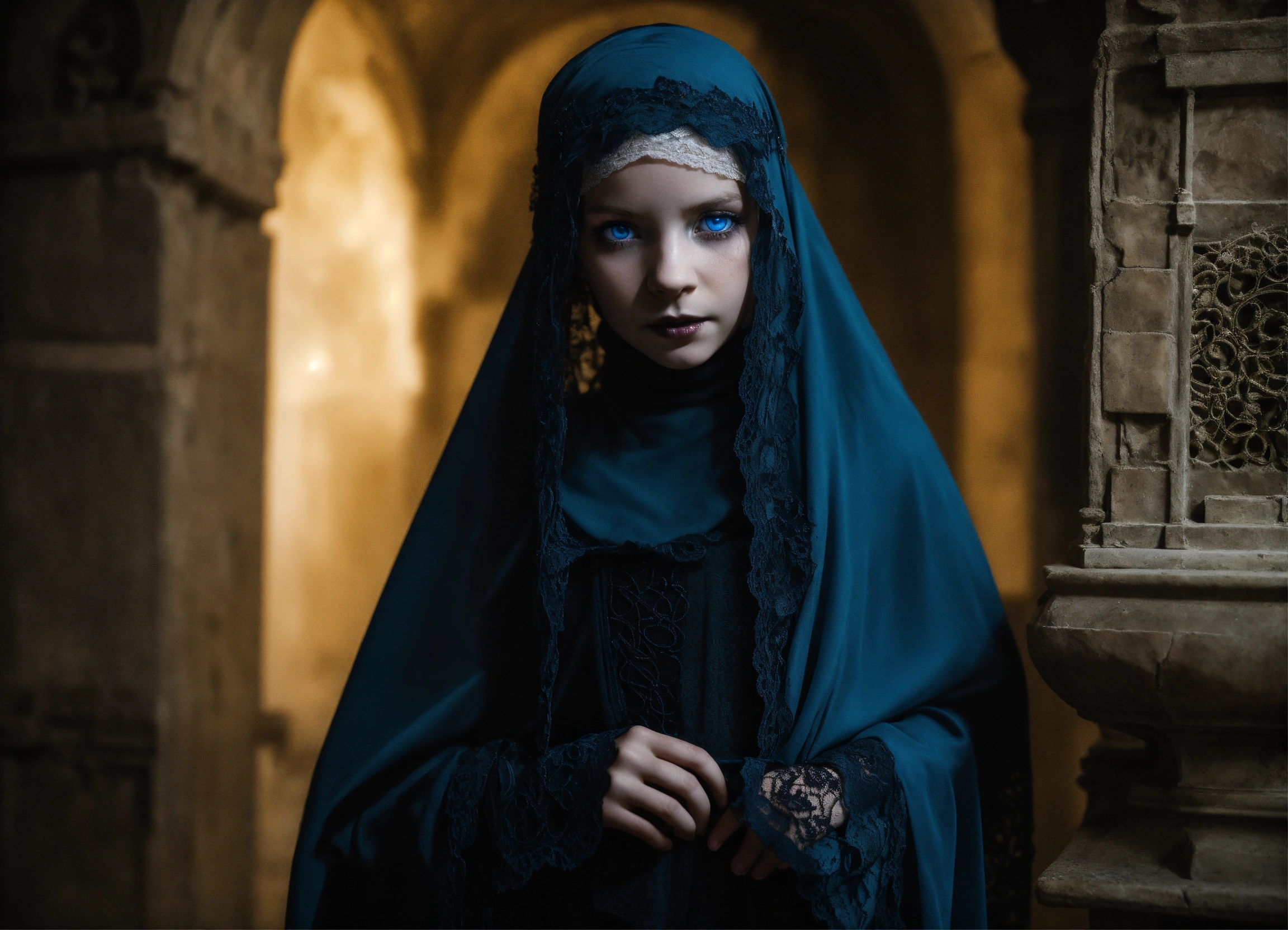 Body portrait of a very childish deadly pale ultra slim twelve year old female child, she is a goth necromancer with waist-long silverwhite hair, lace niqab, face veil, fully veiled, very flat belly, ultra skinny, very slim body, emaciated body, completely emaciated, ultra narrow face, alabaster skin, pale as a corpse, glowing blue eyes, ultra slim face, innocent looking, in a gloomy crypt, lasziv, kindlich, unschuldig, childlike, graceful, wispy, glowing blue eyes, ghostly, dead, evil, demonic, undead, darkness, grotesque, mysterious, dark, cold ambient lighting, extremely detailed, fantasy, medieval setting