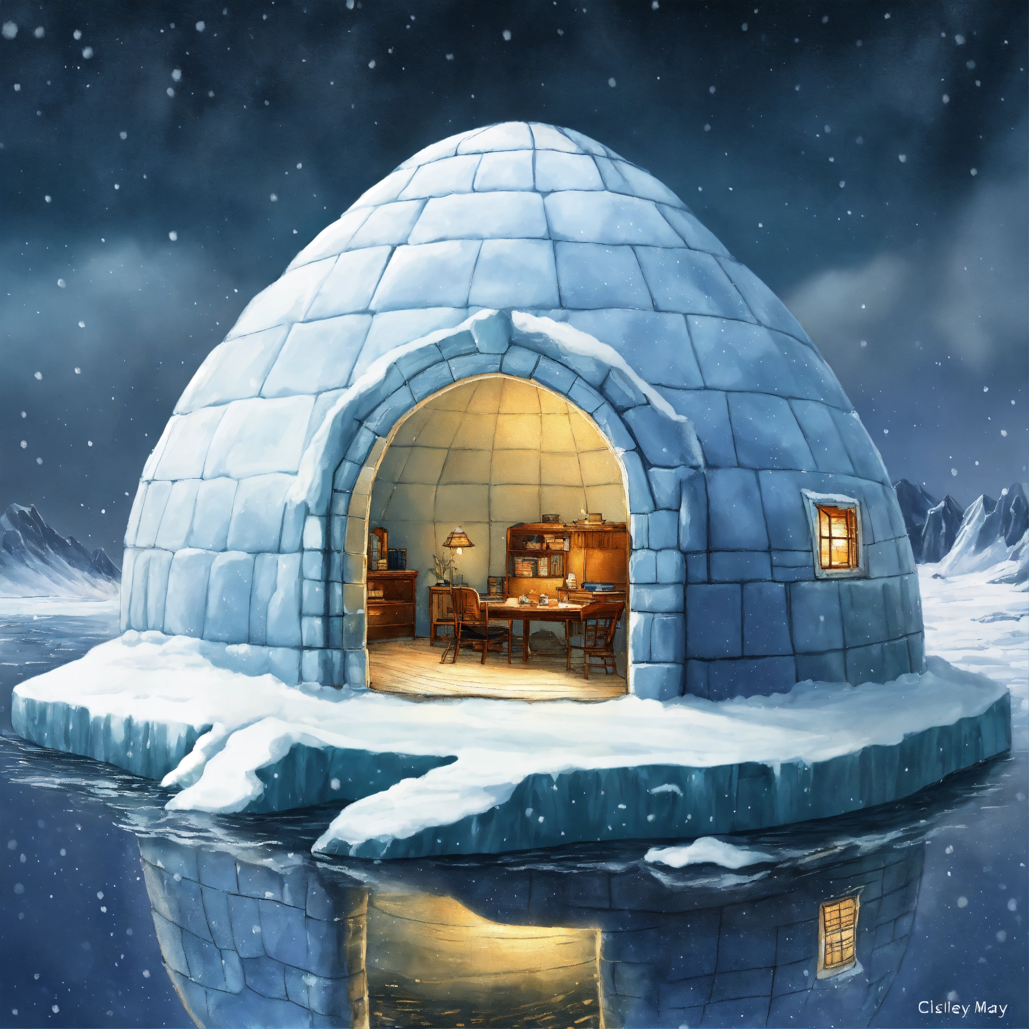 A detailed illustration of a igloo on a floating iceberg in a snow storm from a worm's eye view. the igloo iceberg is divided into four sections snow, forest, north pole, realistic. by cicely mary barker.