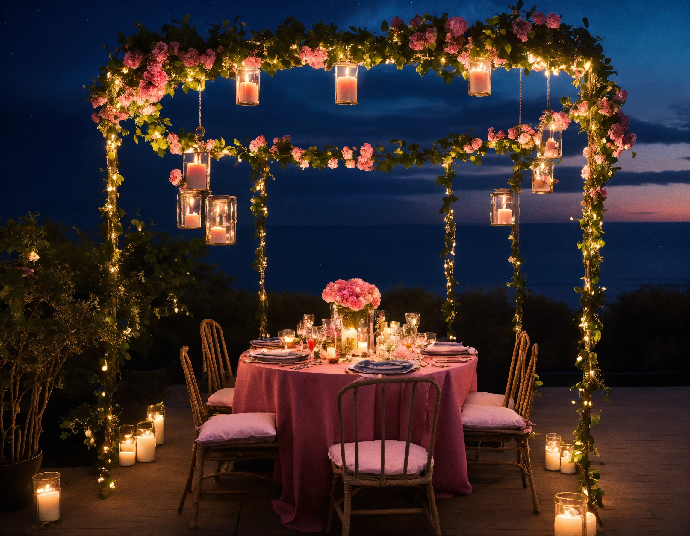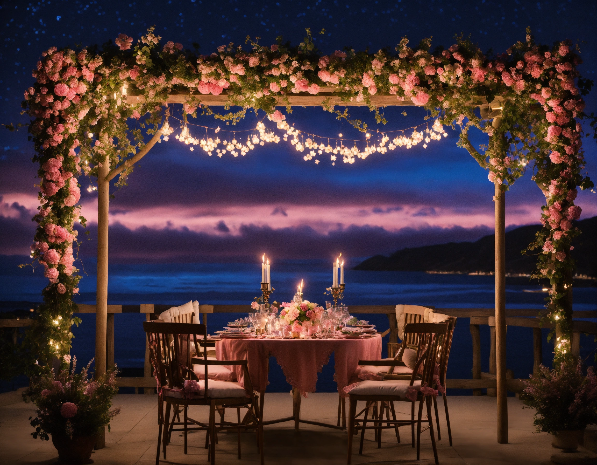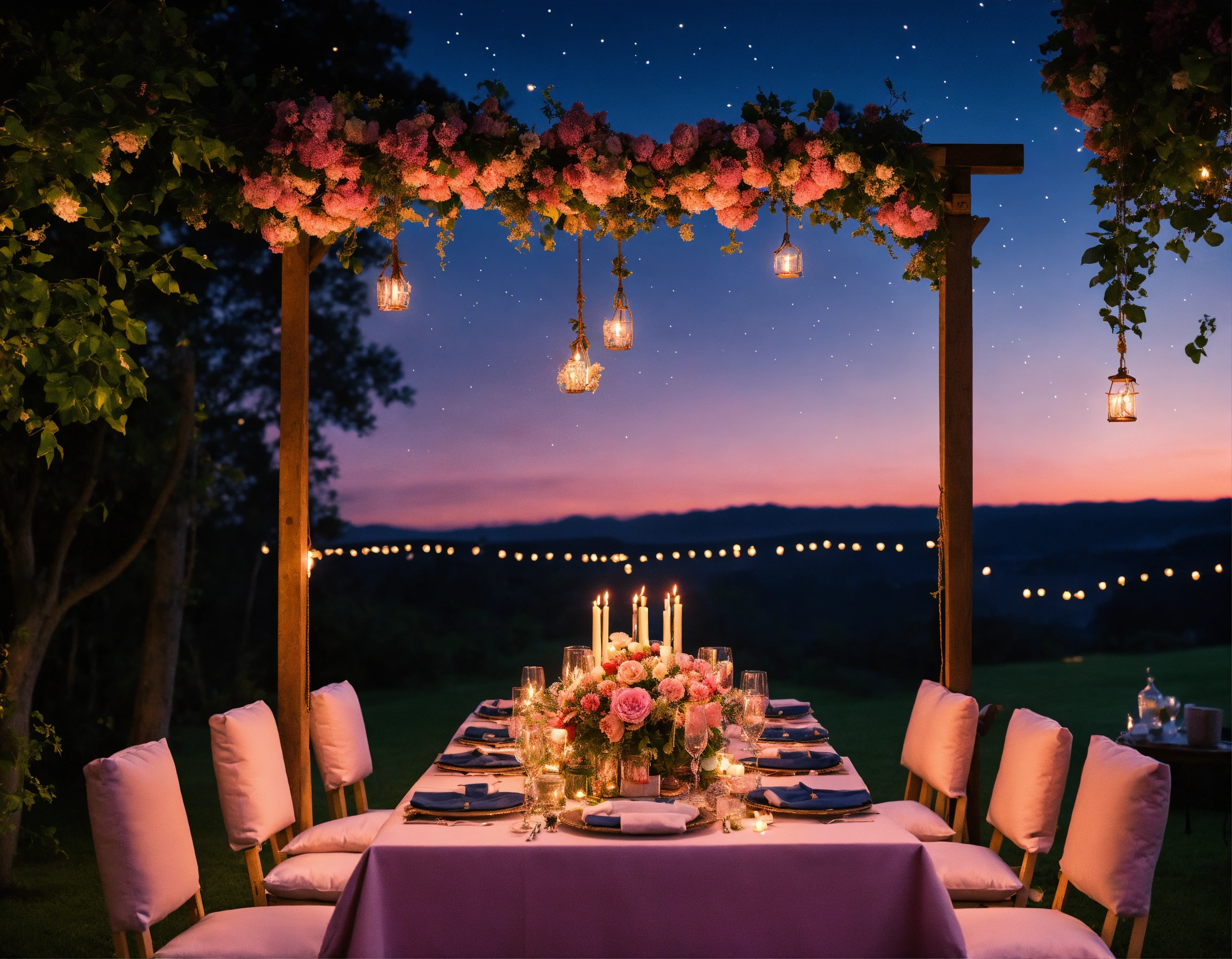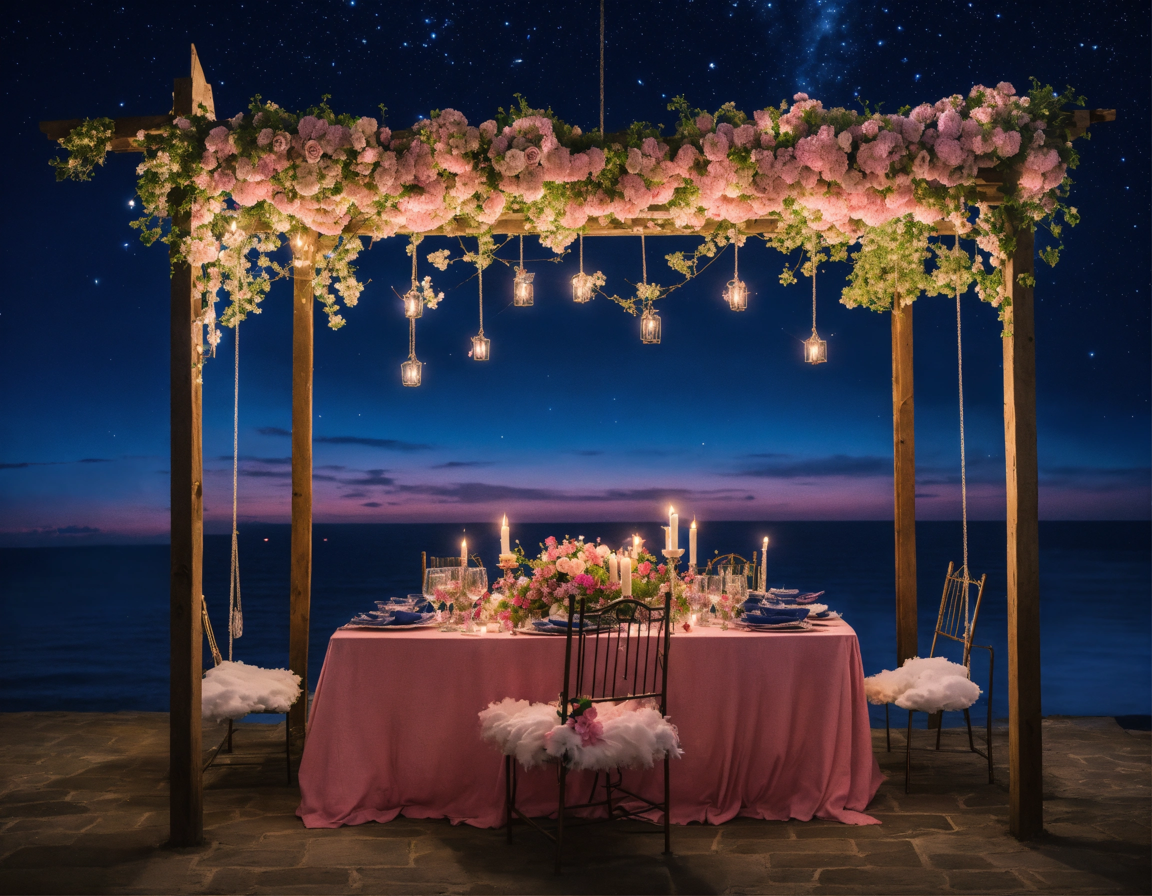 Under the romantic navy sky the stars twinkle and candles are lit, a pink flower swing, with a long dinner table, pillows are clouds