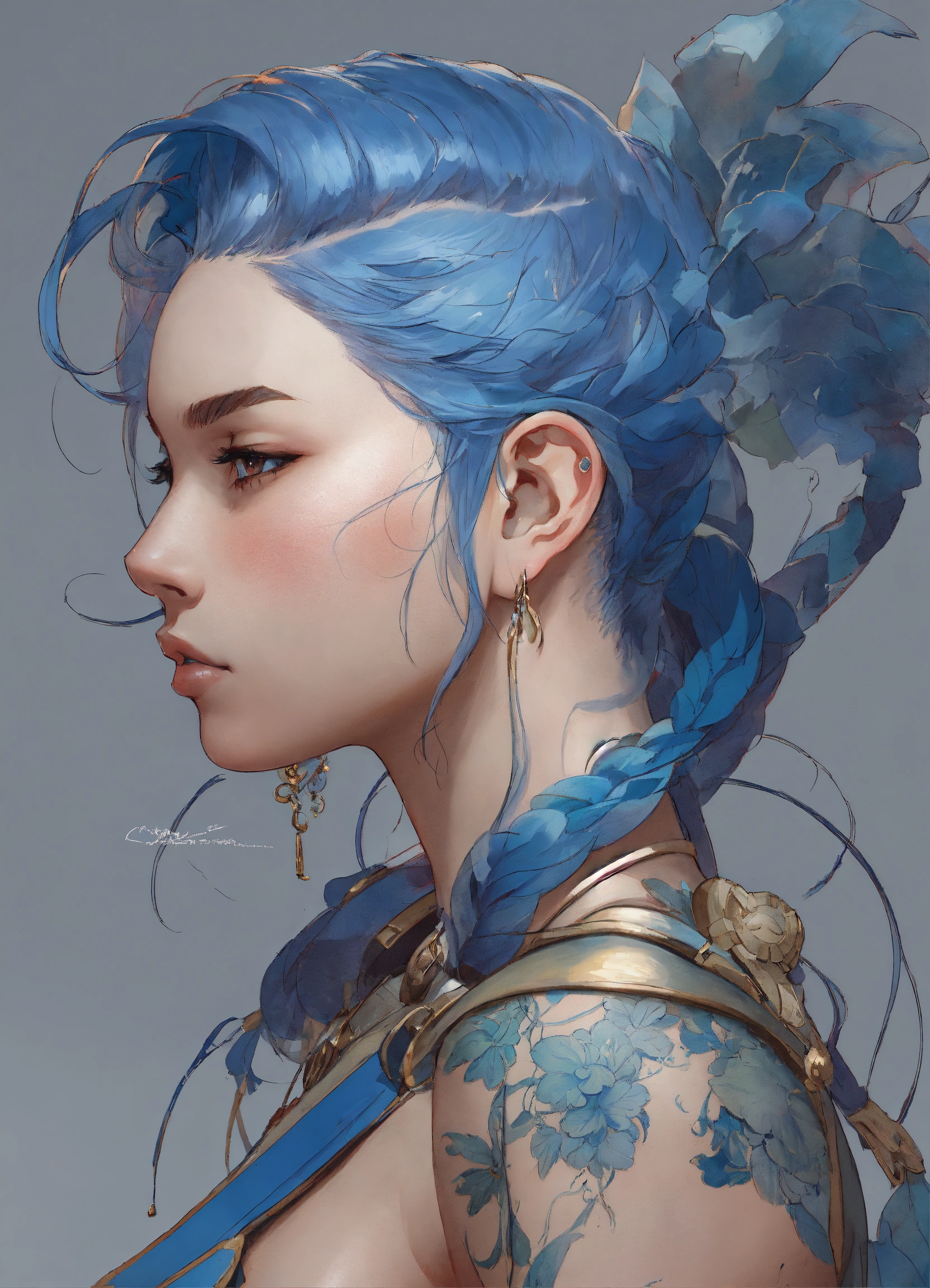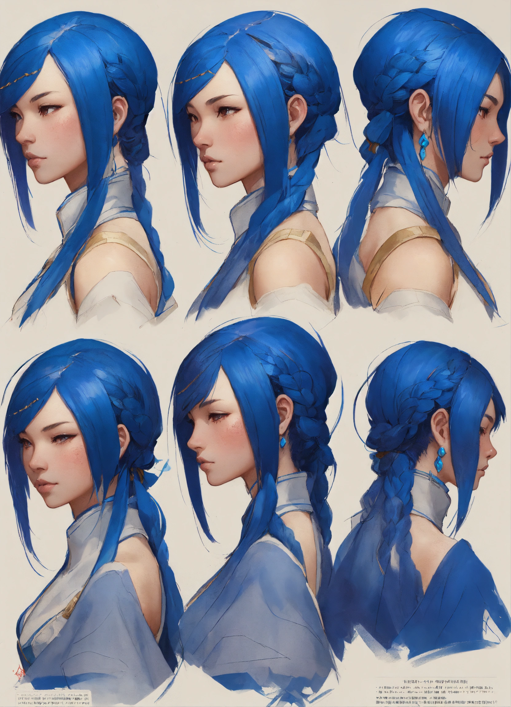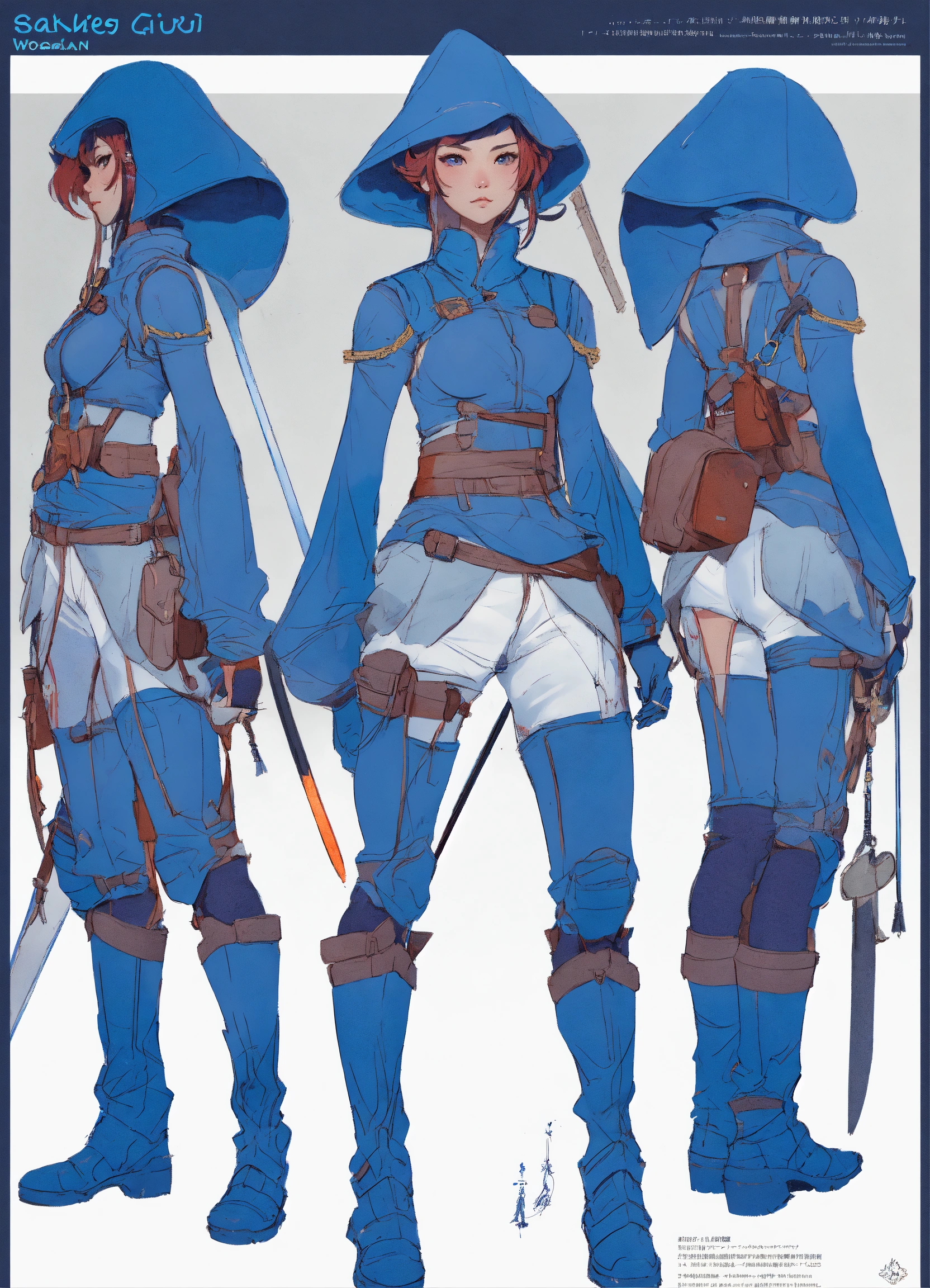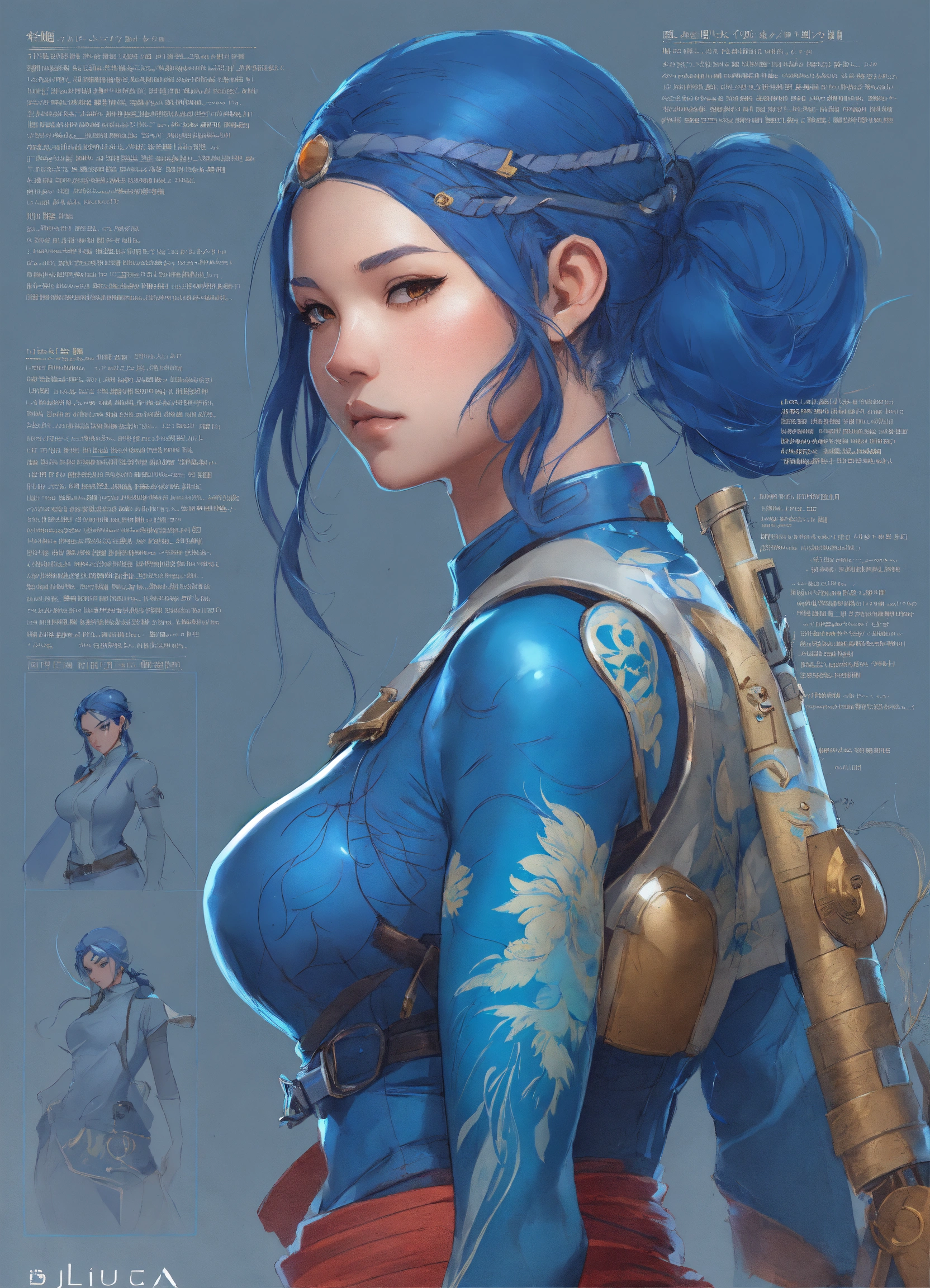 Blue back tattoed woman warrior, character sheet, character design, chart, reference sheet, multiple views, high detail, fine details, concept art, rossdraws, james jean, sakimichan, moebius, stanley artgerm lau, jayison devadas, phuoc quan, studio ghibli