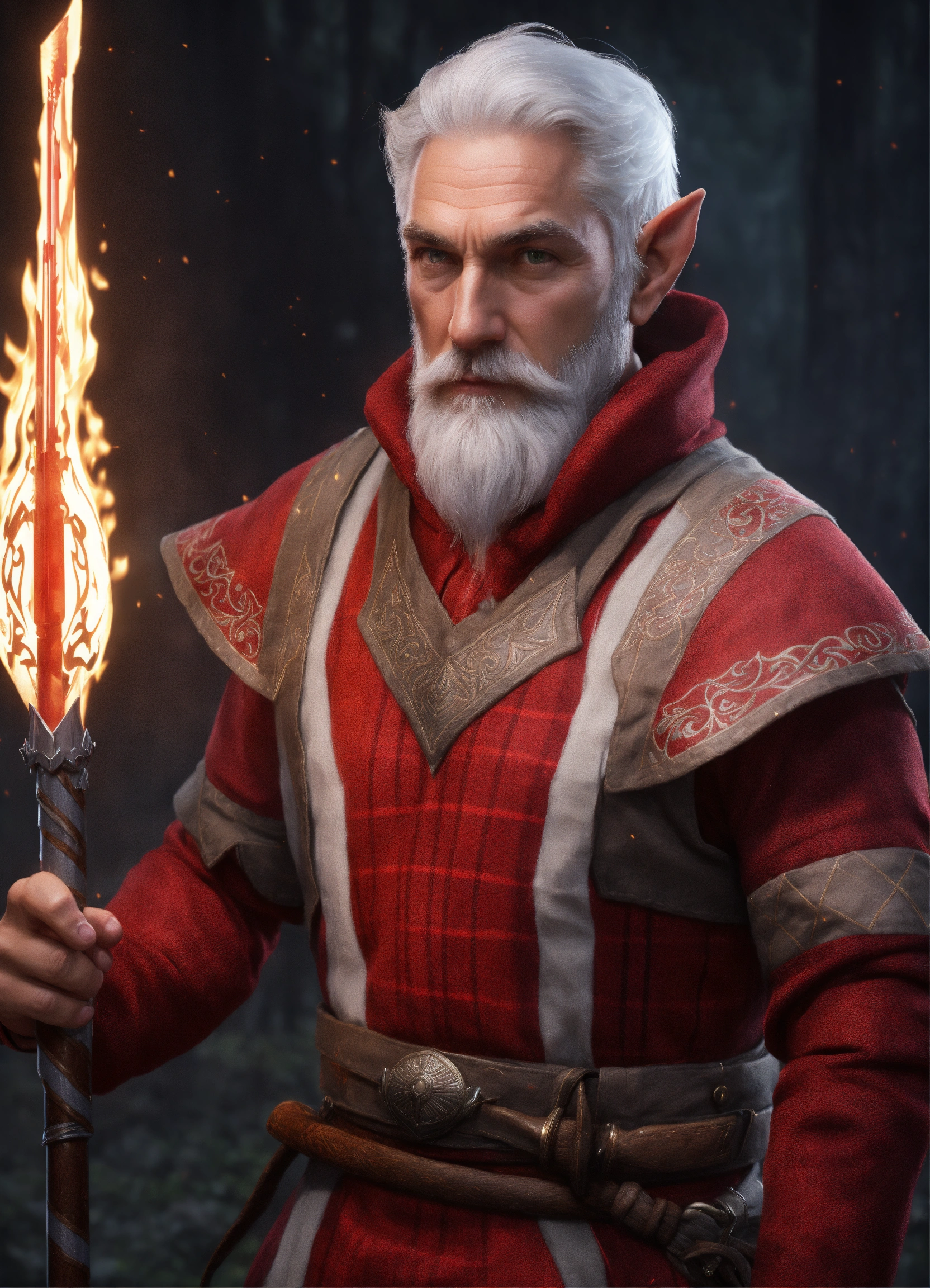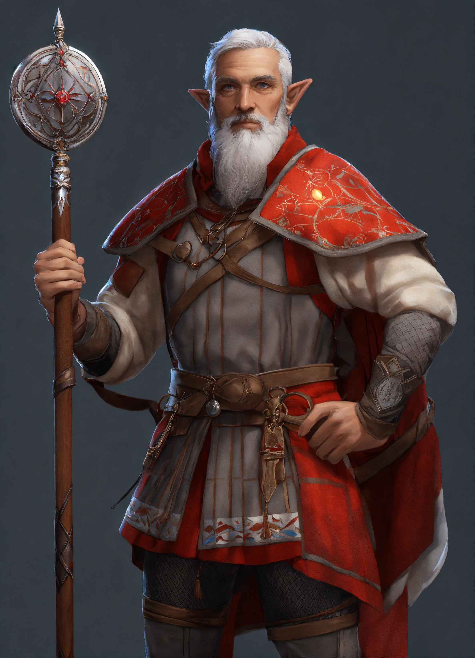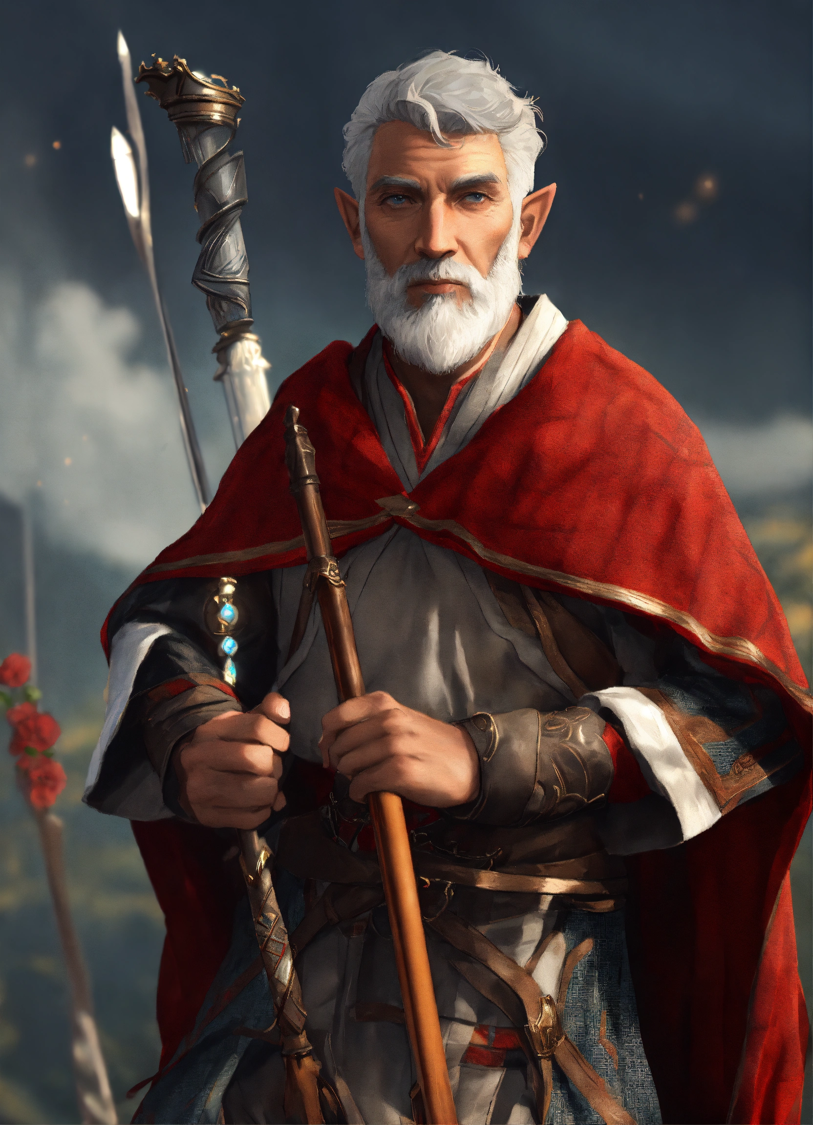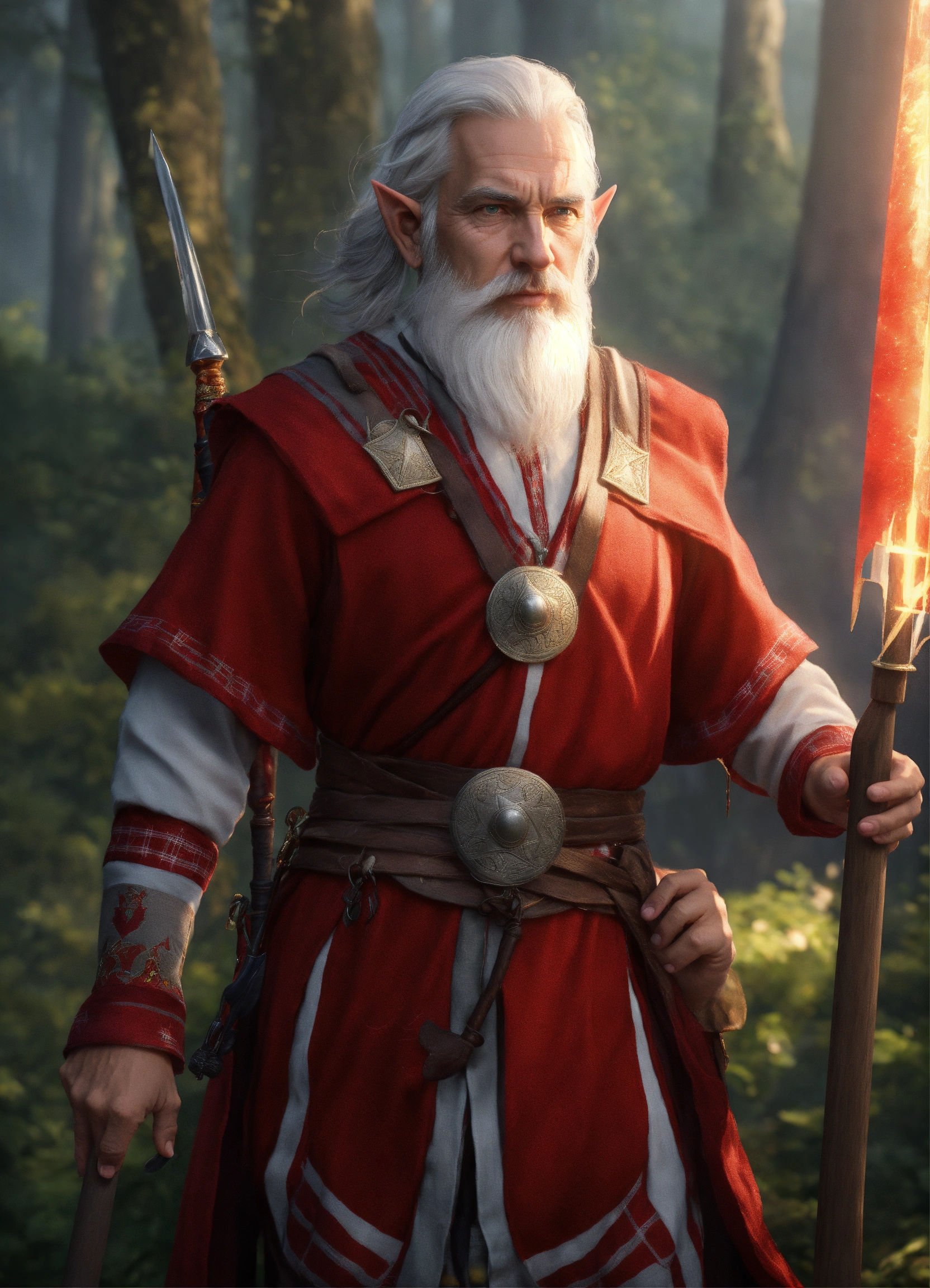 A grey-haired astral elf man, he has grey short beard, he wears a red and white checked tunic, he hold a white quarterstaff, 4k, realistic