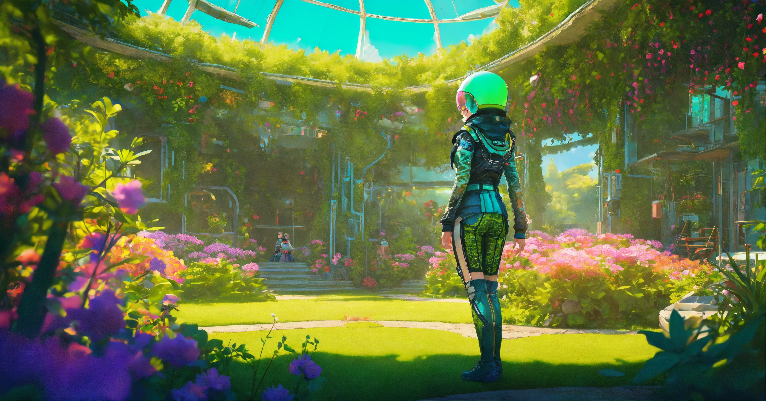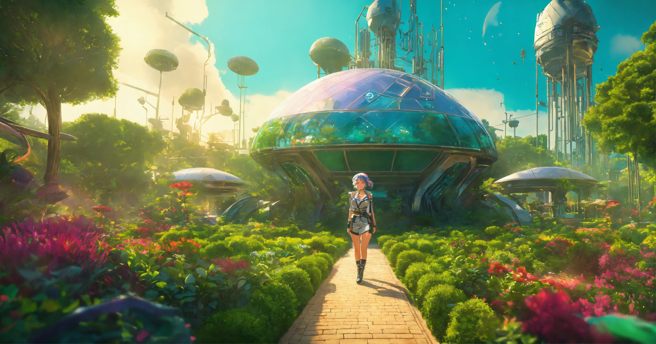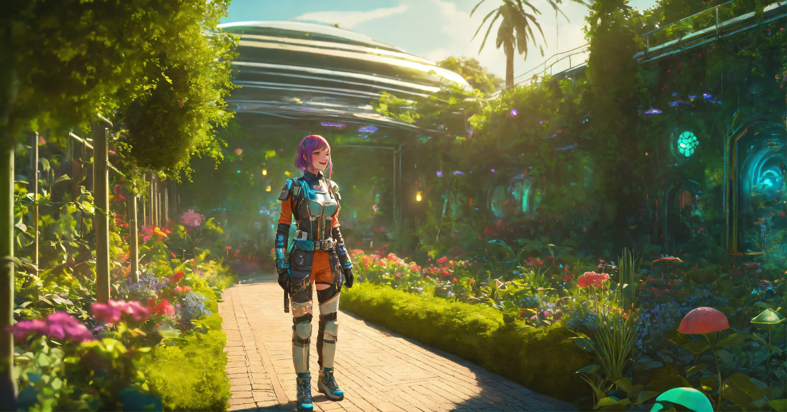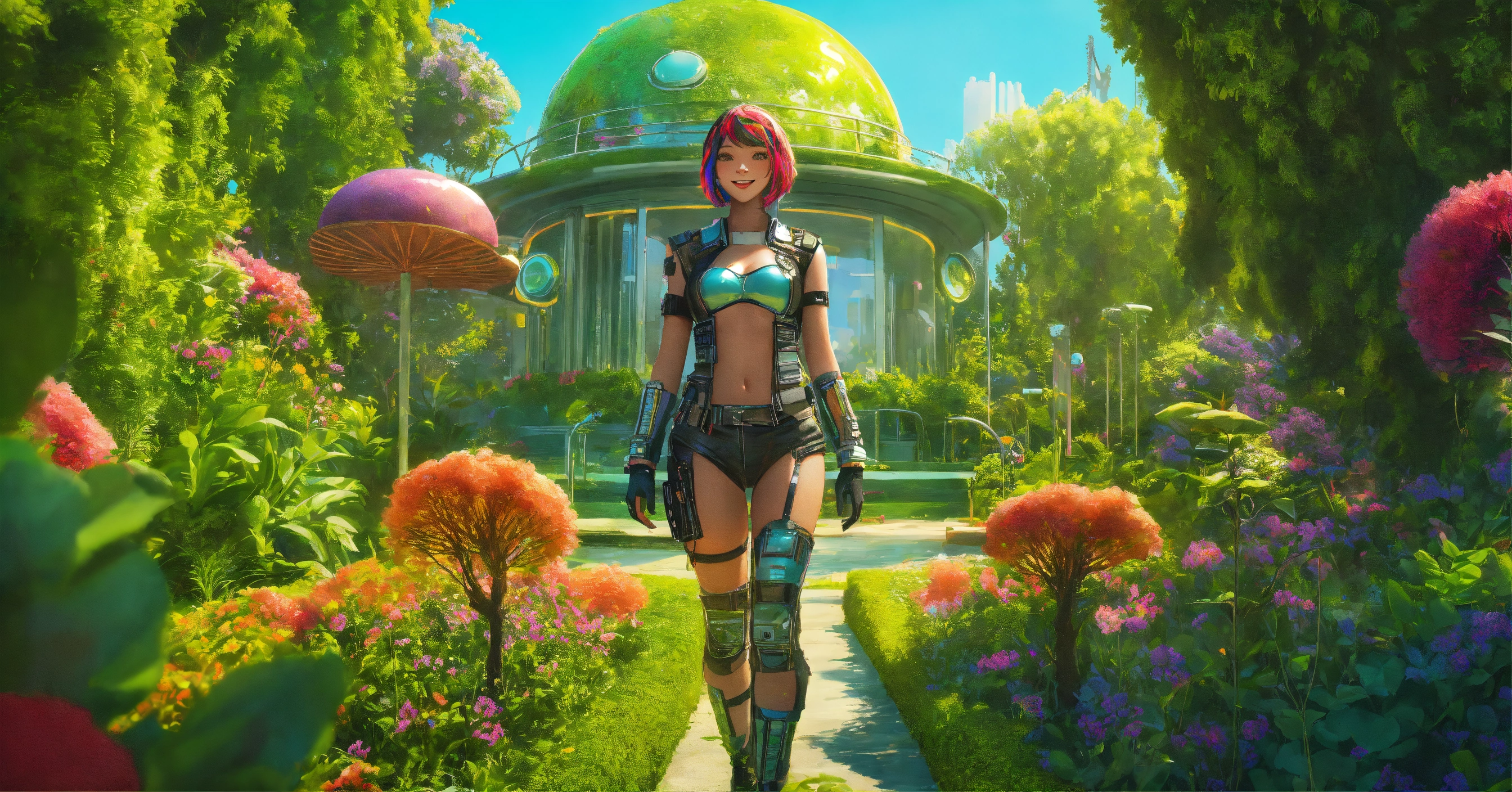 Futurepunk young happy woman in futuristic outfit standing in the lush green garden, sunny day, colorful lighting, wide-angle perspective, ultra-high definition (uhd), very detailed, by mattias adolfsson