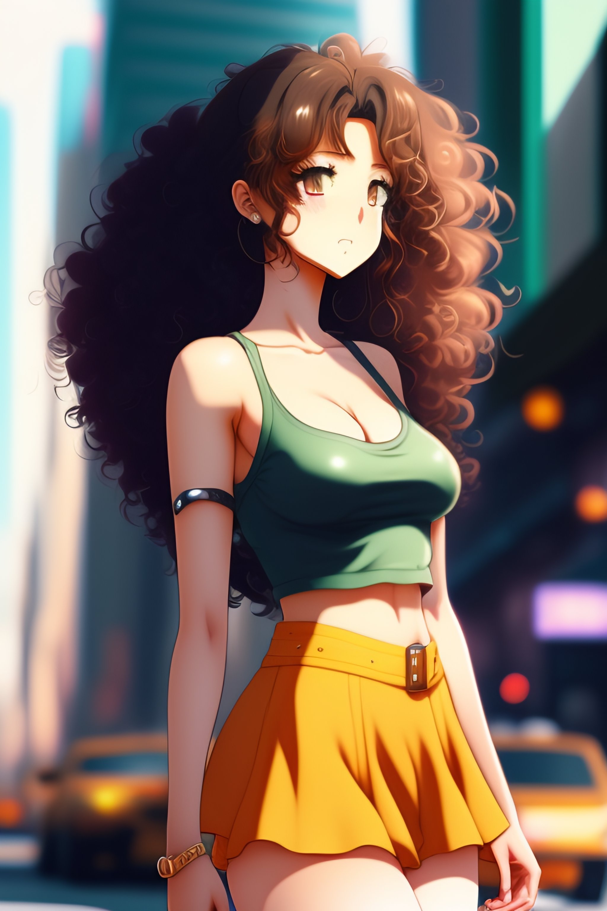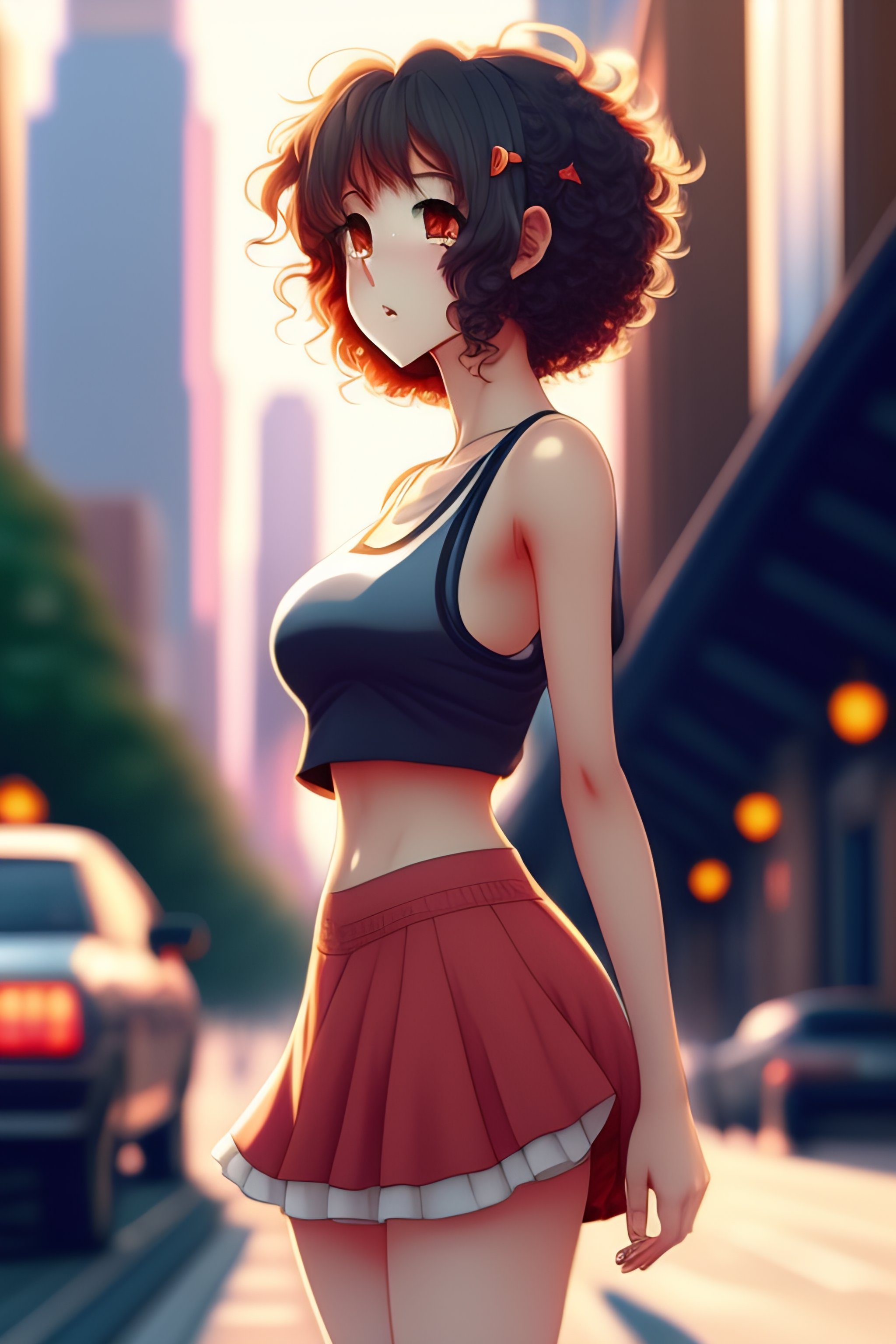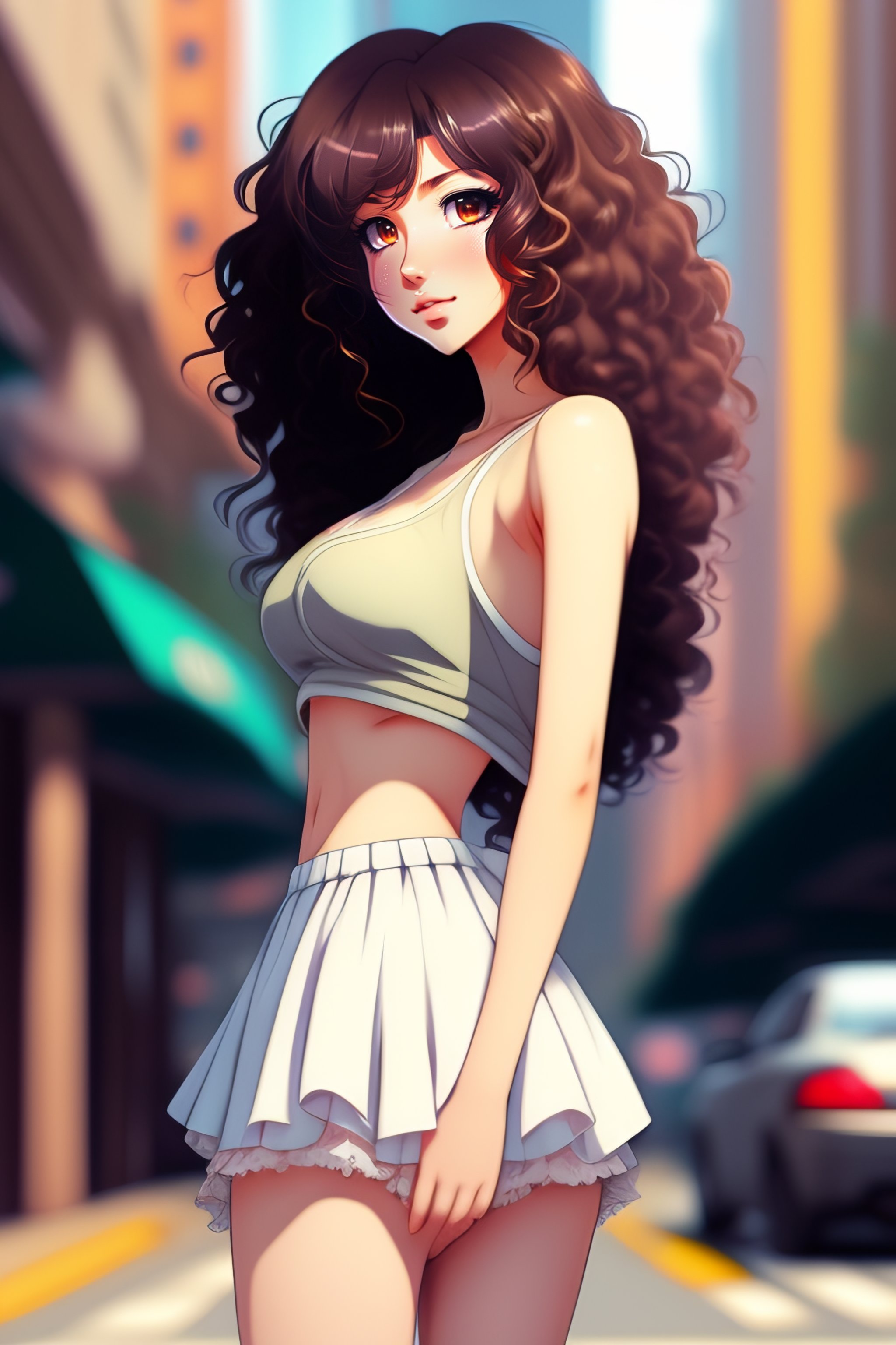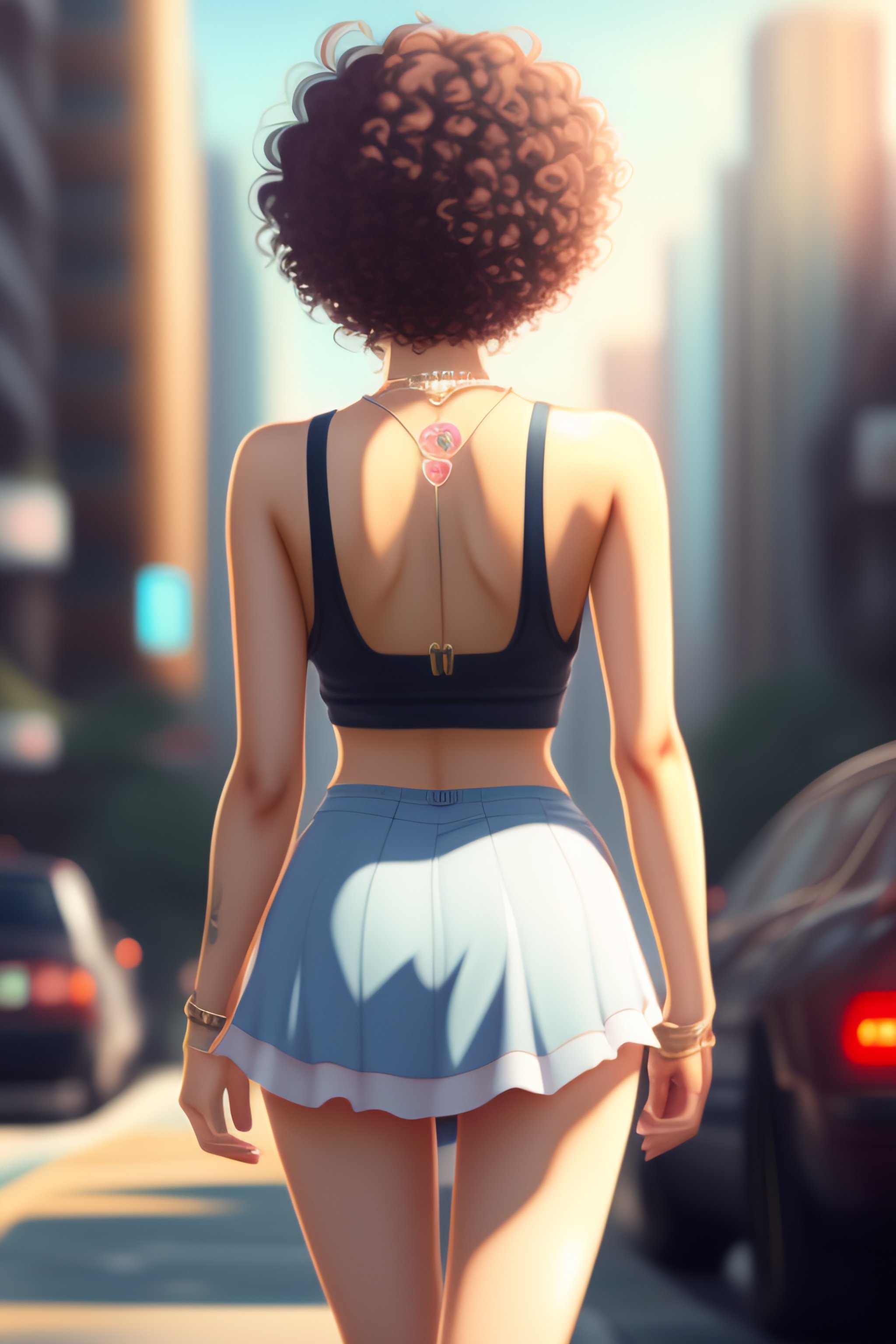 Anime style, cute anime girl, 19 years old, back view, far from camera, medium curly brown hair, skinny, back visible, slim waist, thick, hands on hips, really short crop top, really short skirt, buttocks slightly visible, on side walk in big city