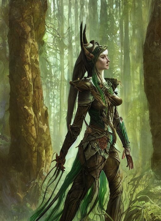 A serious looking wood elf woman wearing armour made of tree bark, green tinted hair. woodland. fantasy concept art. moody epic painting by james gurney, and alphonso mucha. artstationhq. painting with vivid color. ( dragon age, witcher 3, lotr )