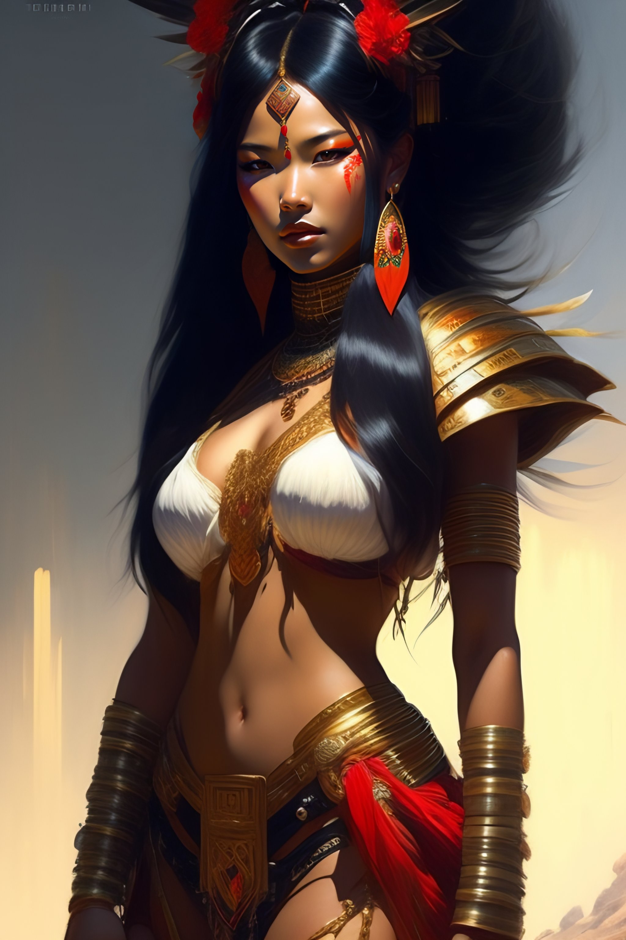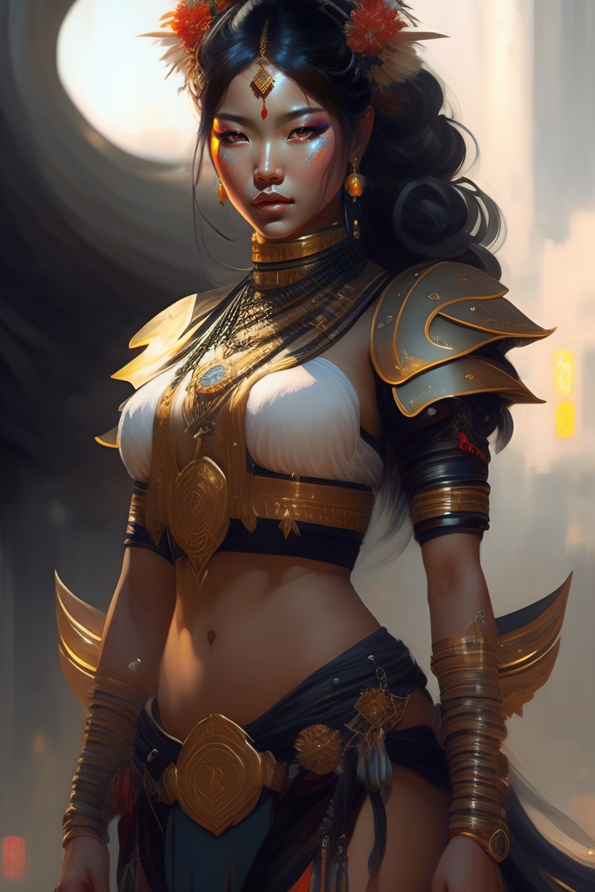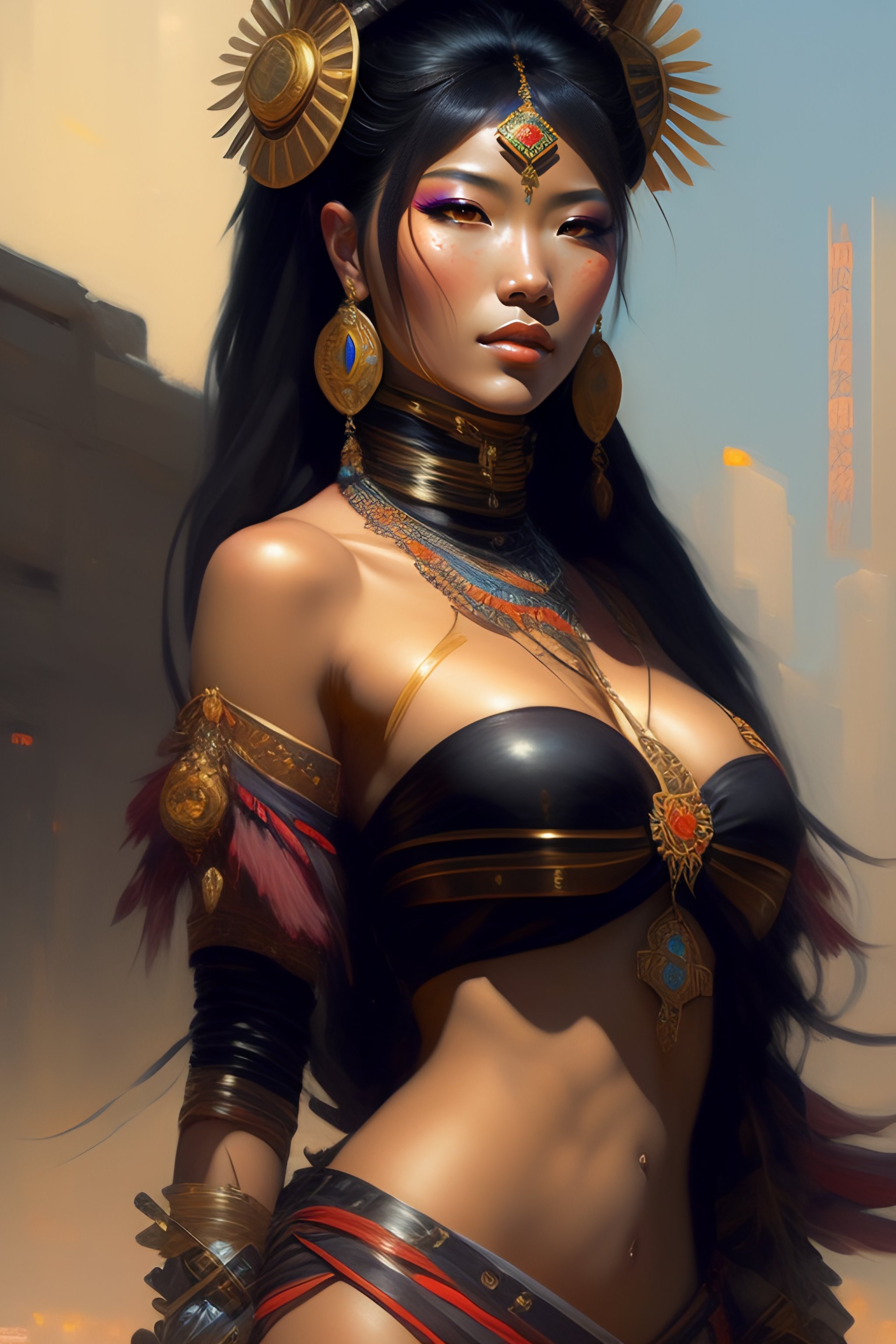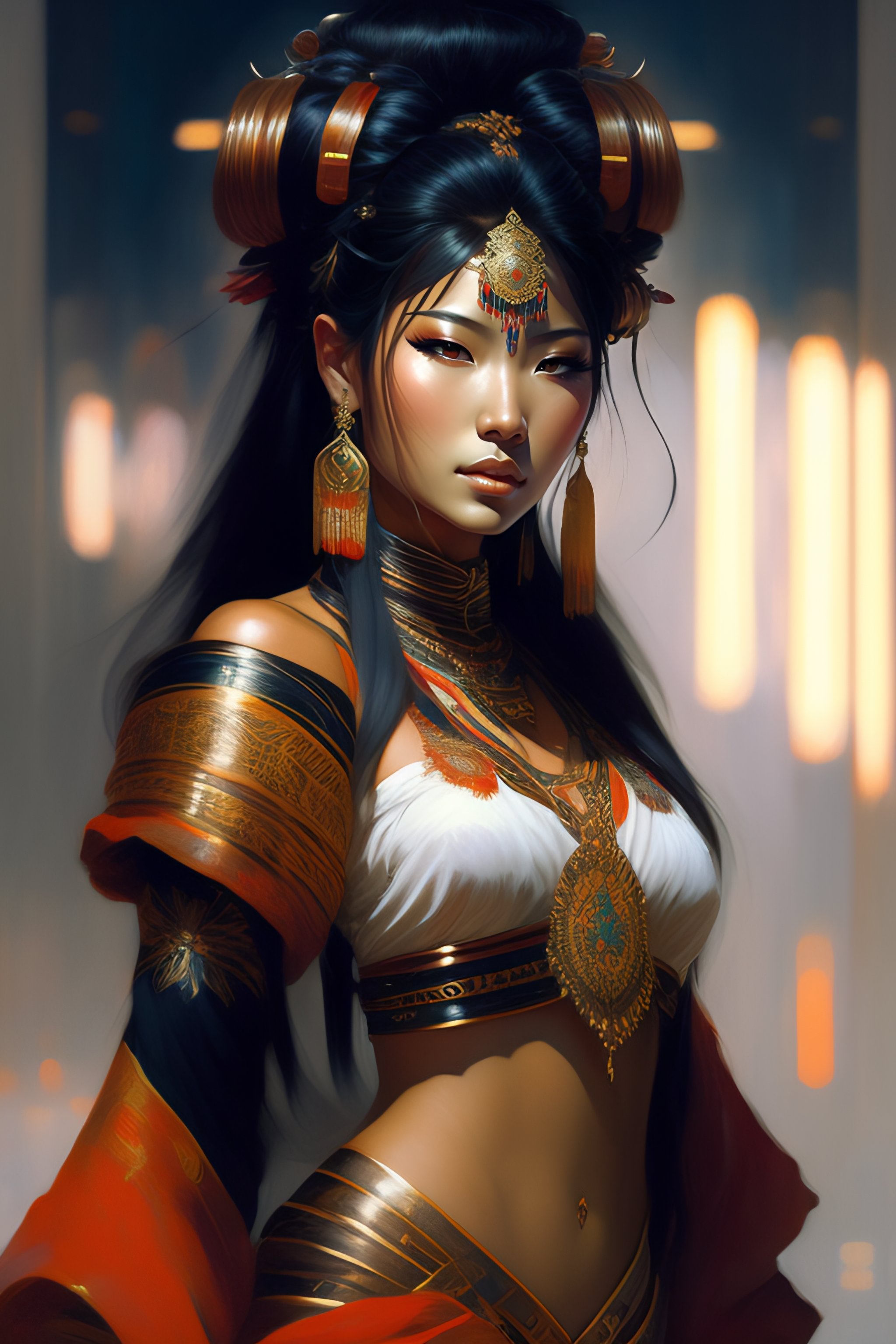 Portrait full body geisha cyborg ethnic girl painting by gaston bussiere, greg rutkowski, yoji shinkawa, yoshitaka amano, tsutomu nihei, donato giancola, tim hildebrandt, oil on canvas, trending on artstation, featured on pixiv, cinematic composition, extreme detail
