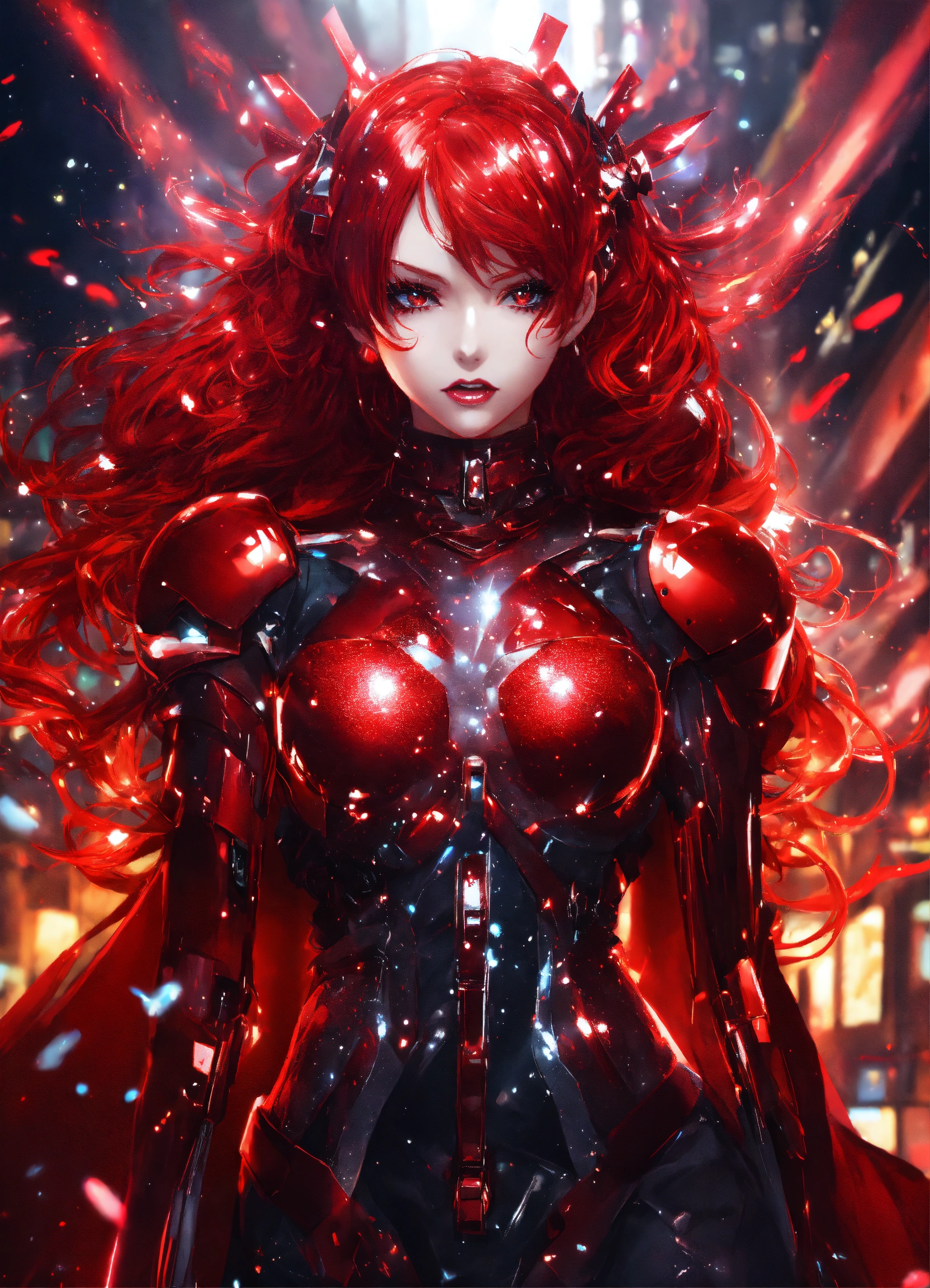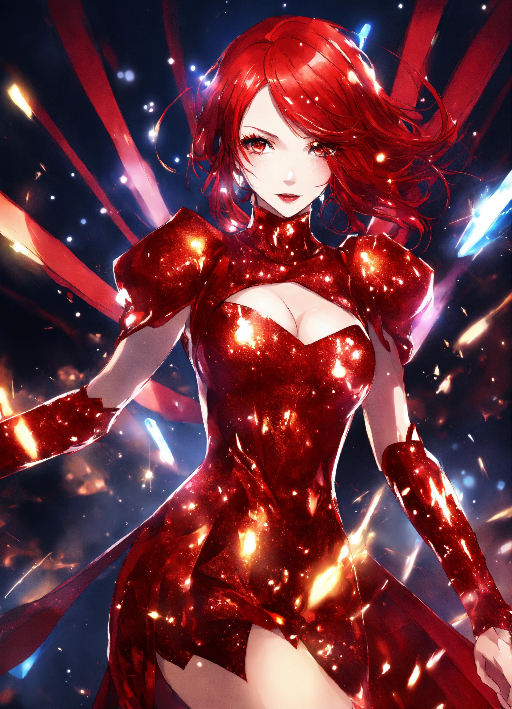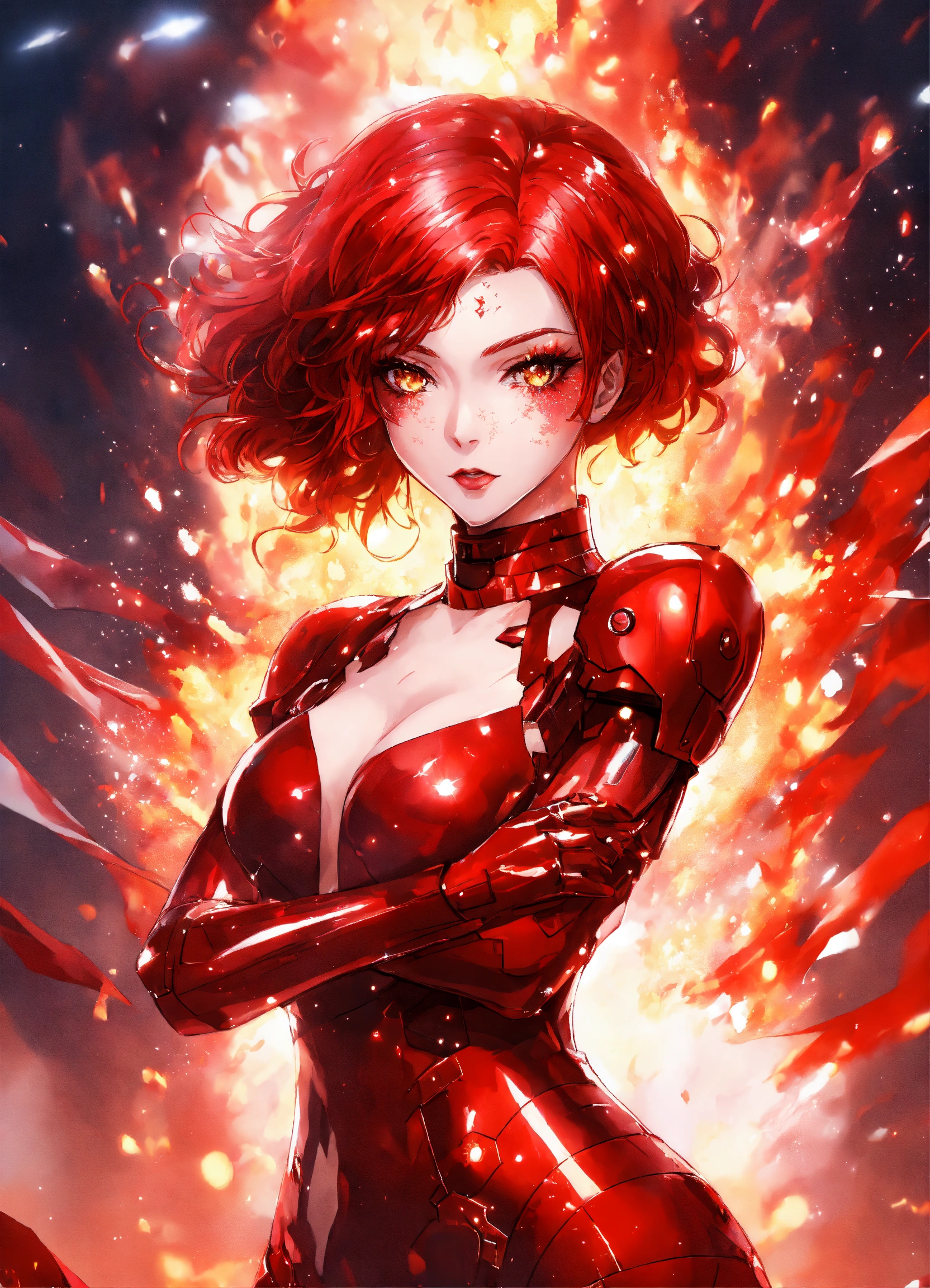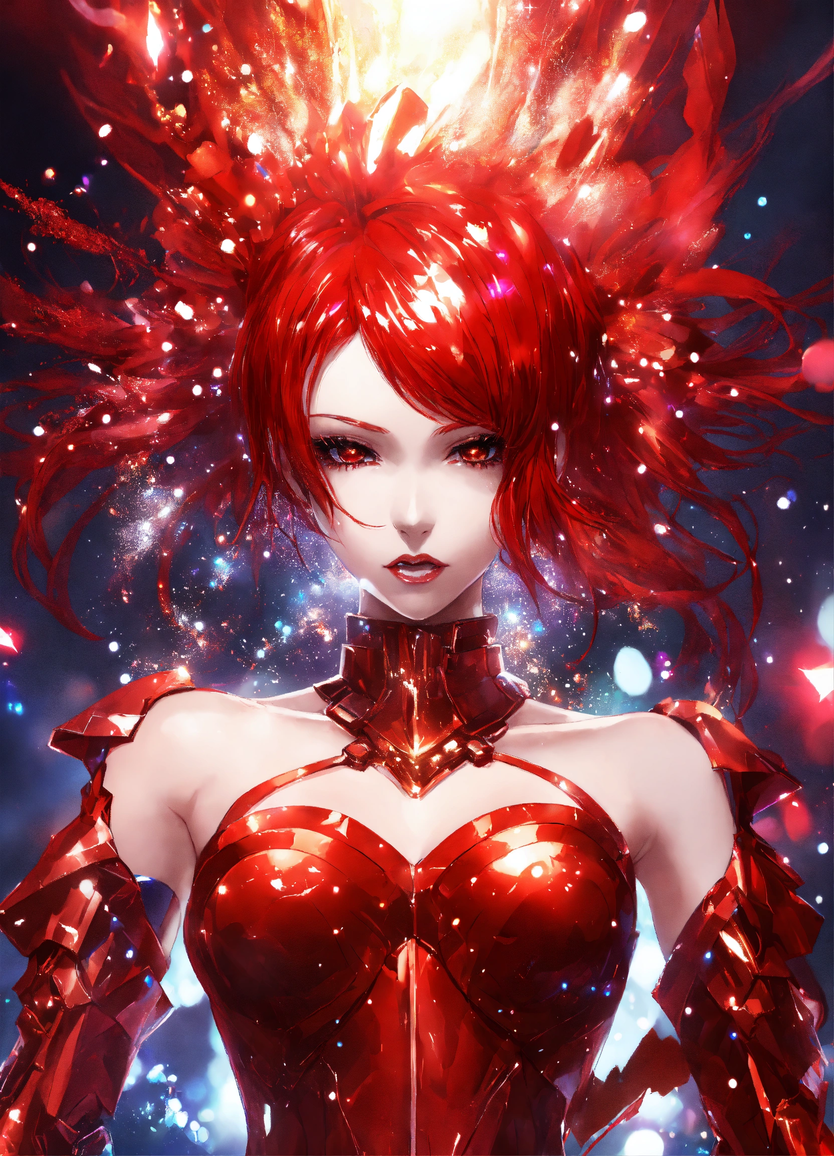 Anime manga style, shiny cyborg girl, evil female, fashion, with sparkling red gown, red hair with glitter, white skin, red make-up, long hands, explosion of power, anime style