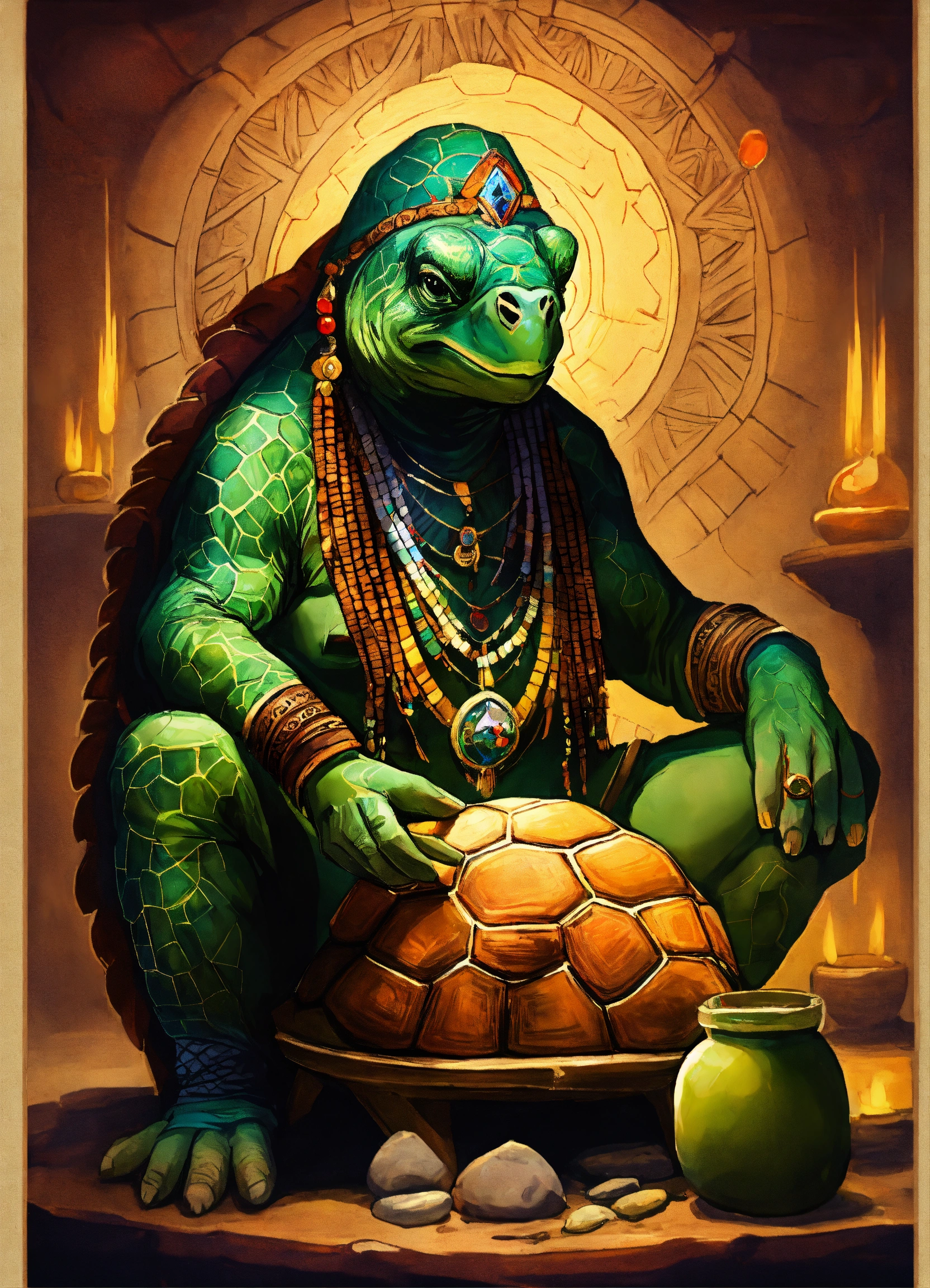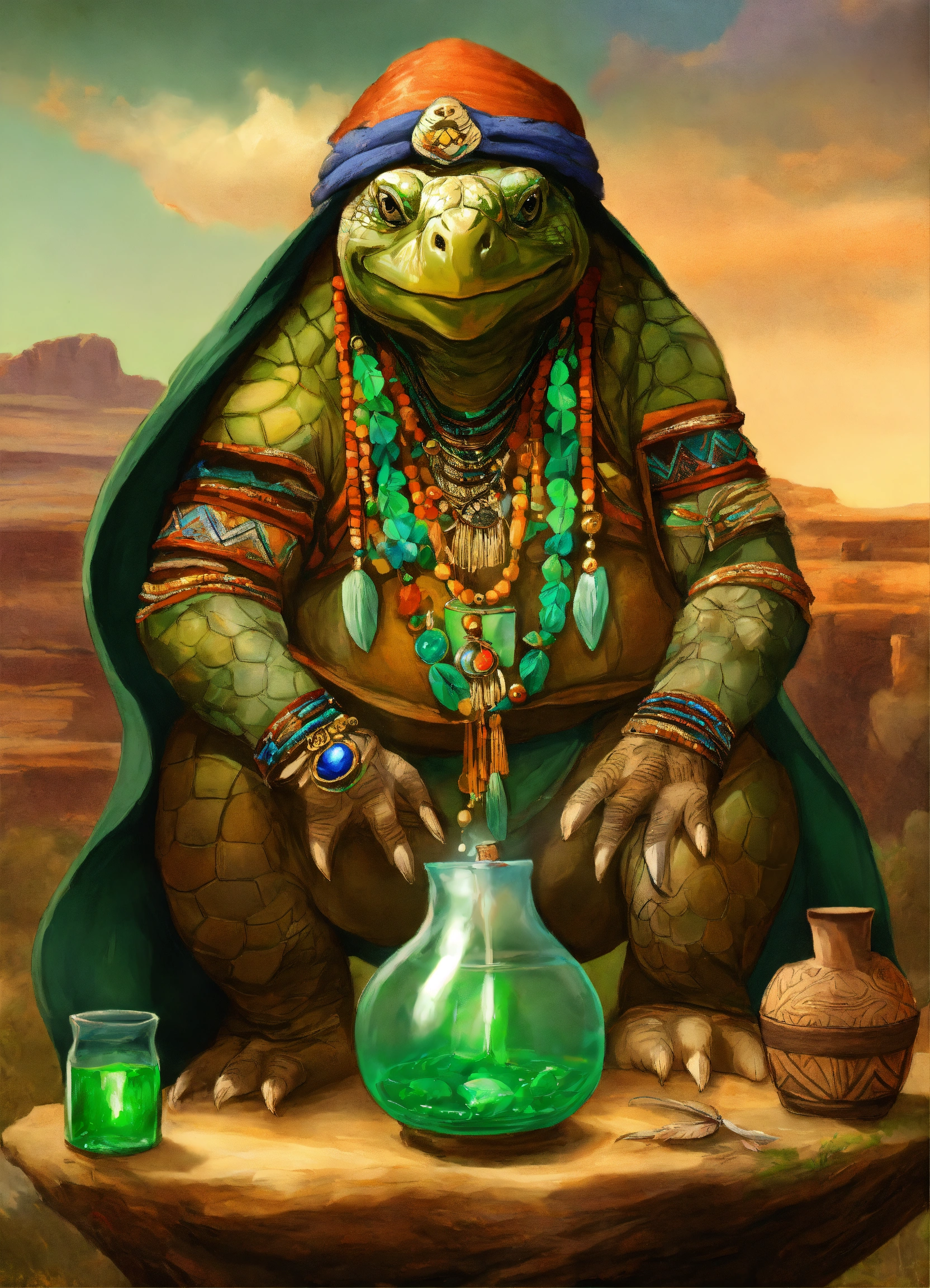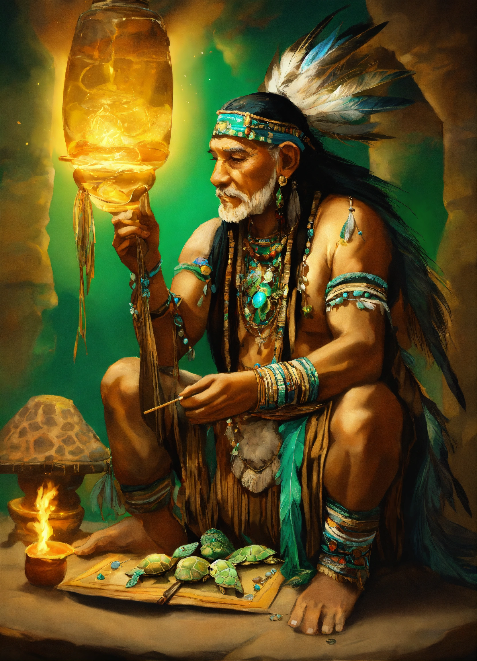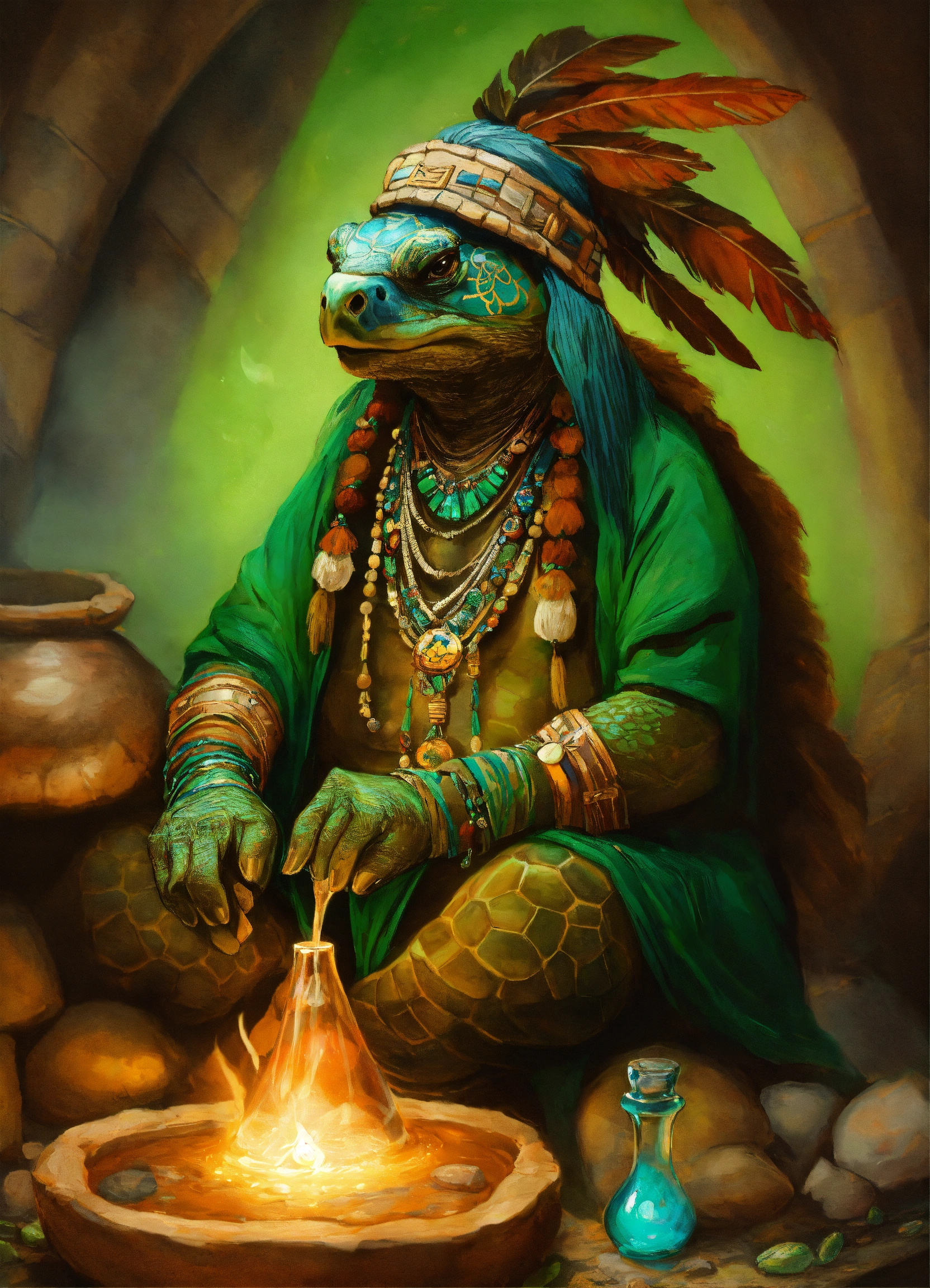 An old tortoise shaman, animal, making a potion, beautiful drawing, native american style, emerald jewlery