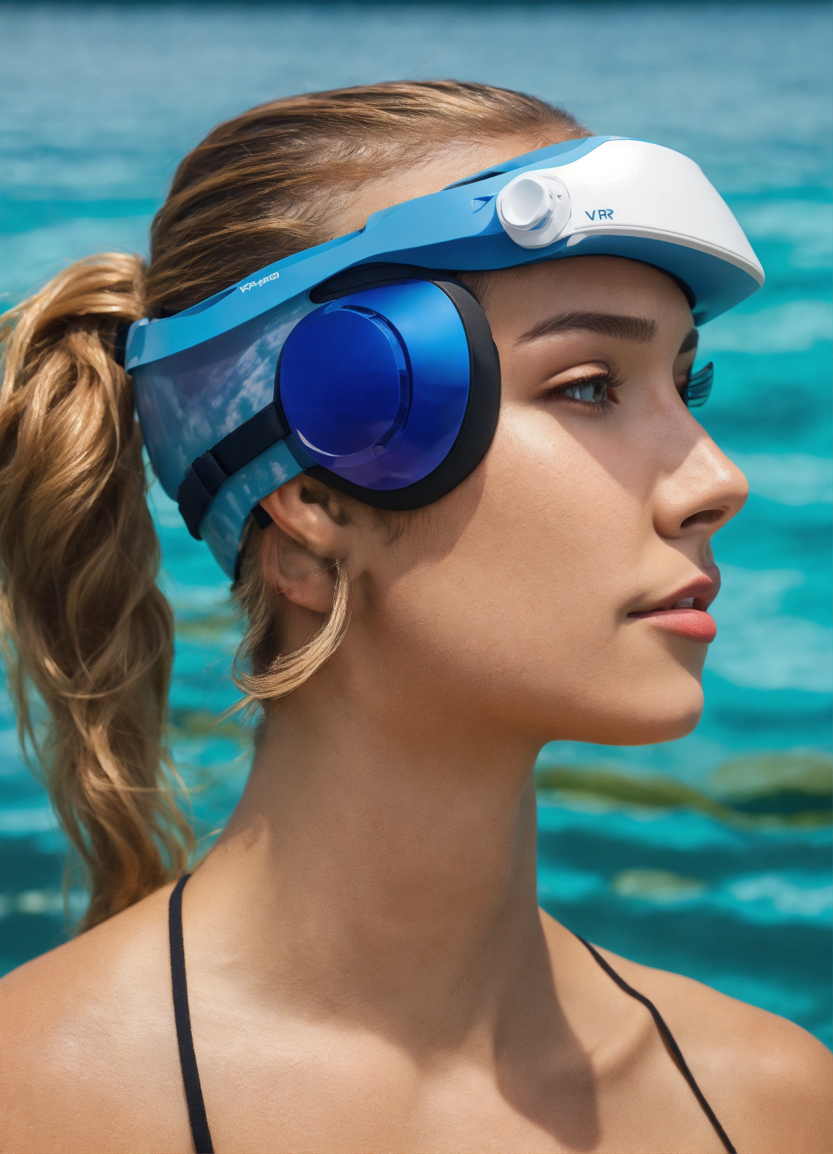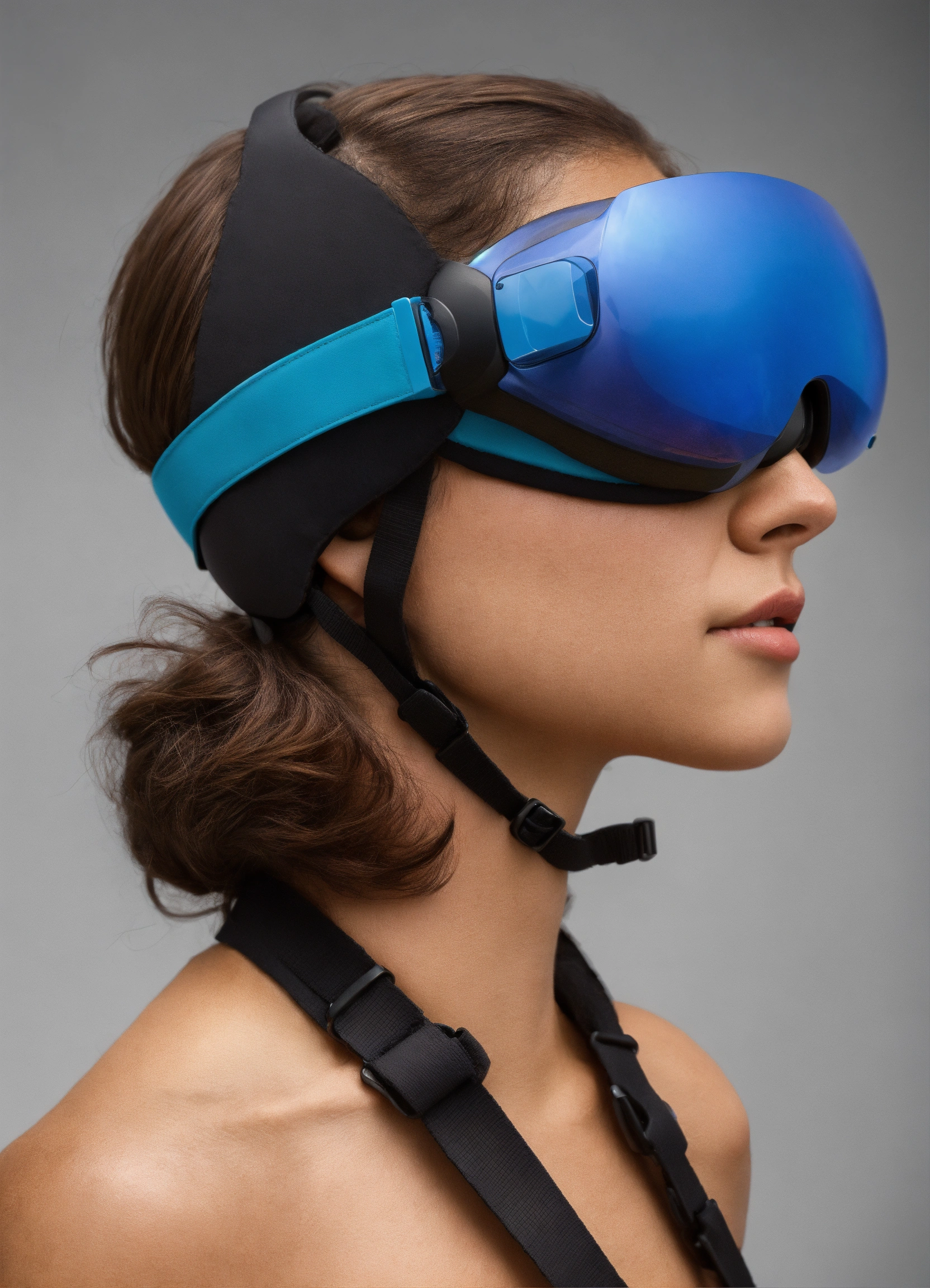 Side view image, how head gear wraps around the head, use swimming goggles, vr goggle straps as reference, two colors