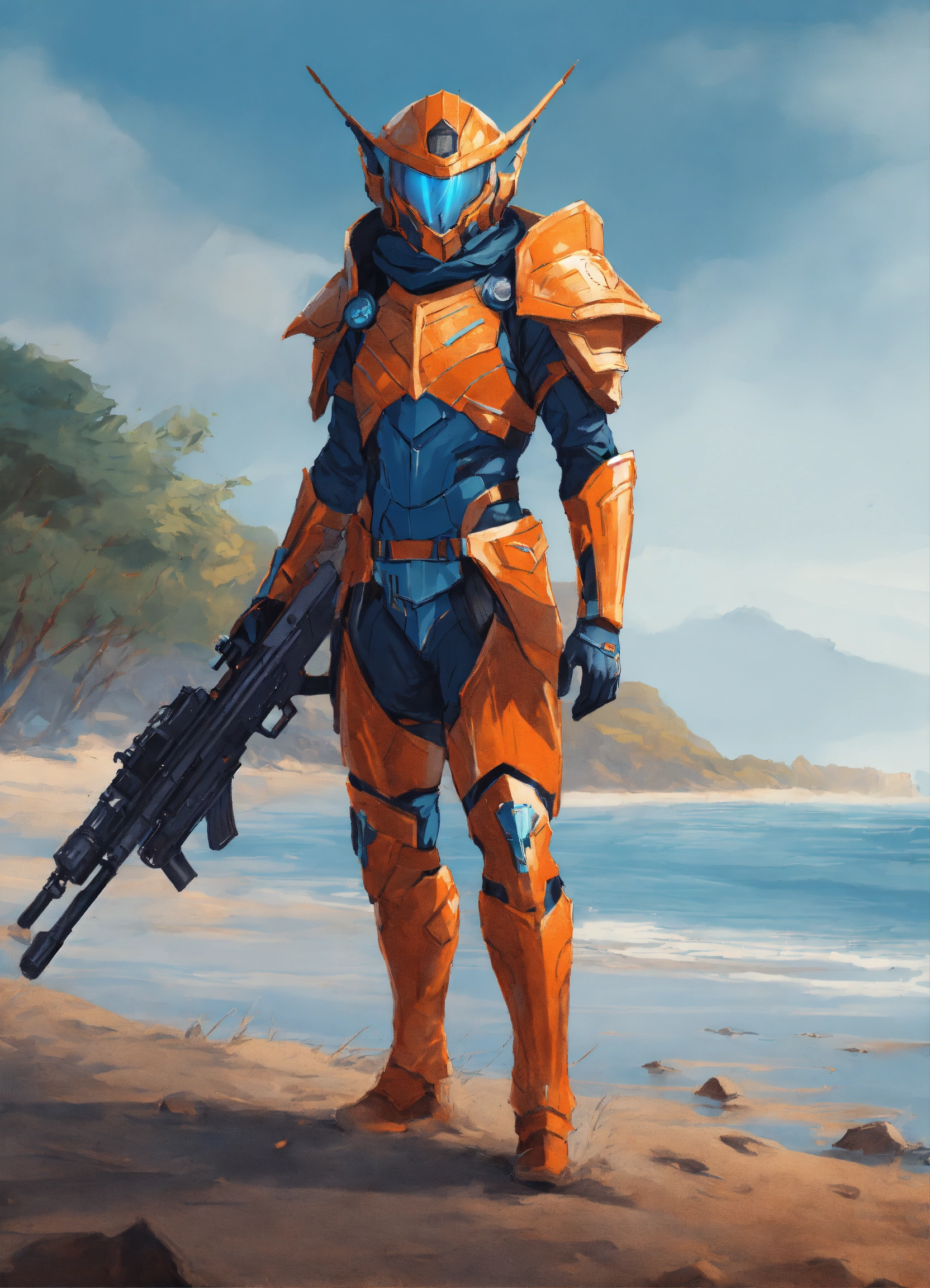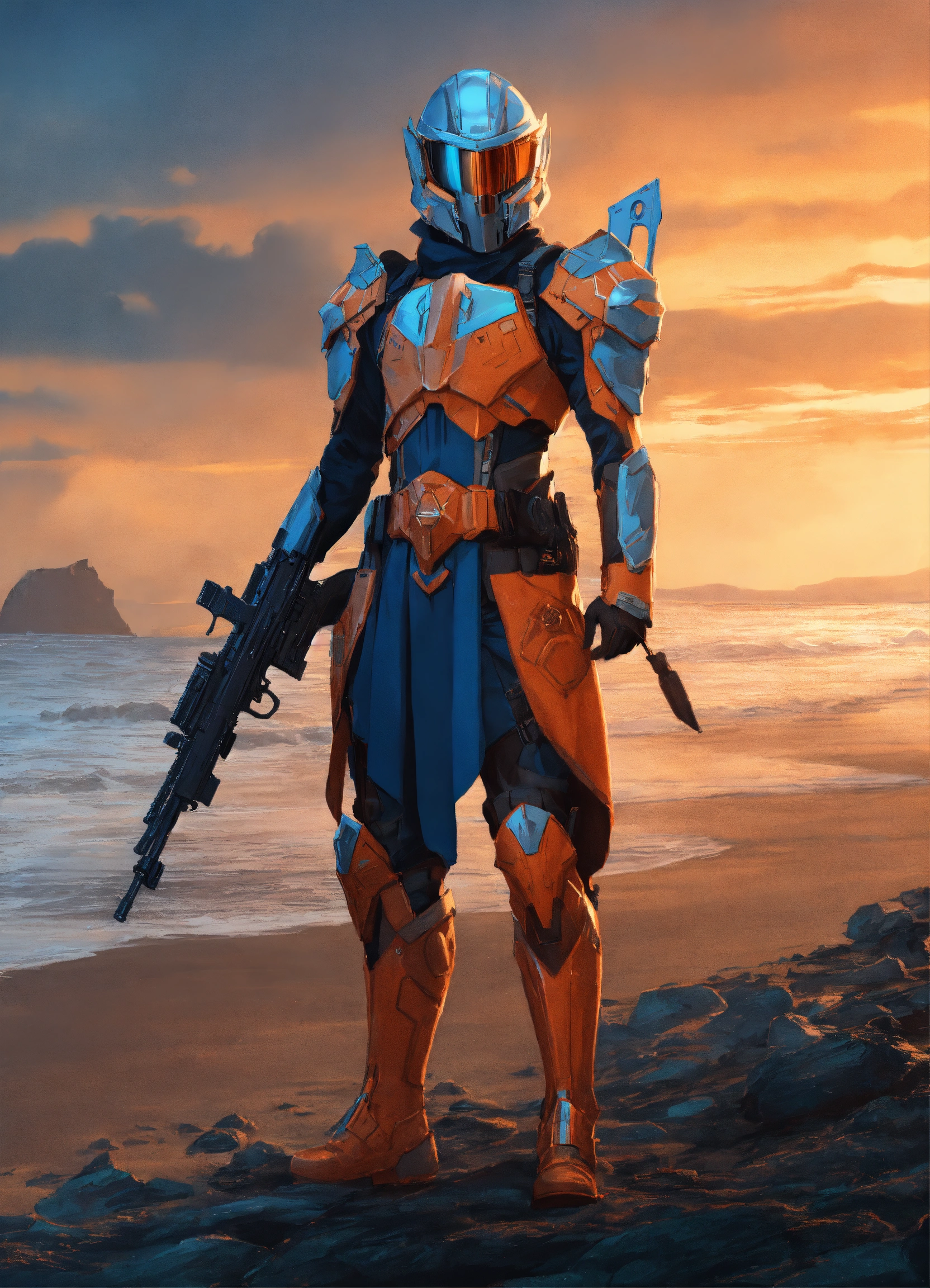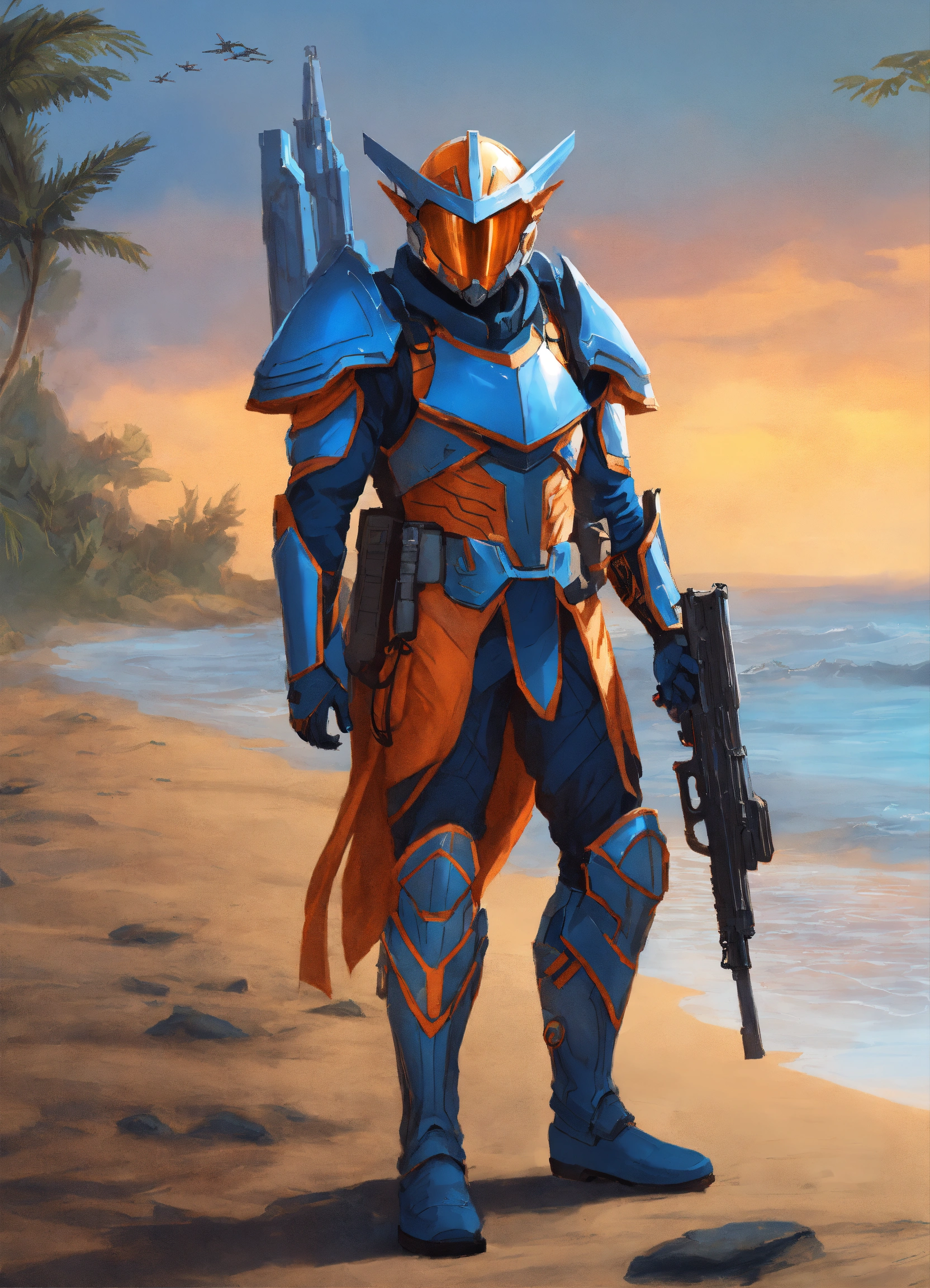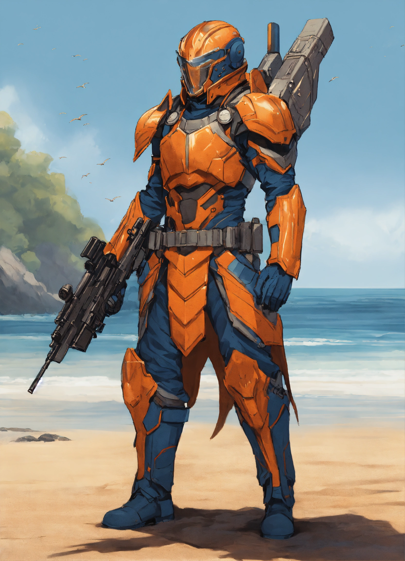 Epic drawing of a full body of a high elf sci fi soldier wearing sci fi armor and helmet, navy blue and orange armor with light blue trim on the fabric, boots, male, holding a machine gun with both hands, standing on a beach