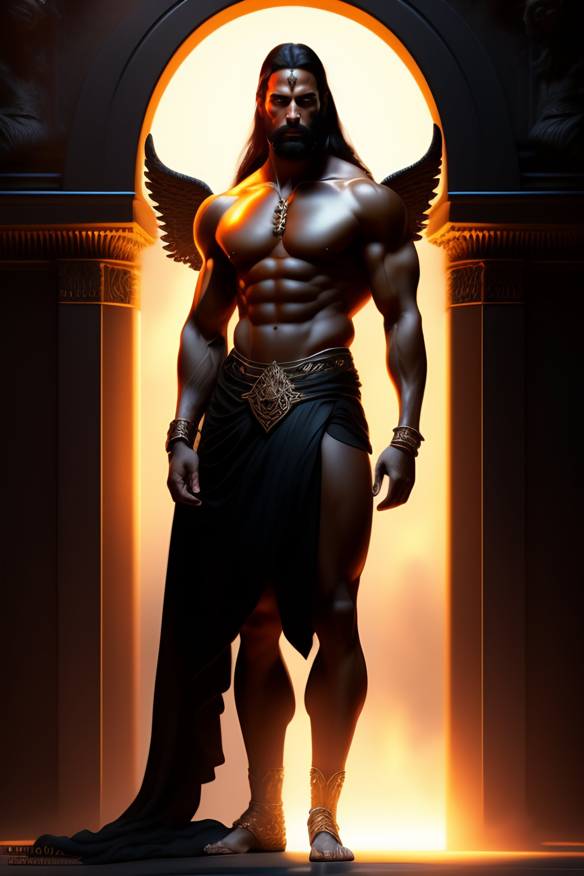 Muscular angel standing in the front of gates of hell . angel is clothed with black toga. angel is draped with bones. digital painting. art station. mood lighting. skindness, highly detailed, concept art, intricate, sharp focus, einar jonsson and bouguereau - h 1200-n 9