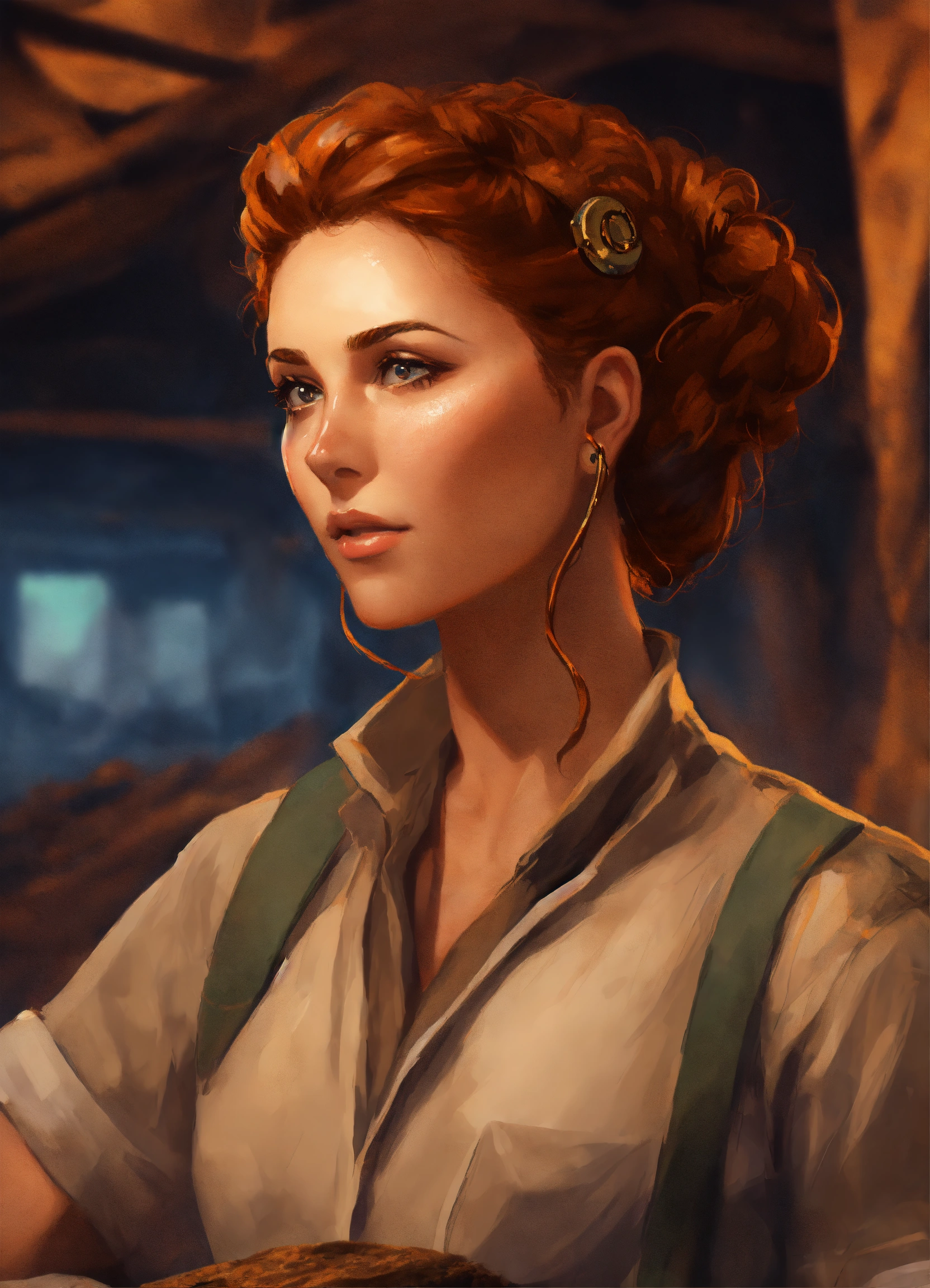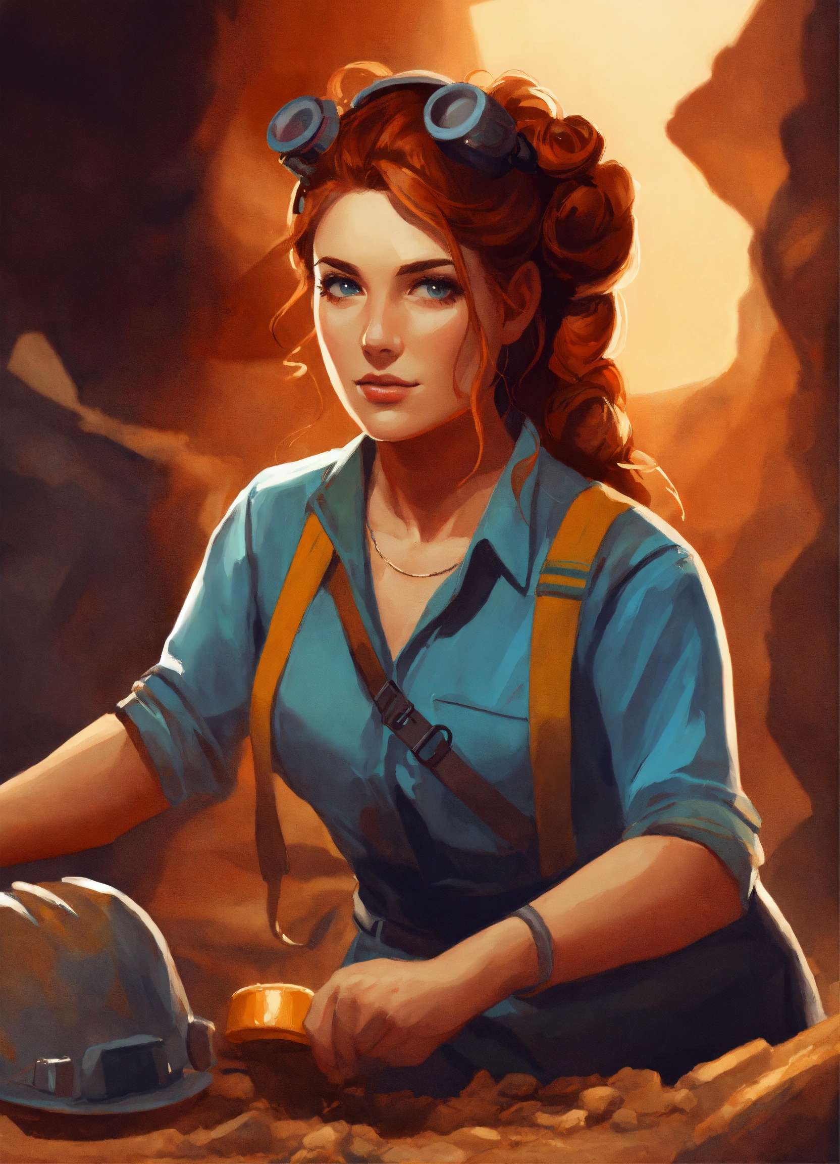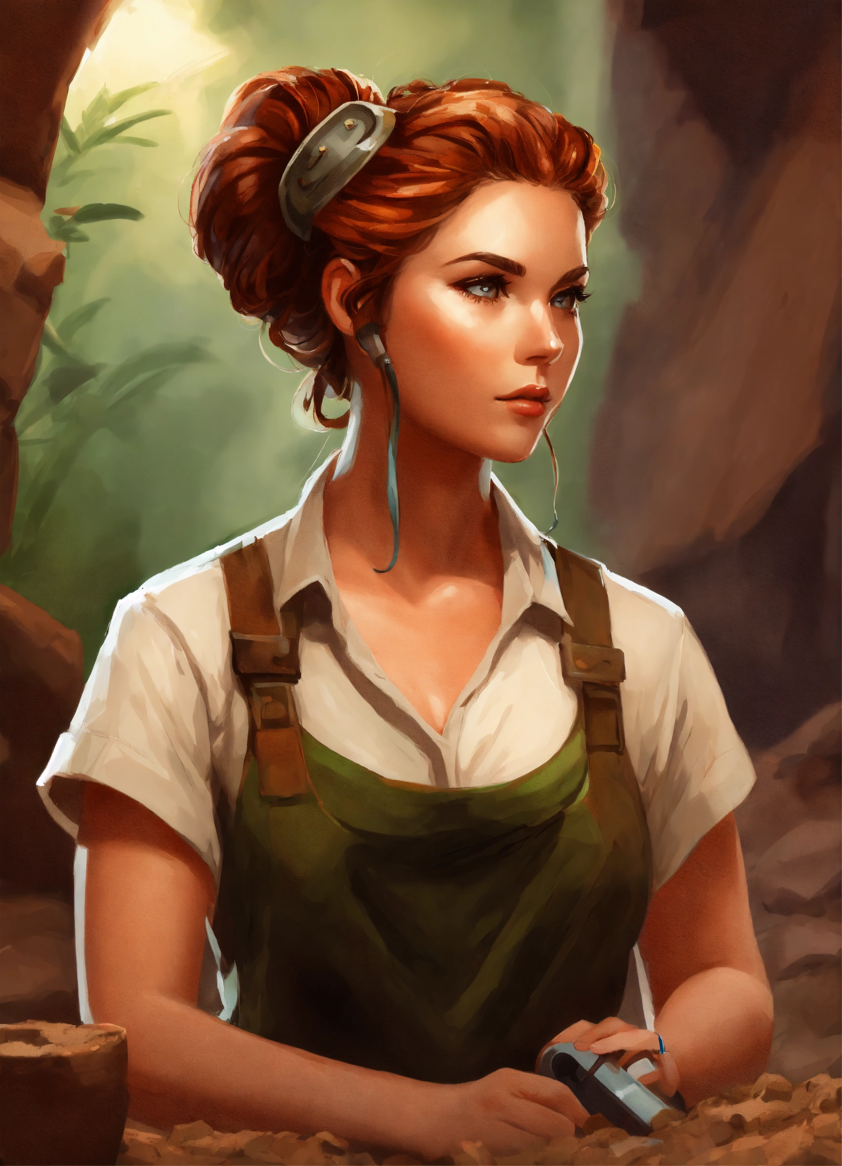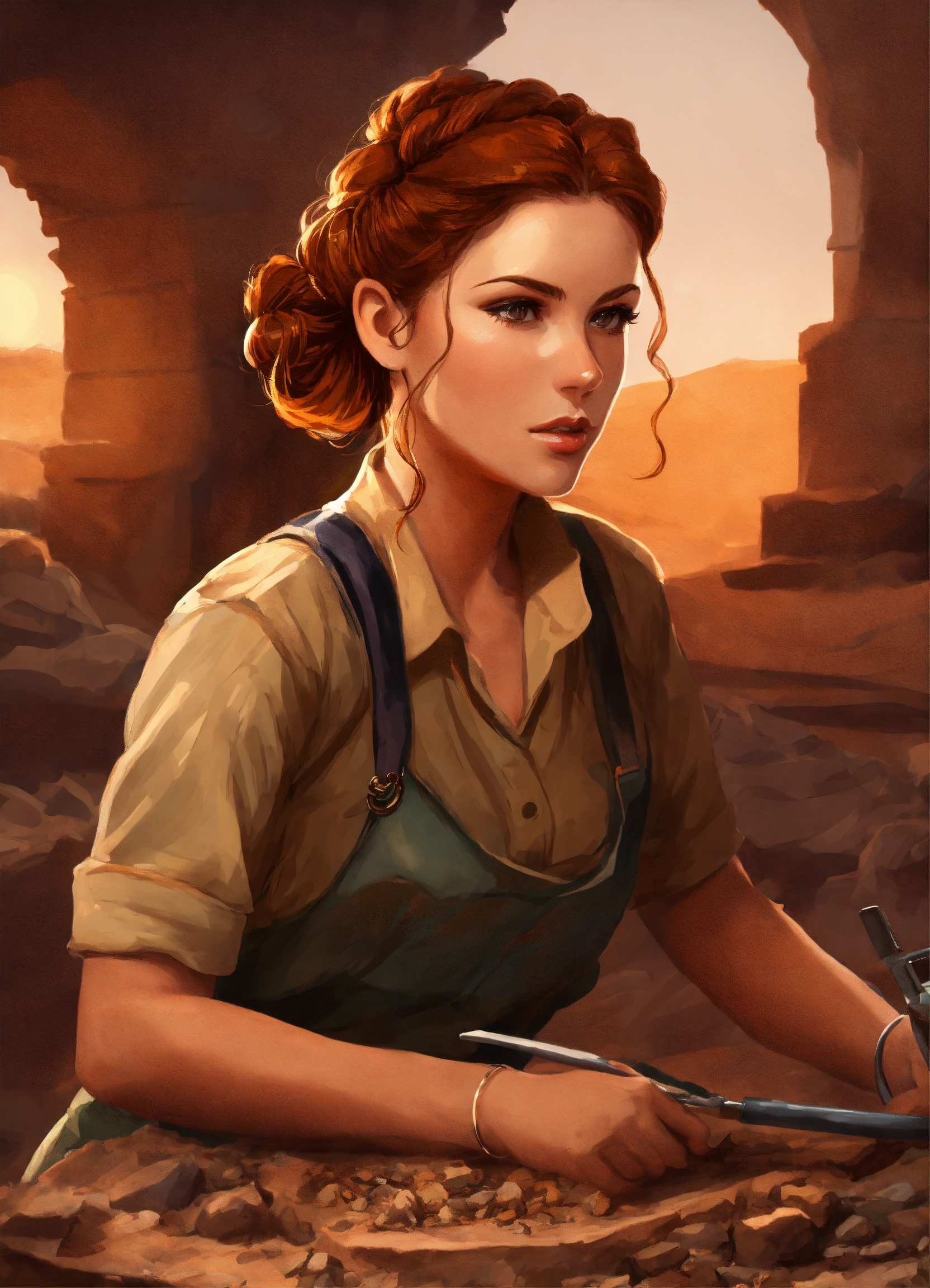 Digital art painting of a beautiful archaeologist woman with ringlet copper hair in an updo, she is working at a dig site