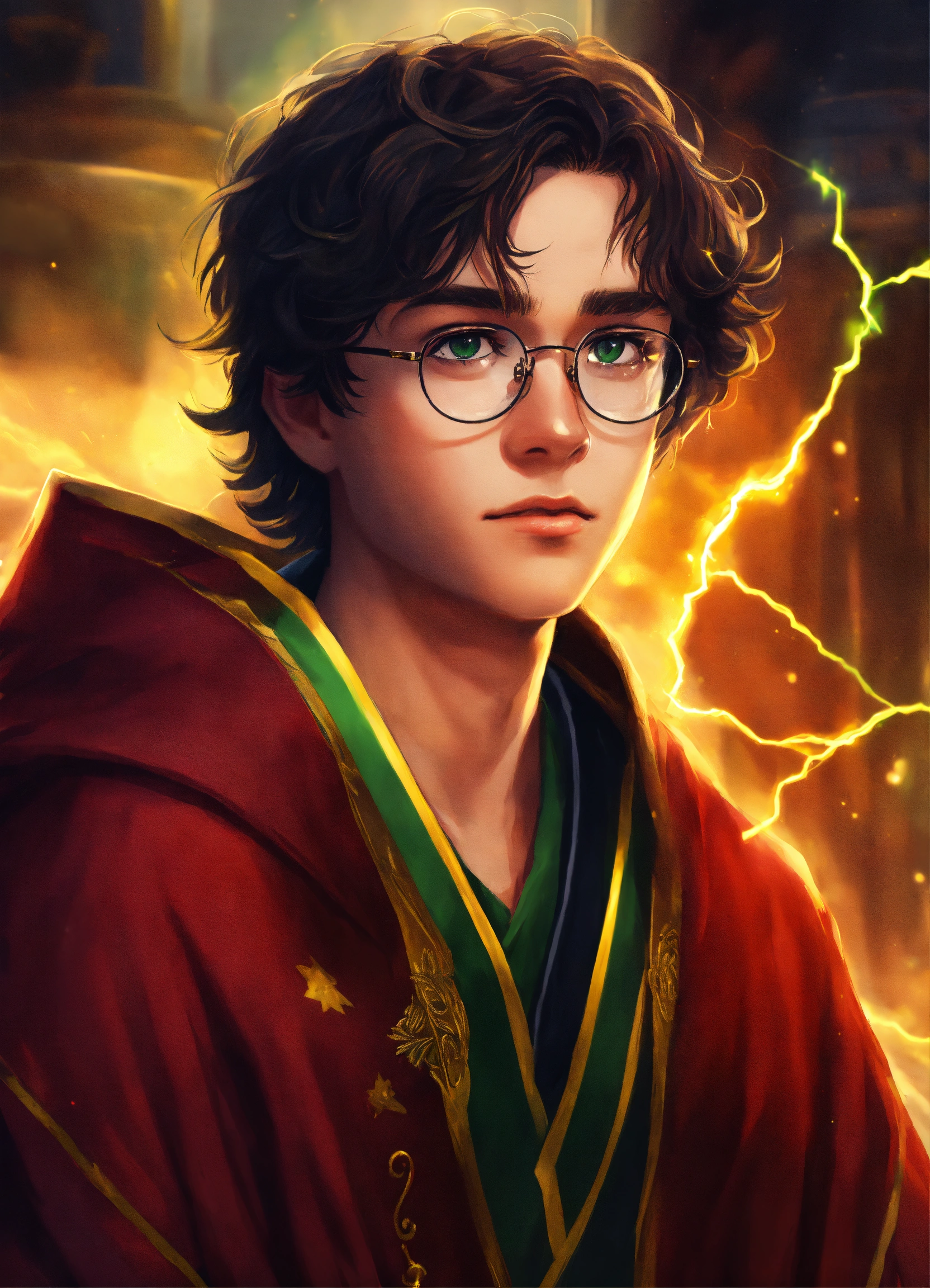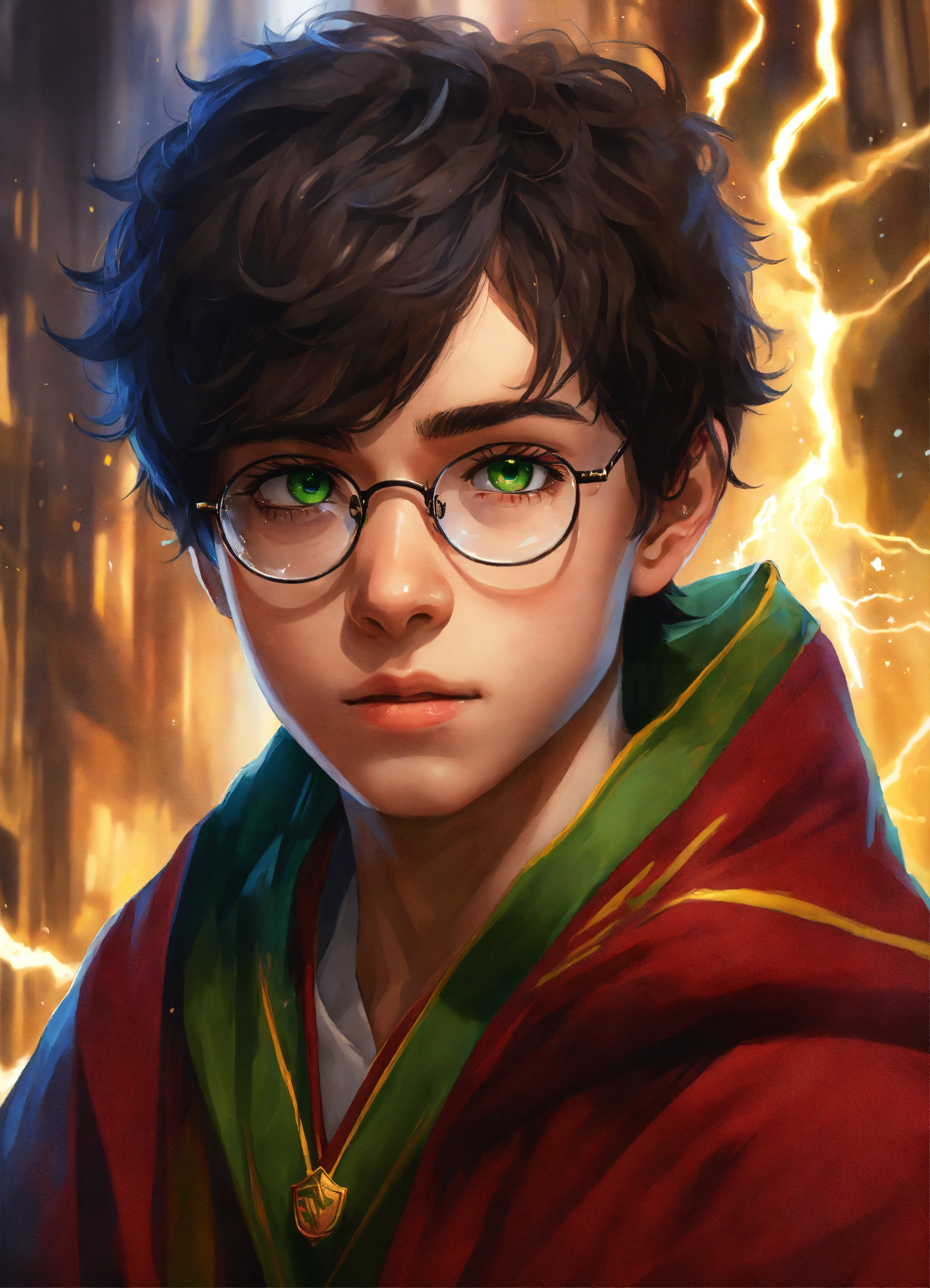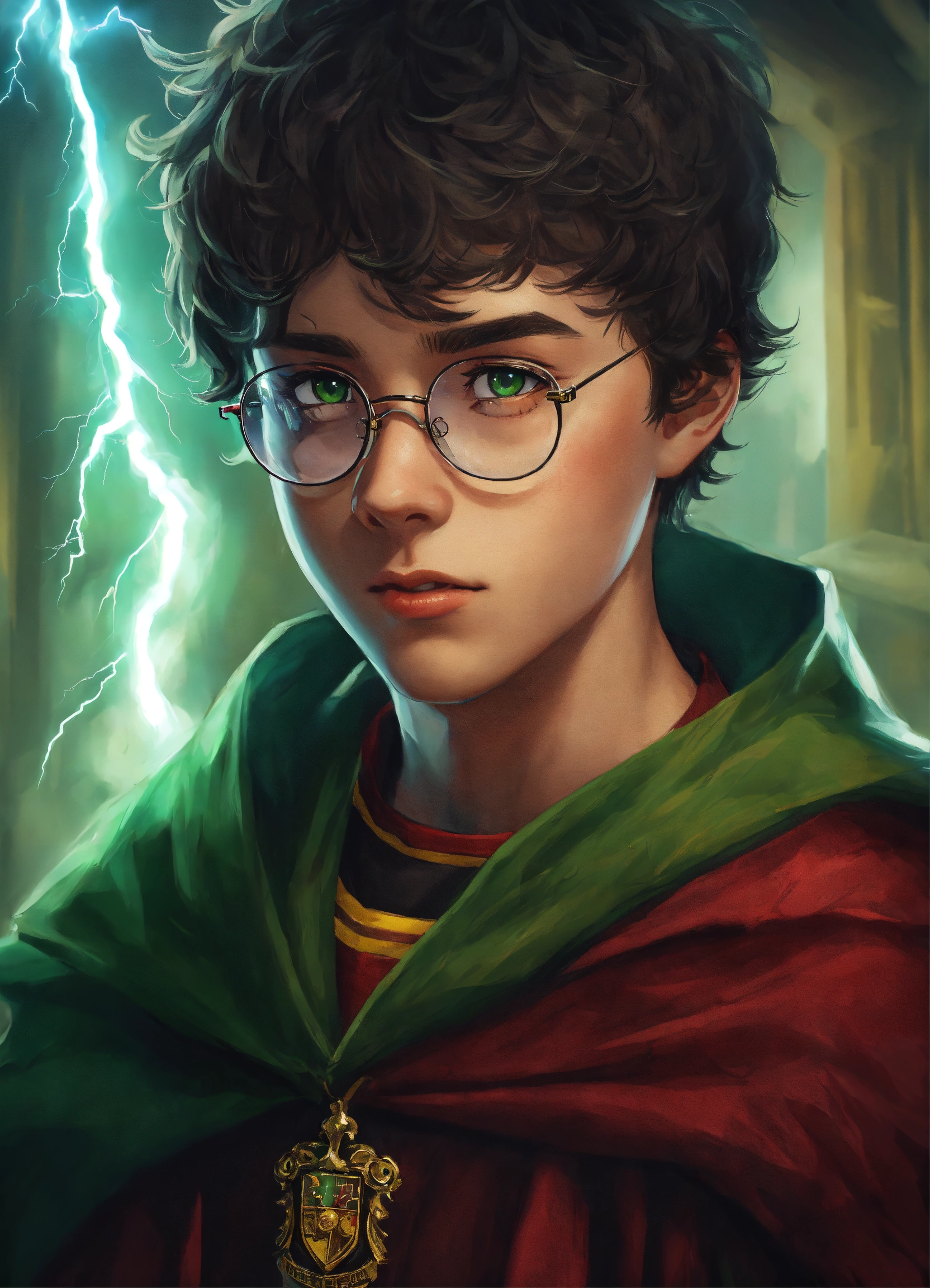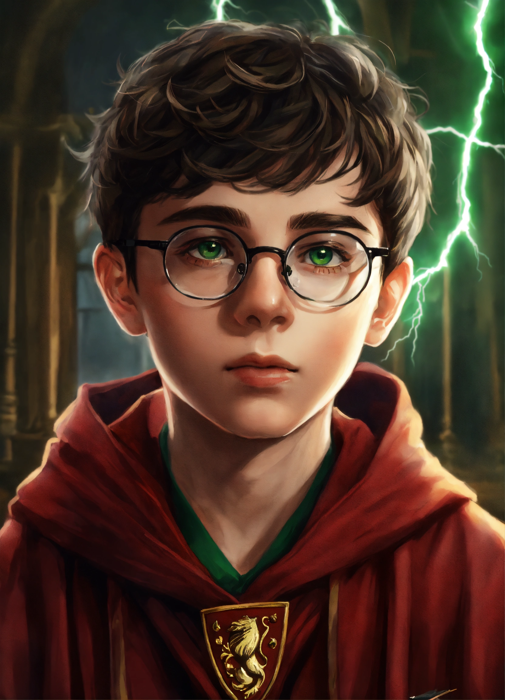 13-year-old, untidy black hair, bright green eyes, thin face, round rimmed glasses, lightning scar on his forehead, gryffindor robes, facing camera, facing forward, realistic