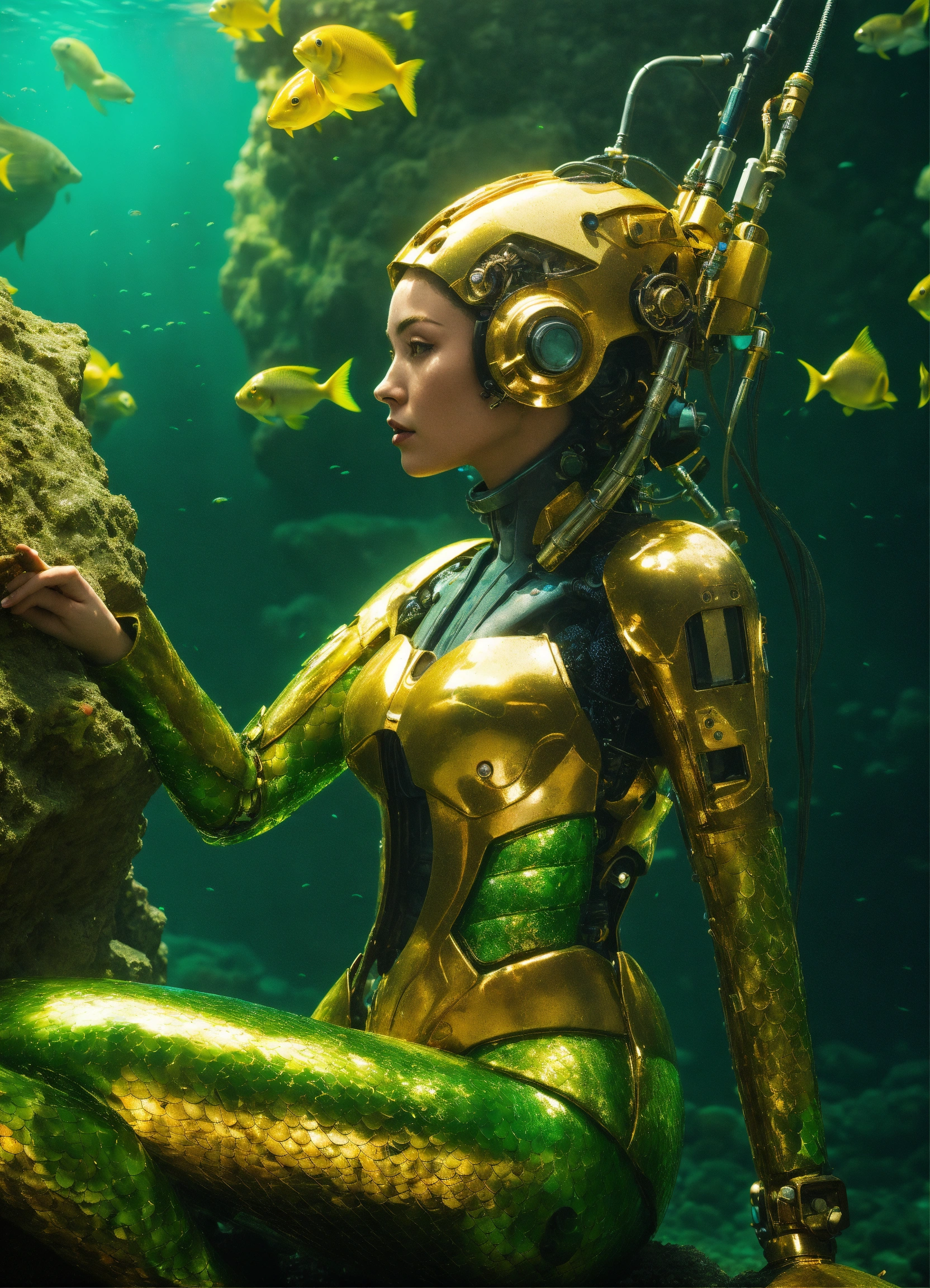 A android mermaid in her mechanical outfit under an underwater rock, in the style of mechanized forms, 8k resolution, national geographic photo, dark gold and green, adventure themed, ray tracing, cybernetic sci-fi --ar 2332